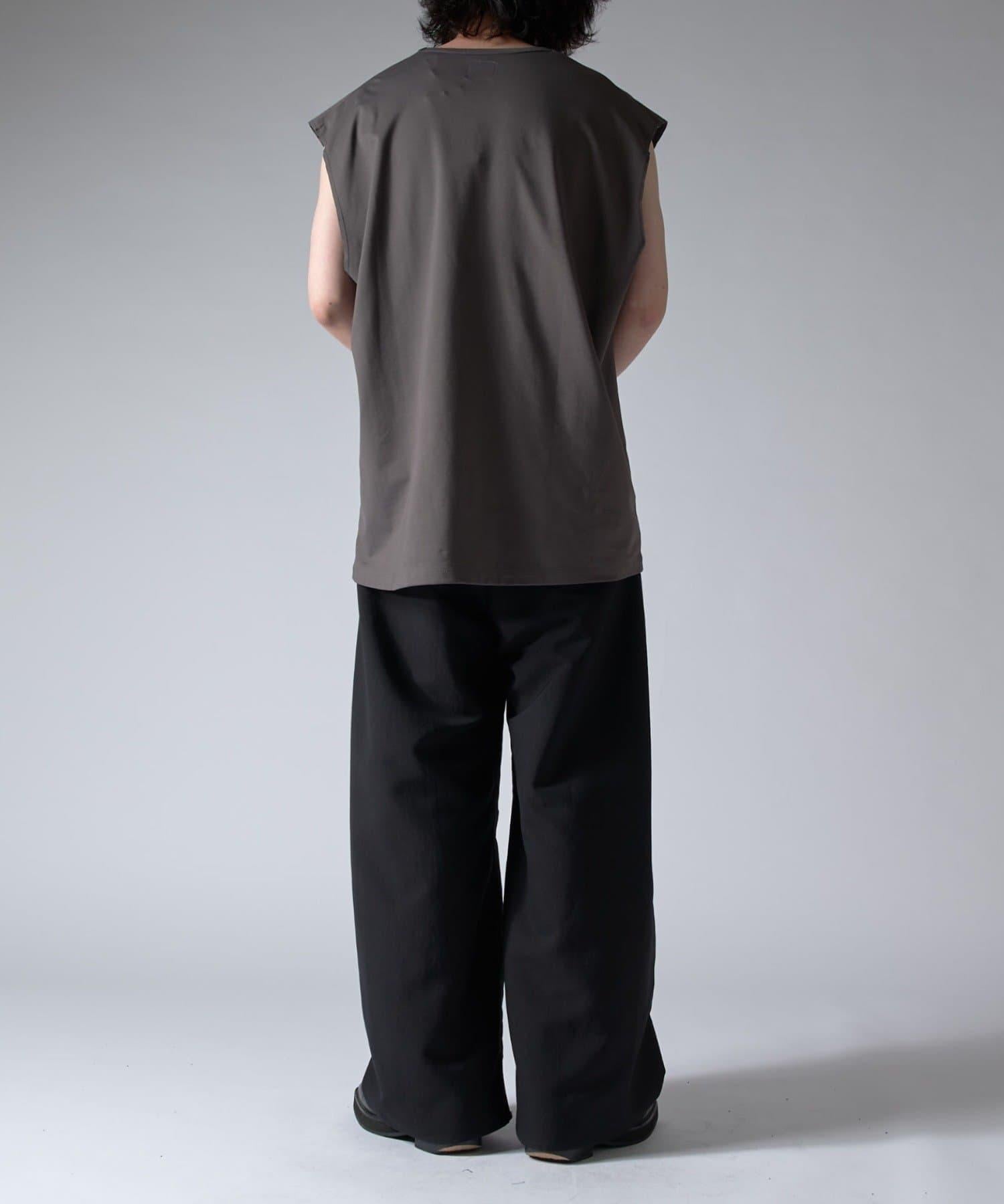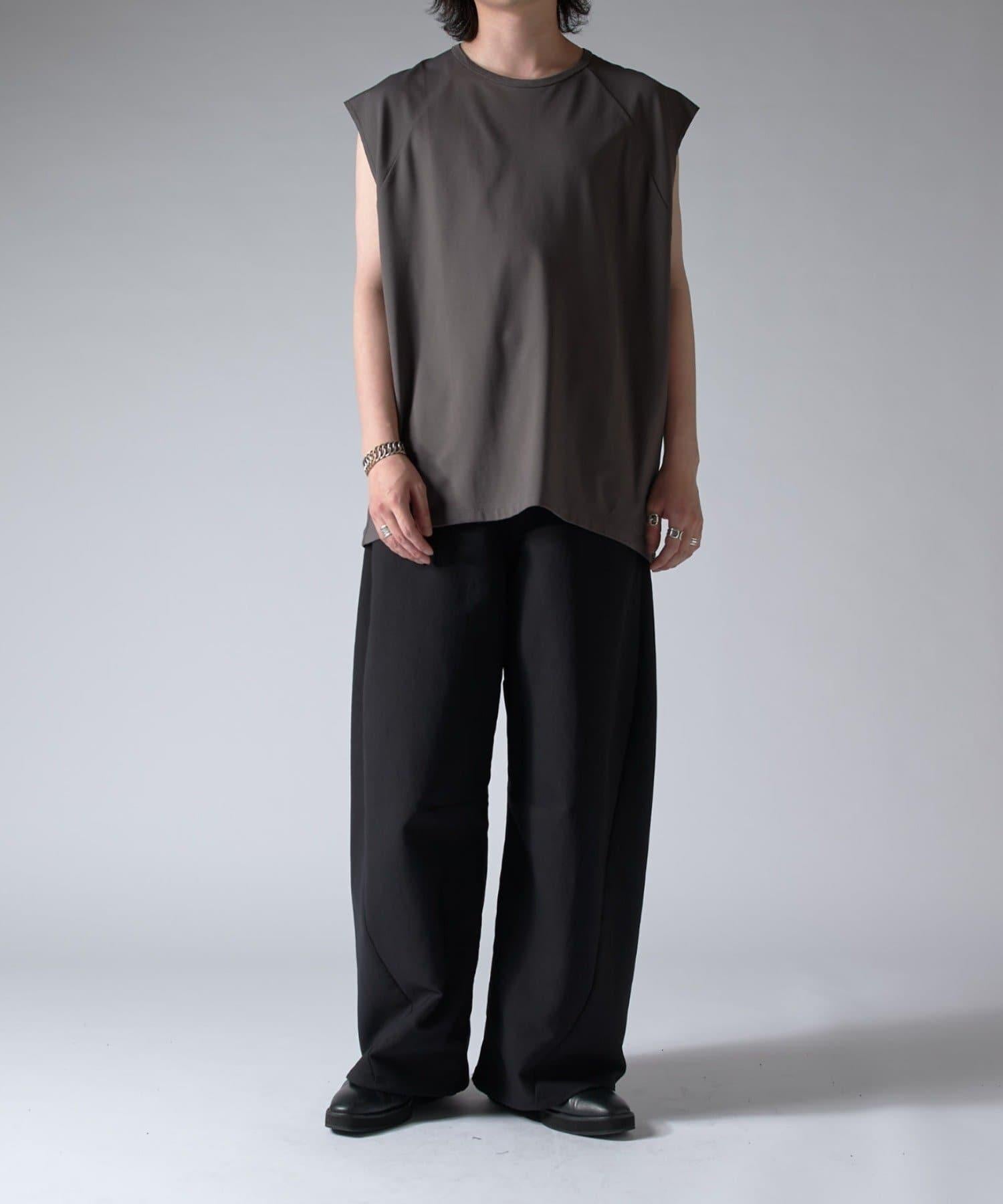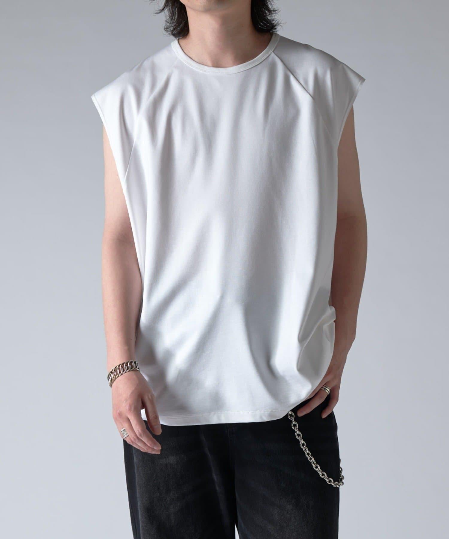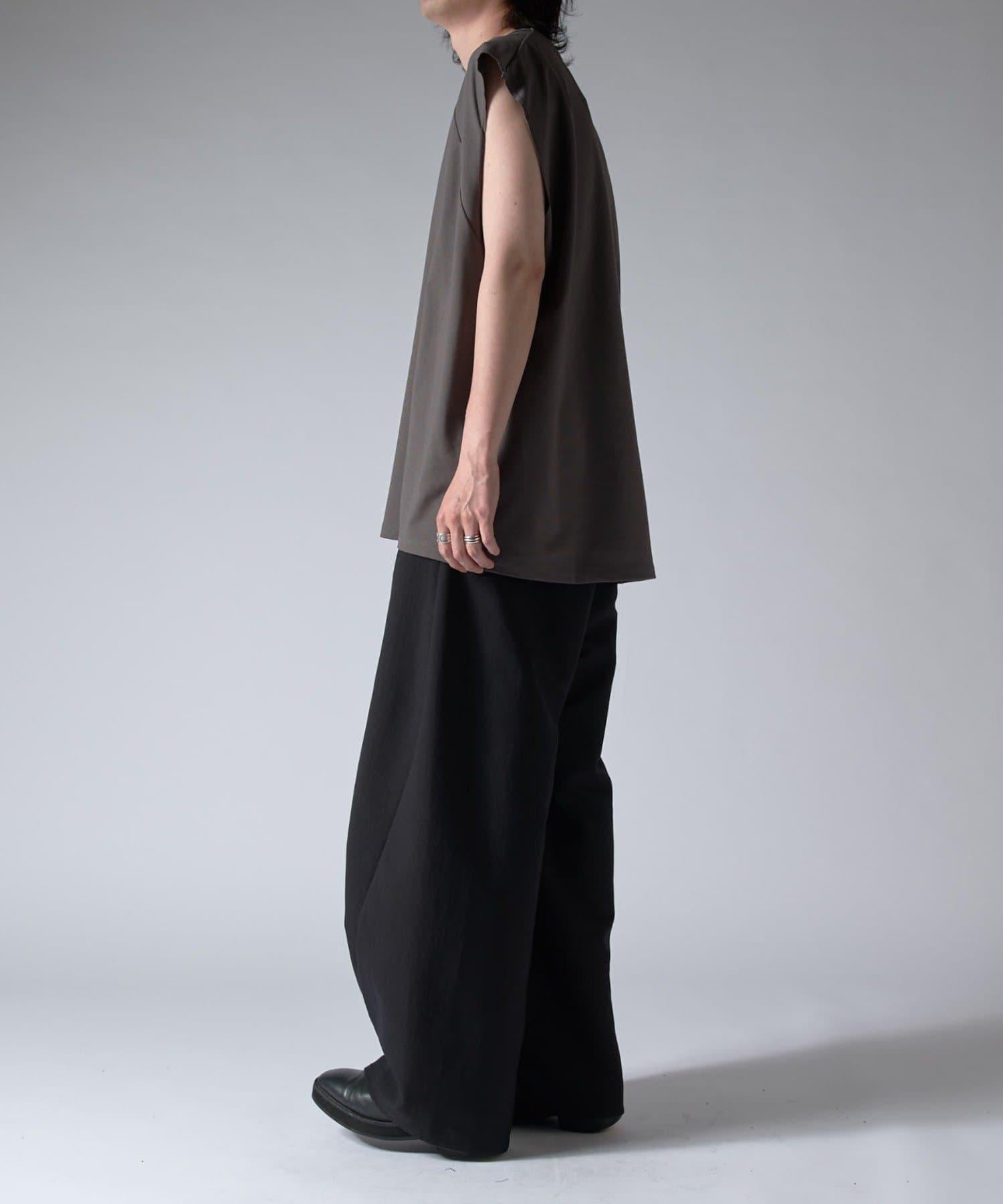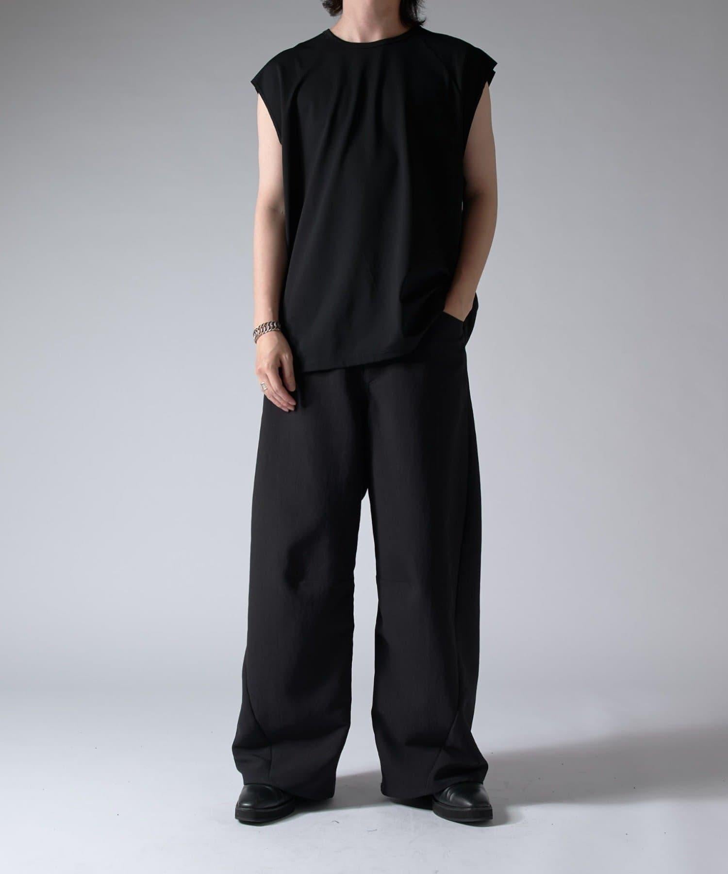 無袖剪裁縫製,落肩設計,袖子垂向一側。