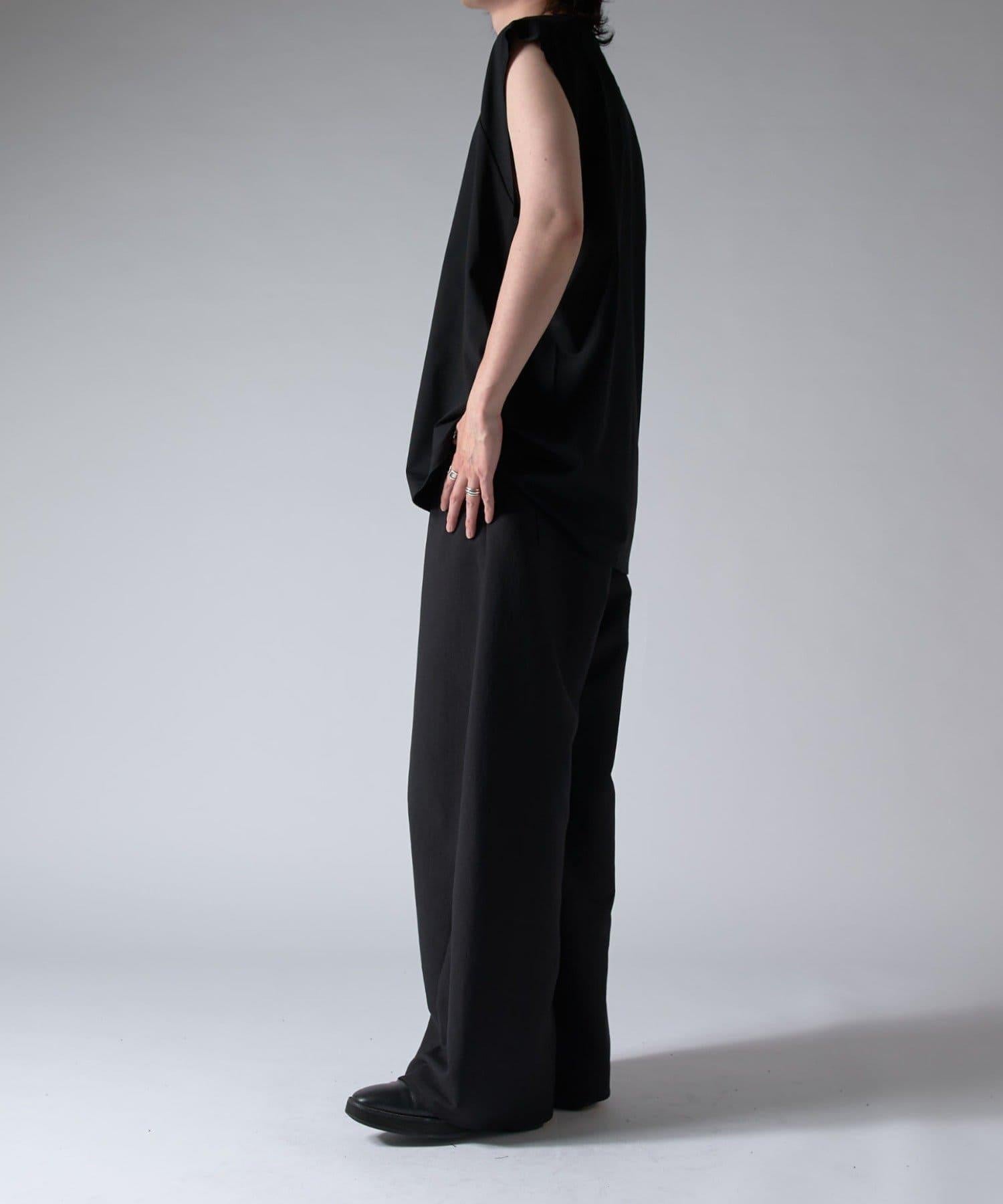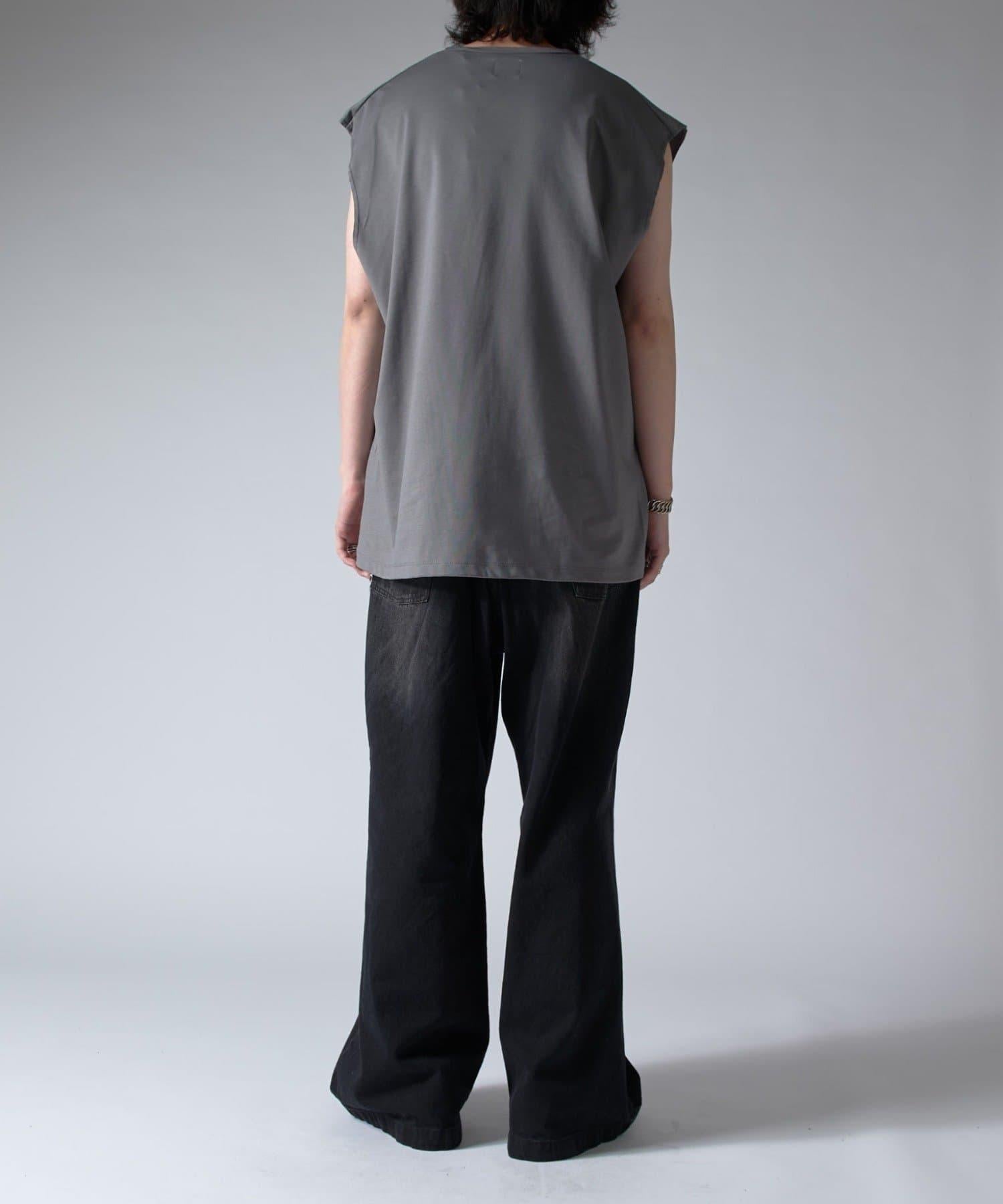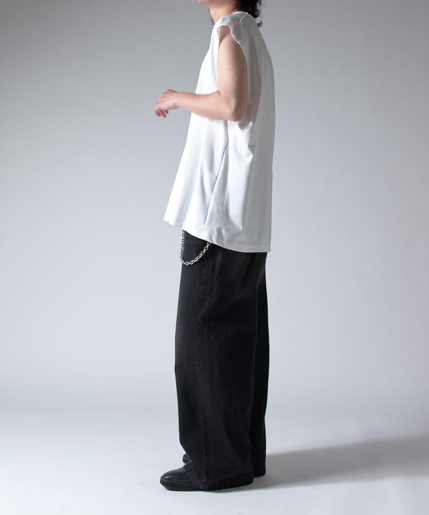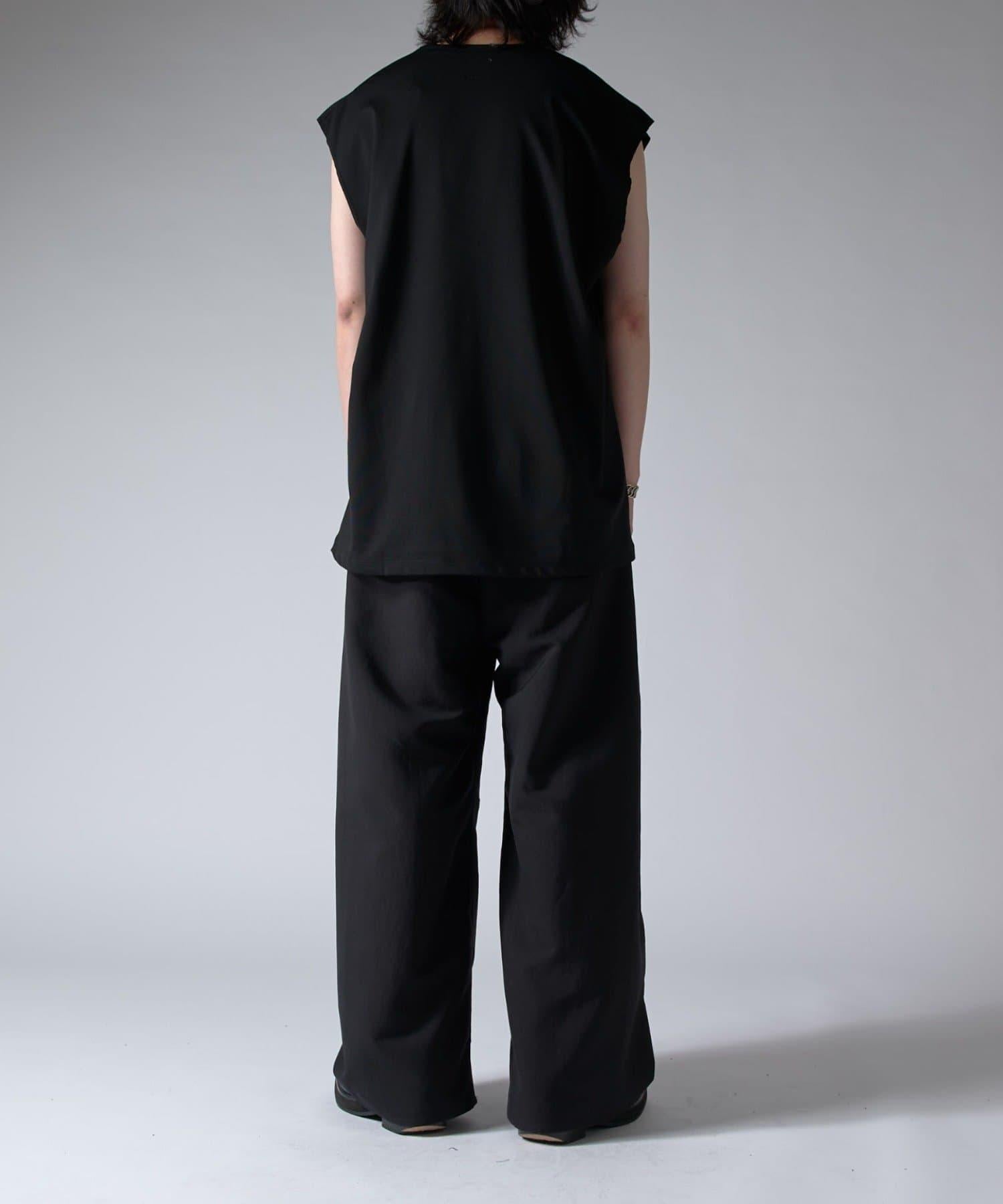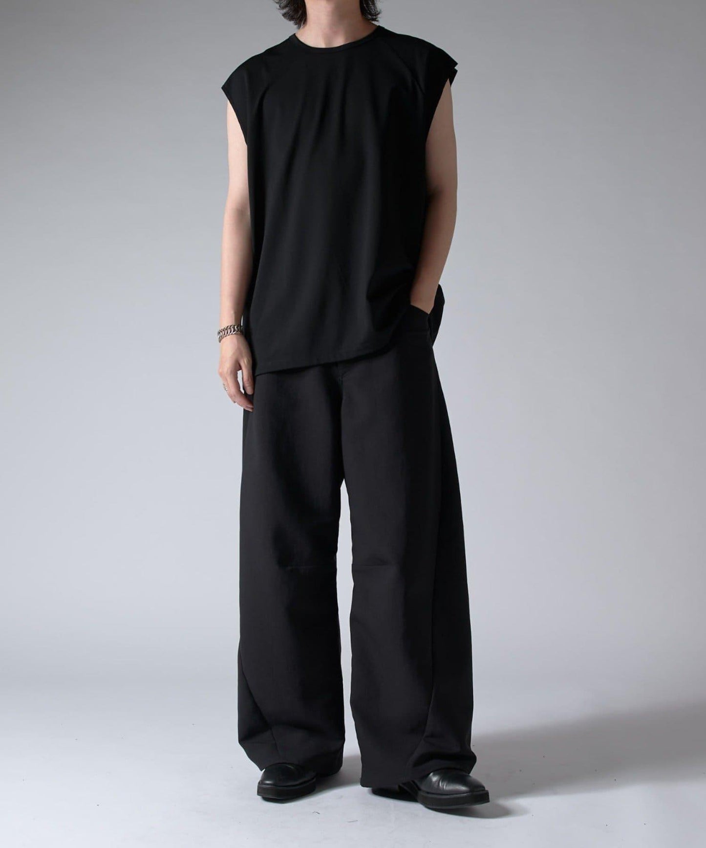 無袖剪裁縫製,落肩設計,袖子垂向一側。