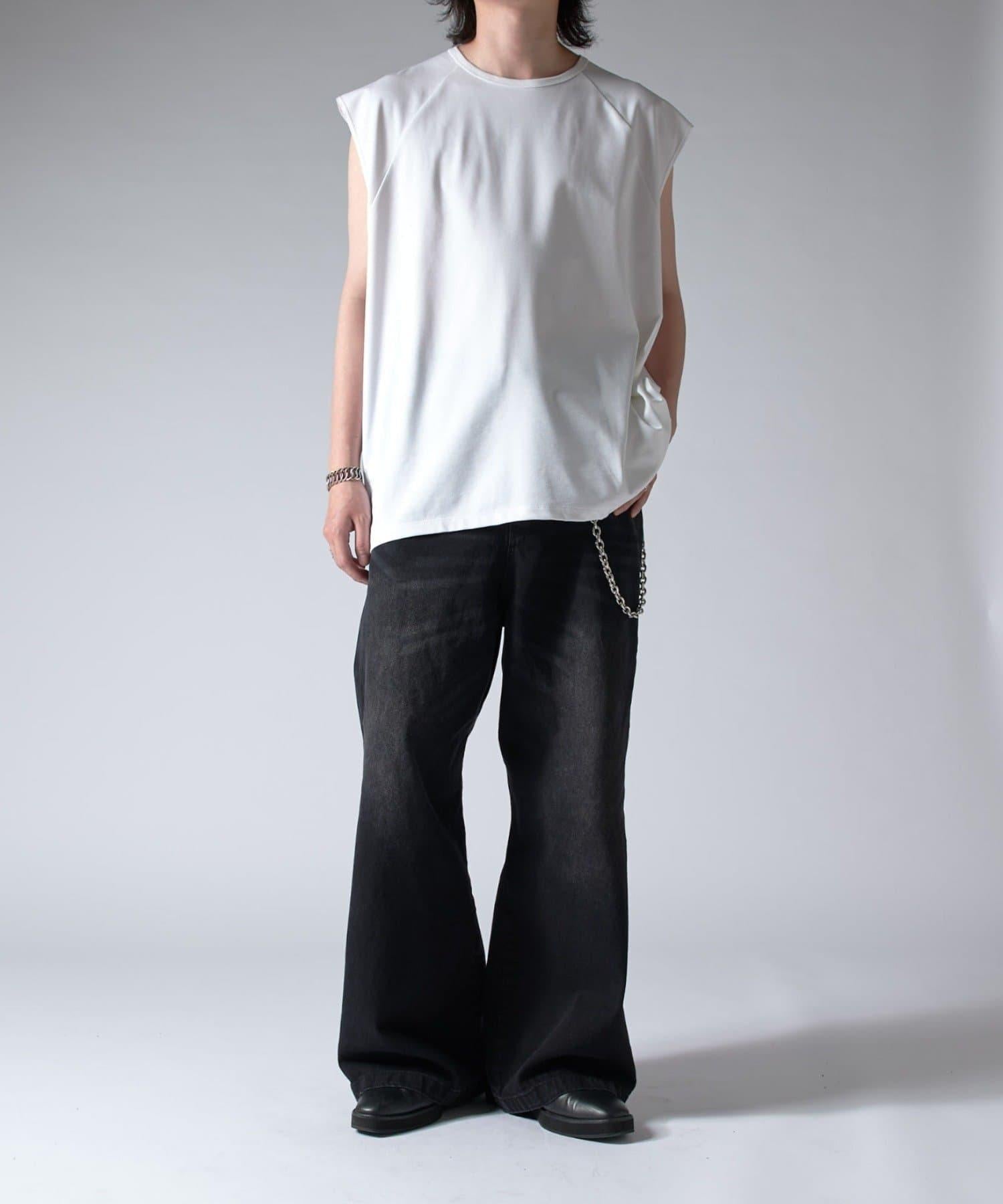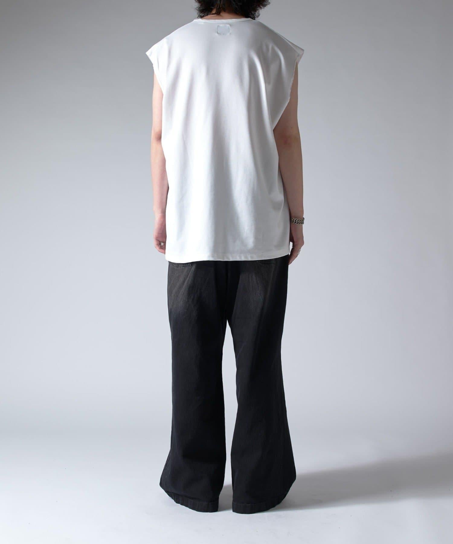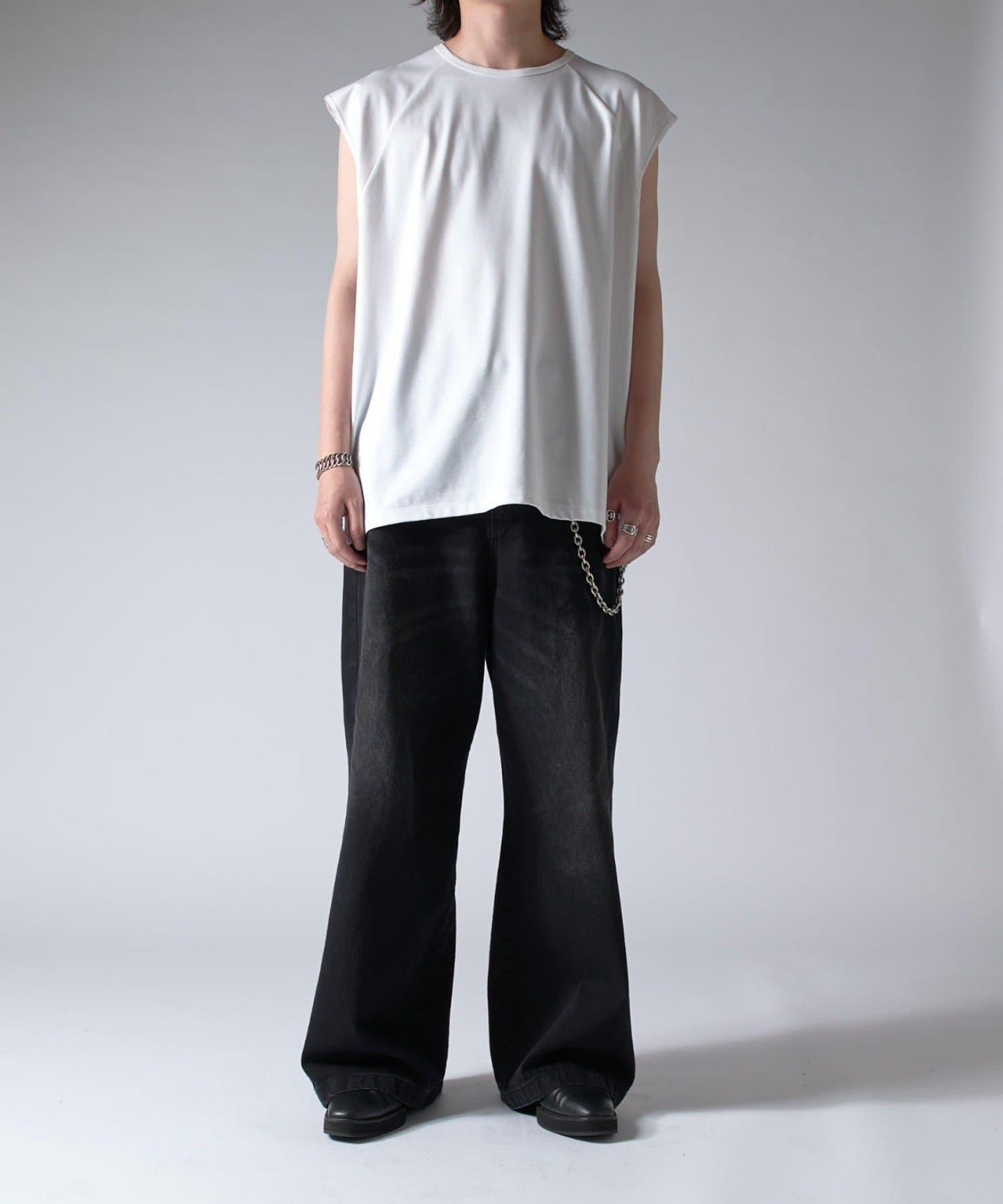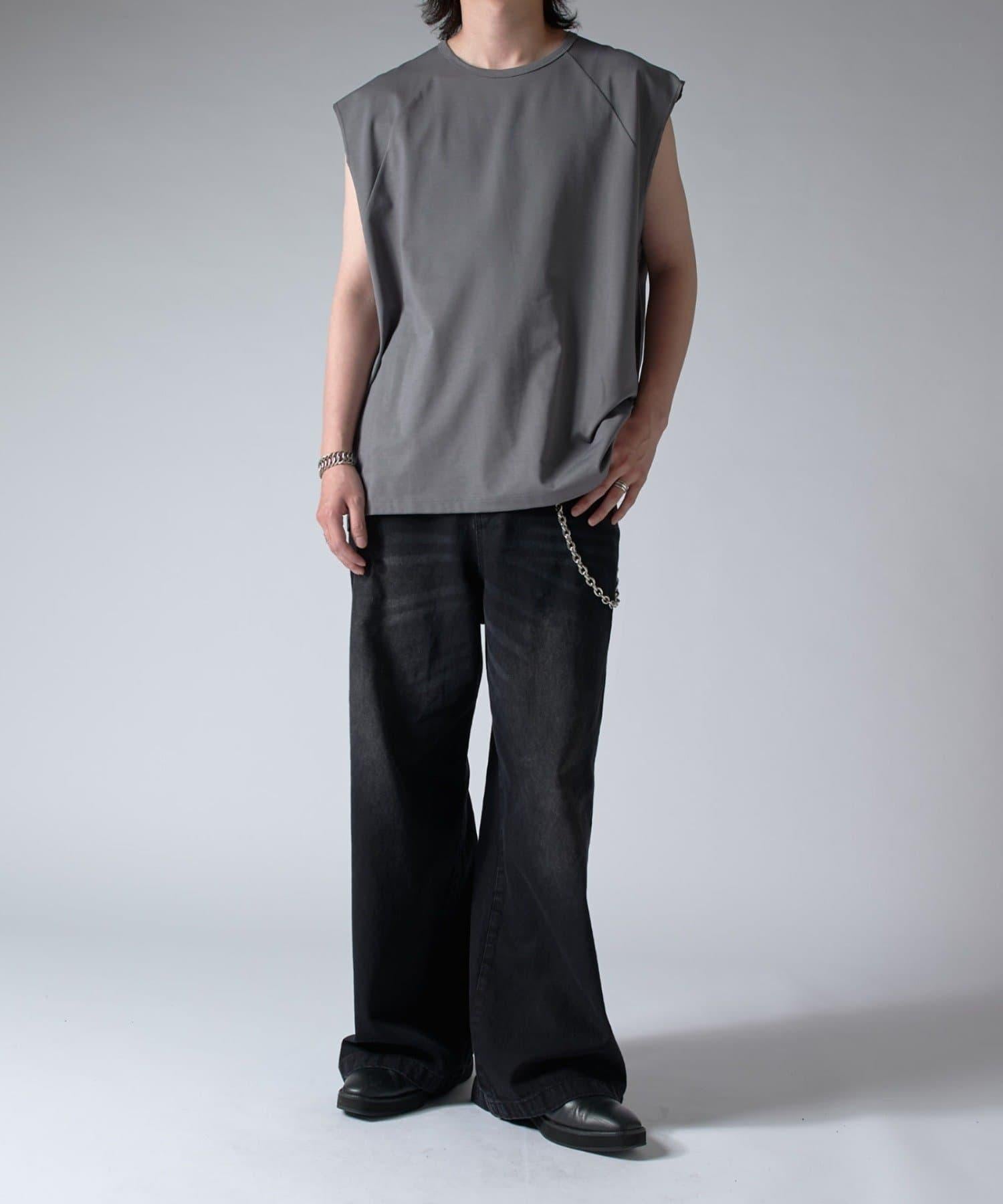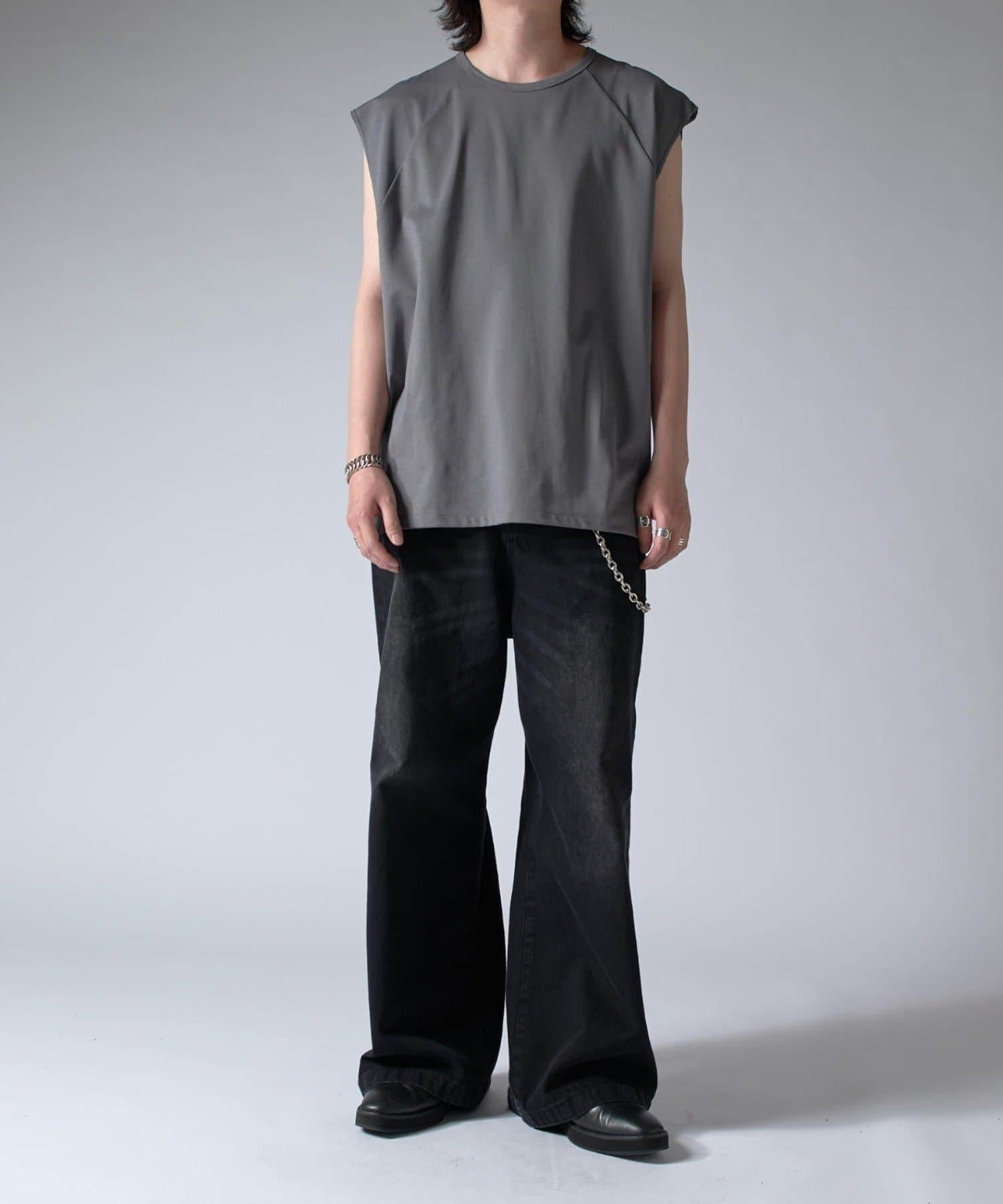 無袖剪裁縫製,落肩設計,袖子垂向一側。