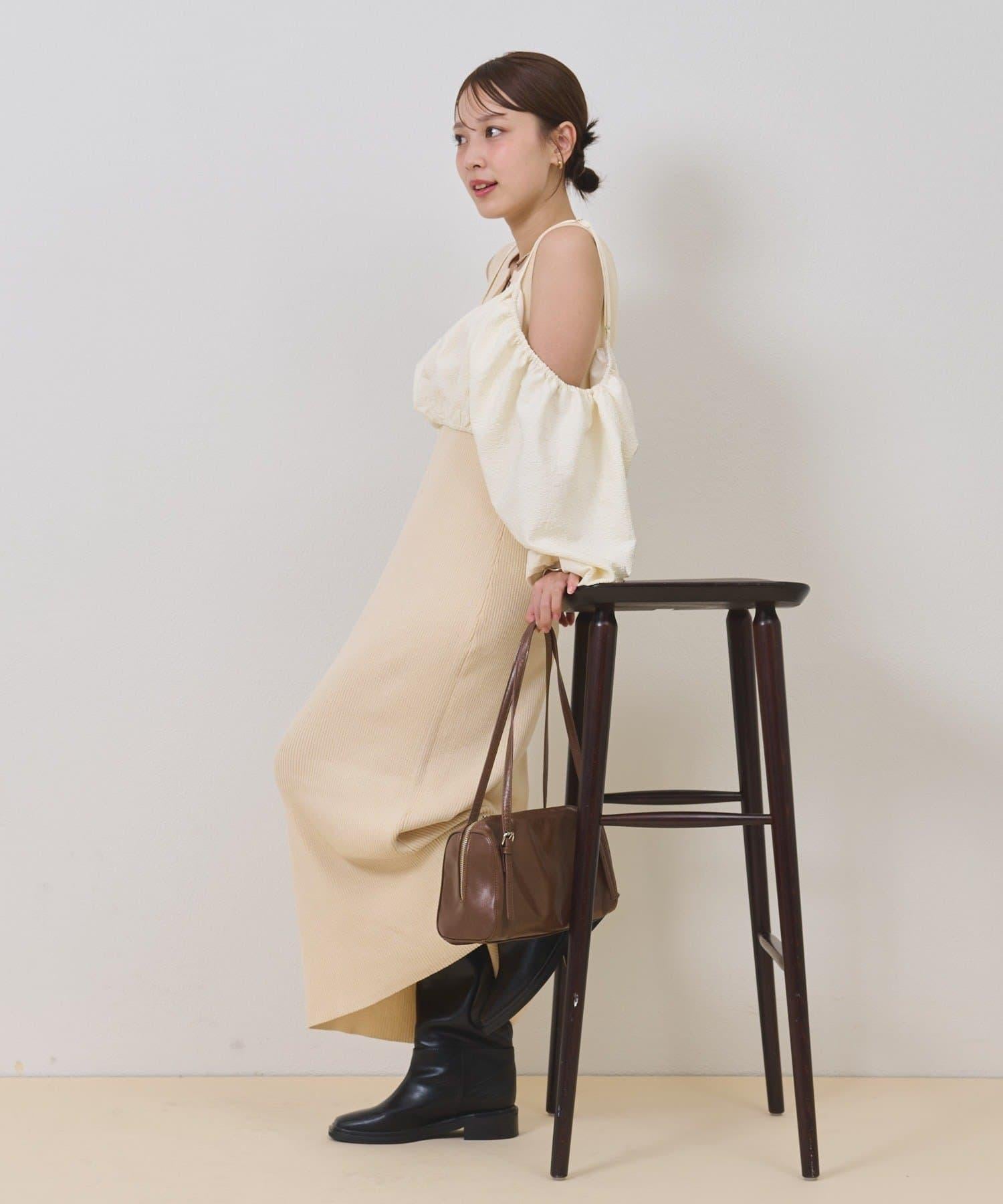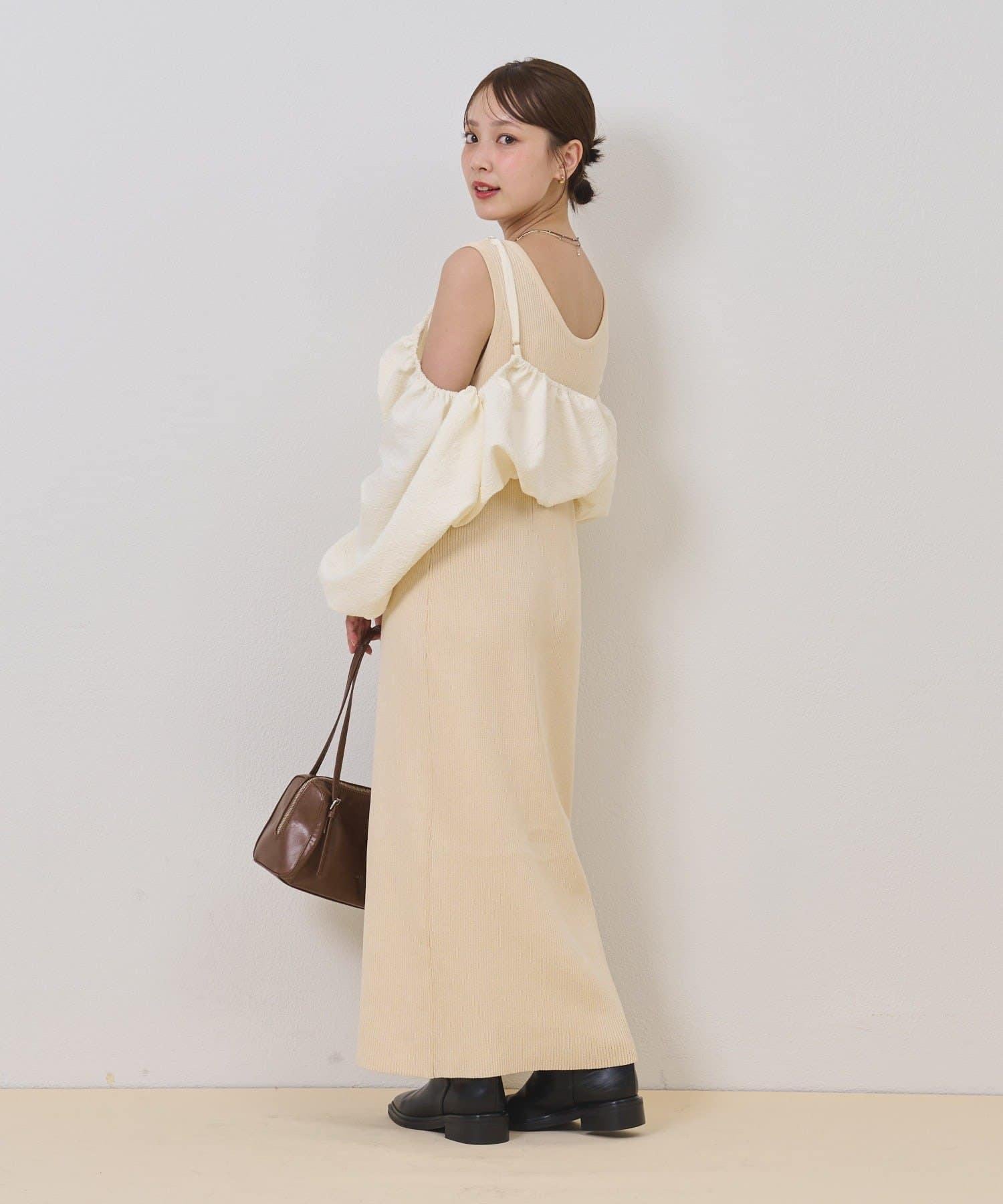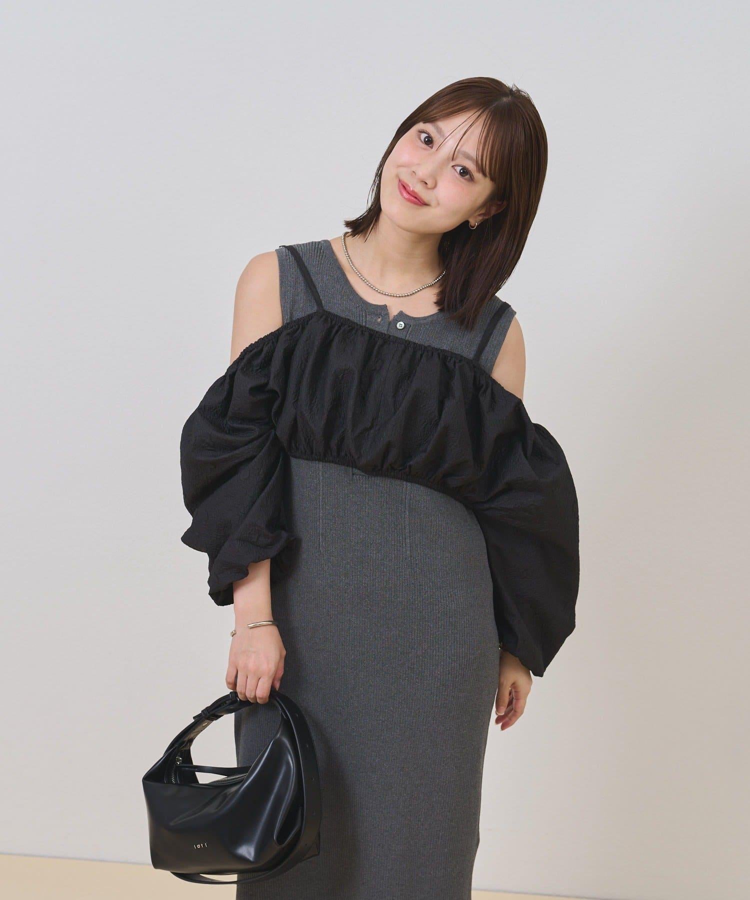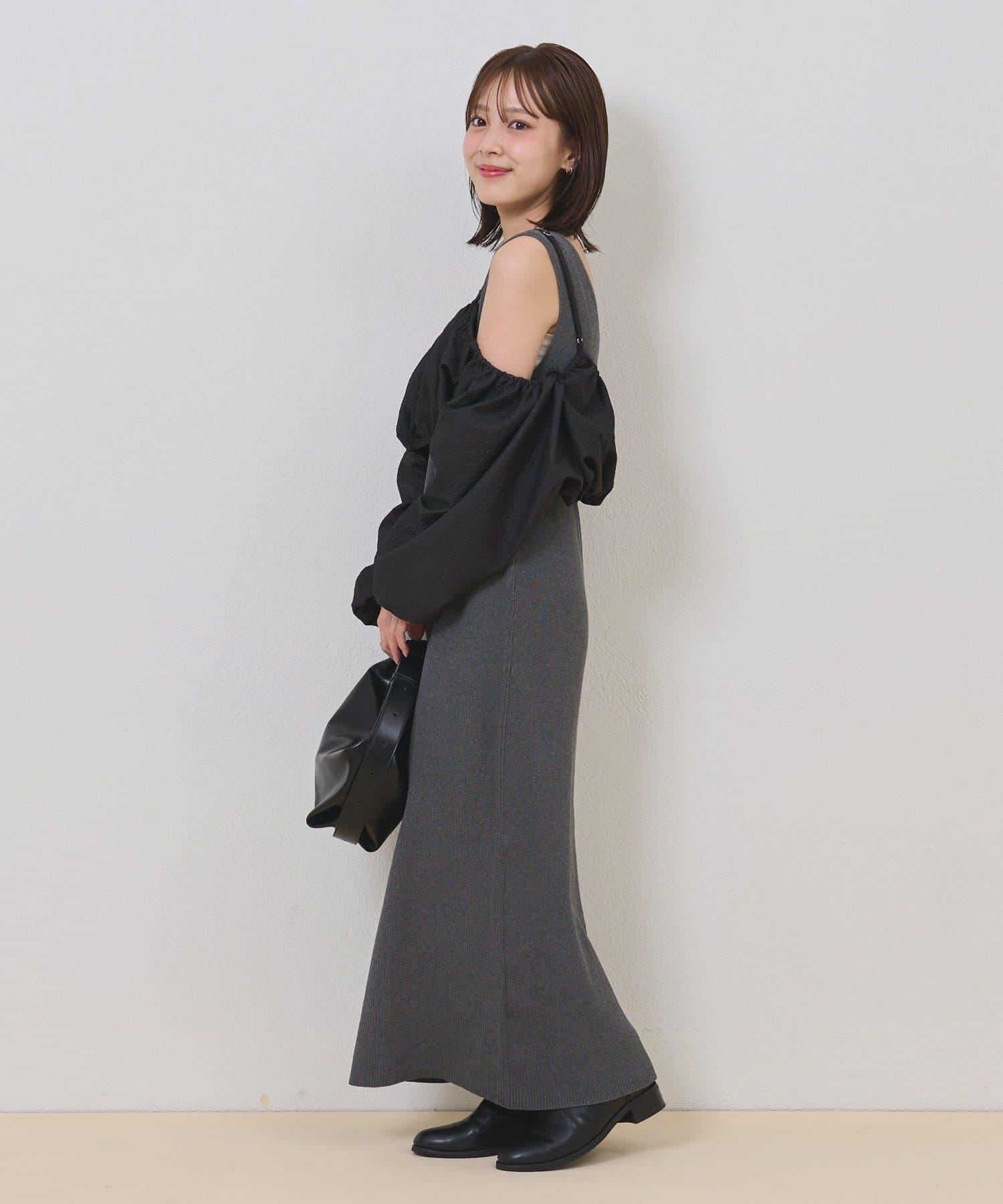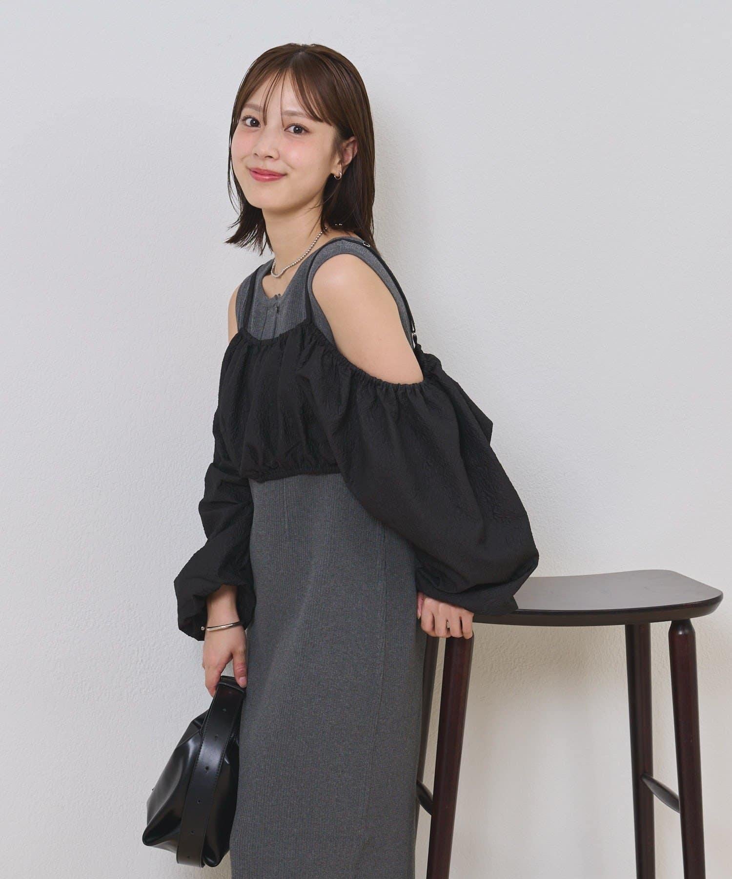 露肩上衣和針織連身裙的組合。這是能恰到好處地展現肌膚的帥氣連身裙。
