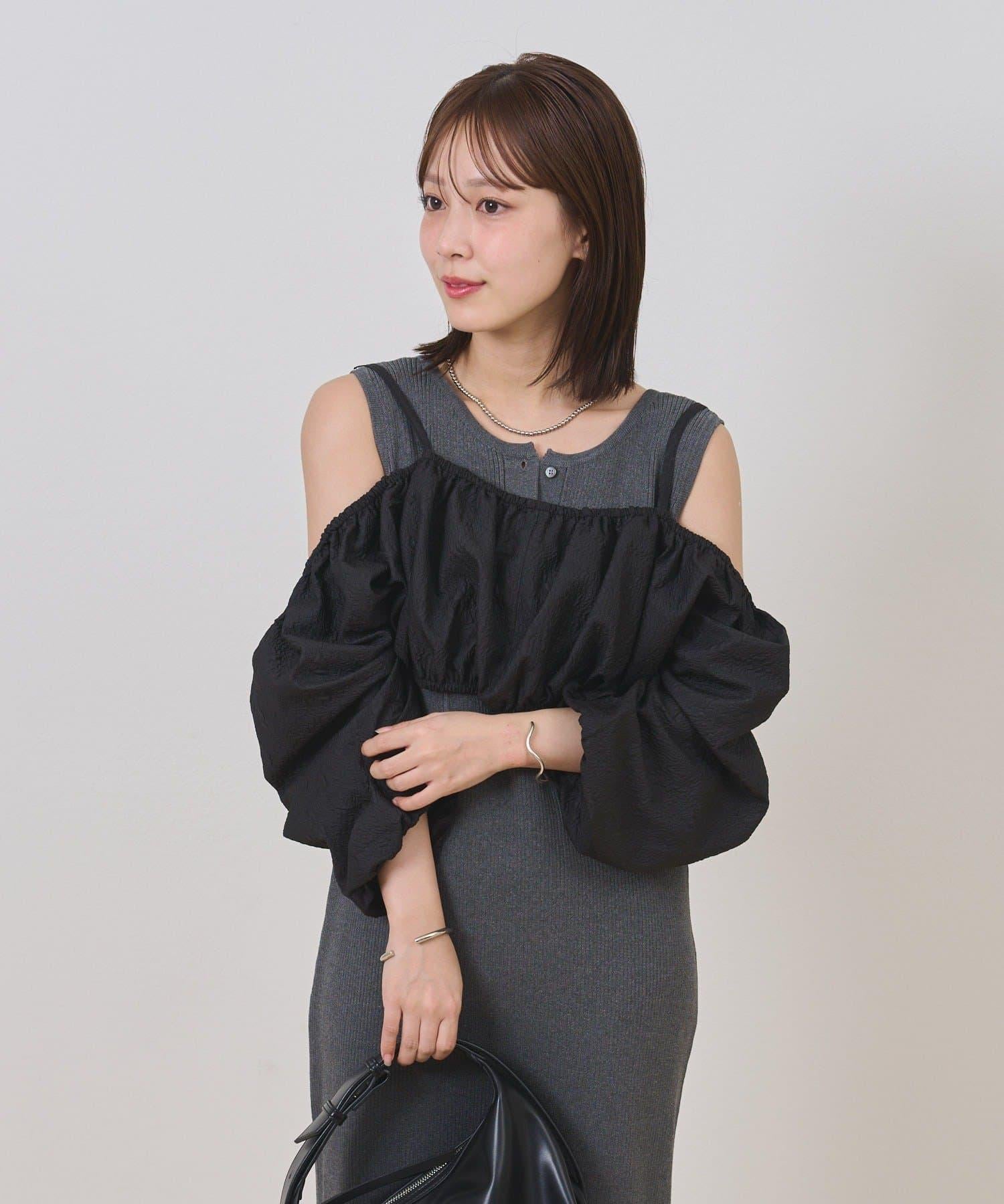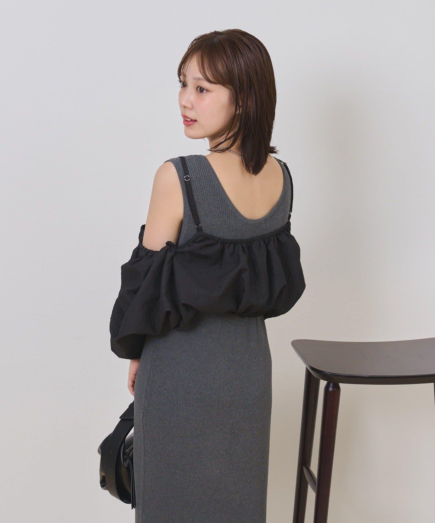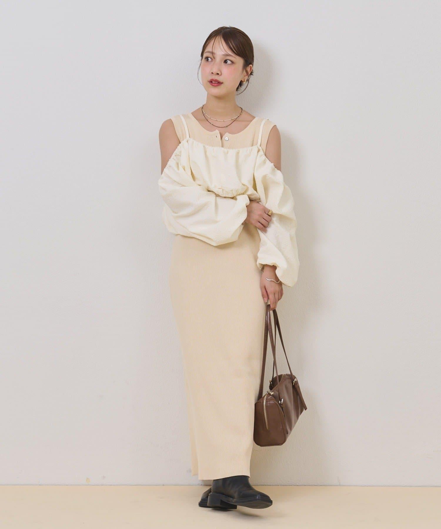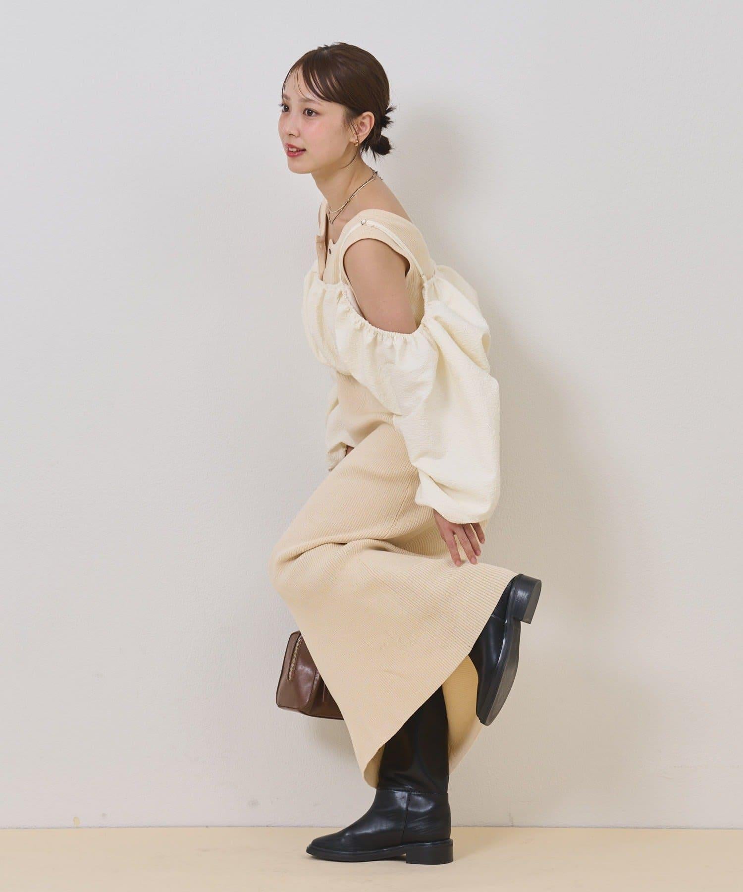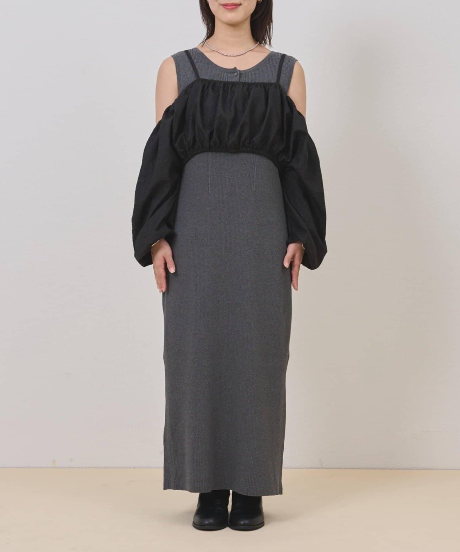 露肩上衣和針織連身裙的組合。這是能恰到好處地展現肌膚的帥氣連身裙。