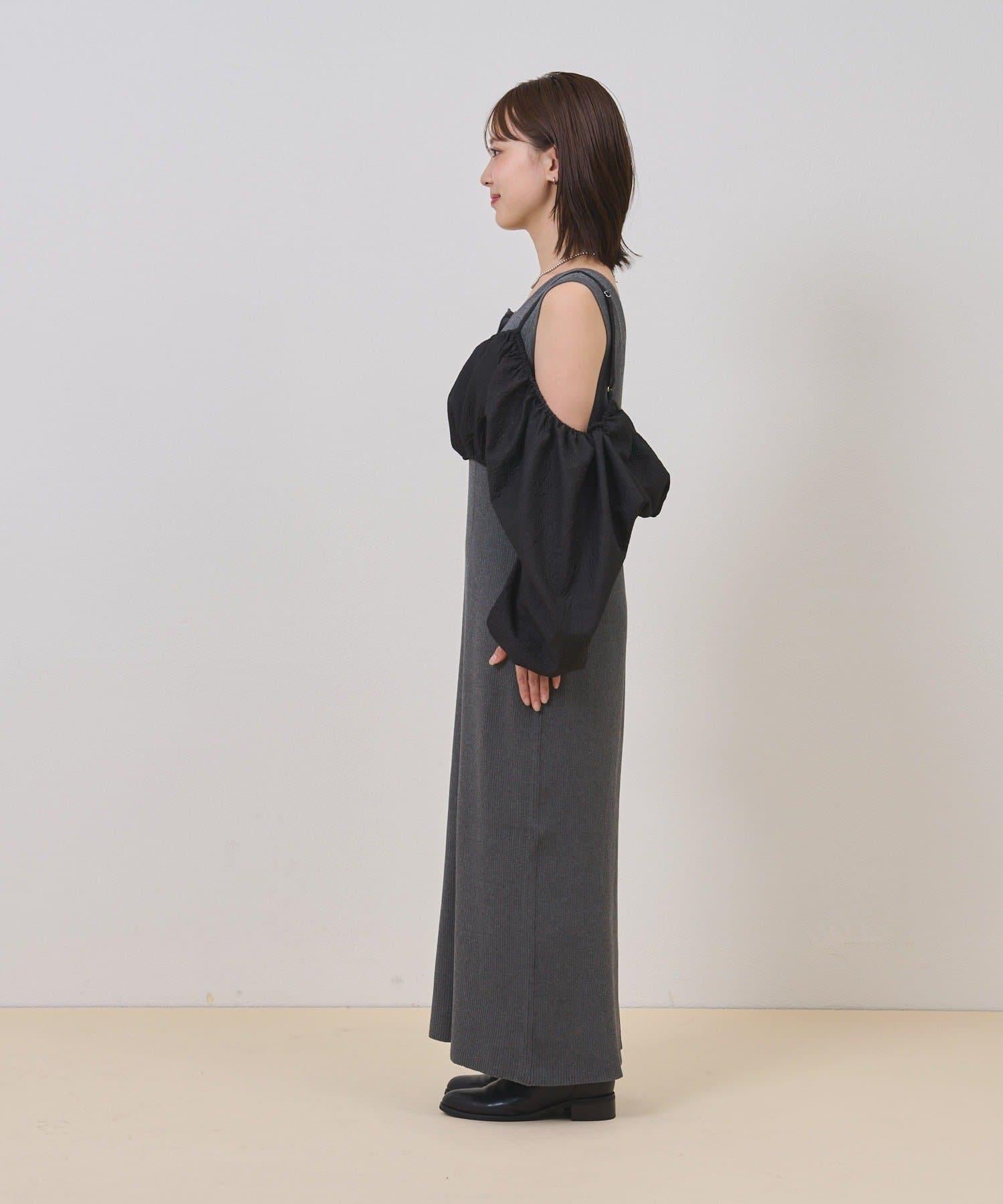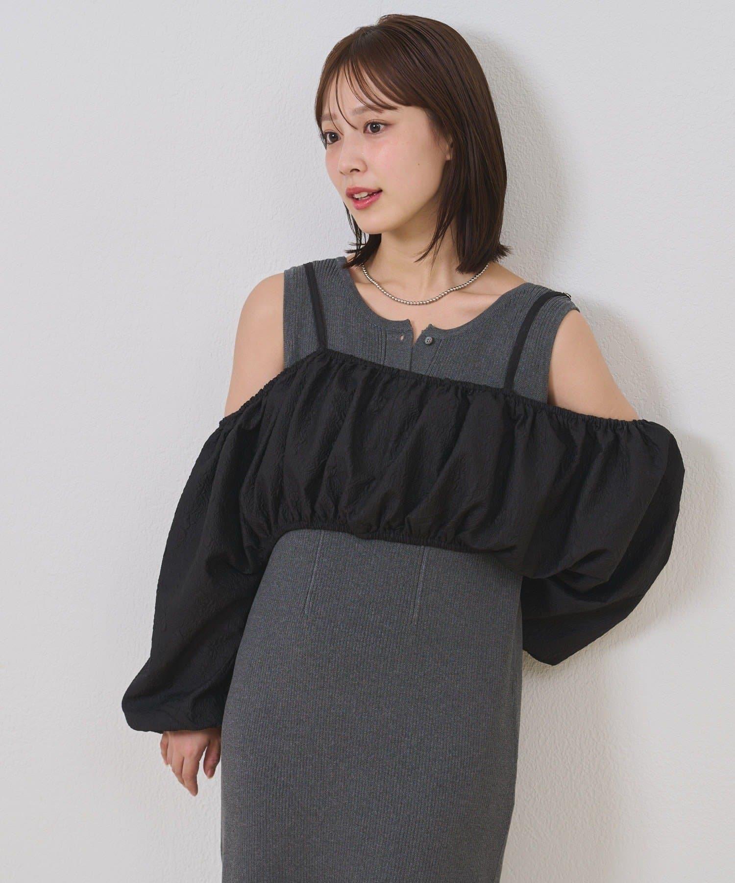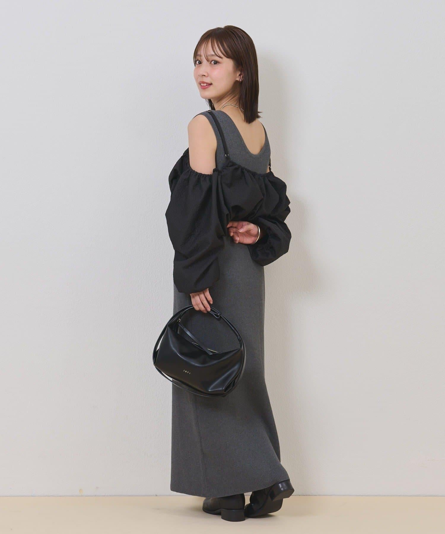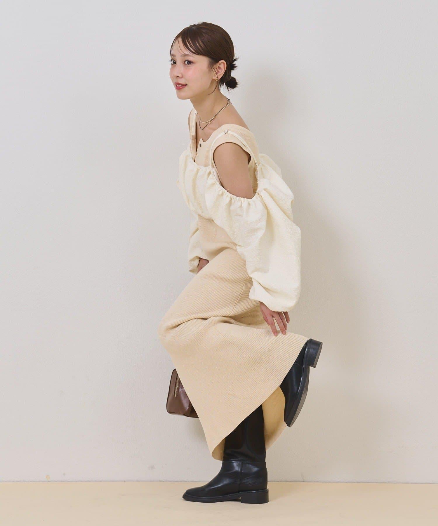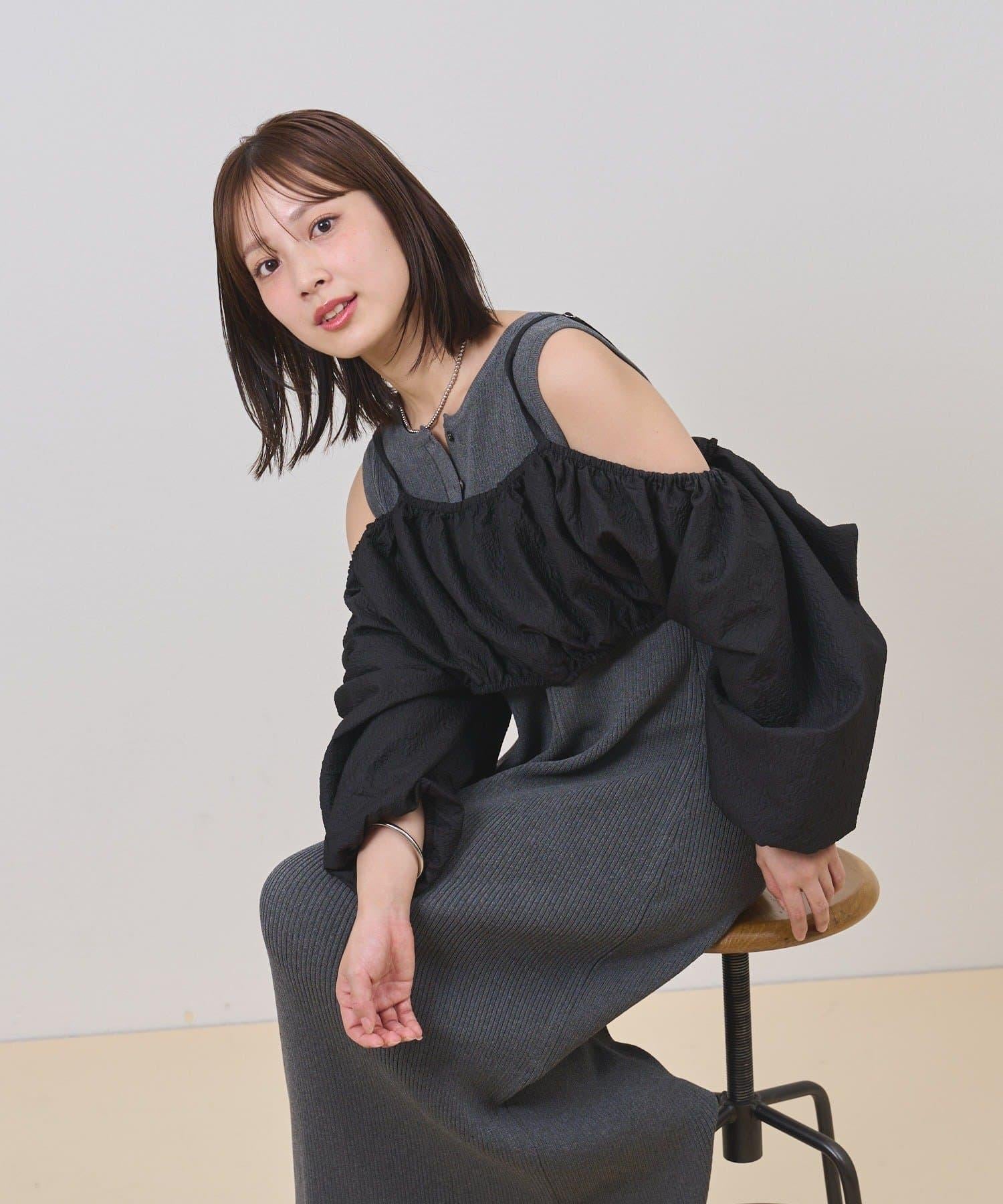 露肩上衣和針織連身裙的組合。這是能恰到好處地展現肌膚的帥氣連身裙。