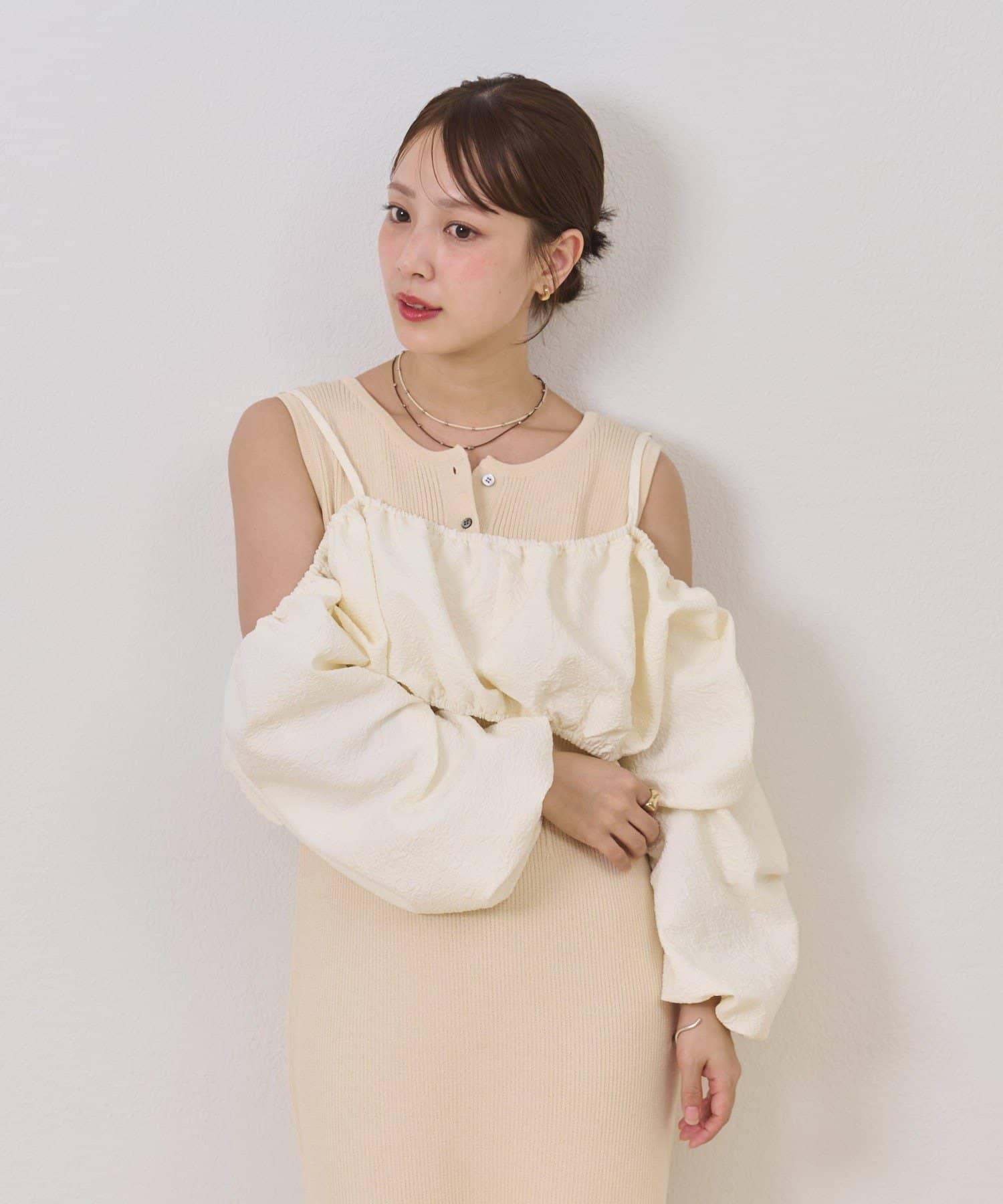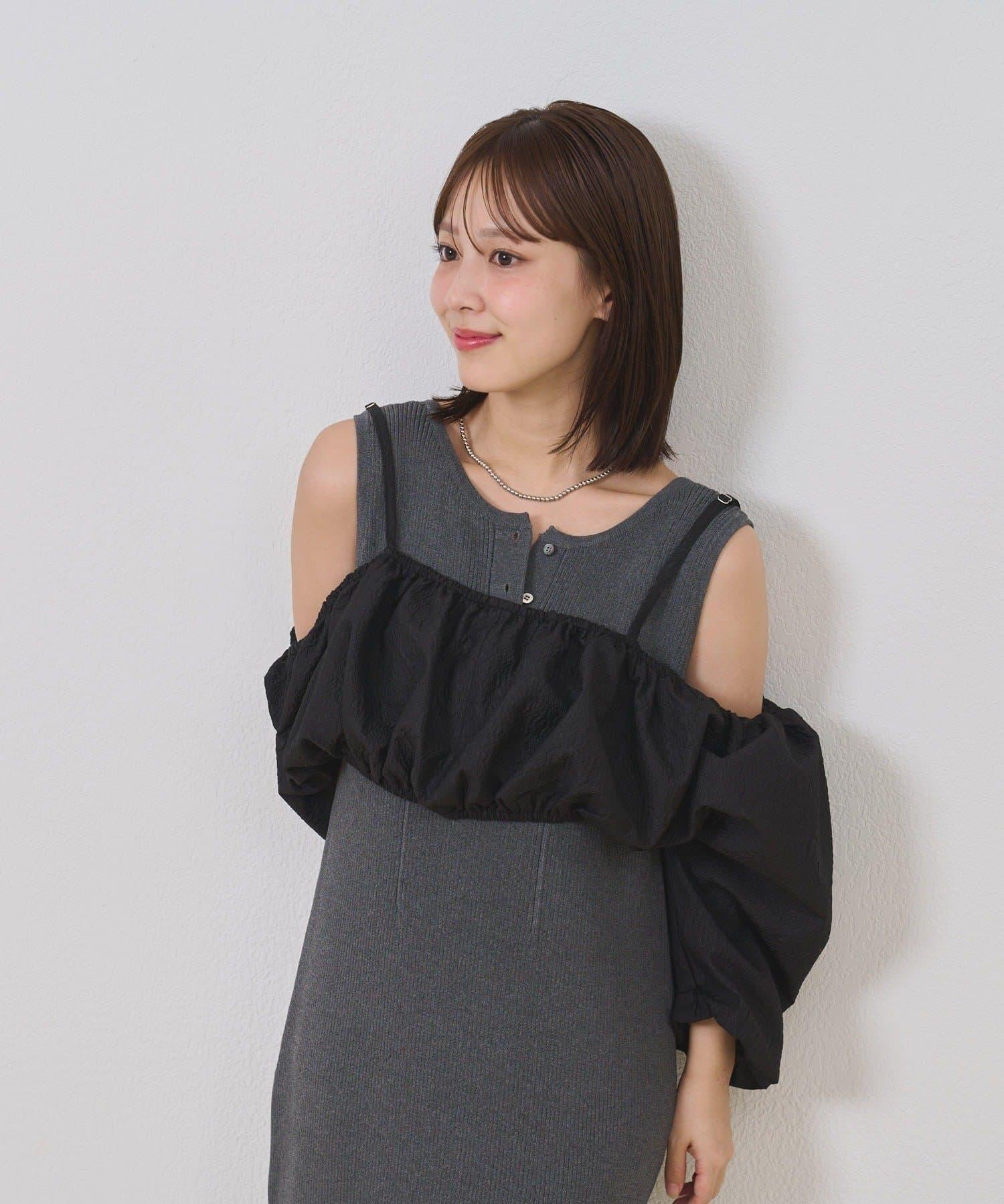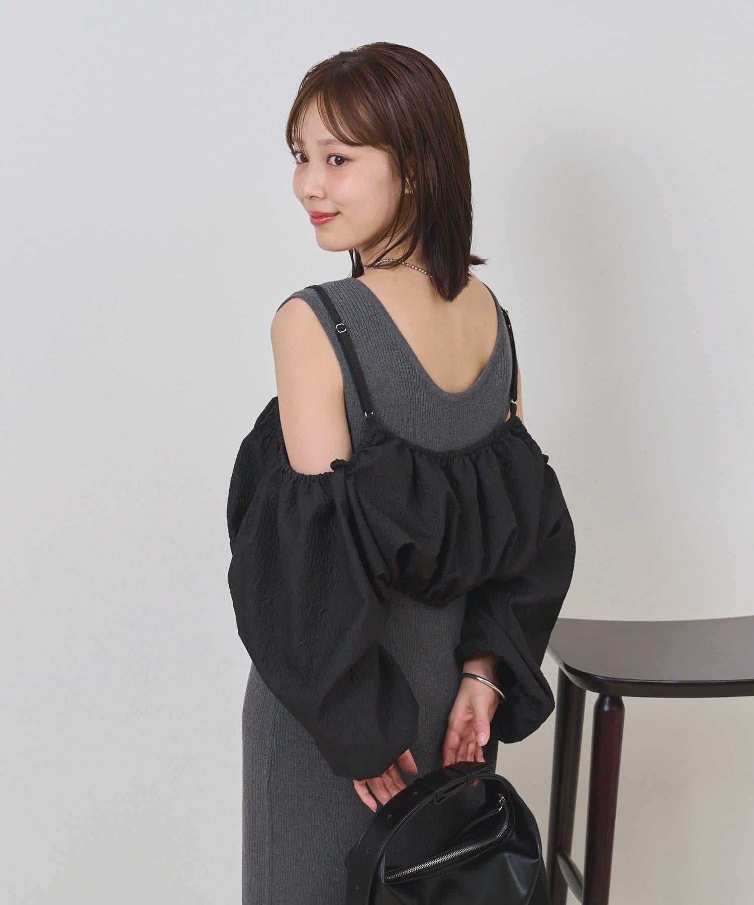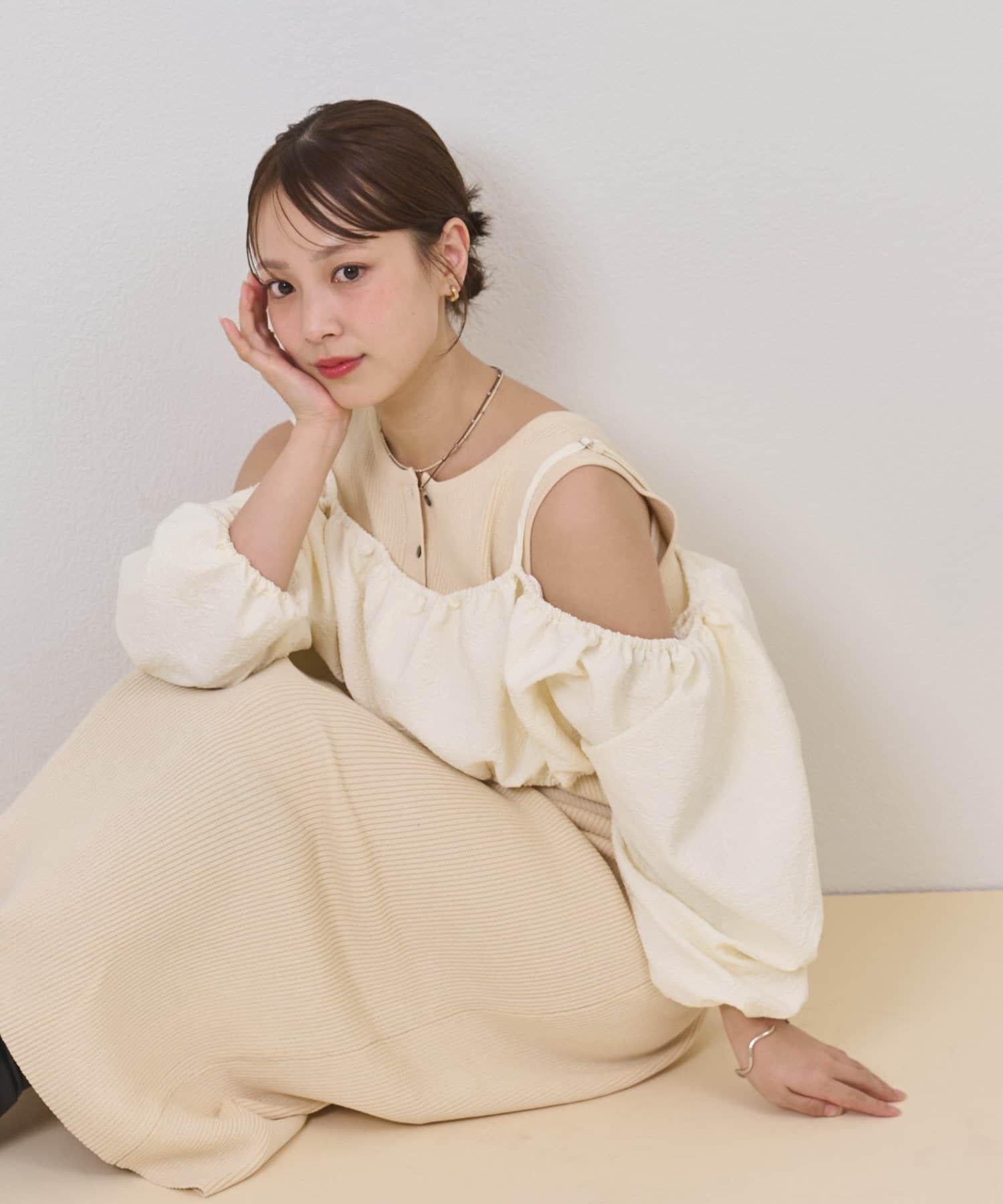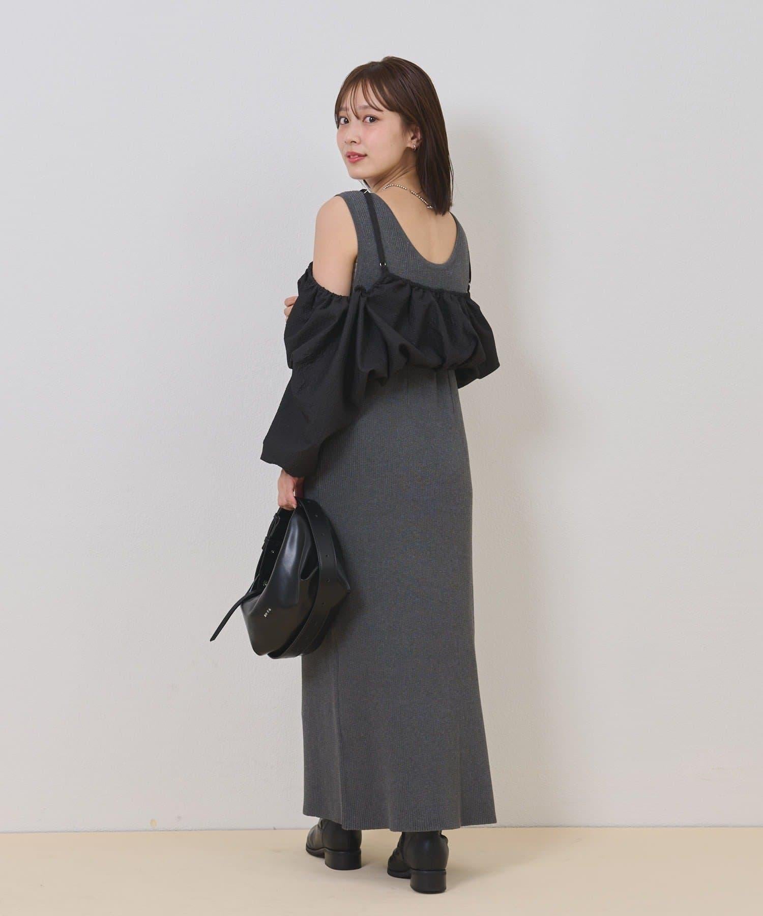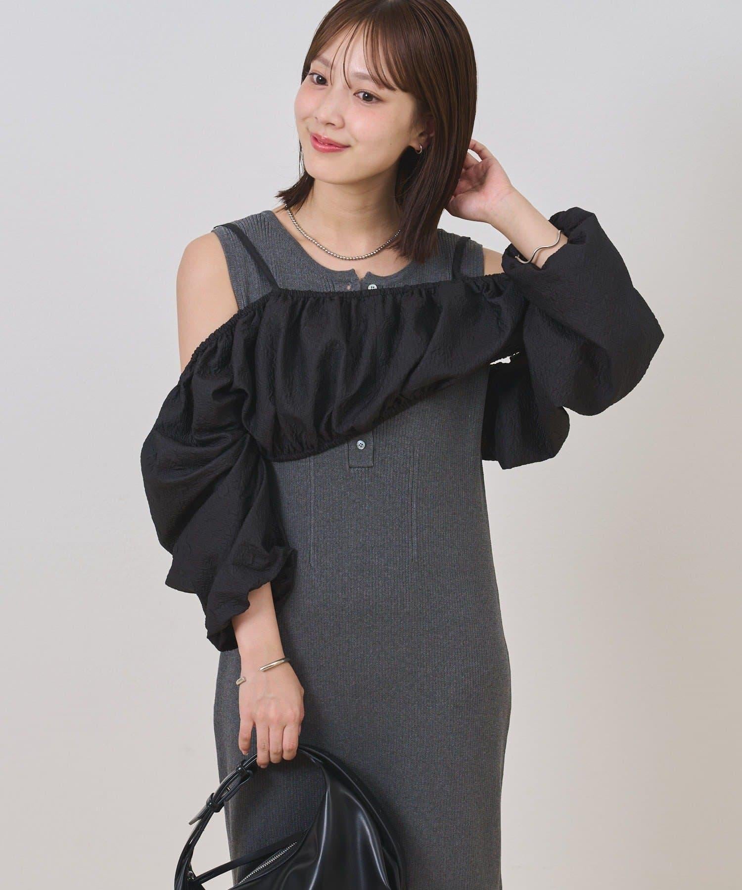 露肩上衣和針織連身裙的組合。這是能恰到好處地展現肌膚的帥氣連身裙。