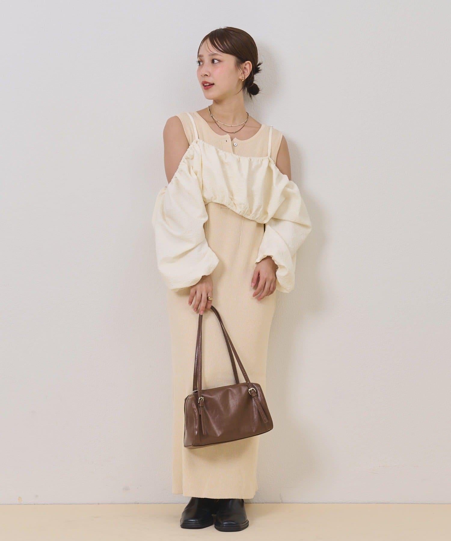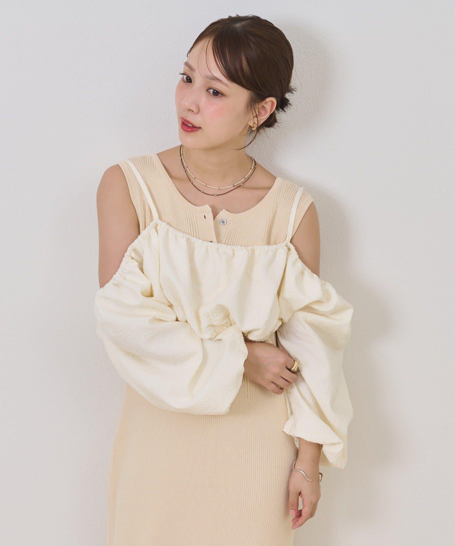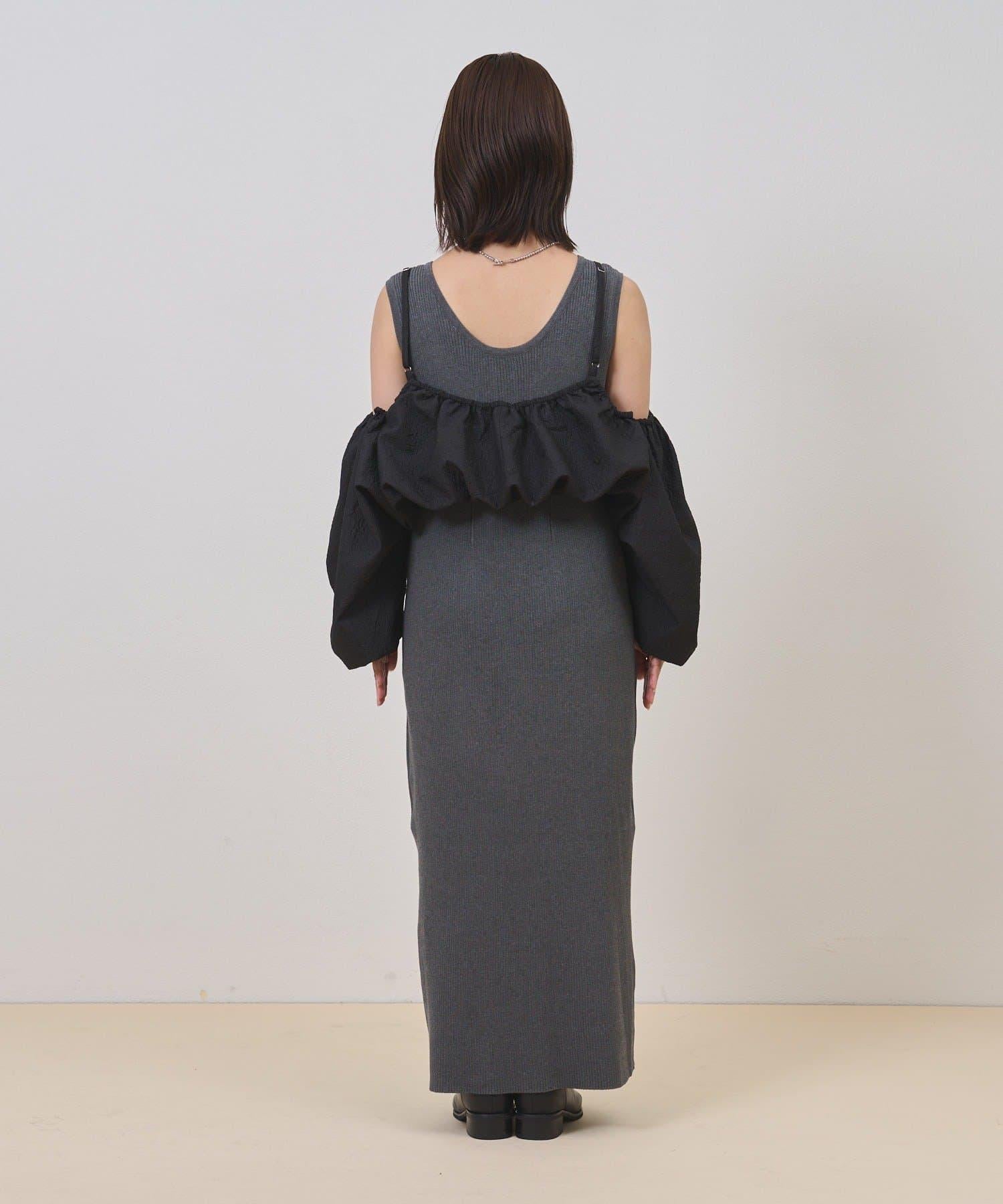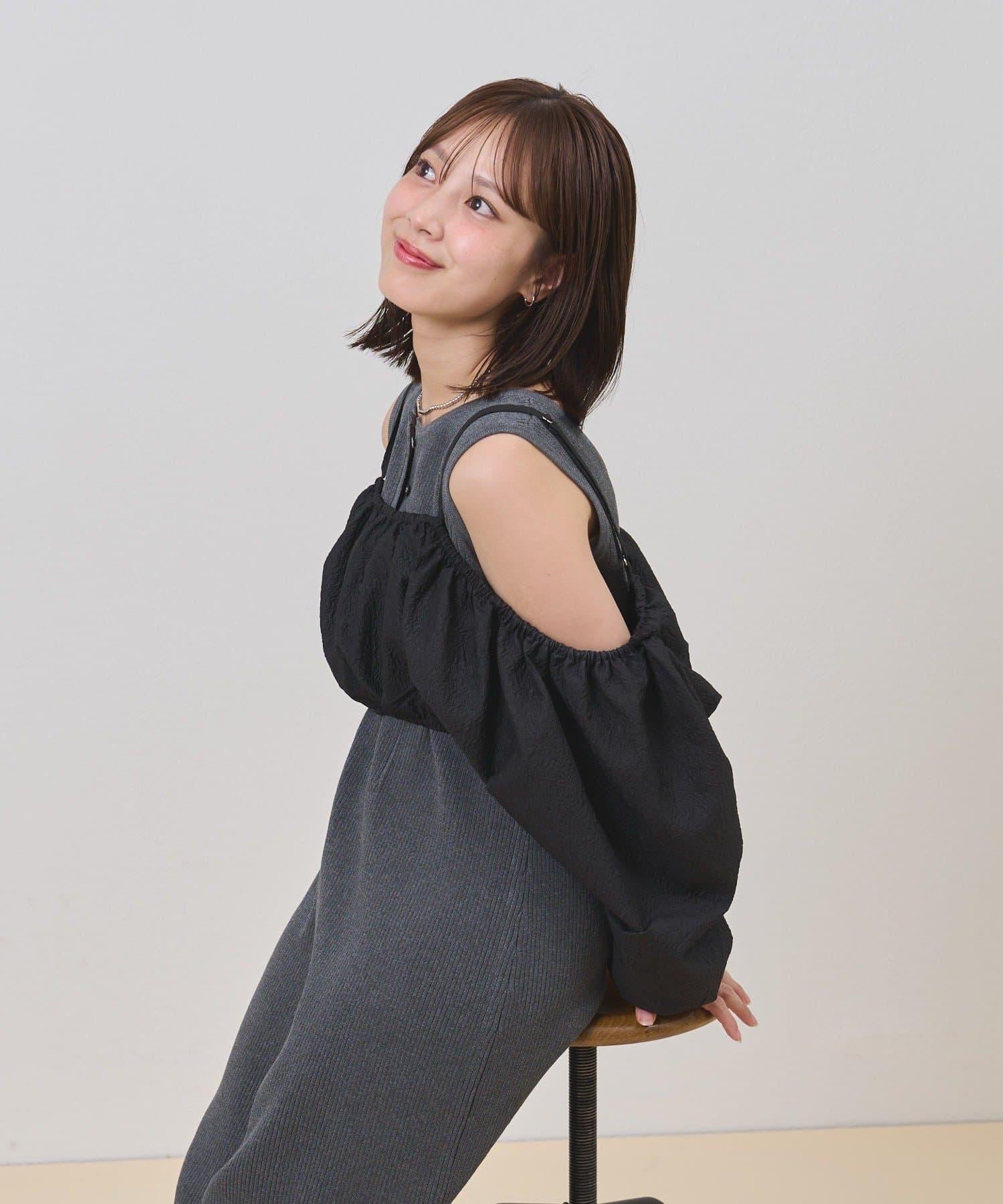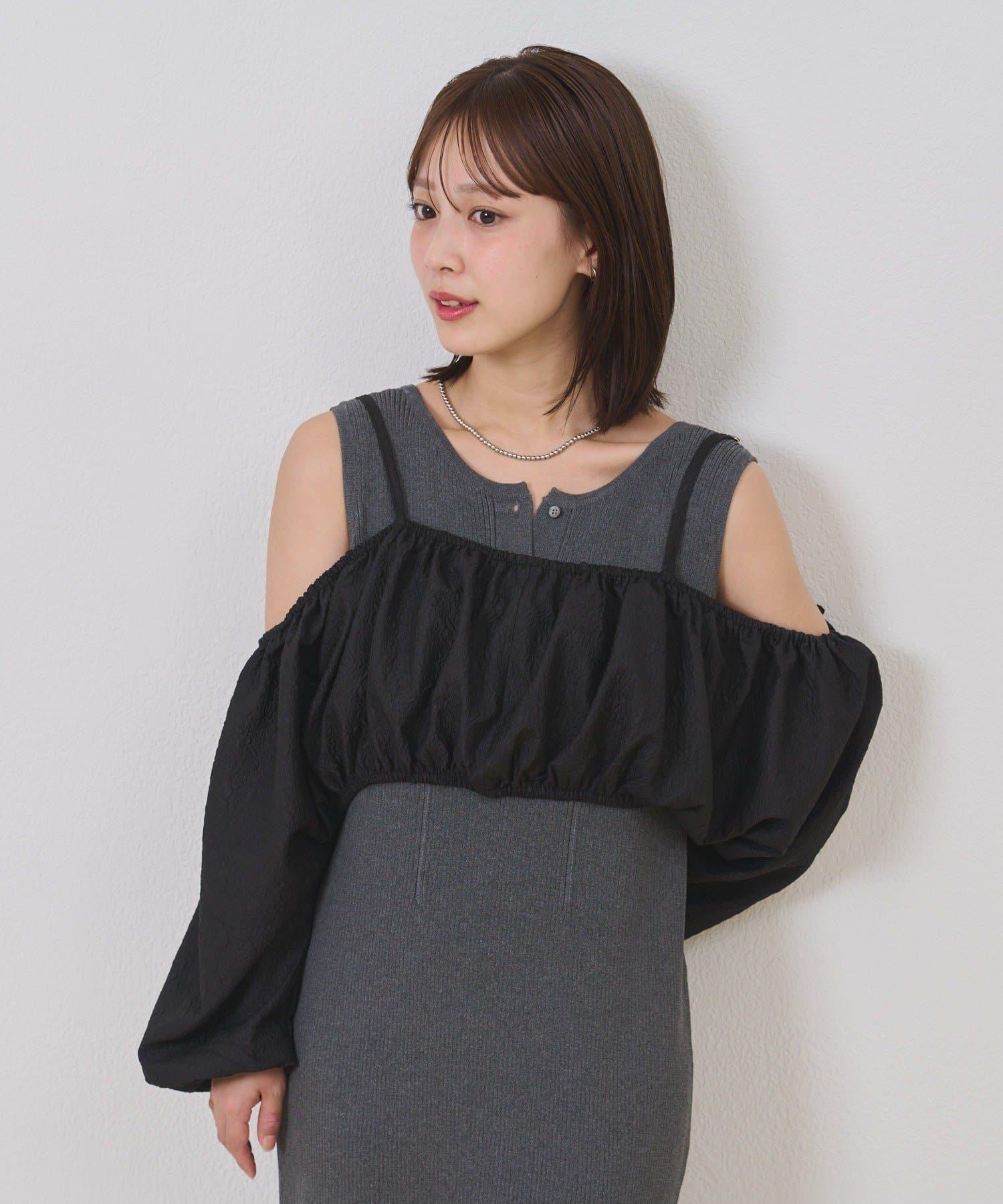 露肩上衣和針織連身裙的組合。這是能恰到好處地展現肌膚的帥氣連身裙。