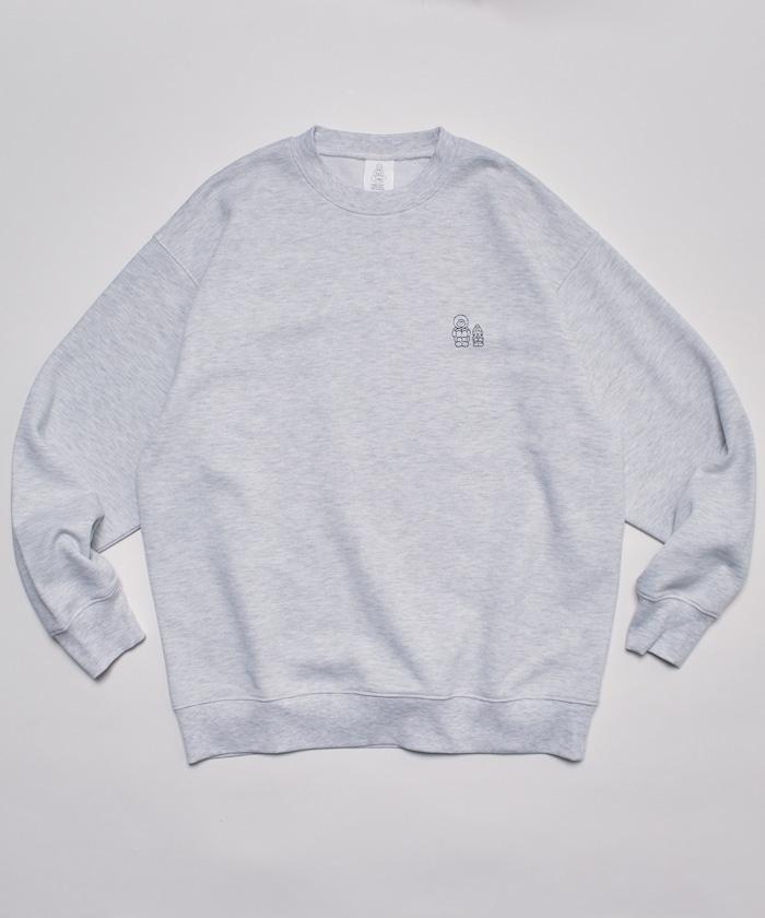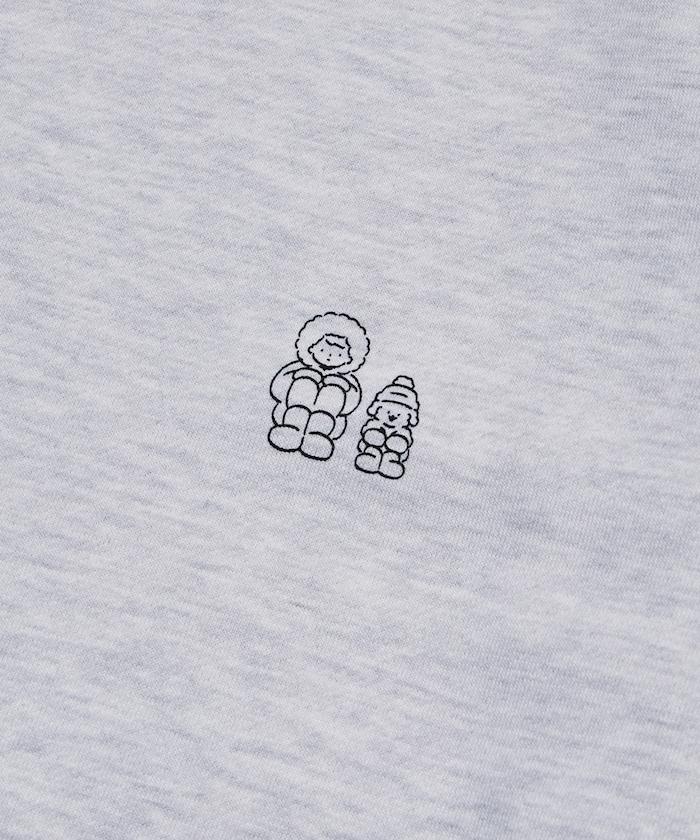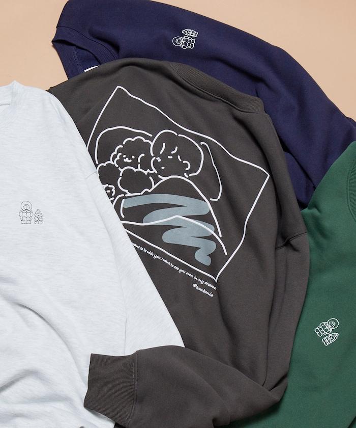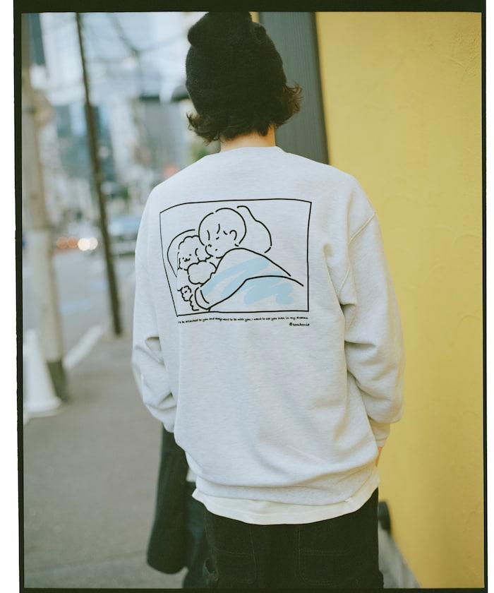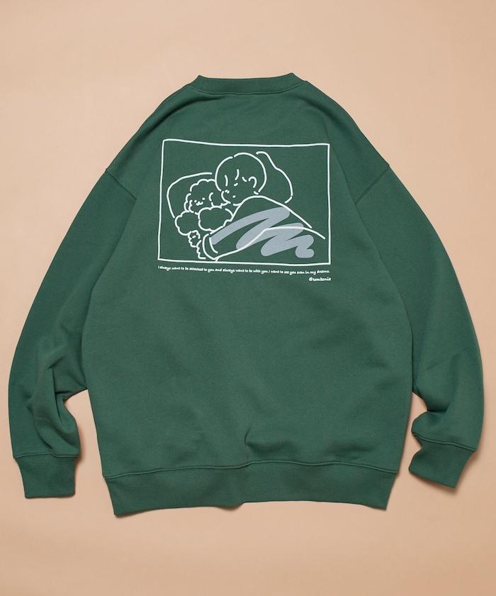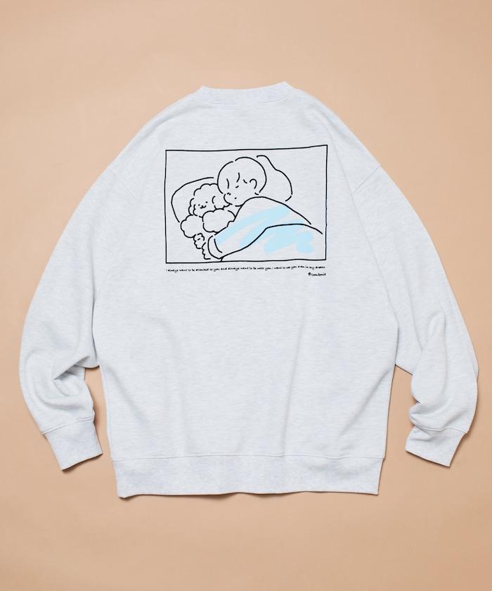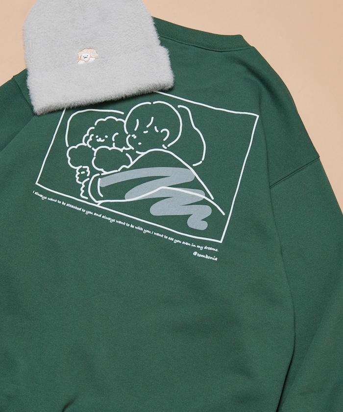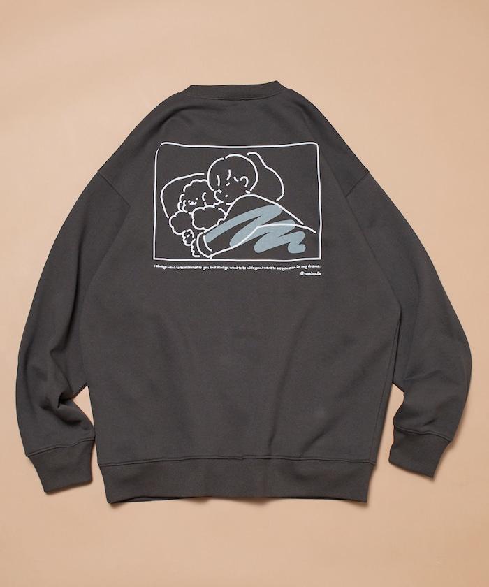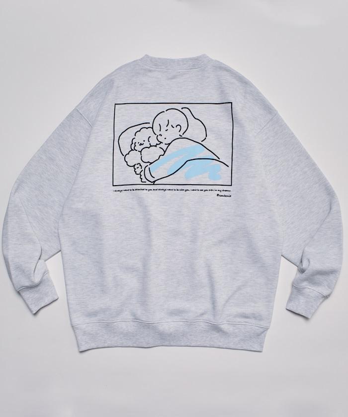 這件運動衫上的插圖是 tombonia 標誌性的 Mook 與一個男孩睡在一起。