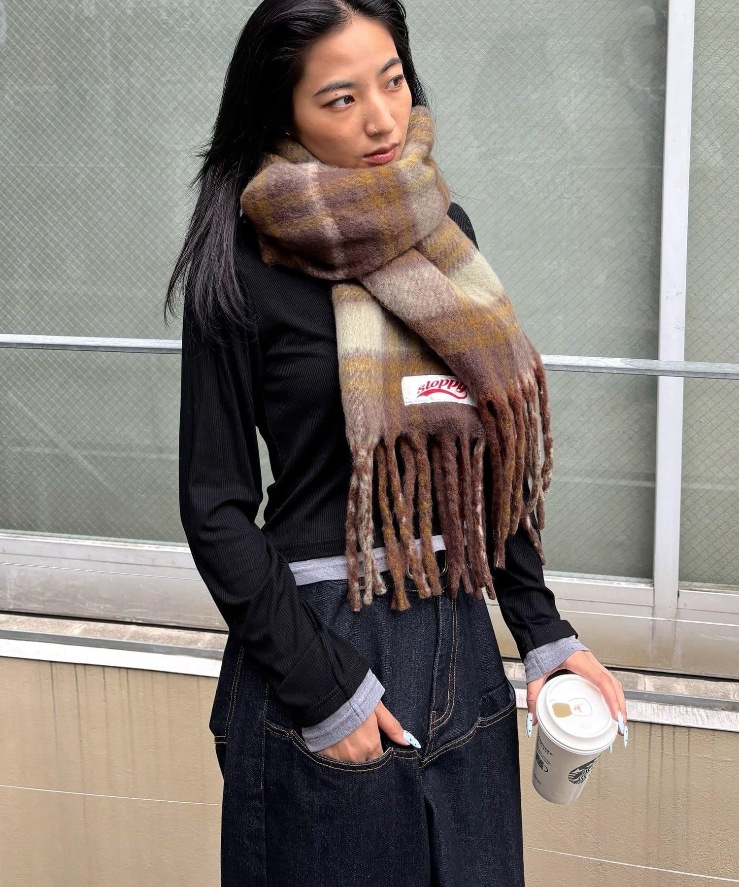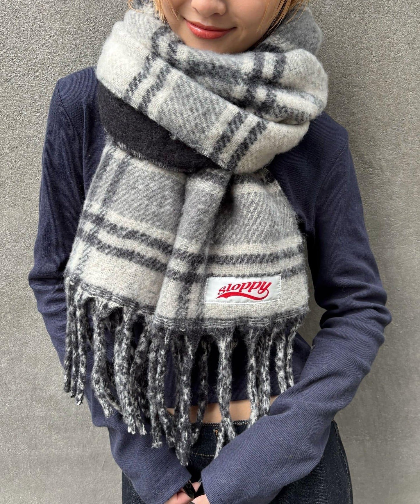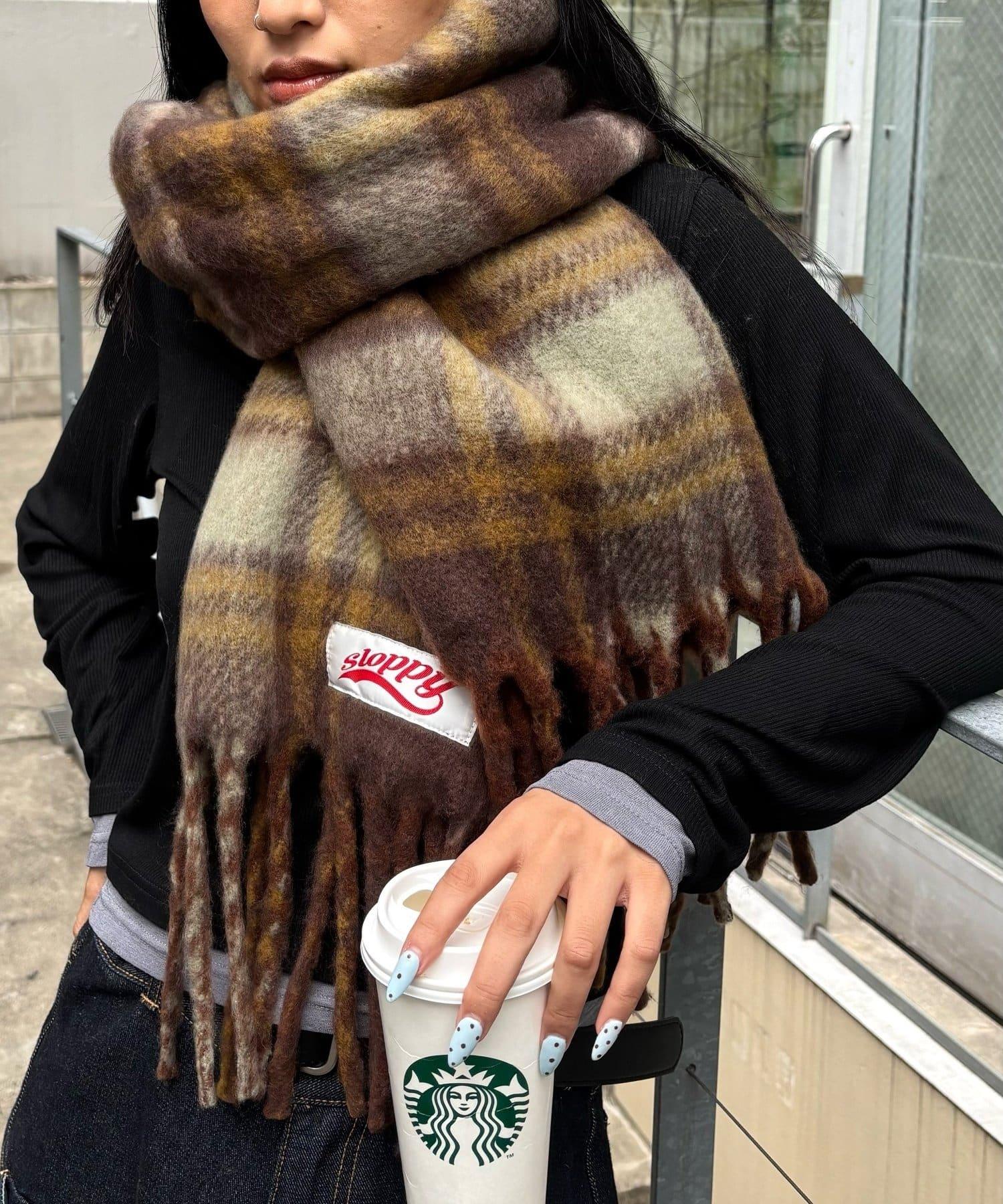 這款棋盤格圍巾採用了 SLOPPY 典型的俏皮設計。