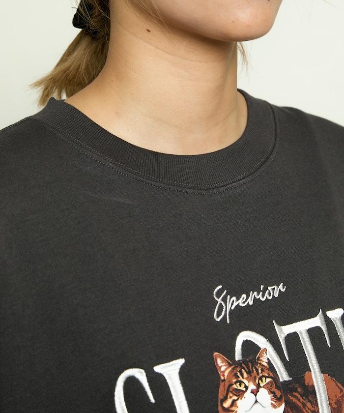 這款圓領運動衫的動物印花圖案是一隻嘟著嘴的可愛貓咪,胸前的英文字母刺繡則凸顯了它的出眾氣質。