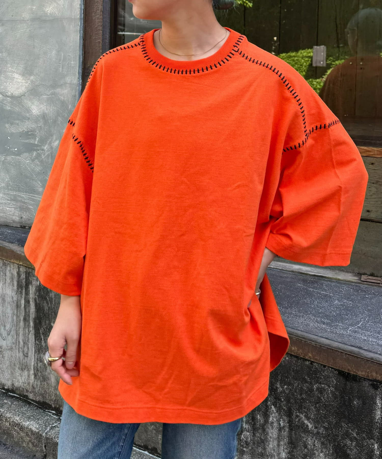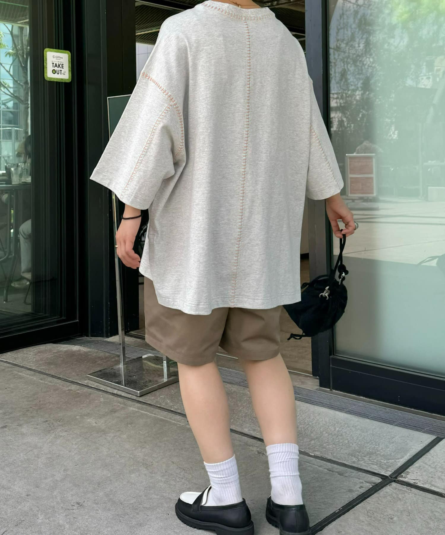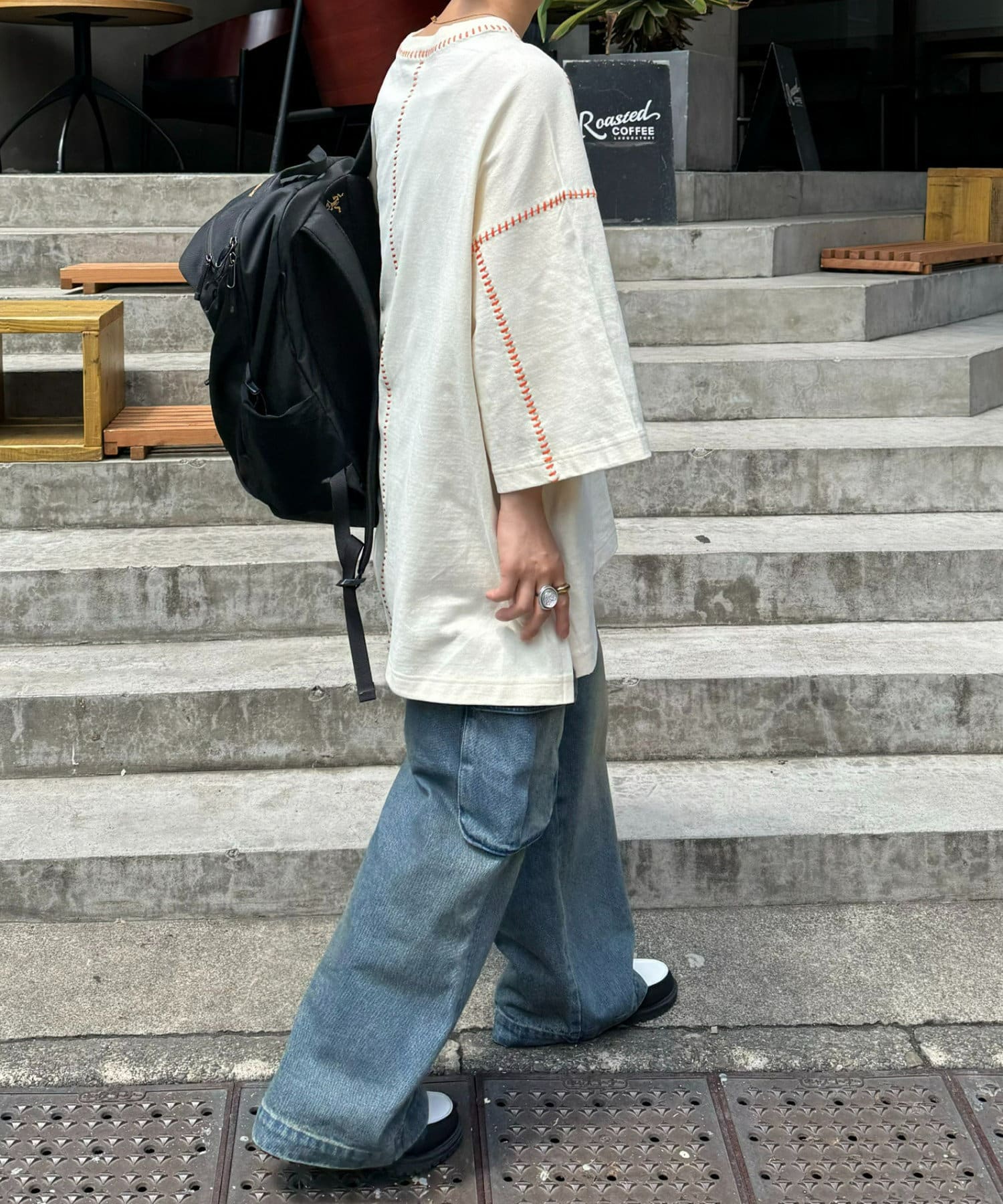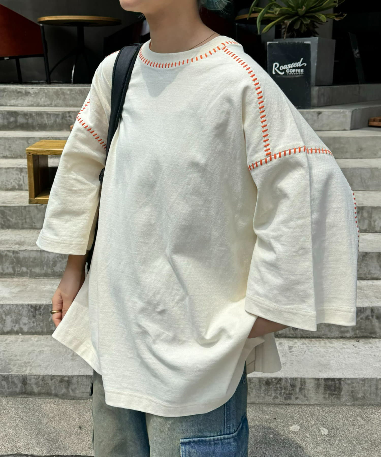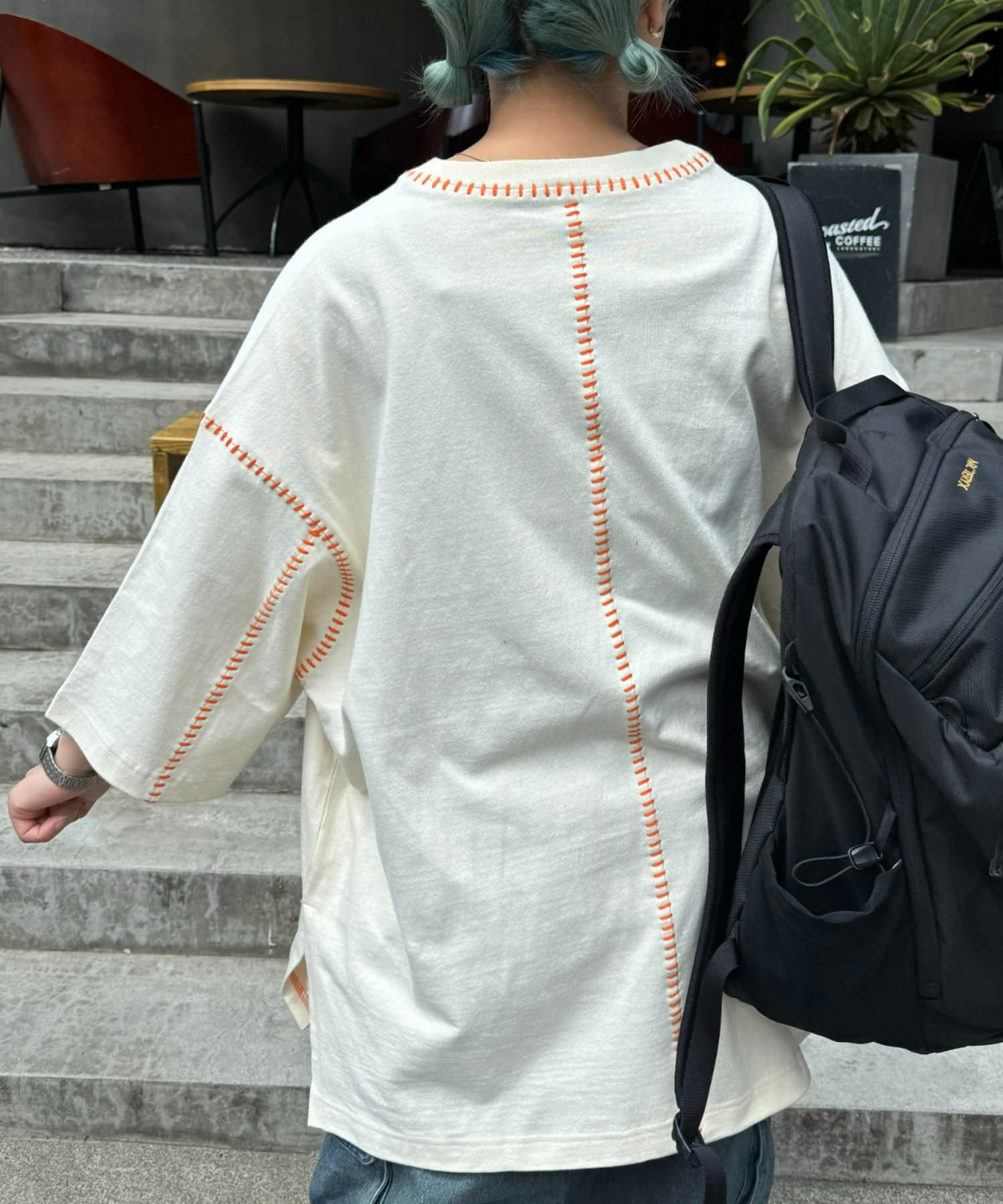 寬鬆的尺寸和撞色縫線使這款 T 恤從各個角度看都很時尚。