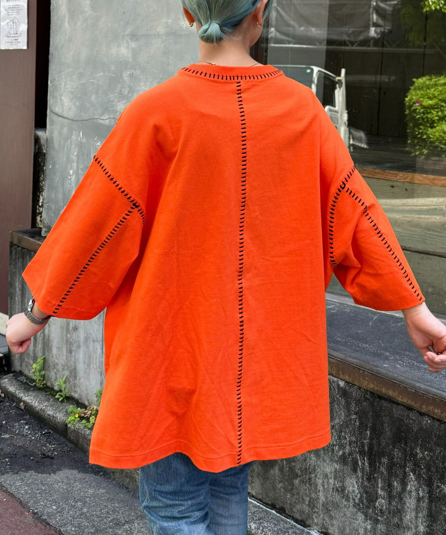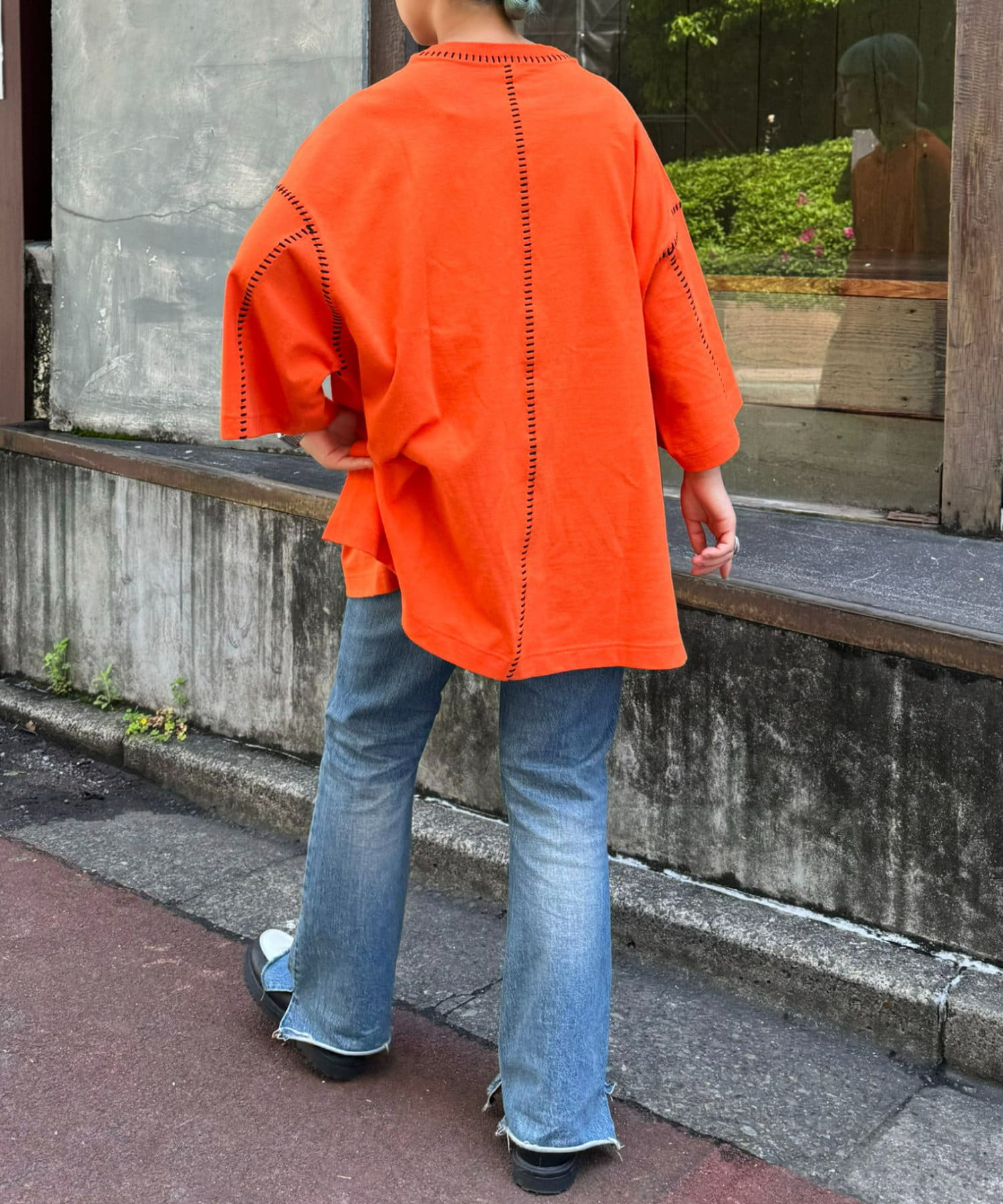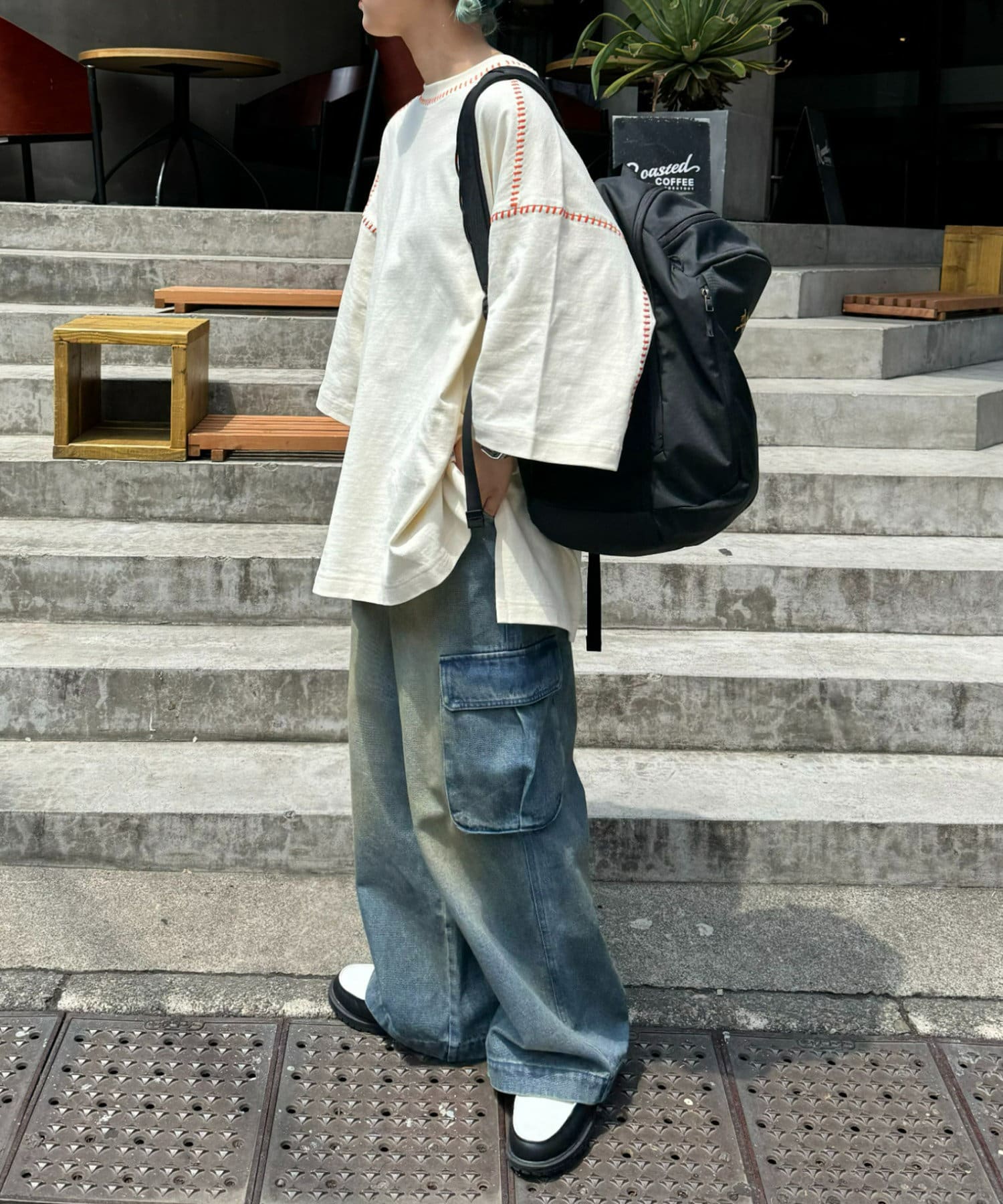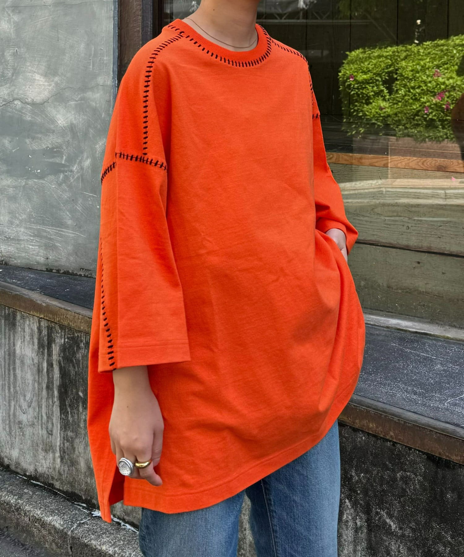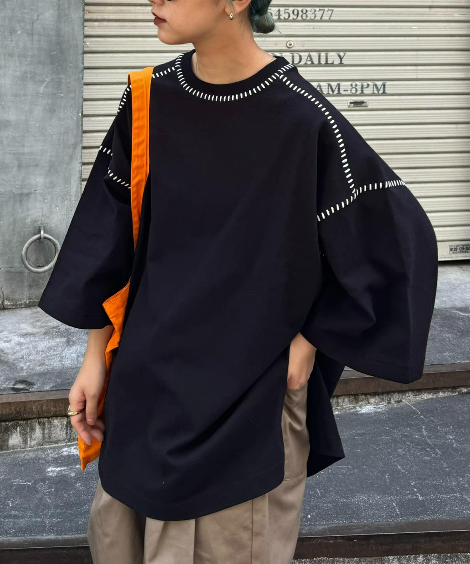 寬鬆的尺寸和撞色縫線使這款 T 恤從各個角度看都很時尚。