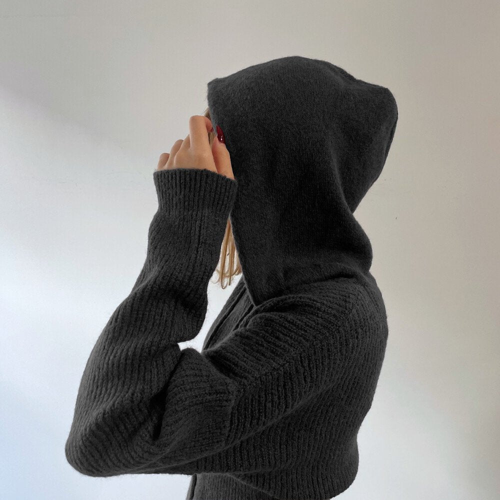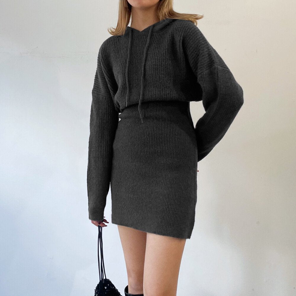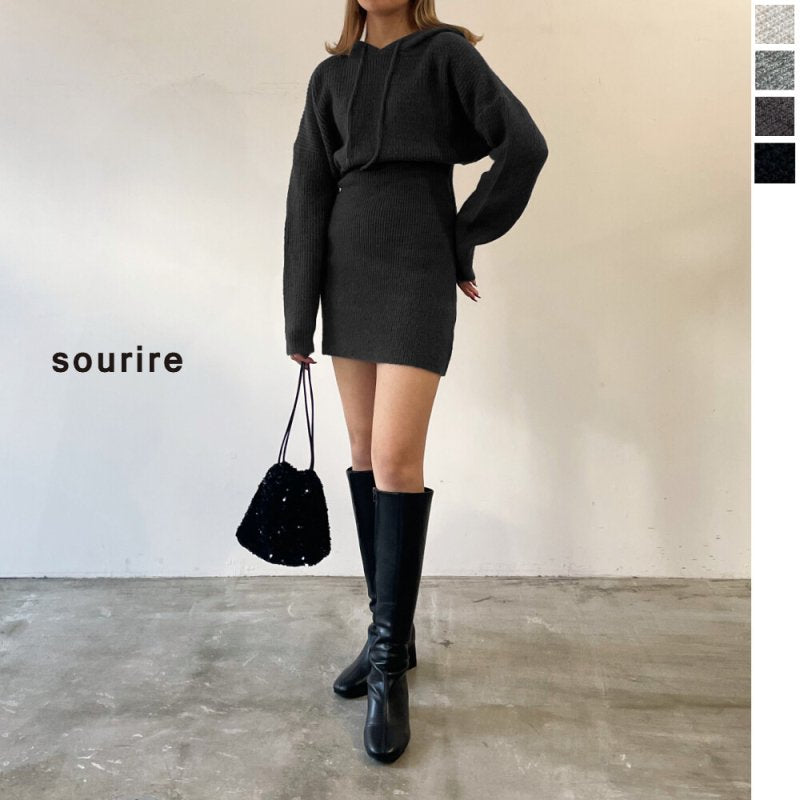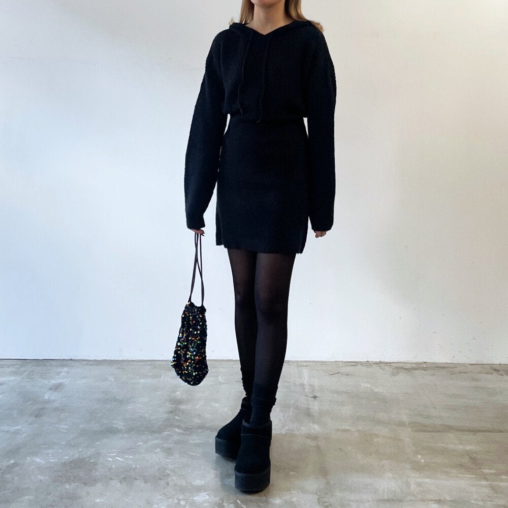 sourire 羊毛混 毛絨觸感 帶帽 針織迷你連衣裙 黑色 (CD4328)