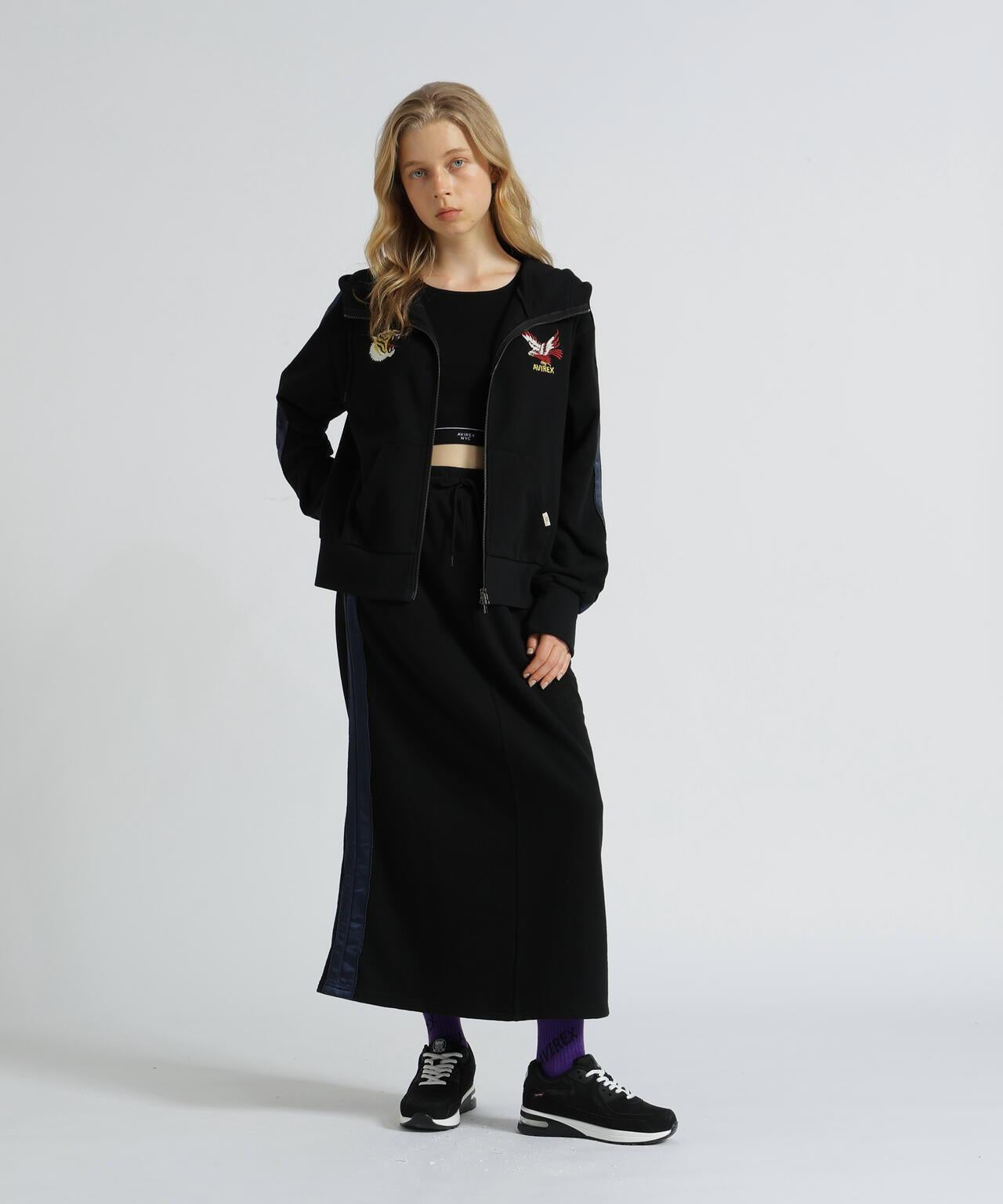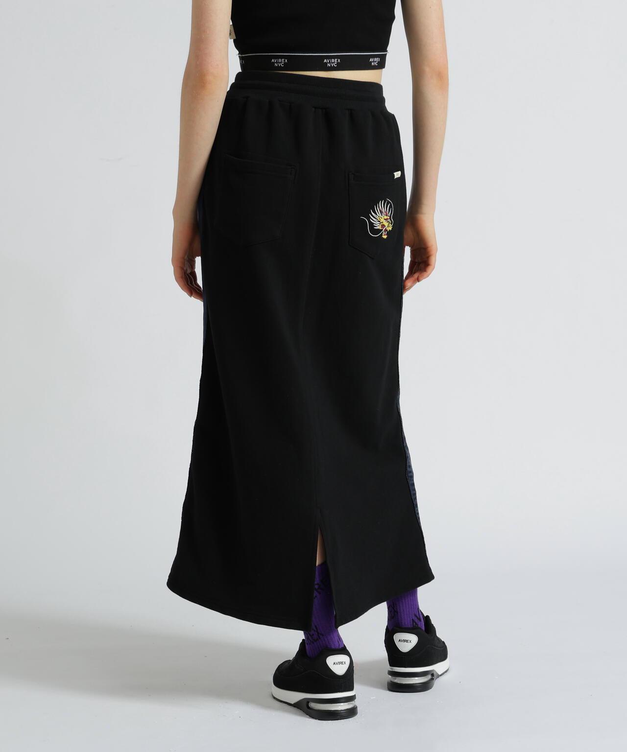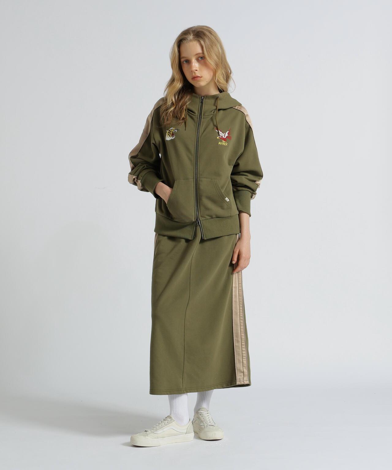 裙子由閃亮的緞面面料製成,緞面部分之間有繩索滾邊。也可與同系列上衣(貨號:7835231601)搭配穿著。AVIREX WOMAN] 該系列將純正軍裝的功能性和設計感融入女式休閒裝。作為一個獨特而永恆的女裝品牌,它為聰明、自由、好奇、高貴和活潑的成年職業女性提供女式休閒裝。