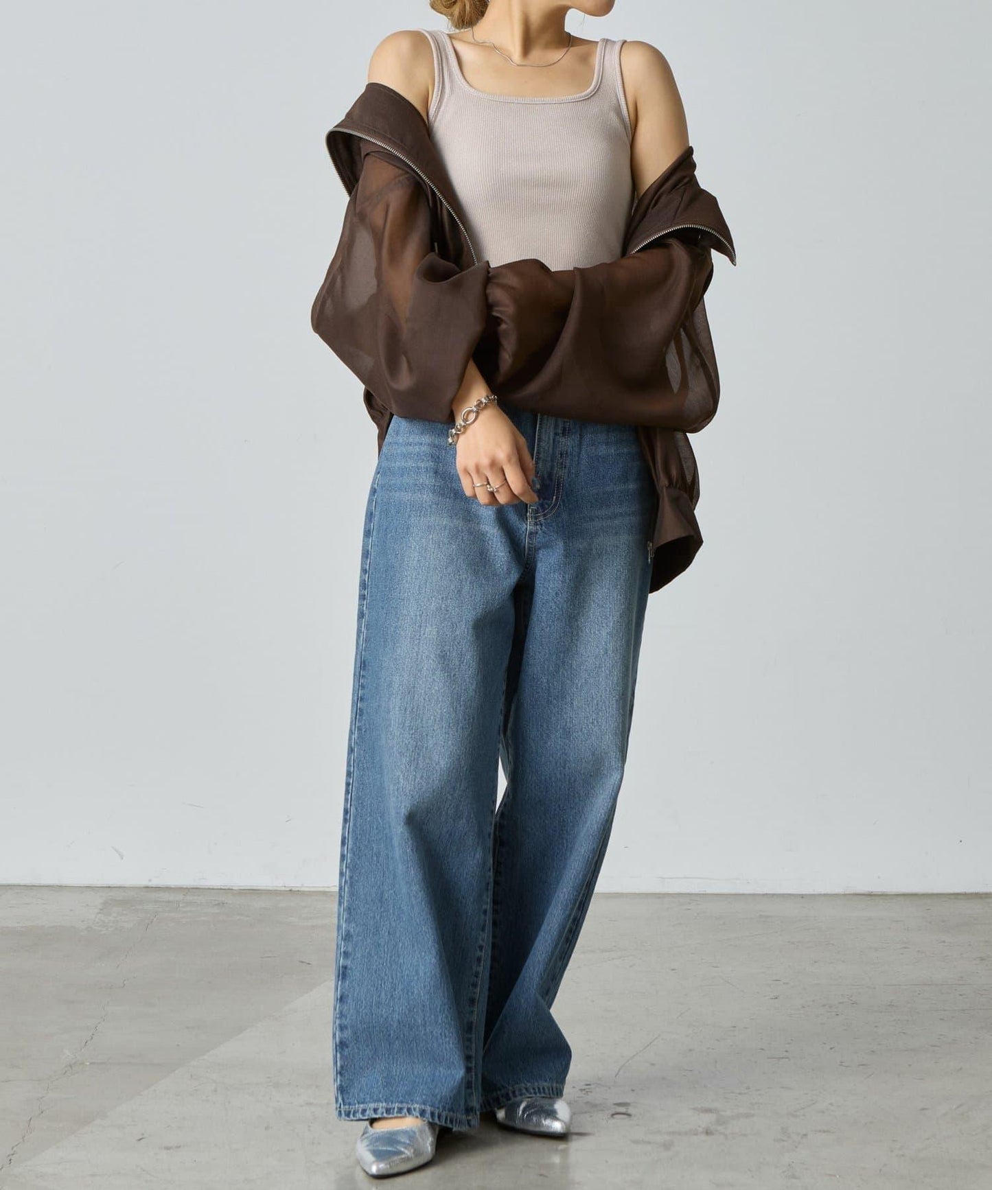 [百搭背心配優雅梭織蹩腳布】。]