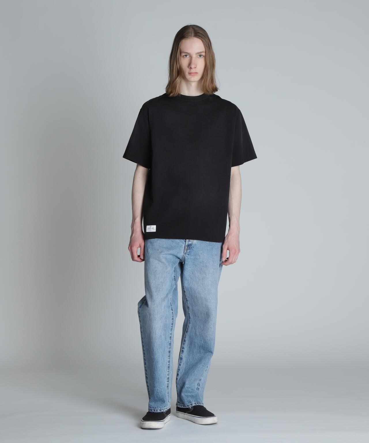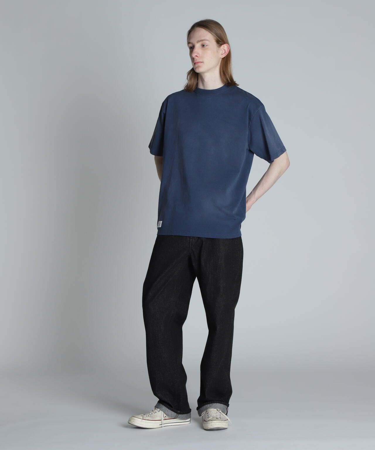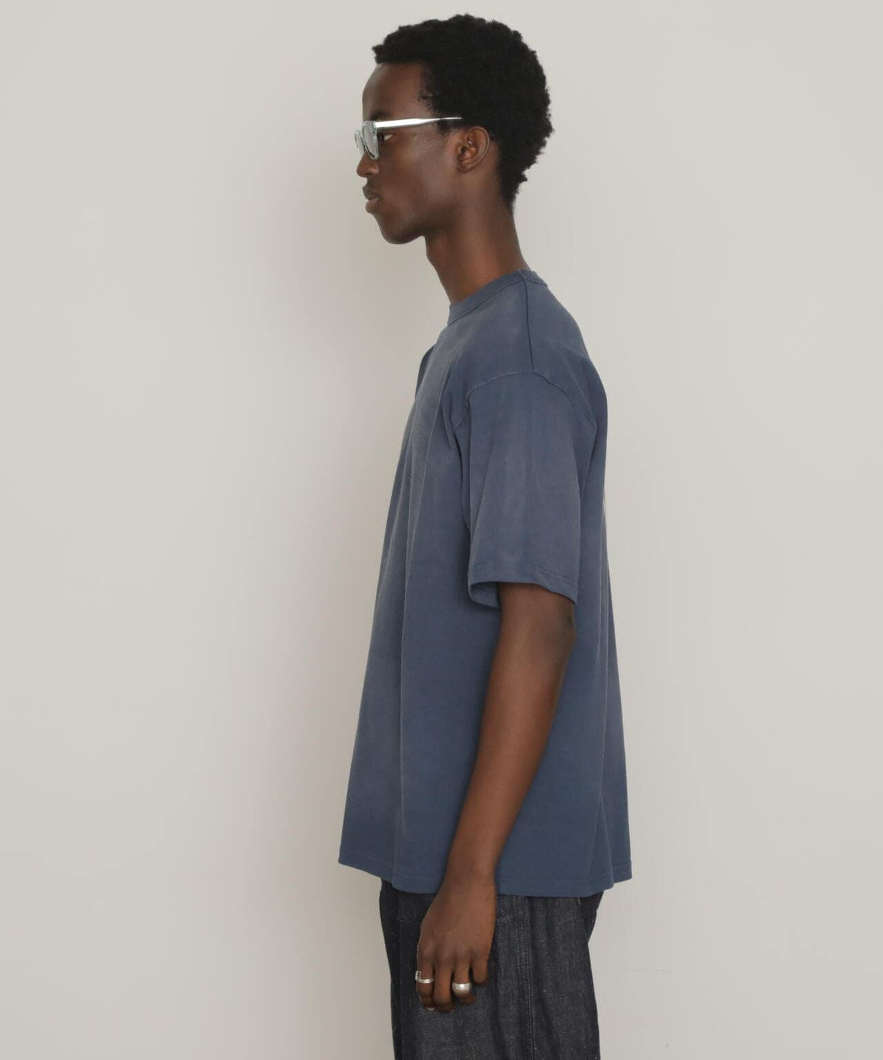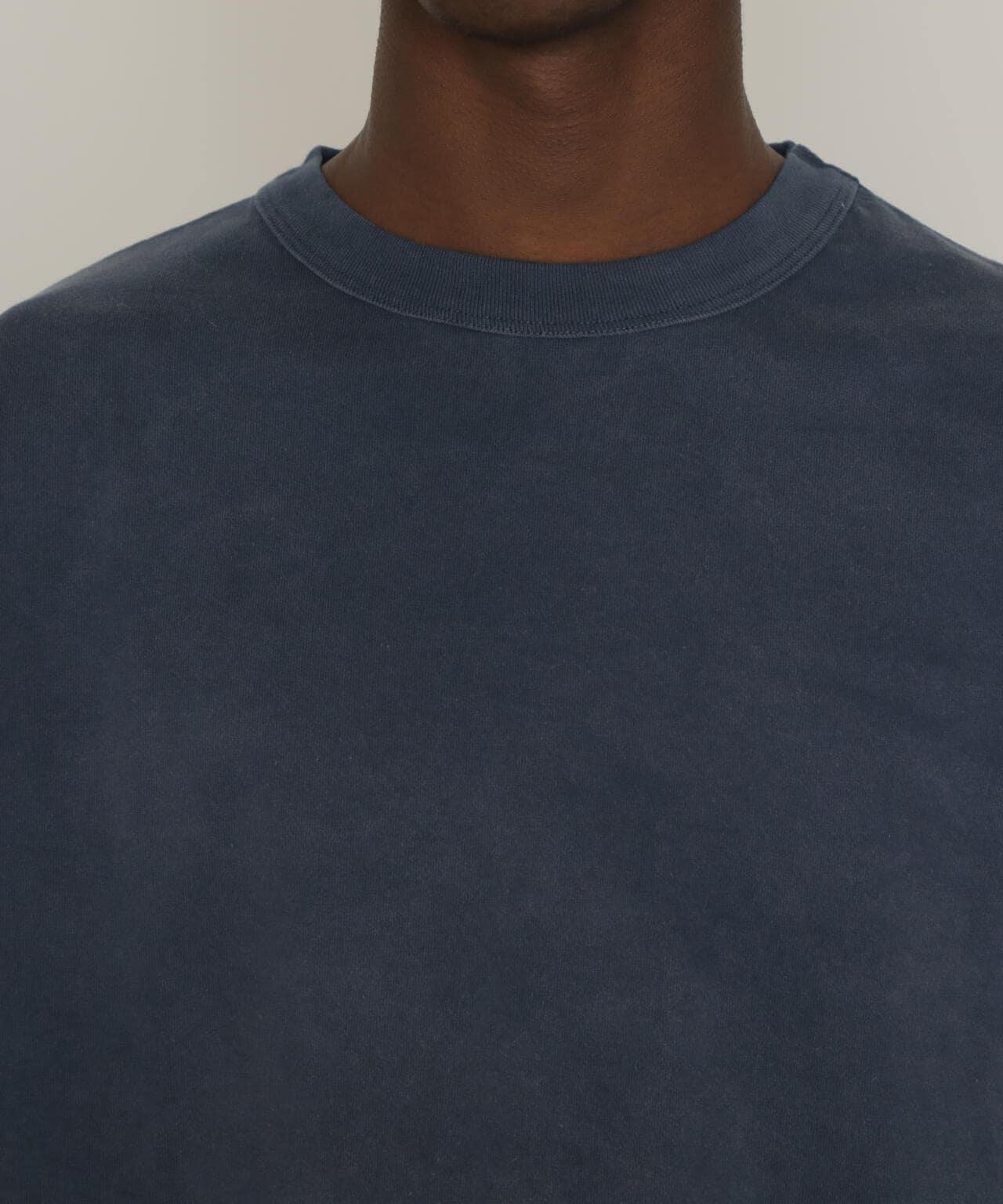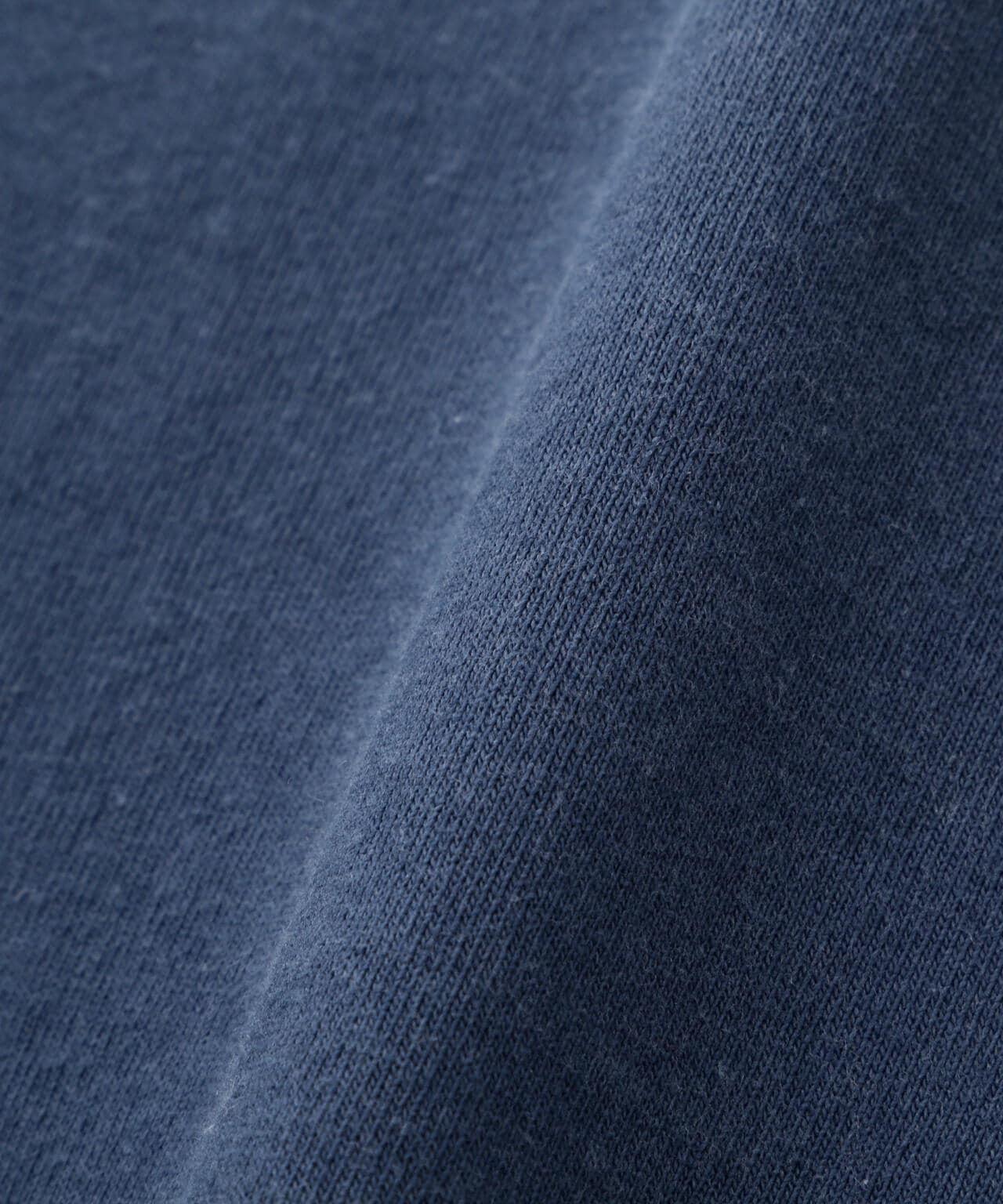 採用堅實厚實的 7 盎司紗體。硬、幹、粗糙的質地,加上只有開口紗才能帶來的蓬鬆、豐滿的手感,給人一種美國品牌的印象。採用捆綁式領口,縫製時將帶狀領口部分包裹在主體上。這樣的規格既能滿足大量使用,又不失厚實的衣身。運用品牌獨創的褪色處理,使其具有其他品牌所沒有的表現力。背面印有盾牌標誌,深色(黑色、藏青色)採用顏料印刷,印花乾淨利落。淺色則採用浸漬印花。通過對印花的關注,整體感覺和質感得到了提升。