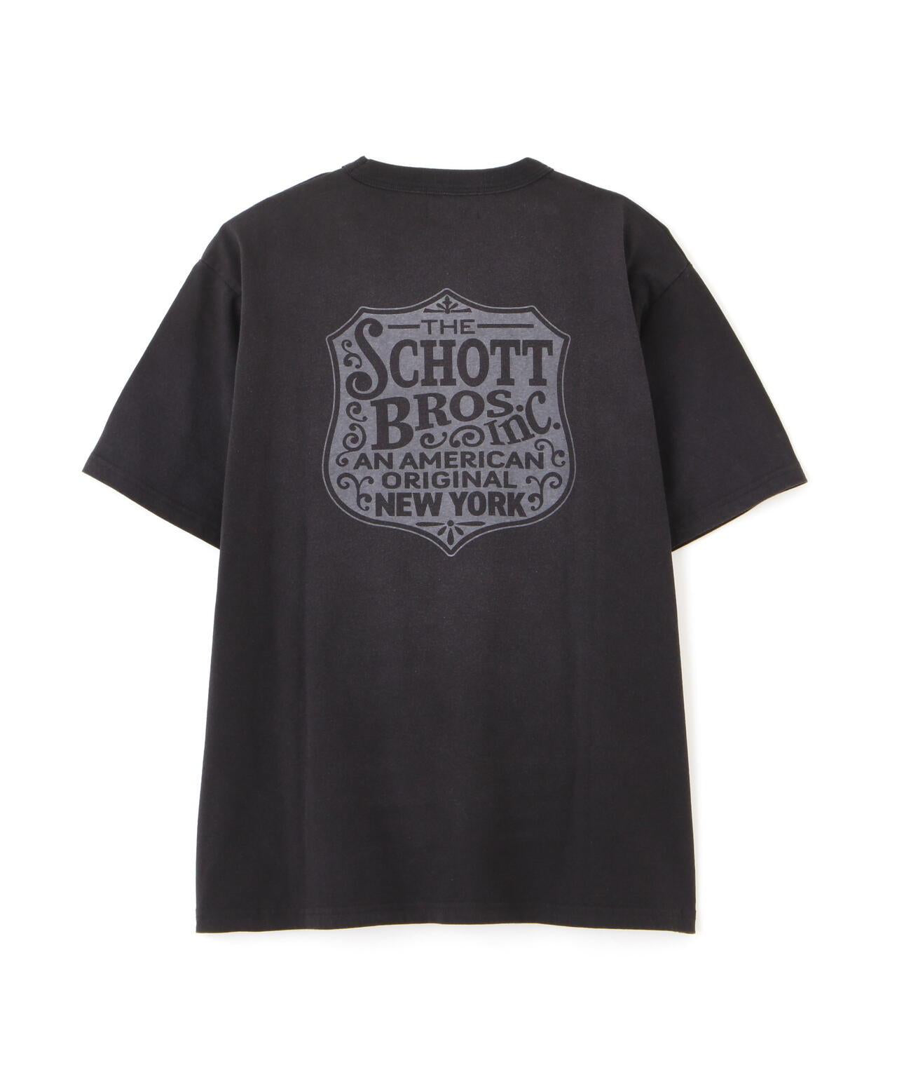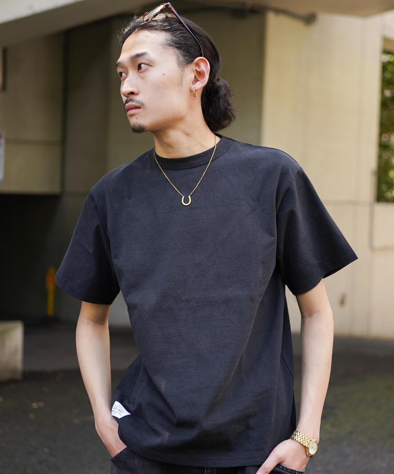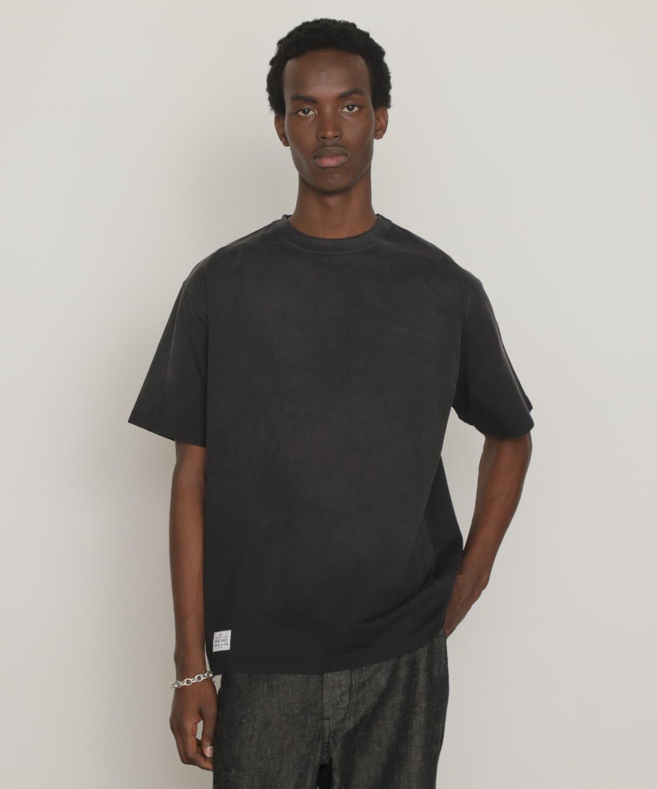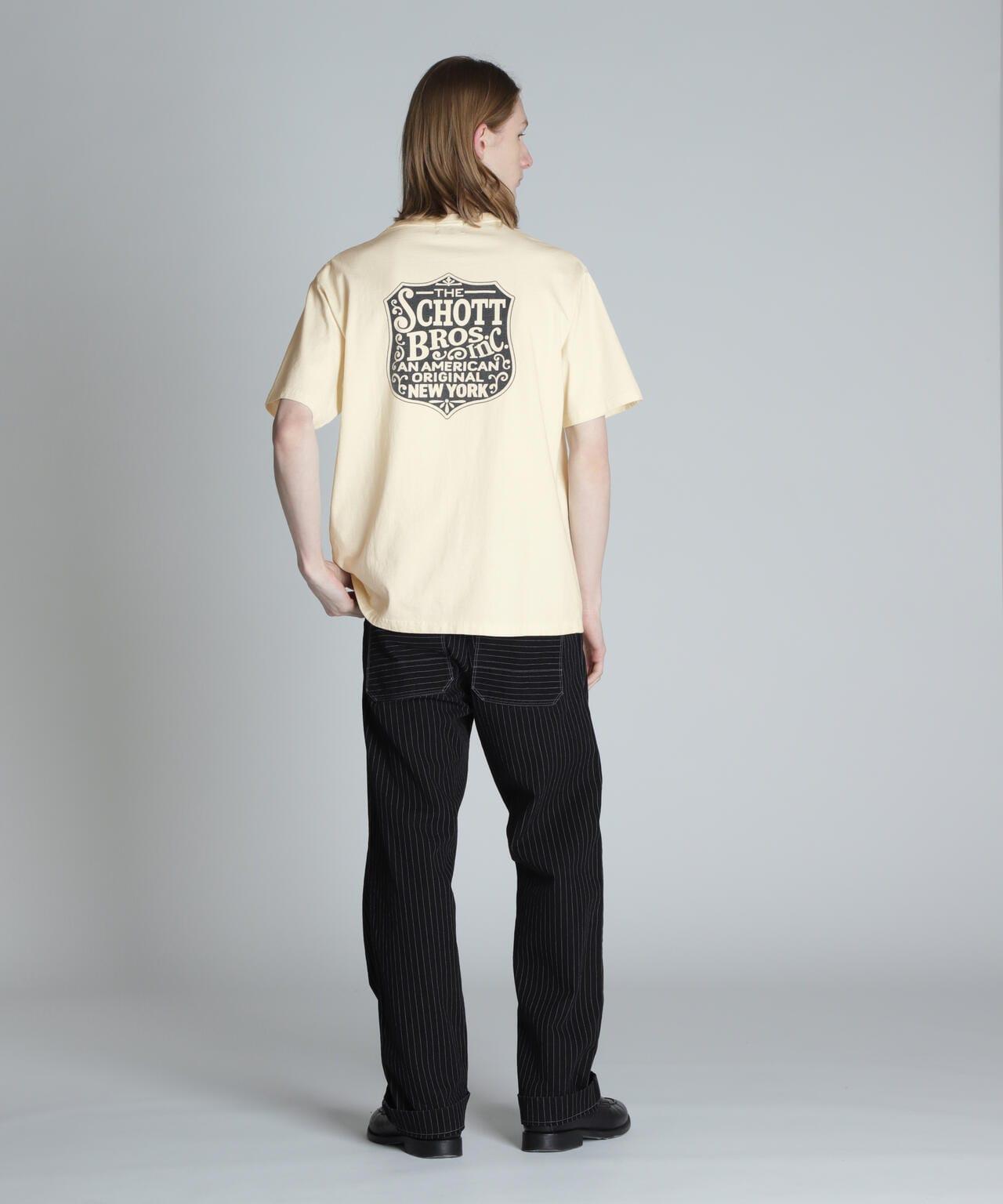 採用堅實厚實的 7 盎司紗體。硬、幹、粗糙的質地,加上只有開口紗才能帶來的蓬鬆、豐滿的手感,給人一種美國品牌的印象。採用捆綁式領口,縫製時將帶狀領口部分包裹在主體上。這樣的規格既能滿足大量使用,又不失厚實的衣身。運用品牌獨創的褪色處理,使其具有其他品牌所沒有的表現力。背面印有盾牌標誌,深色(黑色、藏青色)採用顏料印刷,印花乾淨利落。淺色則採用浸漬印花。通過對印花的關注,整體感覺和質感得到了提升。