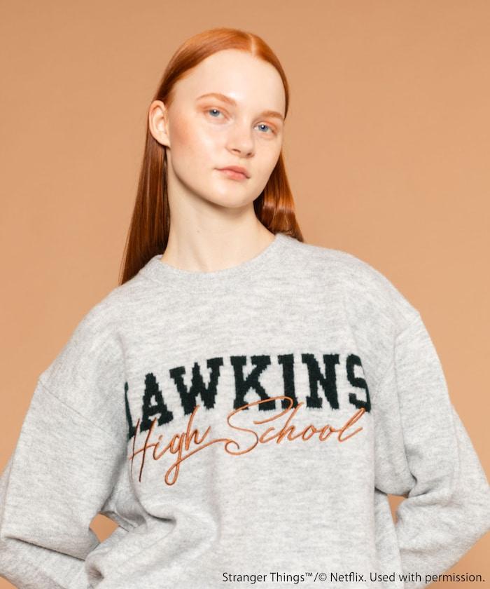 圓領針織衫,帶有 "霍金斯高中 "標誌。