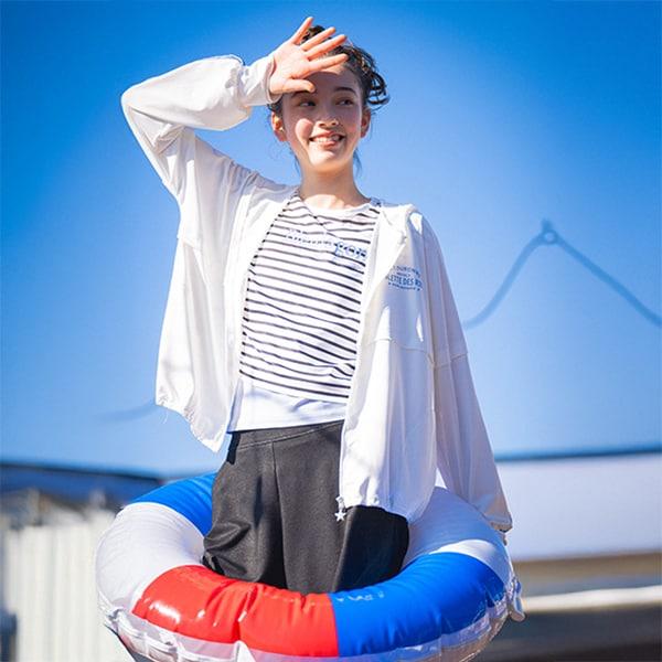 略顯寬鬆的剪裁,既可在陸地上穿著,也可在水中穿著,不僅適合水邊場景,也可作為日常防紫外線的連帽衫。