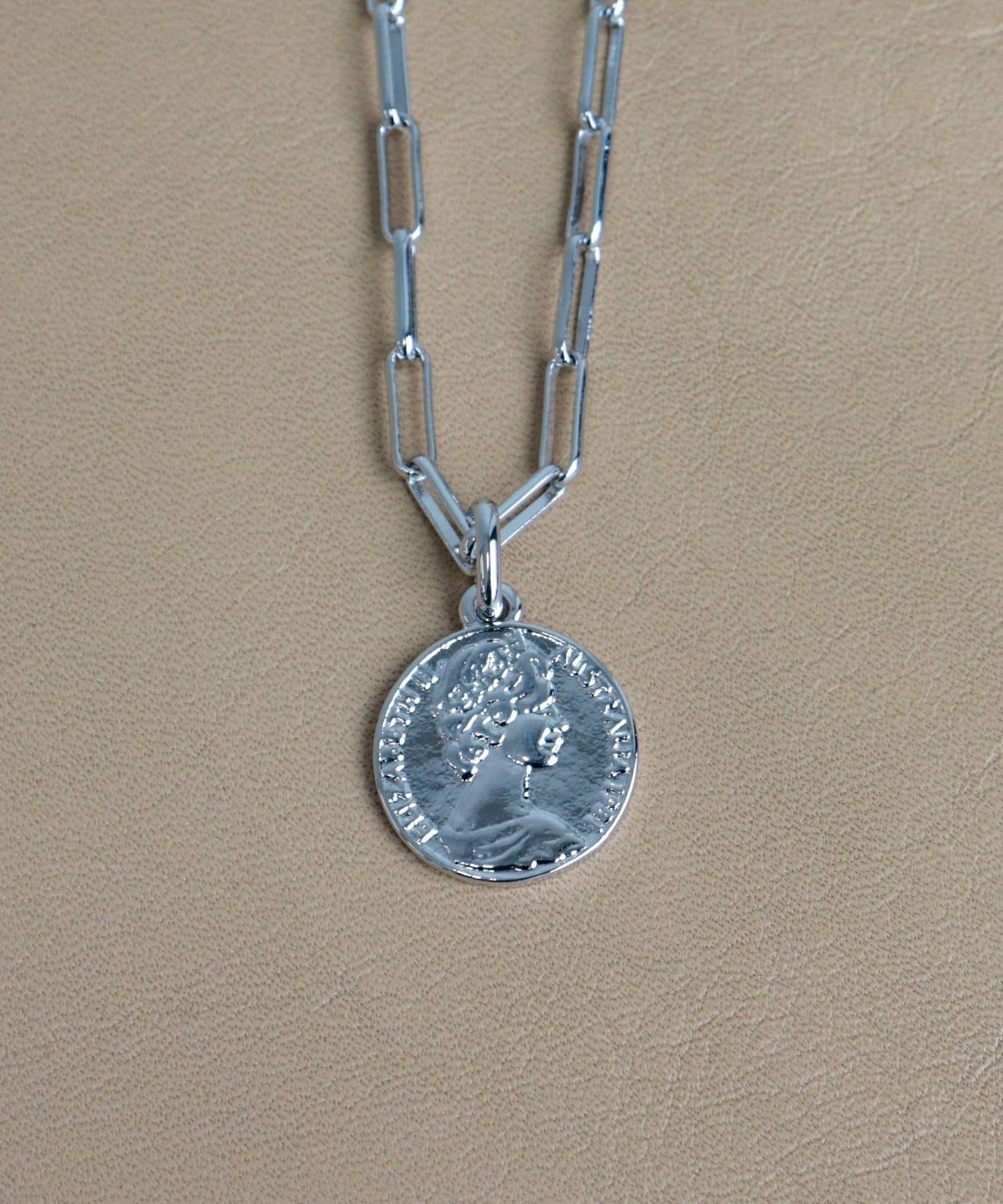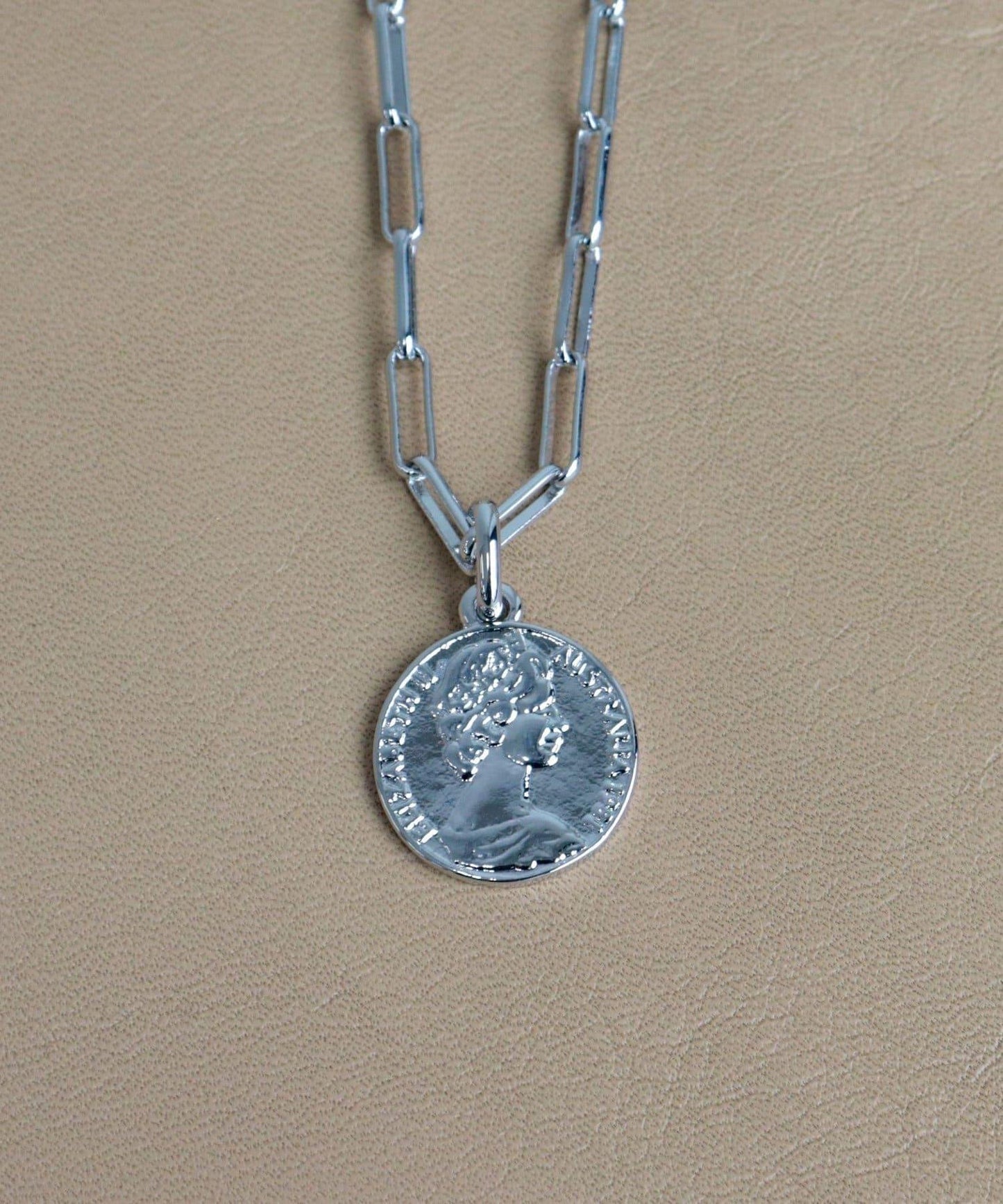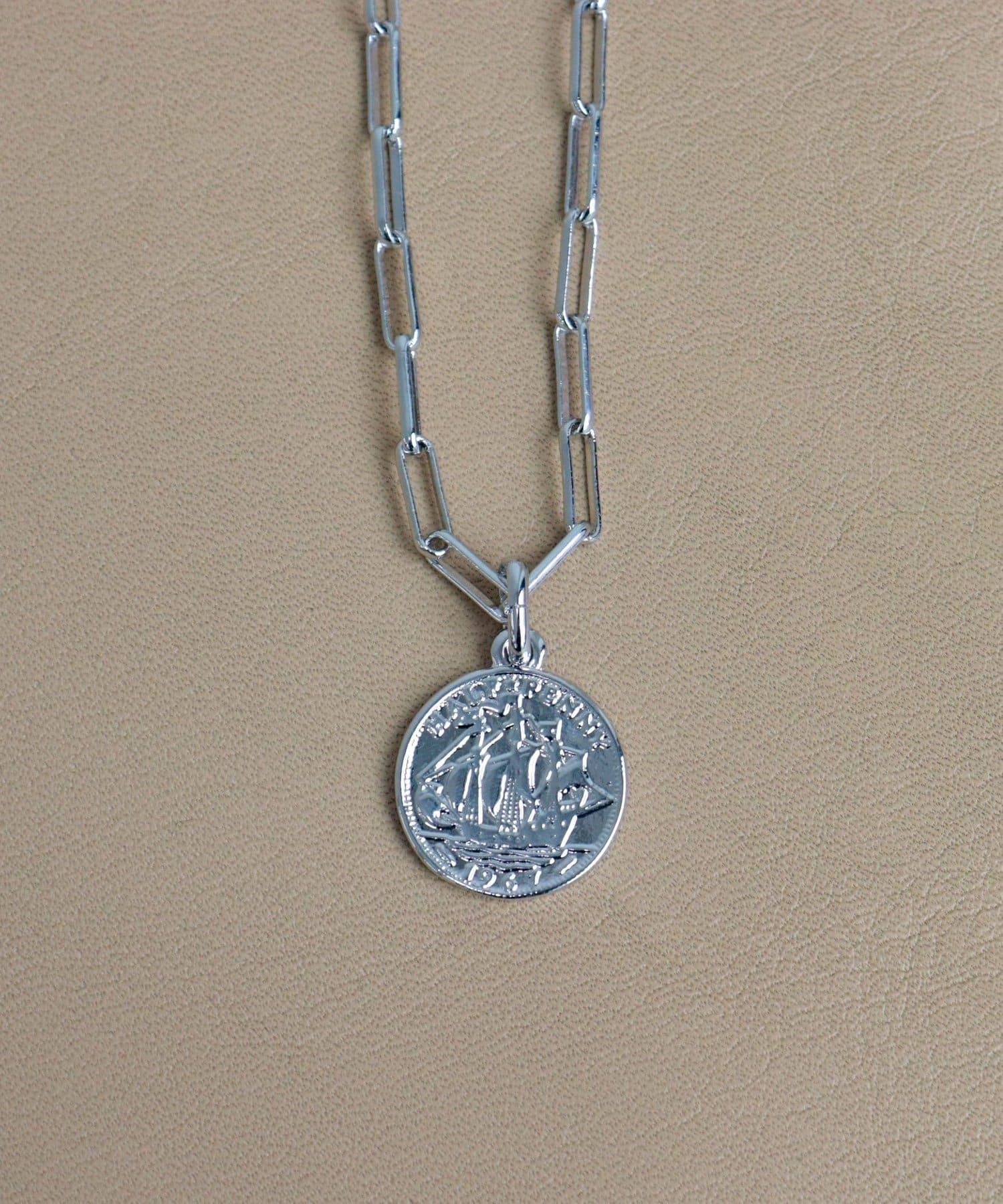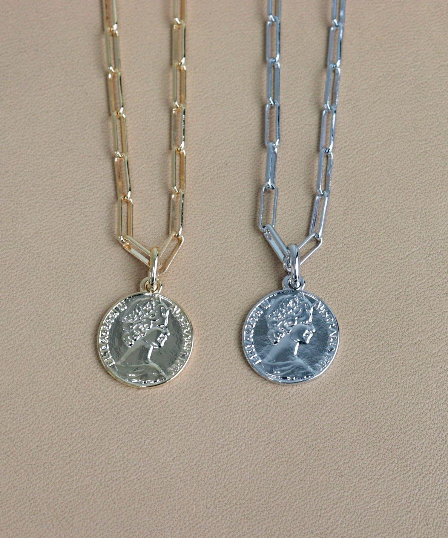 這條項鍊上的壁爐硬件和硬幣吊飾令人印象深刻。