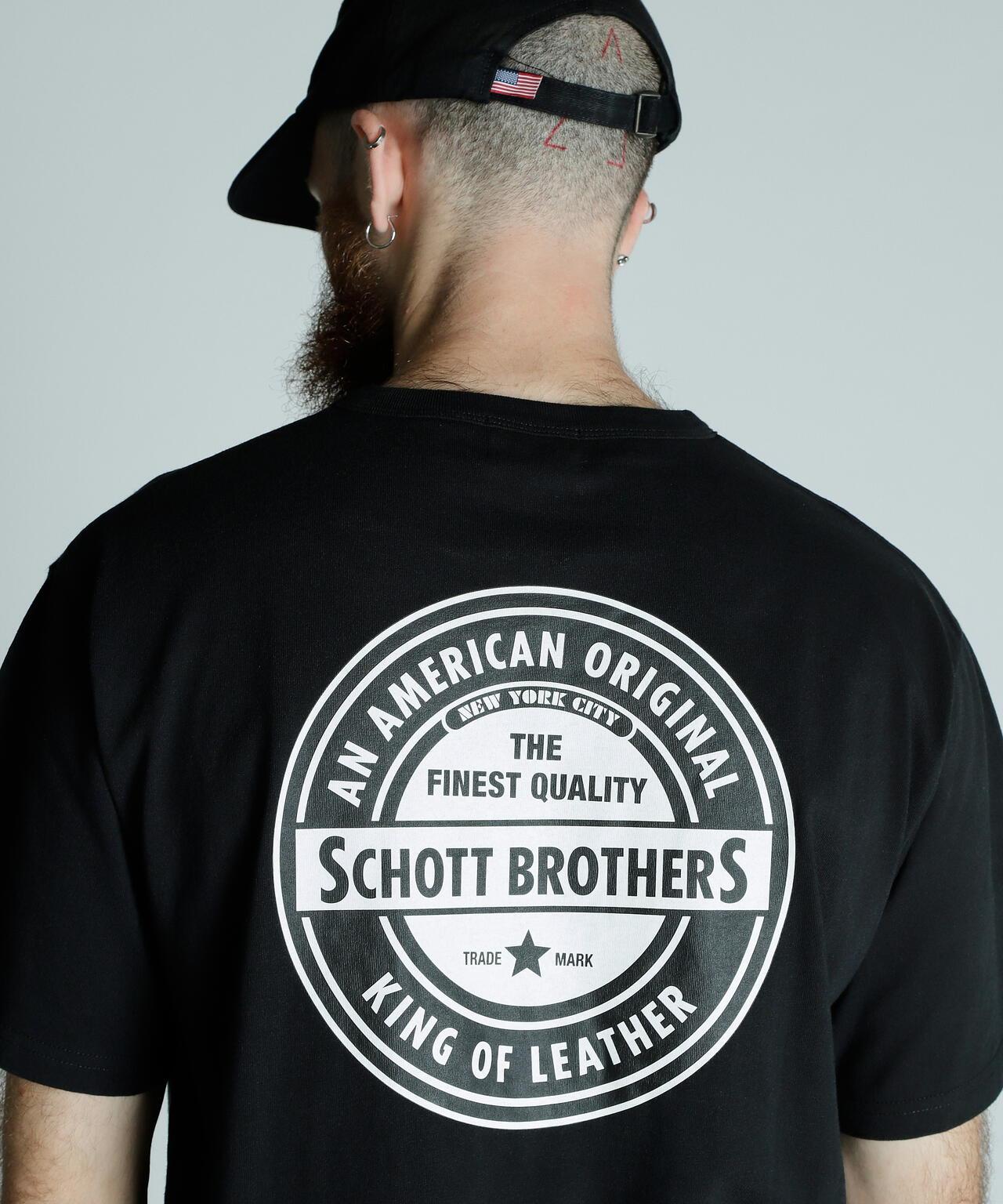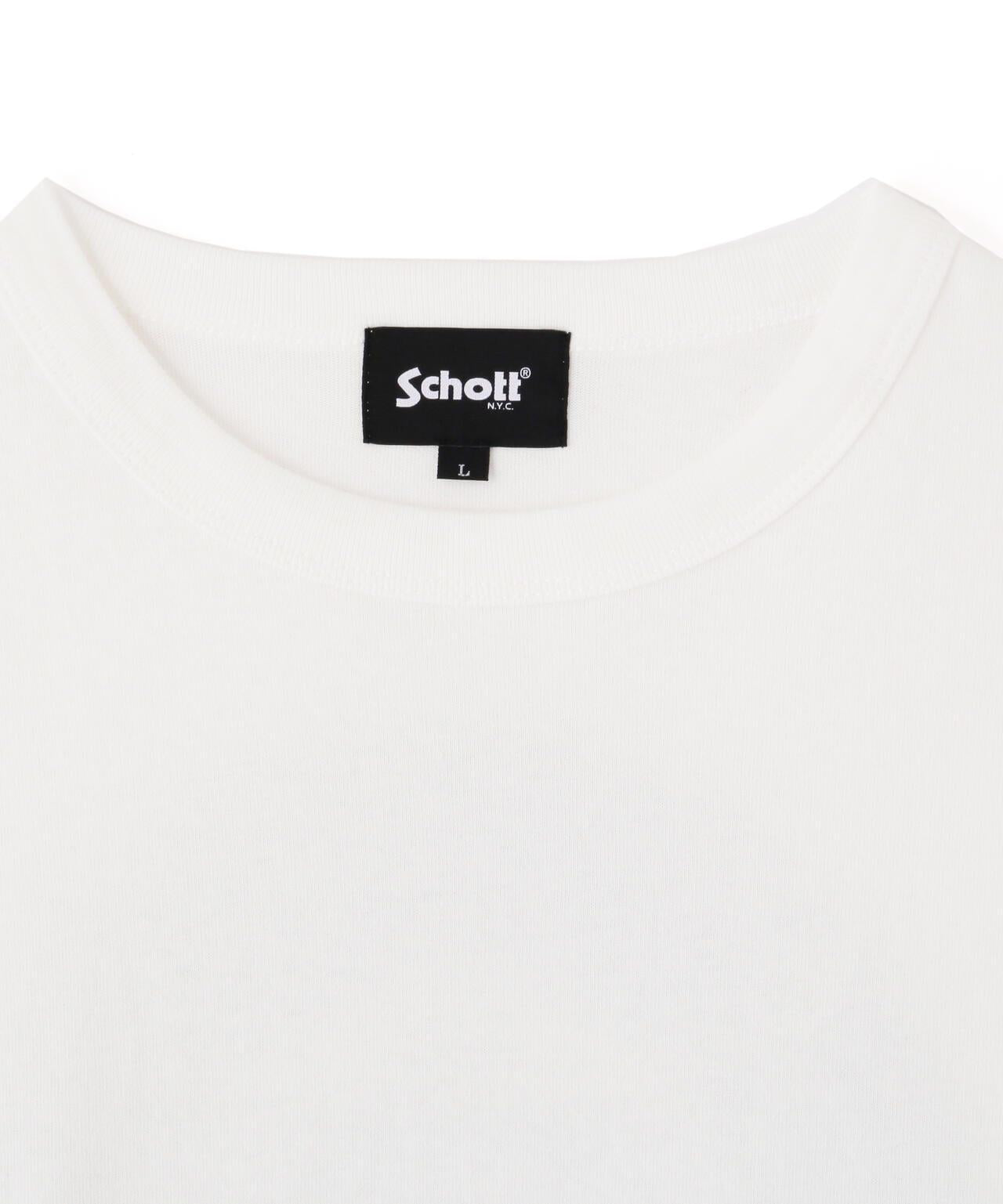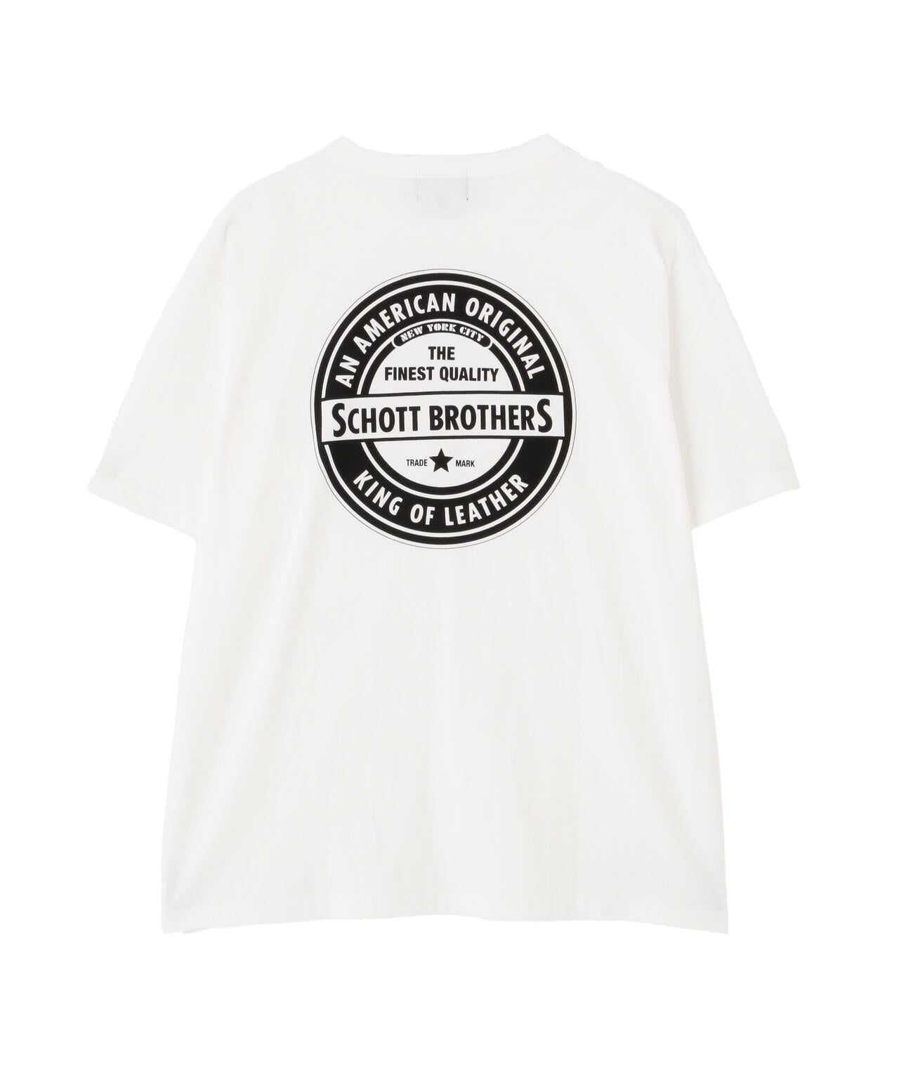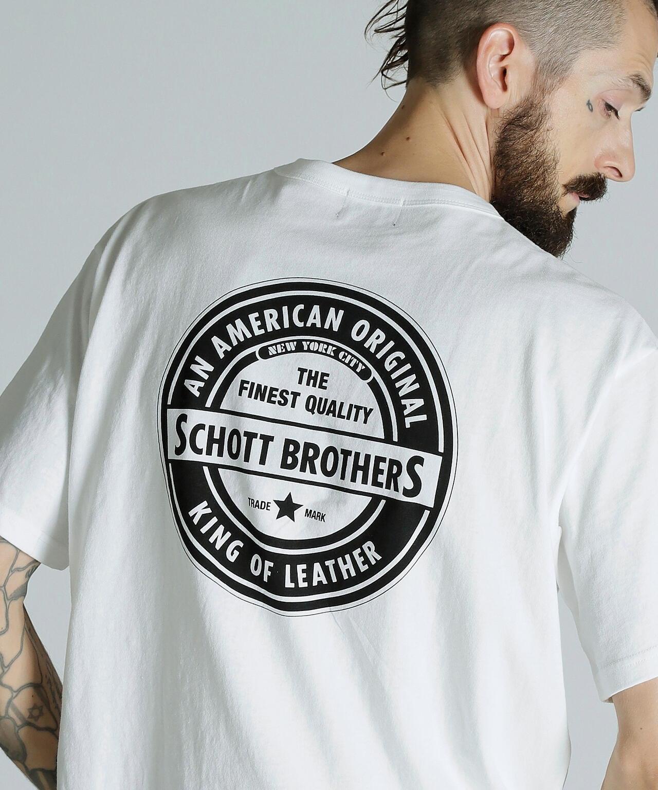 採用堅實厚實的 7 盎司紗體。硬、幹、粗糙的質地,加上只有開口紗才能帶來的蓬鬆、豐滿的手感,給人一種美國品牌的印象。採用捆綁式領口,縫製時將帶狀領口部分包裹在主體上。這種規格既能滿足厚重的使用需求,又不失厚實的衣身。這款 T 恤使用了在美國長期流行的具有地方特色的圓形標誌。這款 T 恤的設計讓人感受到復古文化和當地社區的魅力,是一款能夠融入美國經典精髓的服裝。肖特] 肖特是騎手夾克的代名詞,其歷史可以追溯到 1913 年的紐約,當時歐文-肖特(Irving Schott)、吉-斯科特(Ji