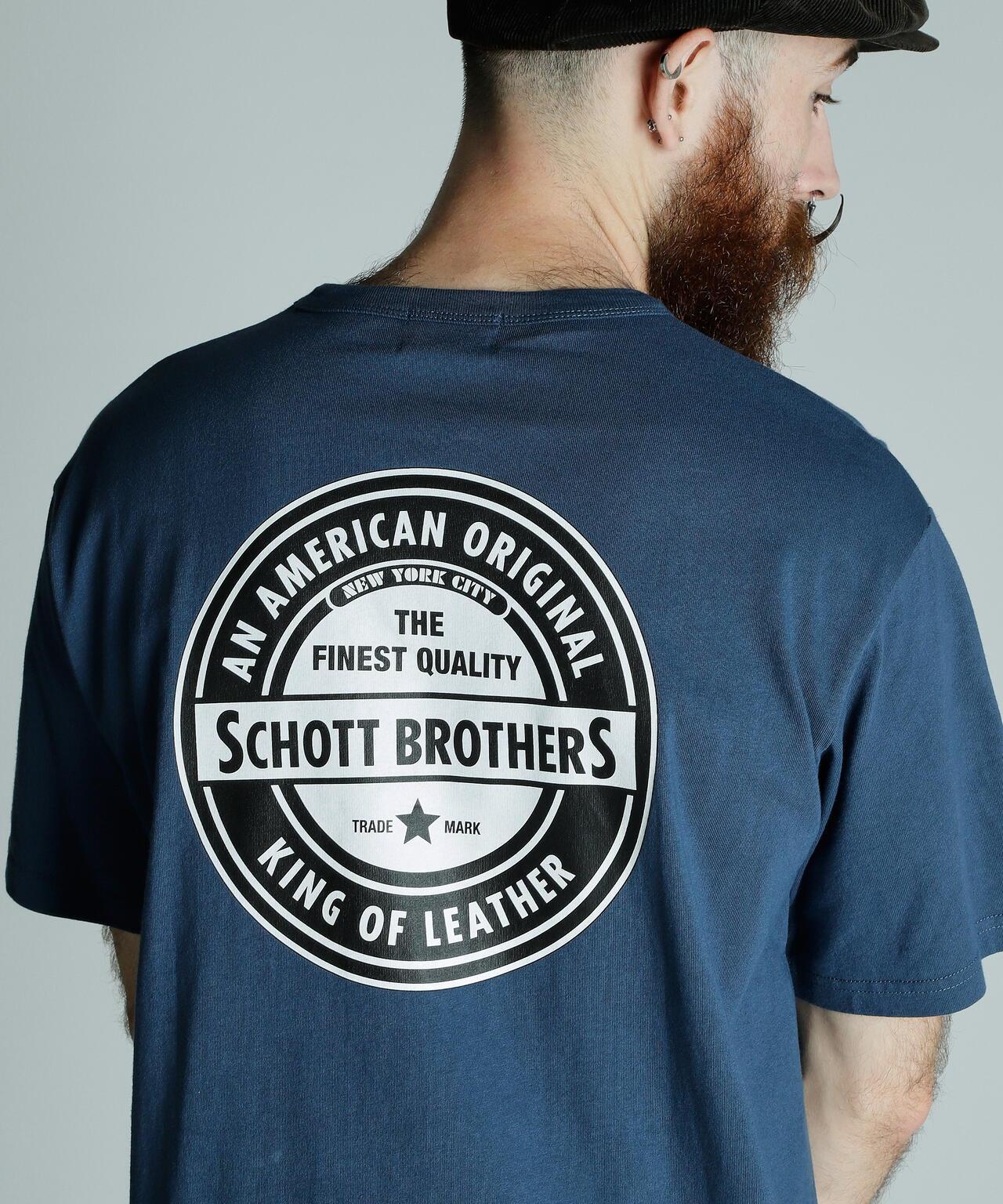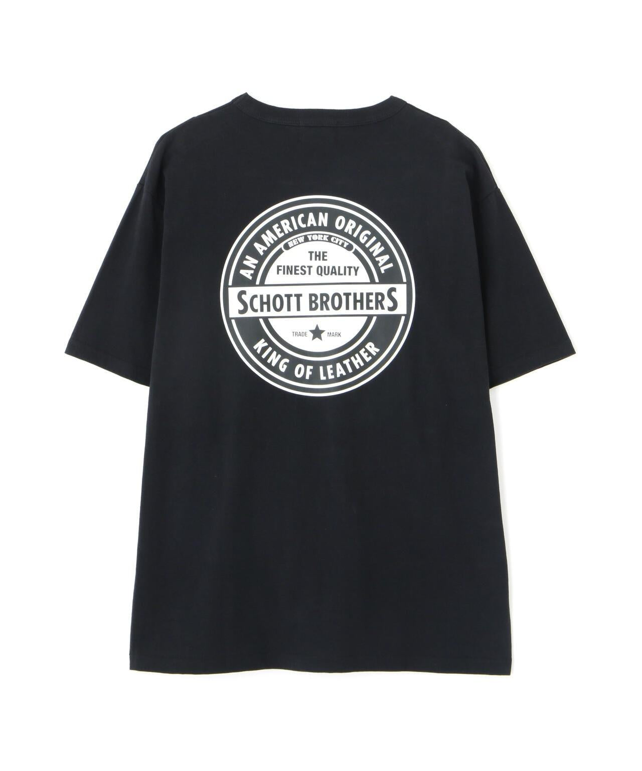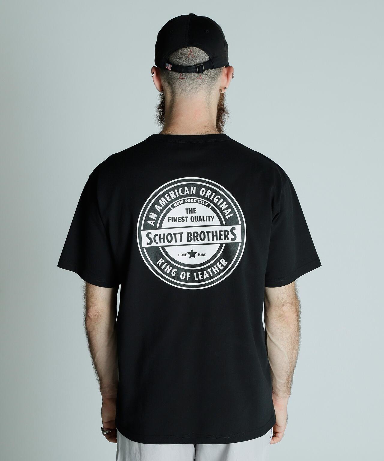 採用堅實厚實的 7 盎司紗體。硬、幹、粗糙的質地,加上只有開口紗才能帶來的蓬鬆、豐滿的手感,給人一種美國品牌的印象。採用捆綁式領口,縫製時將帶狀領口部分包裹在主體上。這種規格既能滿足厚重的使用需求,又不失厚實的衣身。這款 T 恤使用了在美國長期流行的具有地方特色的圓形標誌。這款 T 恤的設計讓人感受到復古文化和當地社區的魅力,是一款能夠融入美國經典精髓的服裝。肖特] 肖特是騎手夾克的代名詞,其歷史可以追溯到 1913 年的紐約,當時歐文-肖特(Irving Schott)、吉-斯科特(Ji