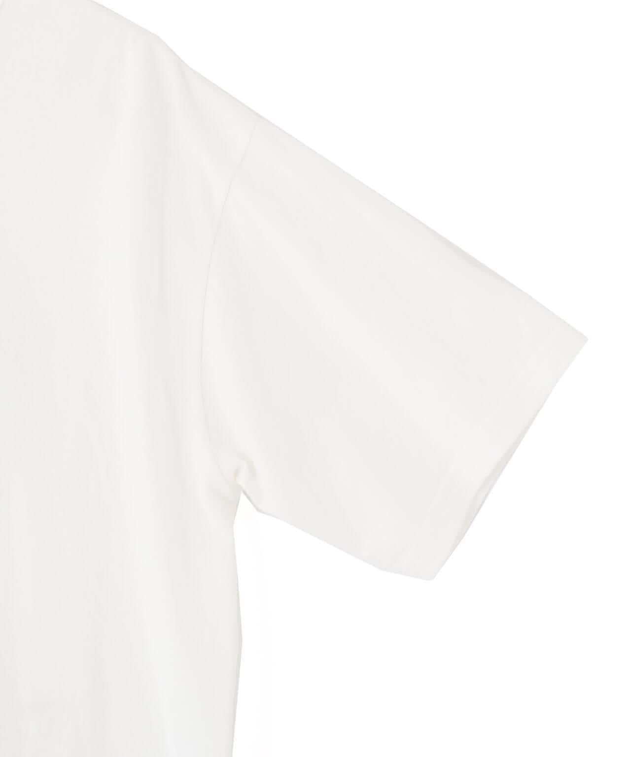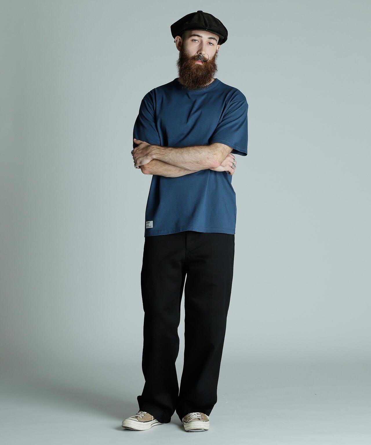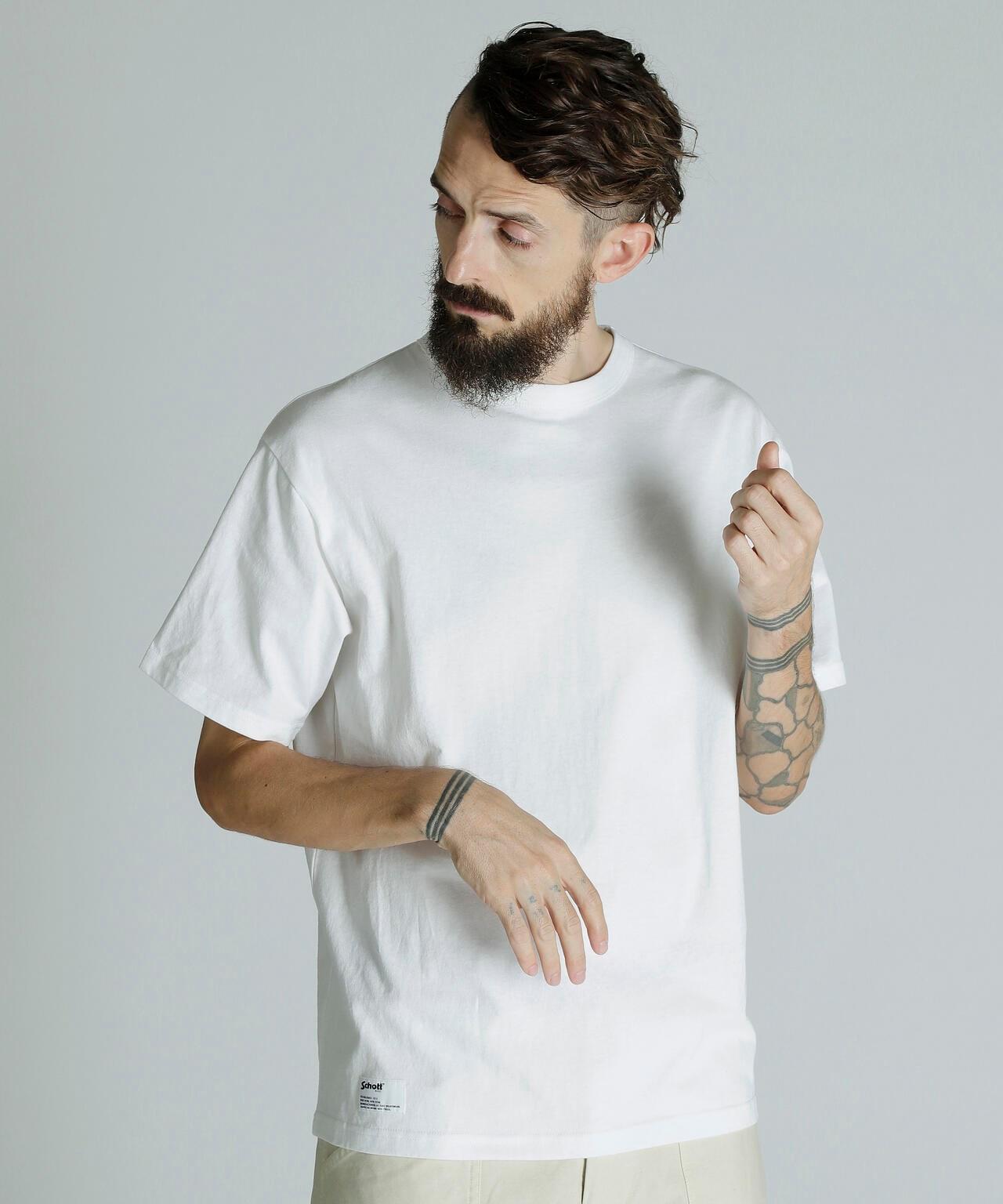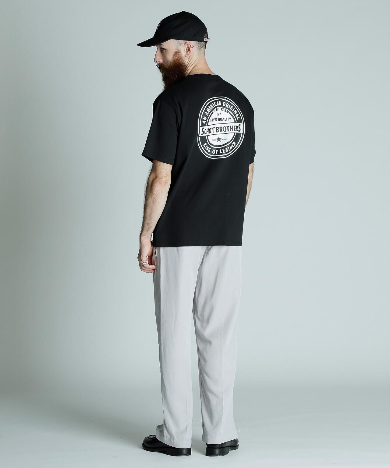 採用堅實厚實的 7 盎司紗體。硬、幹、粗糙的質地,加上只有開口紗才能帶來的蓬鬆、豐滿的手感,給人一種美國品牌的印象。採用捆綁式領口,縫製時將帶狀領口部分包裹在主體上。這種規格既能滿足厚重的使用需求,又不失厚實的衣身。這款 T 恤使用了在美國長期流行的具有地方特色的圓形標誌。這款 T 恤的設計讓人感受到復古文化和當地社區的魅力,是一款能夠融入美國經典精髓的服裝。肖特] 肖特是騎手夾克的代名詞,其歷史可以追溯到 1913 年的紐約,當時歐文-肖特(Irving Schott)、吉-斯科特(Ji