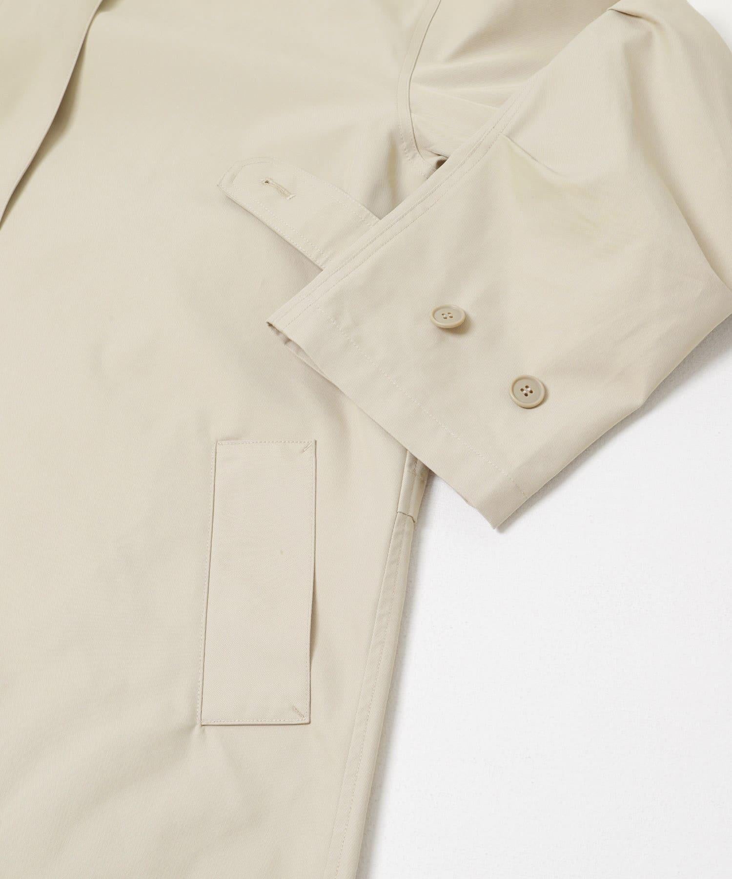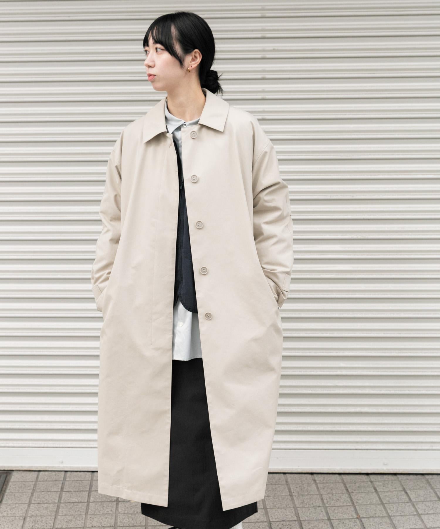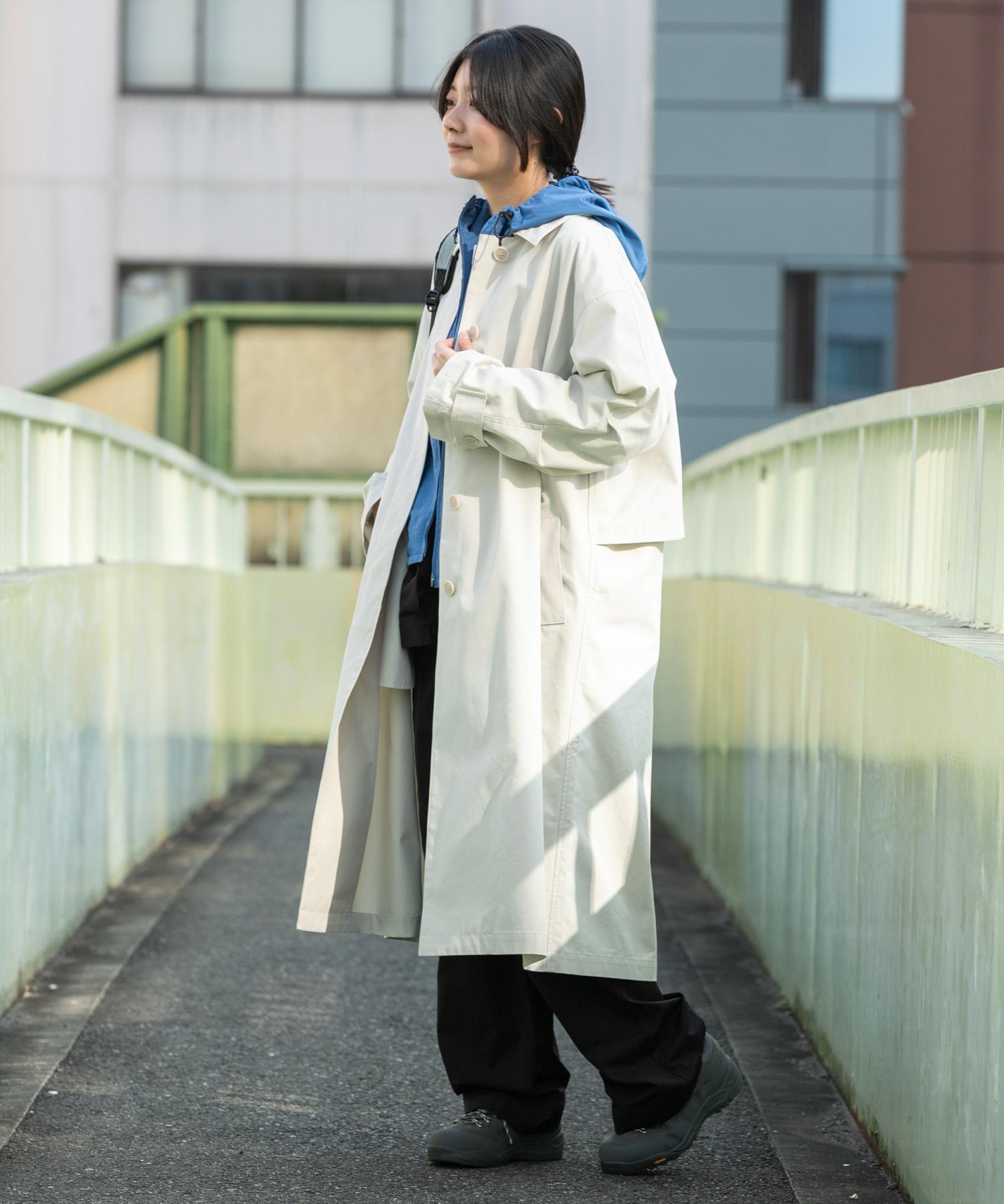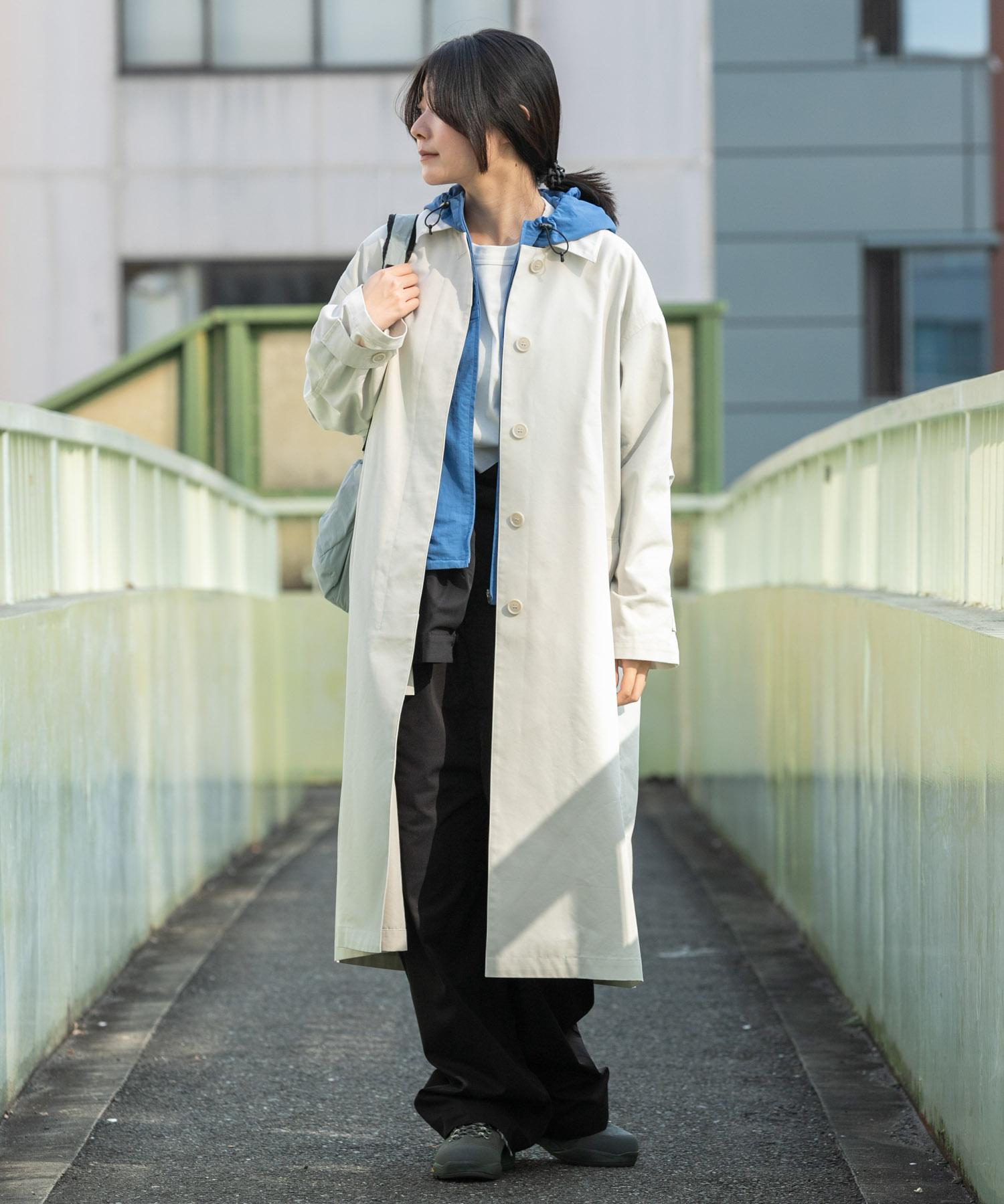 採用高密度棉滌斜紋織物製成。棉和滌綸的交叉編織可防止起皺,並具有優雅的光澤和記憶感。此外,還可提供具有虹彩色澤和羊羔絨質感的款式。不鏽鋼領大衣設計簡潔,領口和輪廓寬鬆。衣袖肘部的動作褶襉和背部的網眼透氣設計融入了戶外元素。後開衩後部用紐扣打開,前開衩用比翼規格打開,融入了經典感,成為日常穿著不會過於隨意、輕鬆的設計。