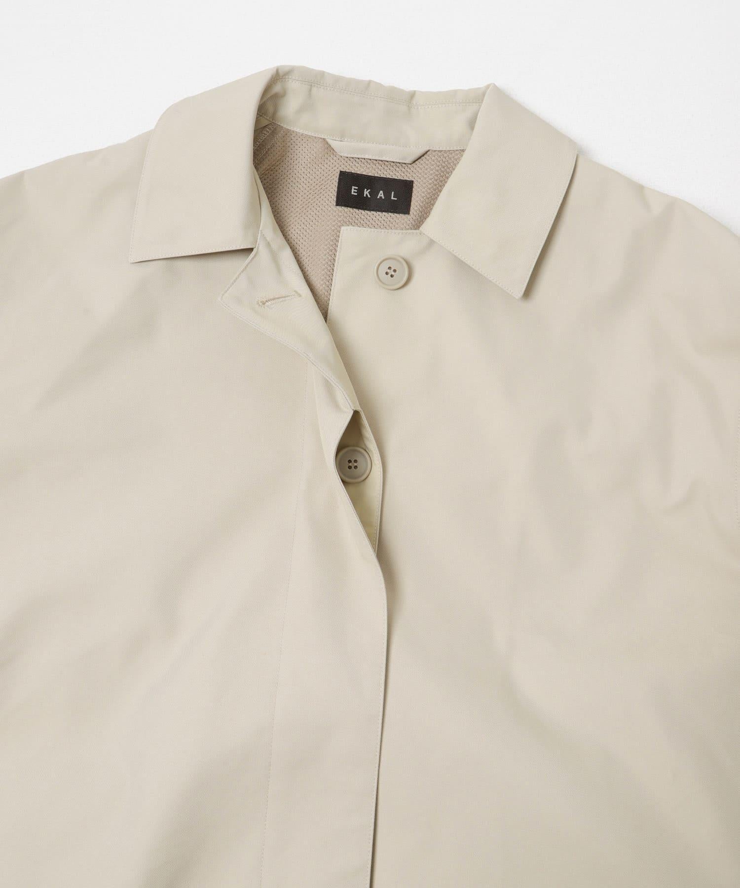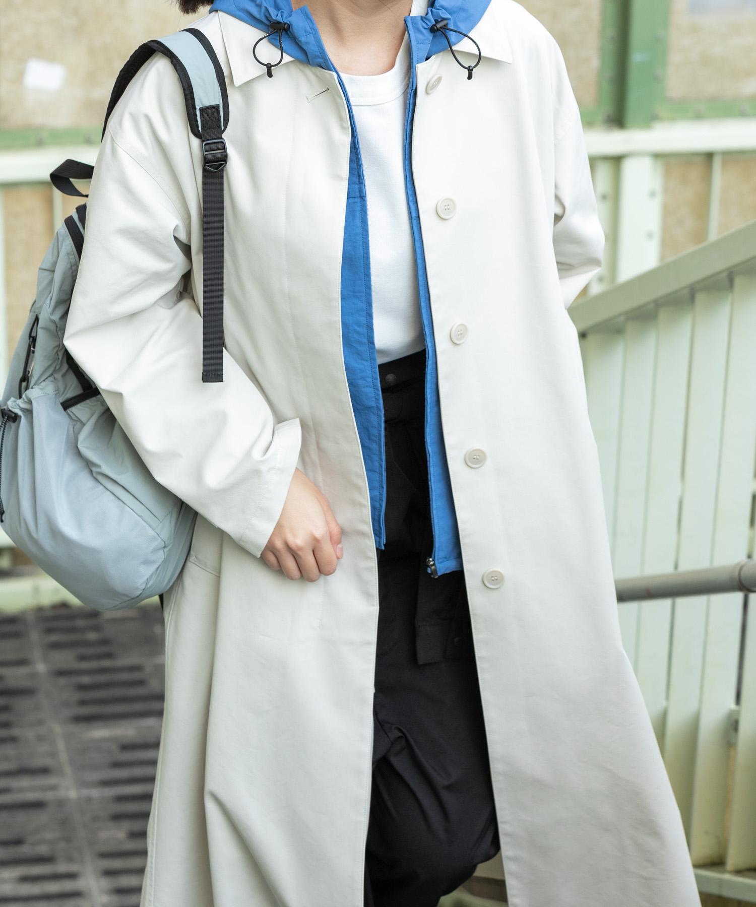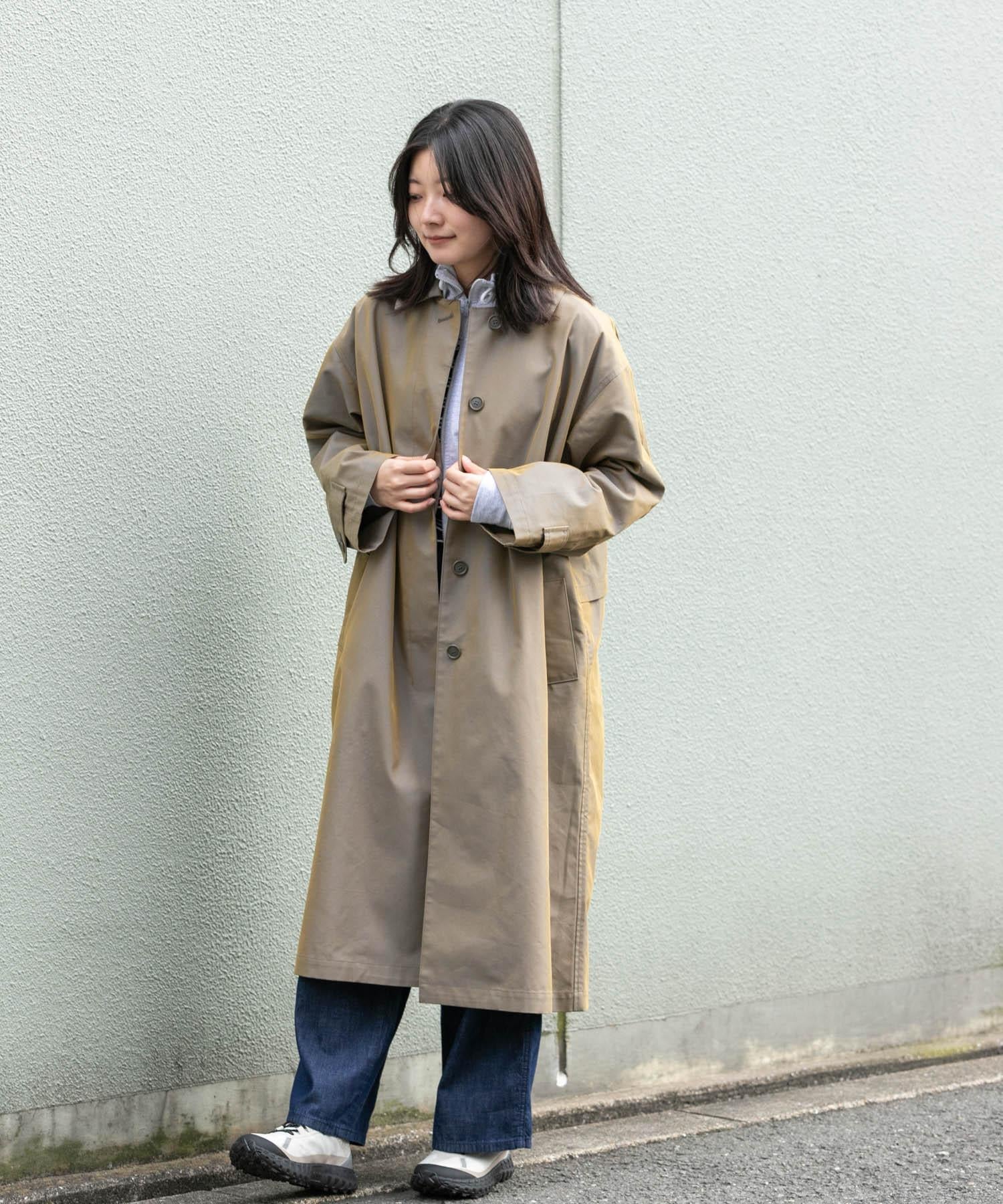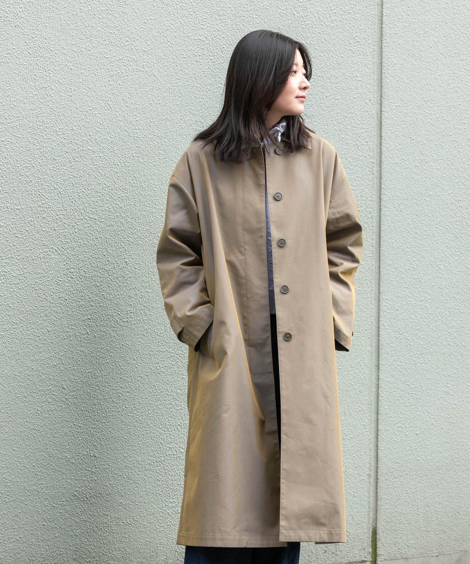 採用高密度棉滌斜紋織物製成。棉和滌綸的交叉編織可防止起皺,並具有優雅的光澤和記憶感。此外,還可提供具有虹彩色澤和羊羔絨質感的款式。不鏽鋼領大衣設計簡潔,領口和輪廓寬鬆。衣袖肘部的動作褶襉和背部的網眼透氣設計融入了戶外元素。後開衩後部用紐扣打開,前開衩用比翼規格打開,融入了經典感,成為日常穿著不會過於隨意、輕鬆的設計。
