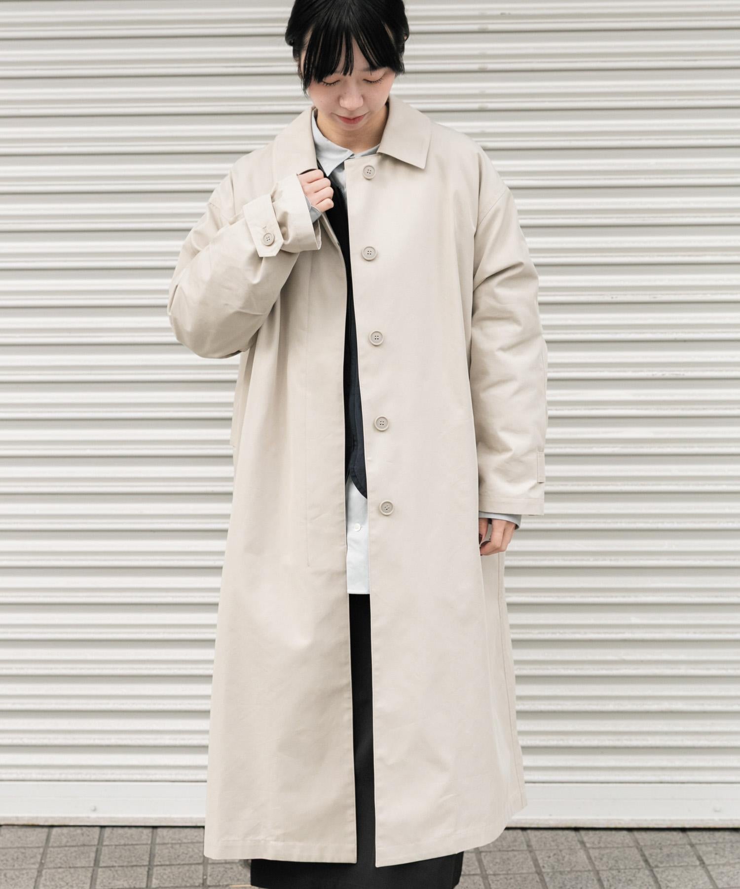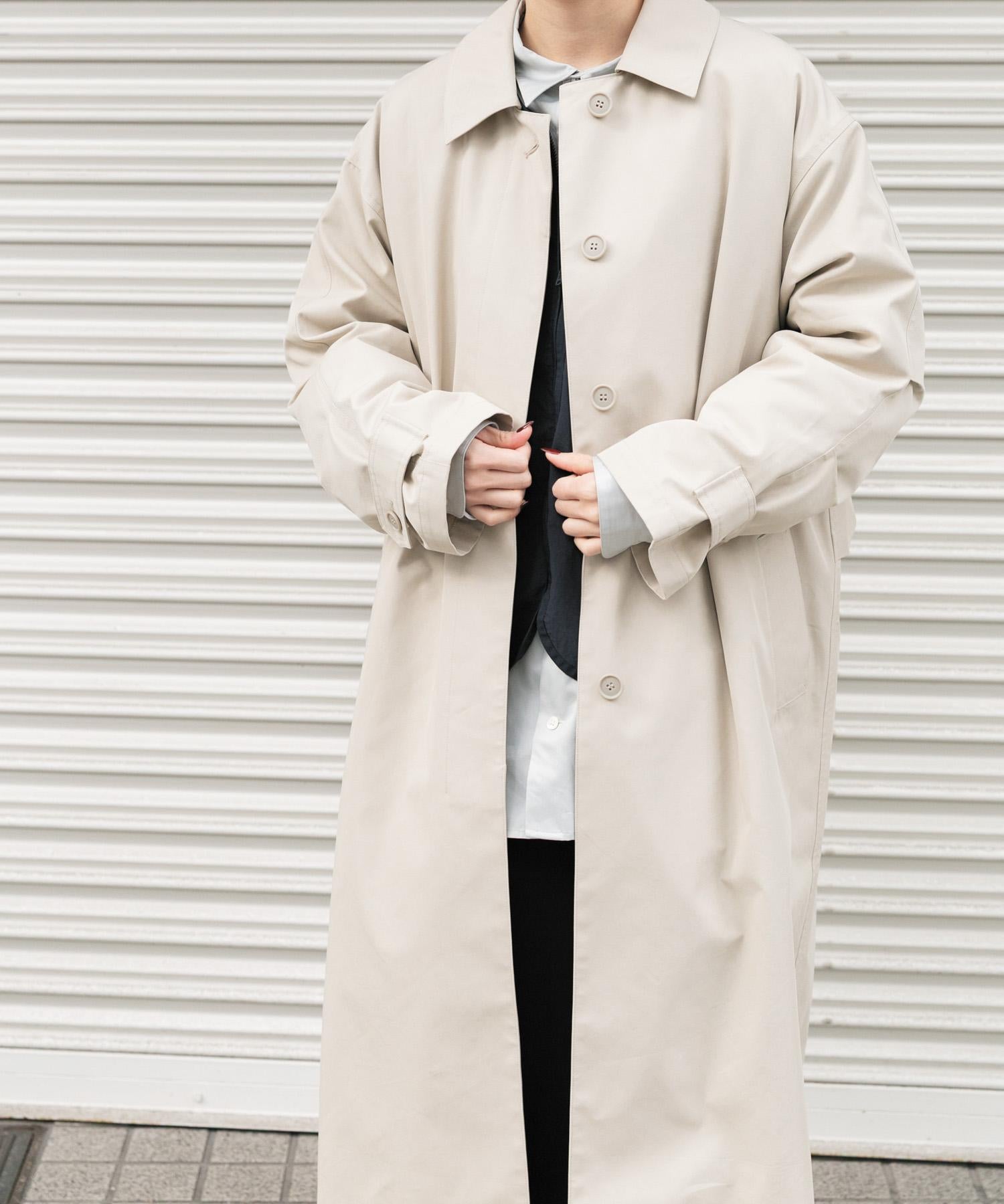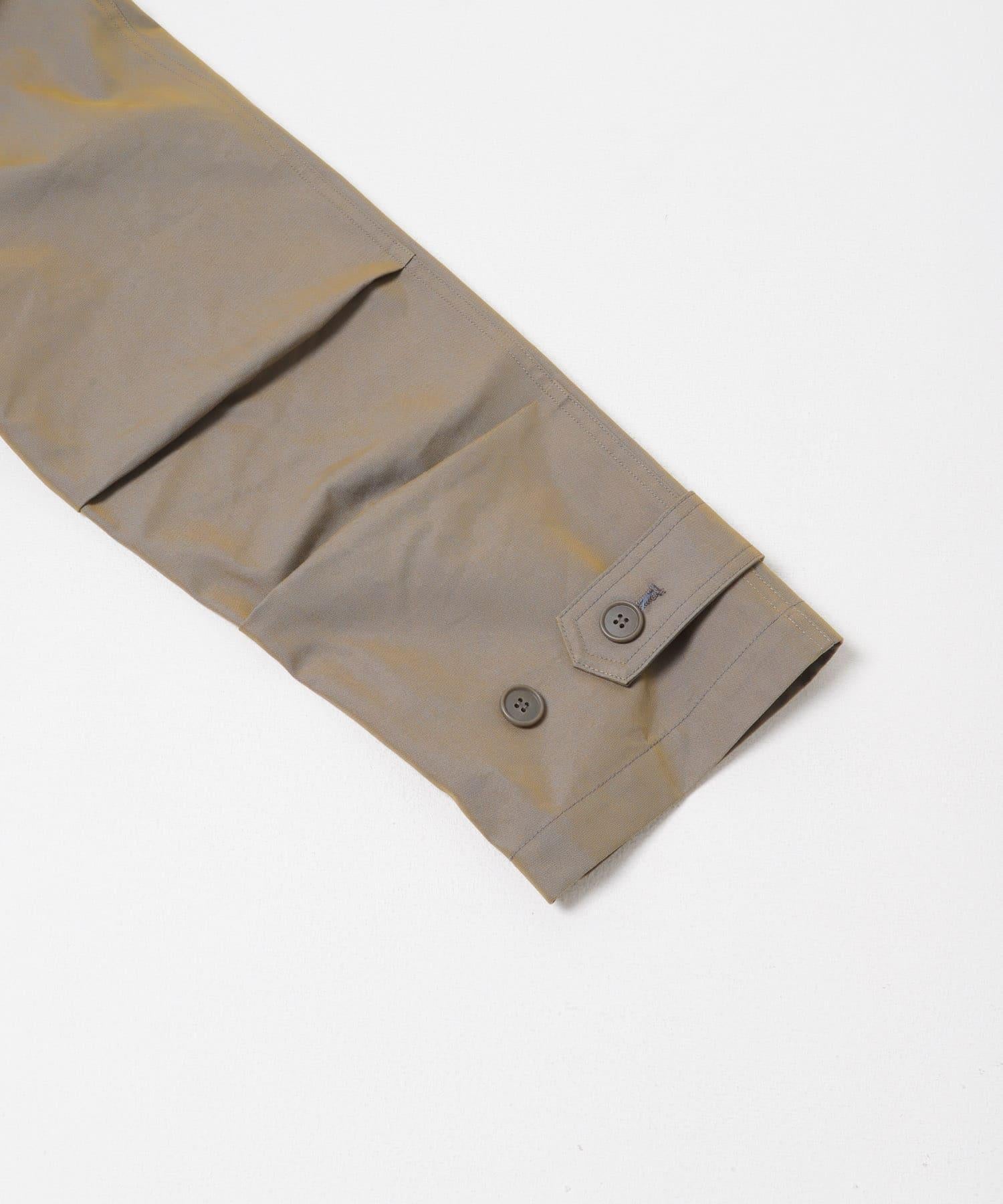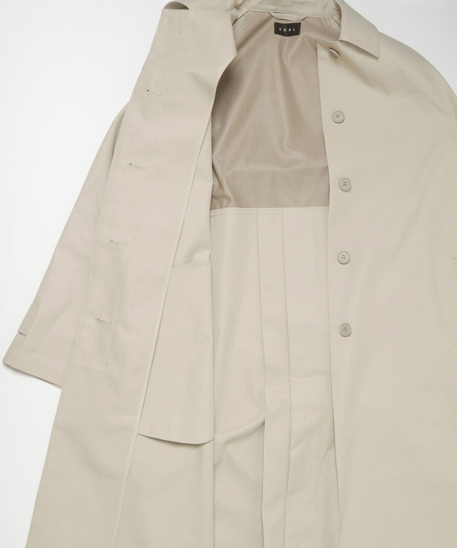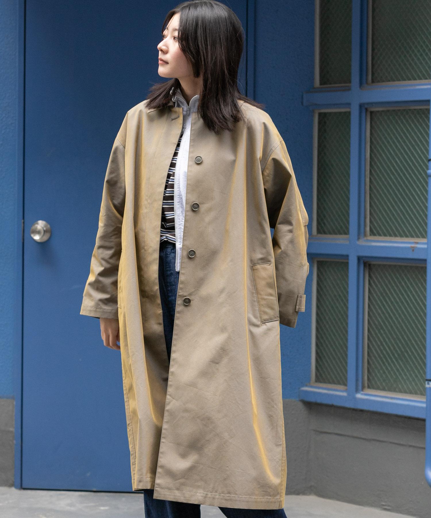採用高密度棉滌斜紋織物製成。棉和滌綸的交叉編織可防止起皺,並具有優雅的光澤和記憶感。此外,還可提供具有虹彩色澤和羊羔絨質感的款式。不鏽鋼領大衣設計簡潔,領口和輪廓寬鬆。衣袖肘部的動作褶襉和背部的網眼透氣設計融入了戶外元素。後開衩後部用紐扣打開,前開衩用比翼規格打開,融入了經典感,成為日常穿著不會過於隨意、輕鬆的設計。