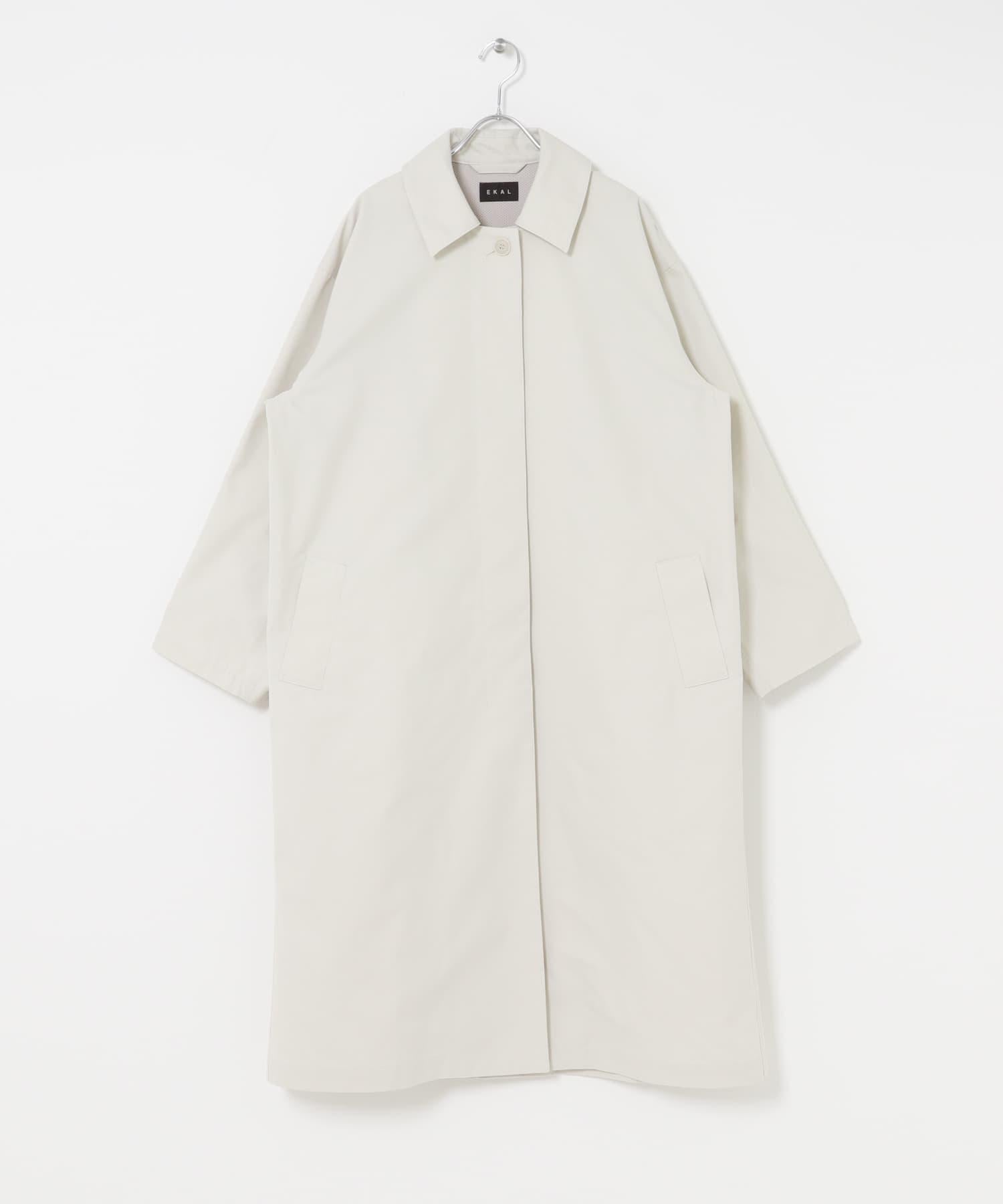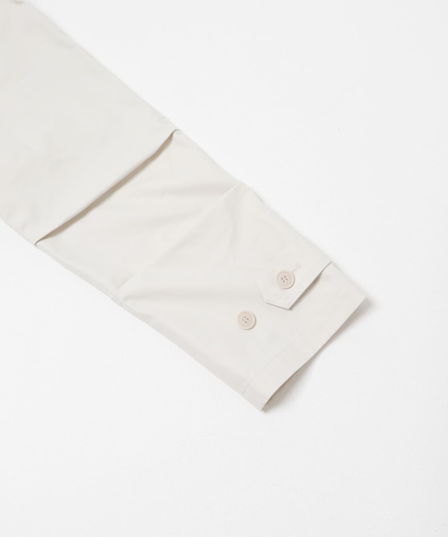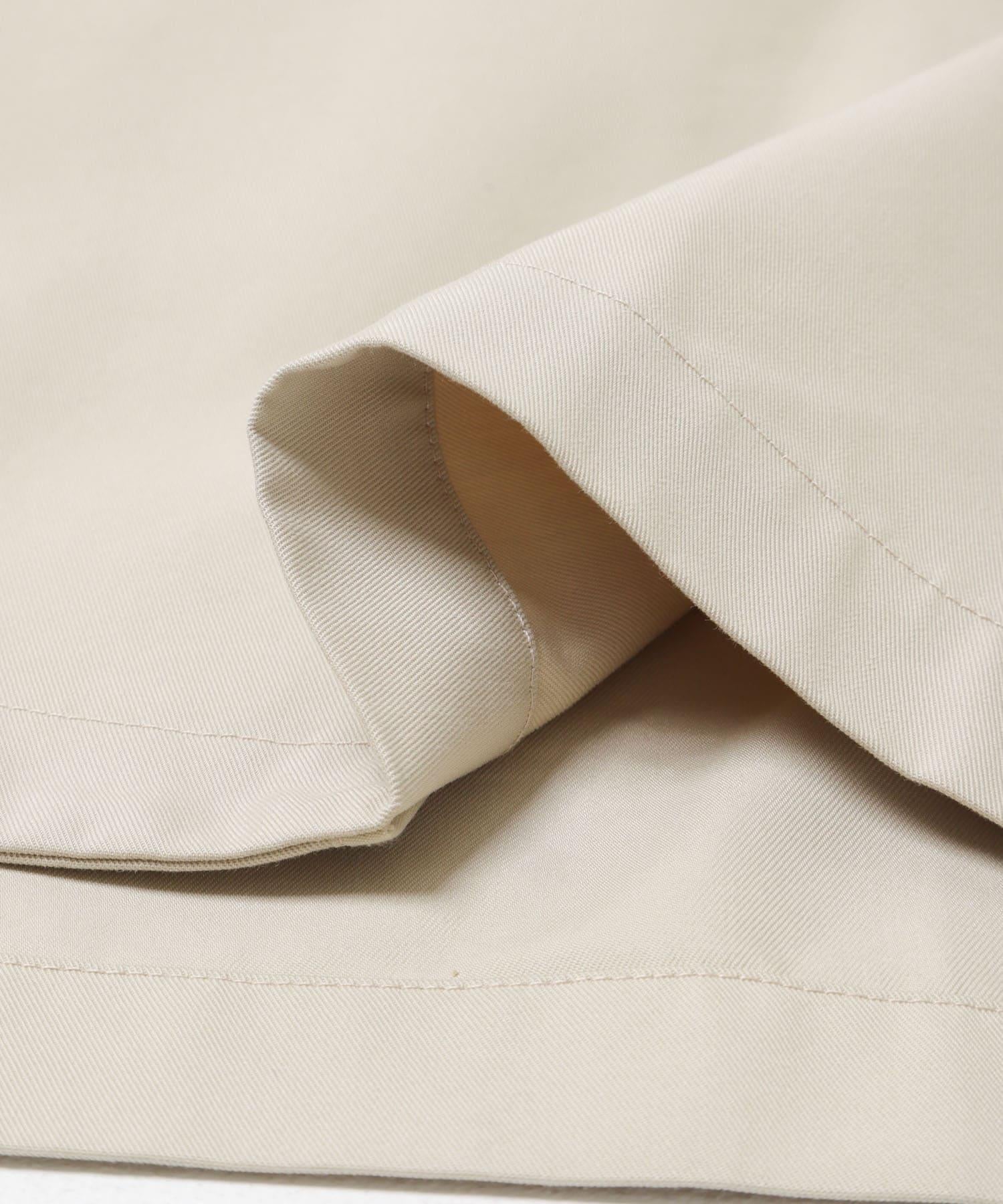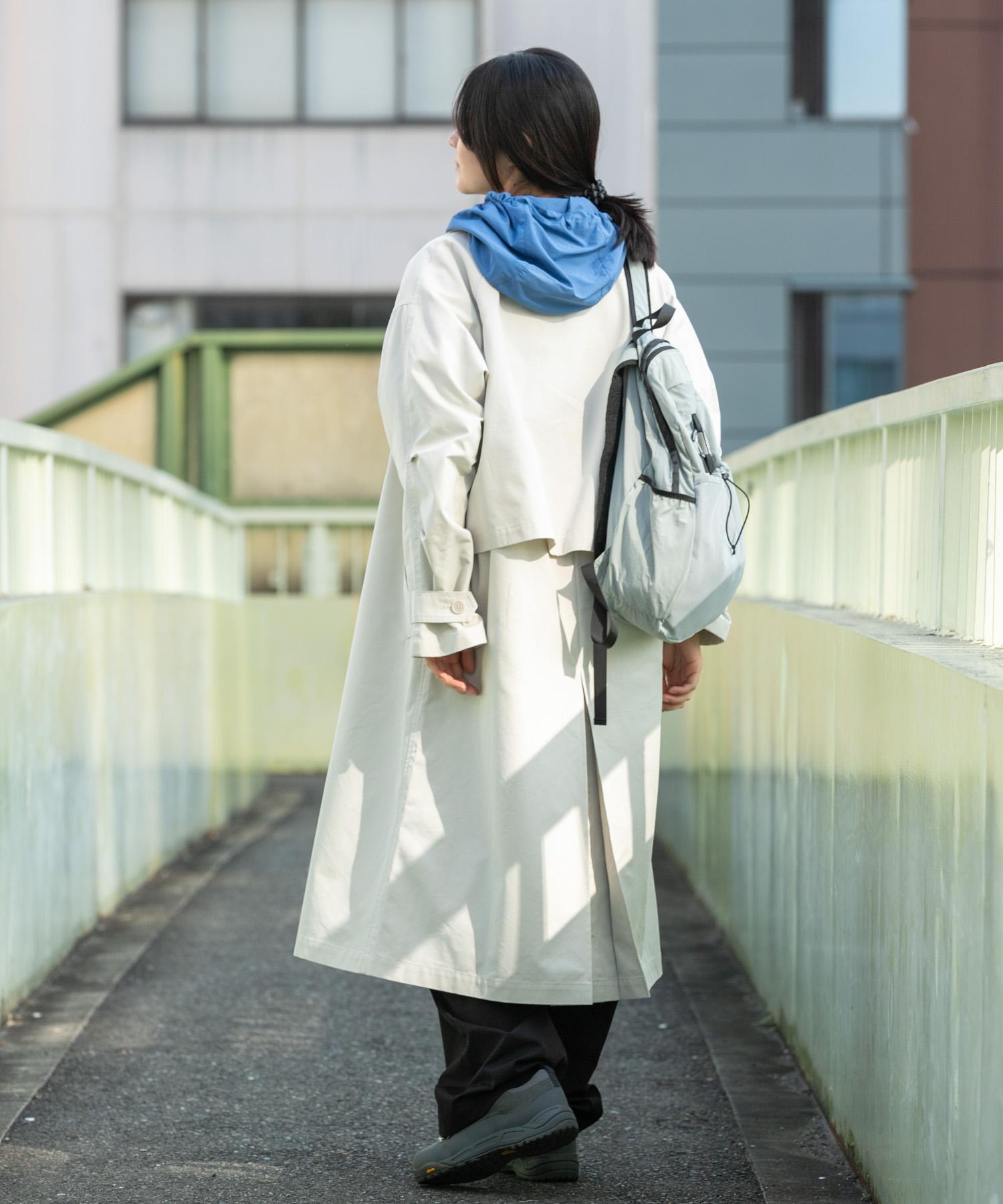 採用高密度棉滌斜紋織物製成。棉和滌綸的交叉編織可防止起皺,並具有優雅的光澤和記憶感。此外,還可提供具有虹彩色澤和羊羔絨質感的款式。不鏽鋼領大衣設計簡潔,領口和輪廓寬鬆。衣袖肘部的動作褶襉和背部的網眼透氣設計融入了戶外元素。後開衩後部用紐扣打開,前開衩用比翼規格打開,融入了經典感,成為日常穿著不會過於隨意、輕鬆的設計。