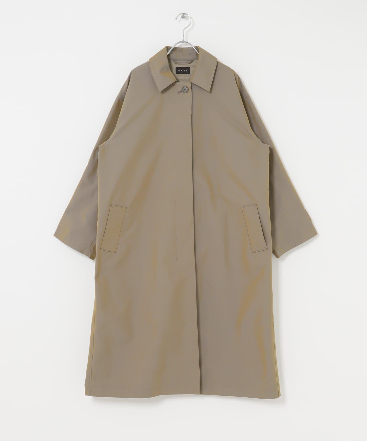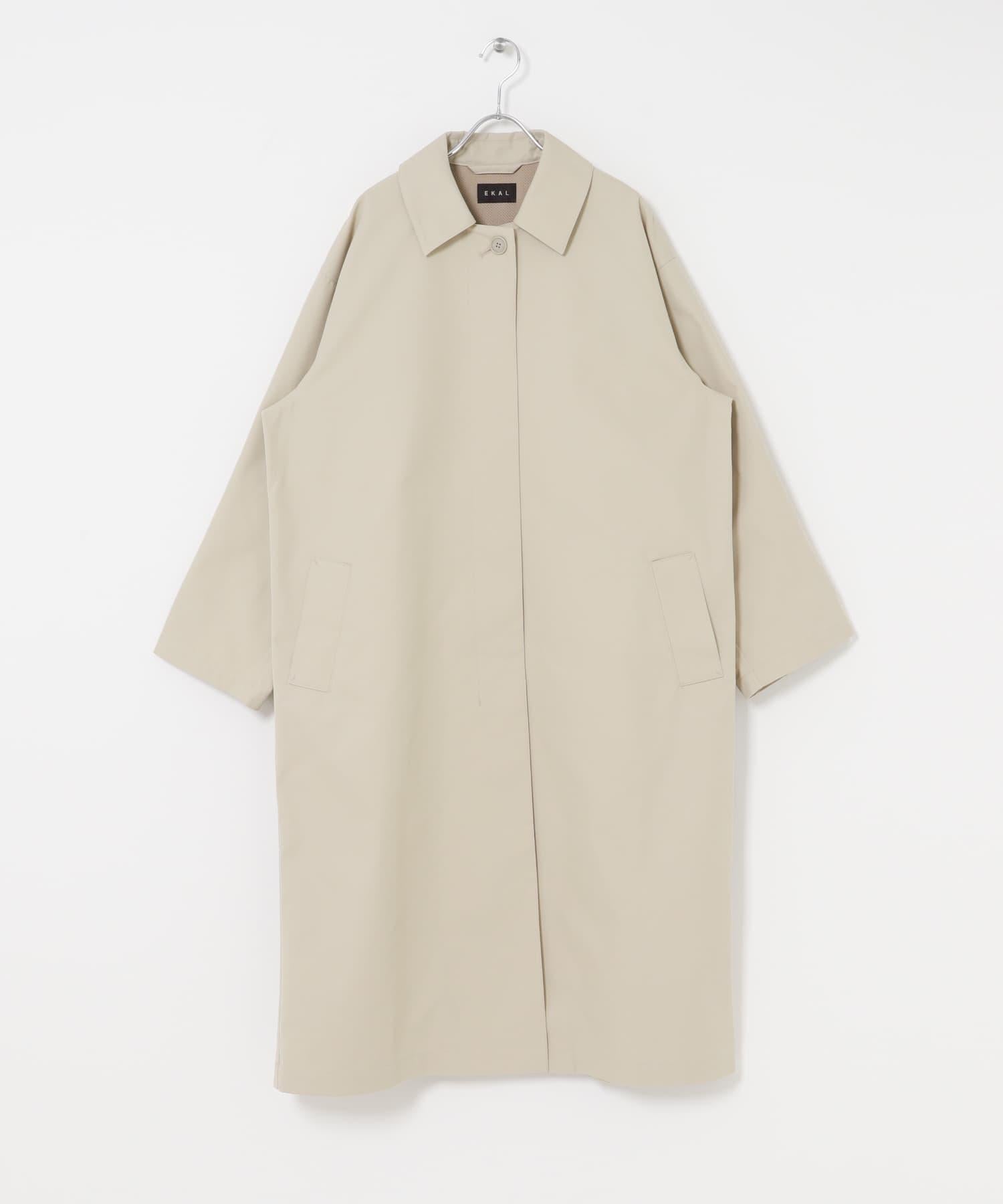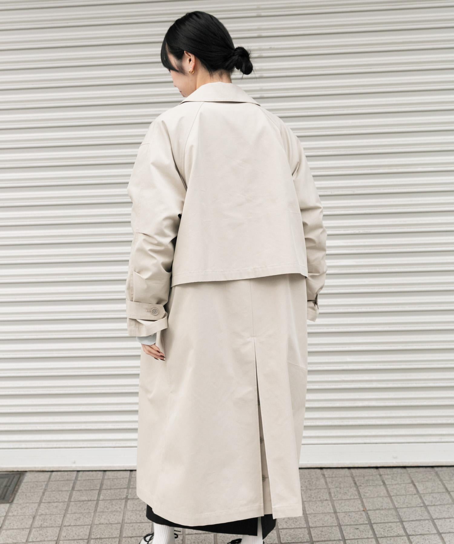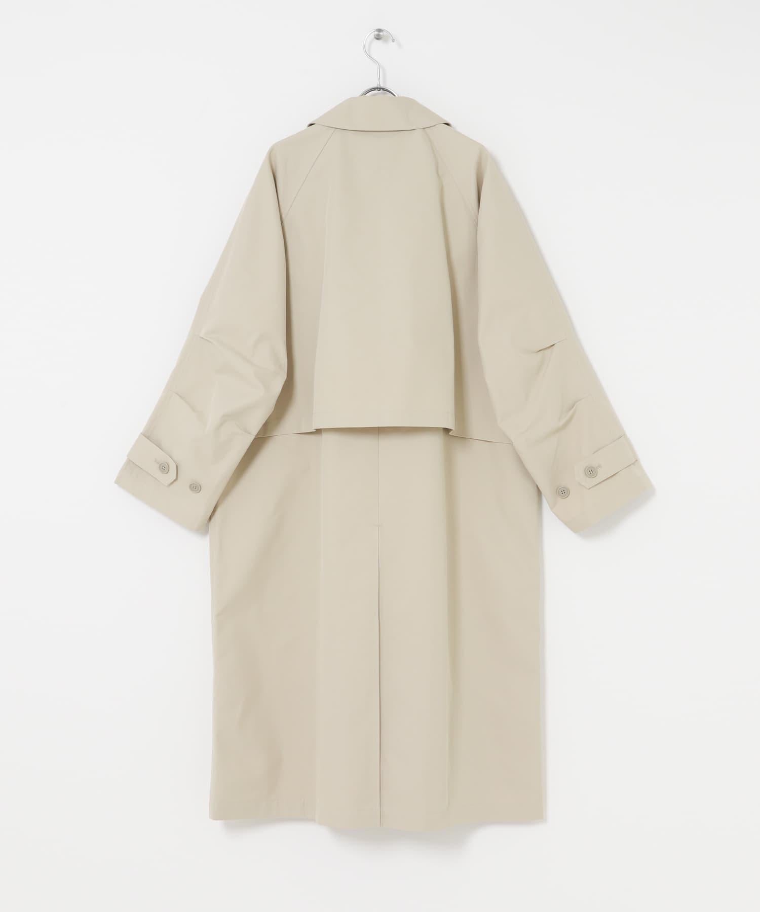 採用高密度棉滌斜紋織物製成。棉和滌綸的交叉編織可防止起皺,並具有優雅的光澤和記憶感。此外,還可提供具有虹彩色澤和羊羔絨質感的款式。不鏽鋼領大衣設計簡潔,領口和輪廓寬鬆。衣袖肘部的動作褶襉和背部的網眼透氣設計融入了戶外元素。後開衩後部用紐扣打開,前開衩用比翼規格打開,融入了經典感,成為日常穿著不會過於隨意、輕鬆的設計。