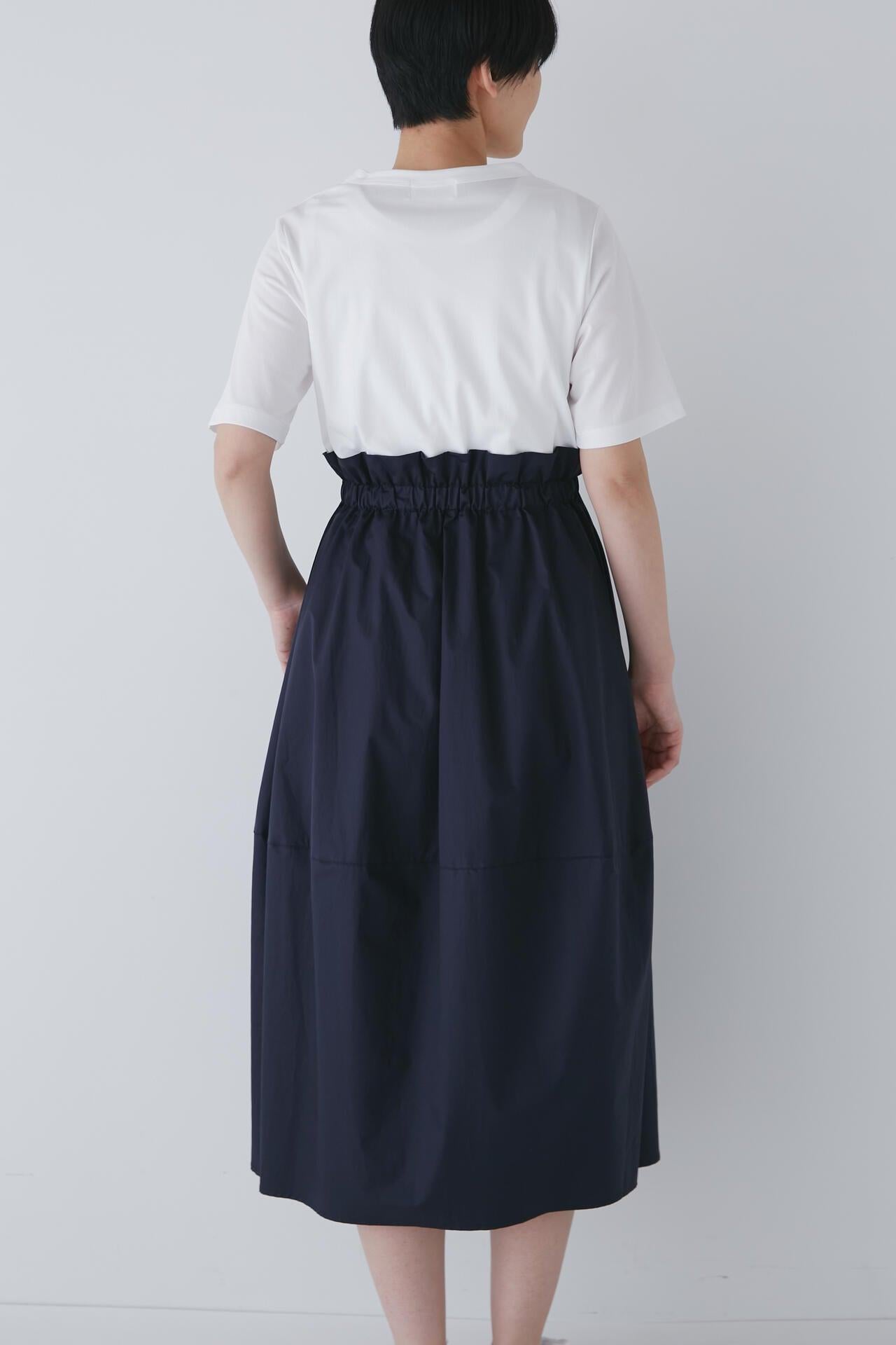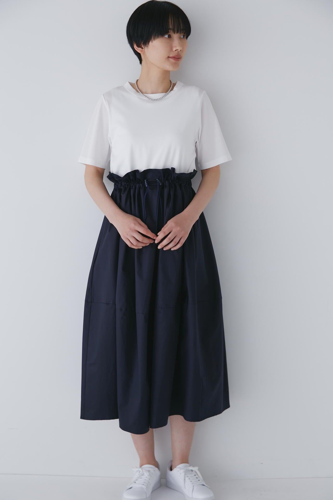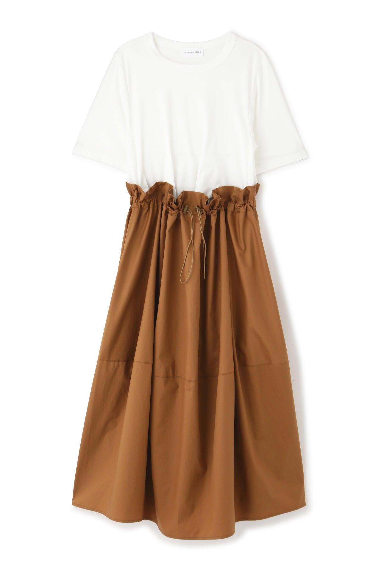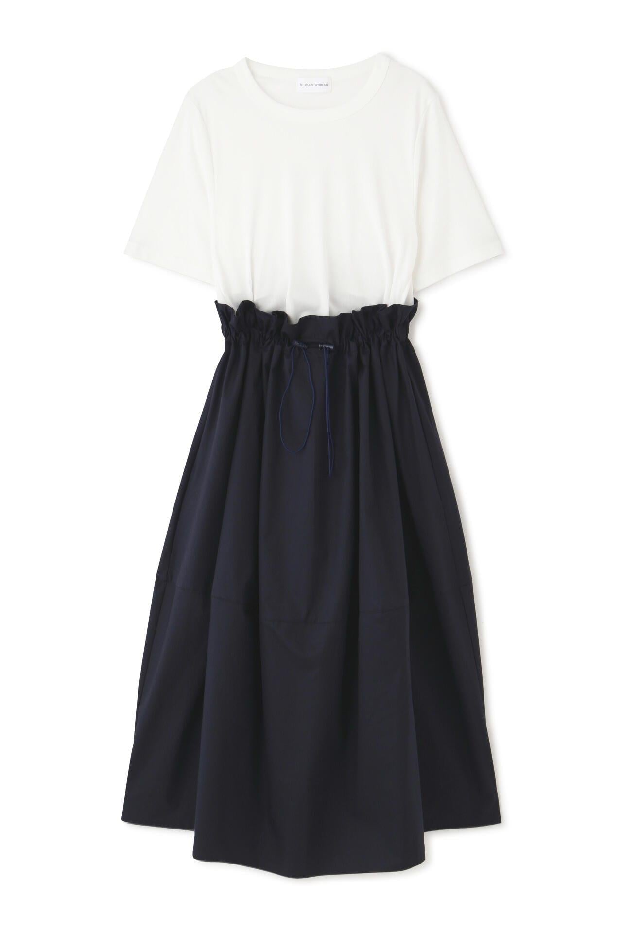 無需擔心搭配問題。這款連身裙是將乾淨小巧的 T 恤與動感十足的抽帶裙對接而成。上衣部分採用棉-聚酯經編面料,既有梭織面料的彈力,又有針織面料的舒適;裙襬部分採用棉-甩硅兩面洗面料,手感寬鬆、柔軟、有彈性且乾爽。裙子部分由棉硅雙層水洗面料製成。上衣部分設計為 T 恤,因此可與開衫或其他服裝輕鬆疊穿。