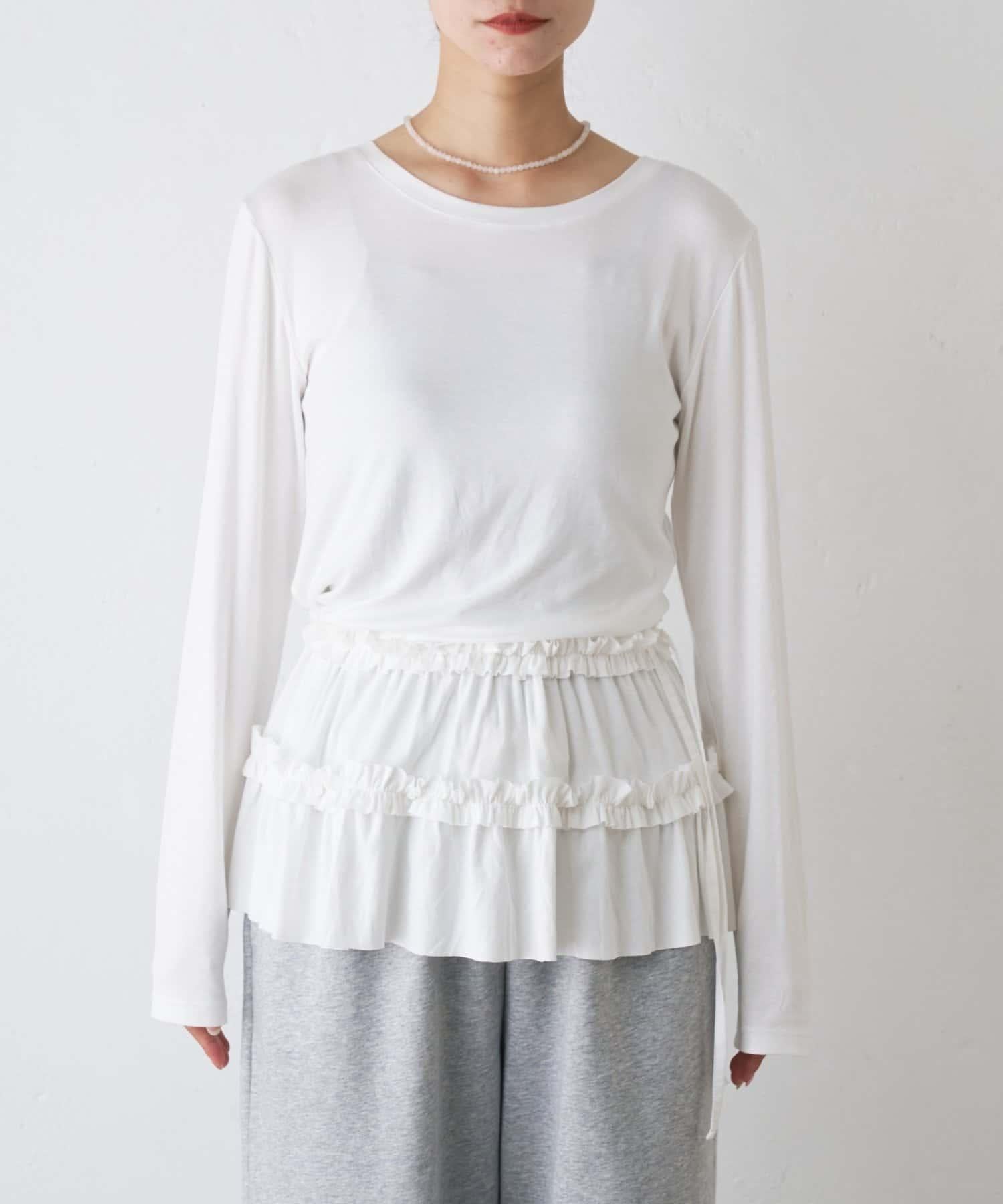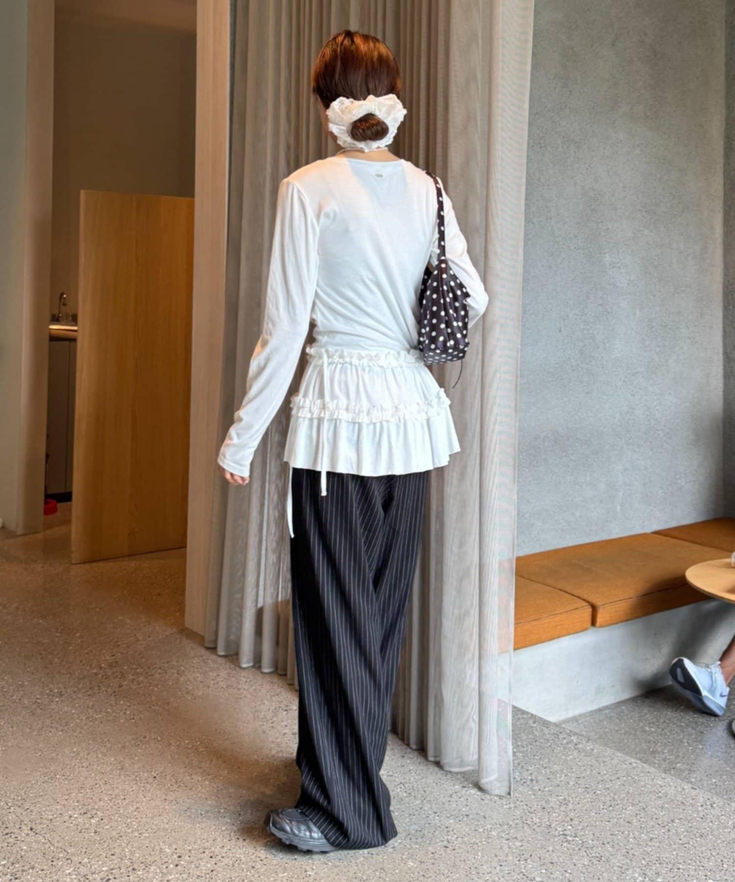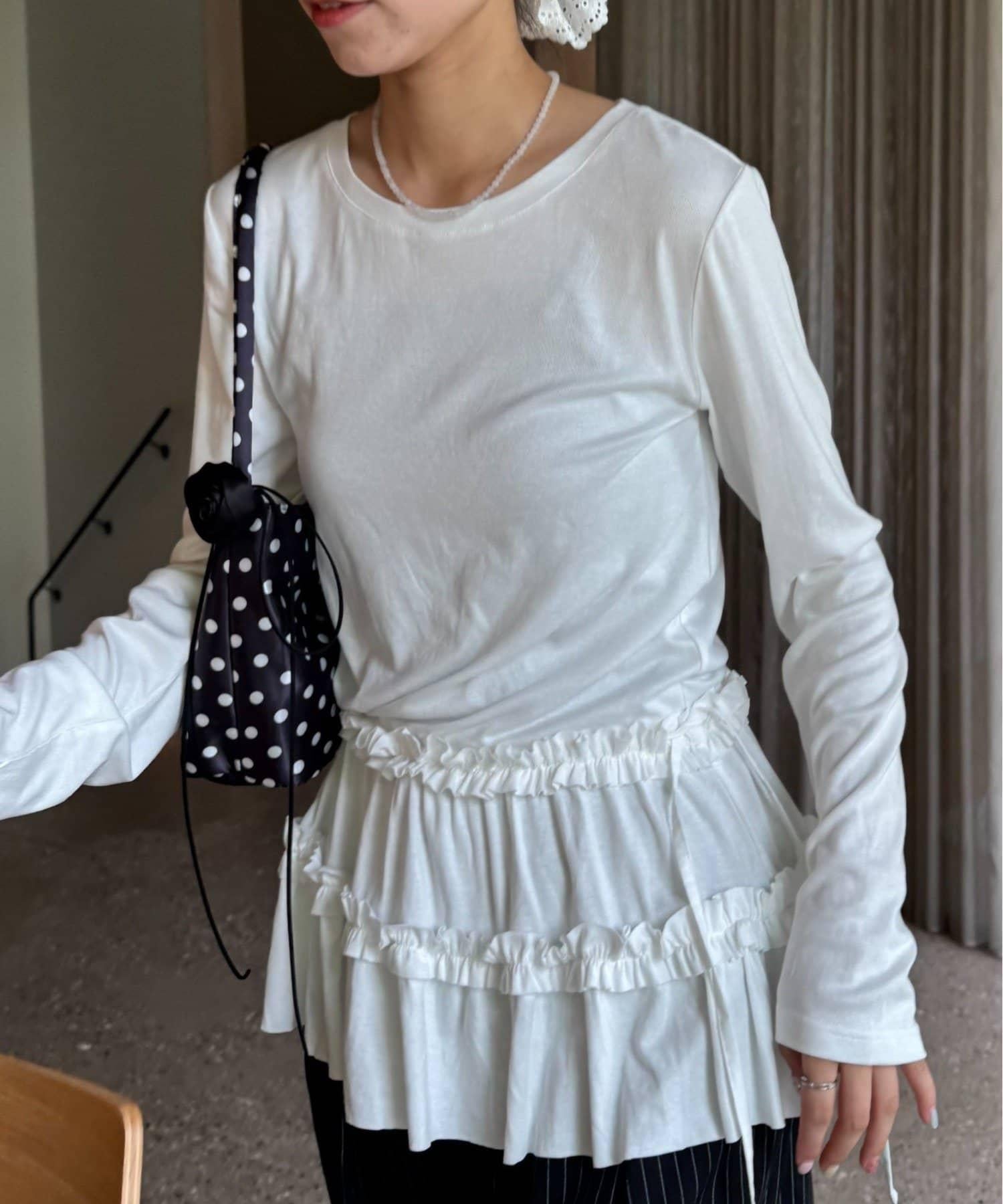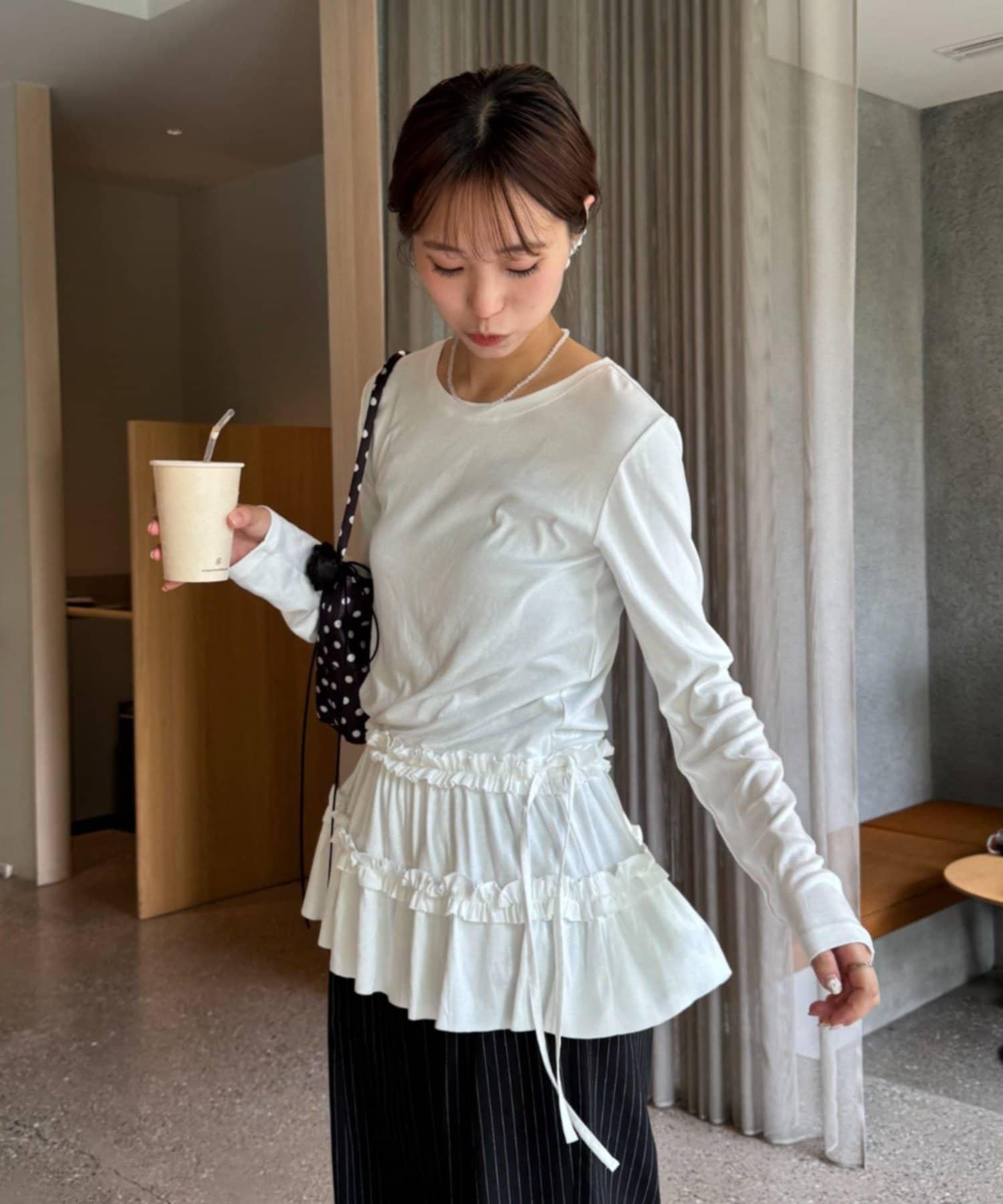 荷葉邊下襬上衣(白色)可在側面繫上絲帶,進一步修飾腰身,營造出提升氣質的效果。