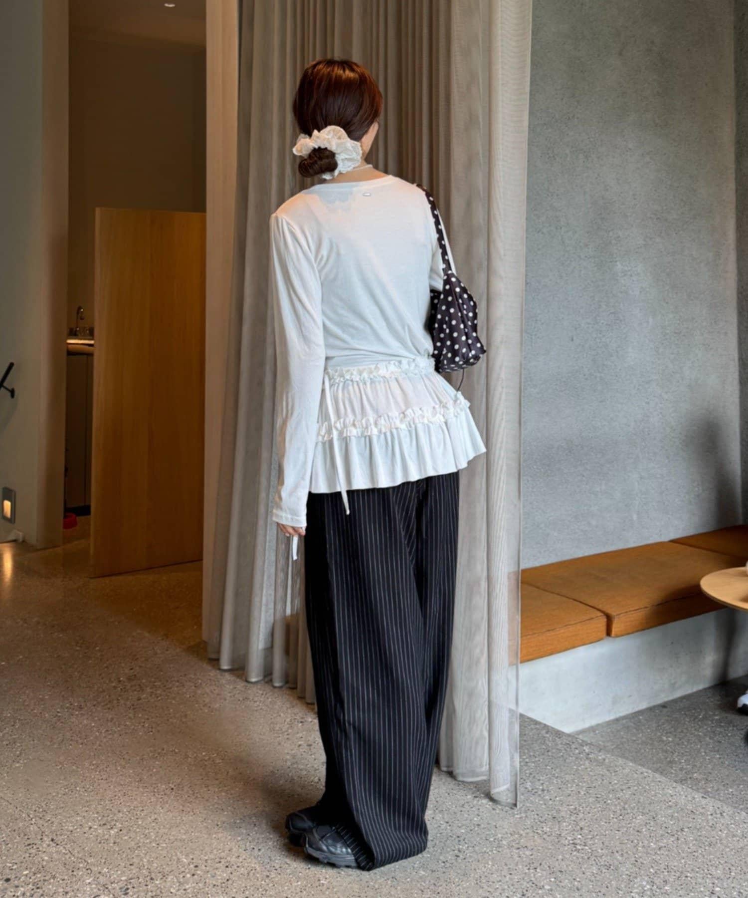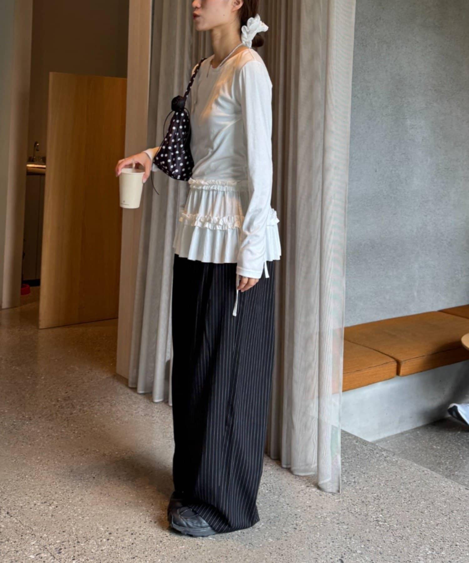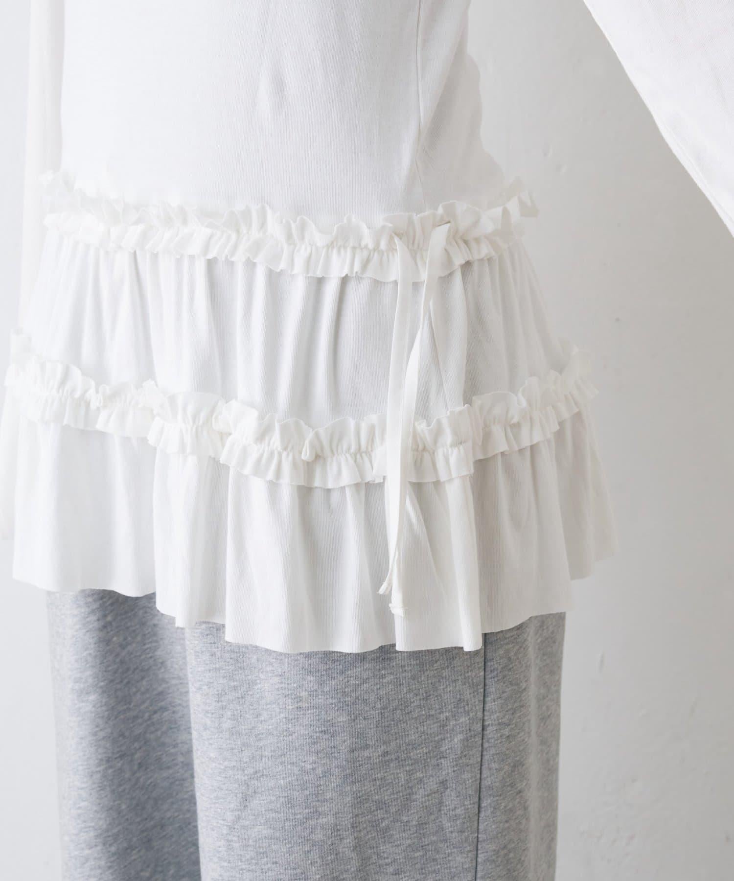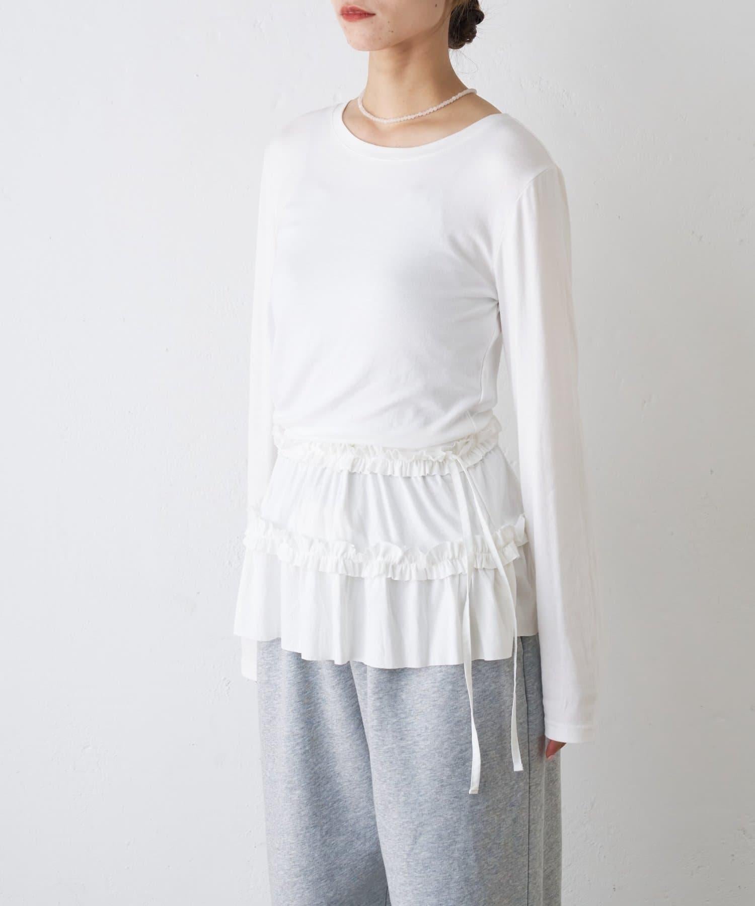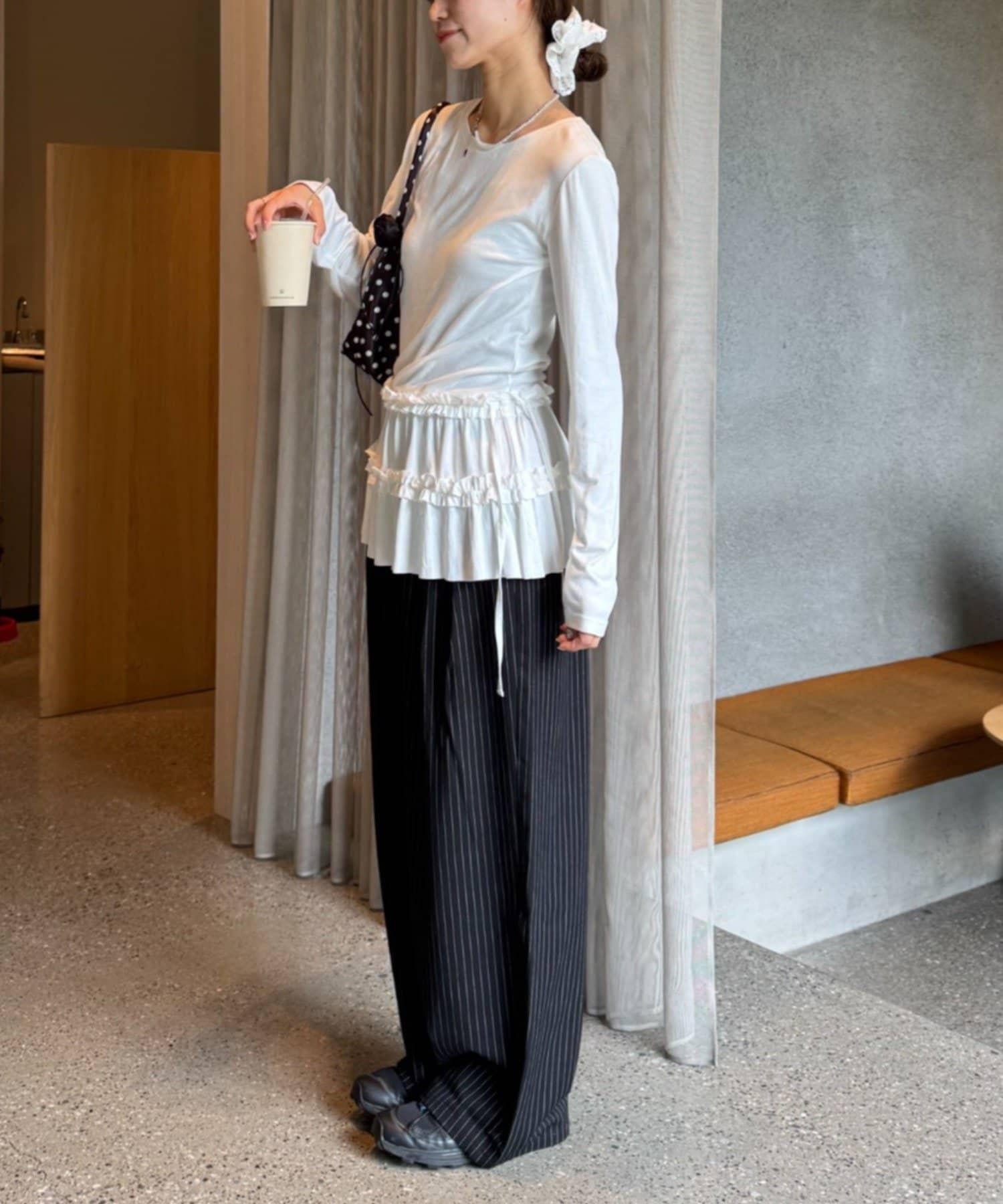 荷葉邊下襬上衣(白色)可在側面繫上絲帶,進一步修飾腰身,營造出提升氣質的效果。