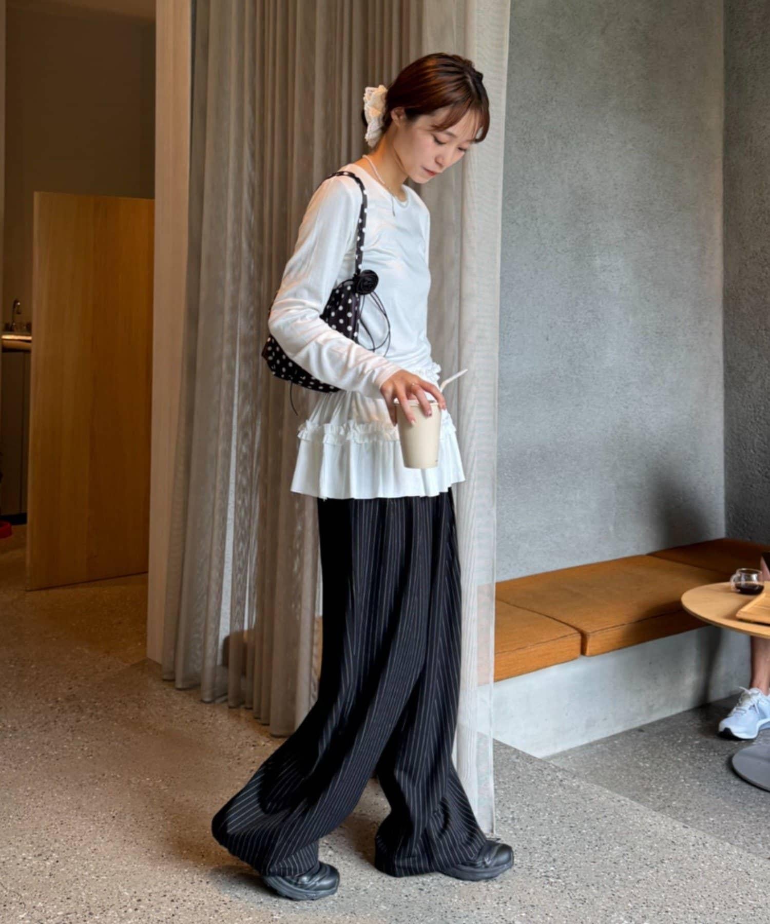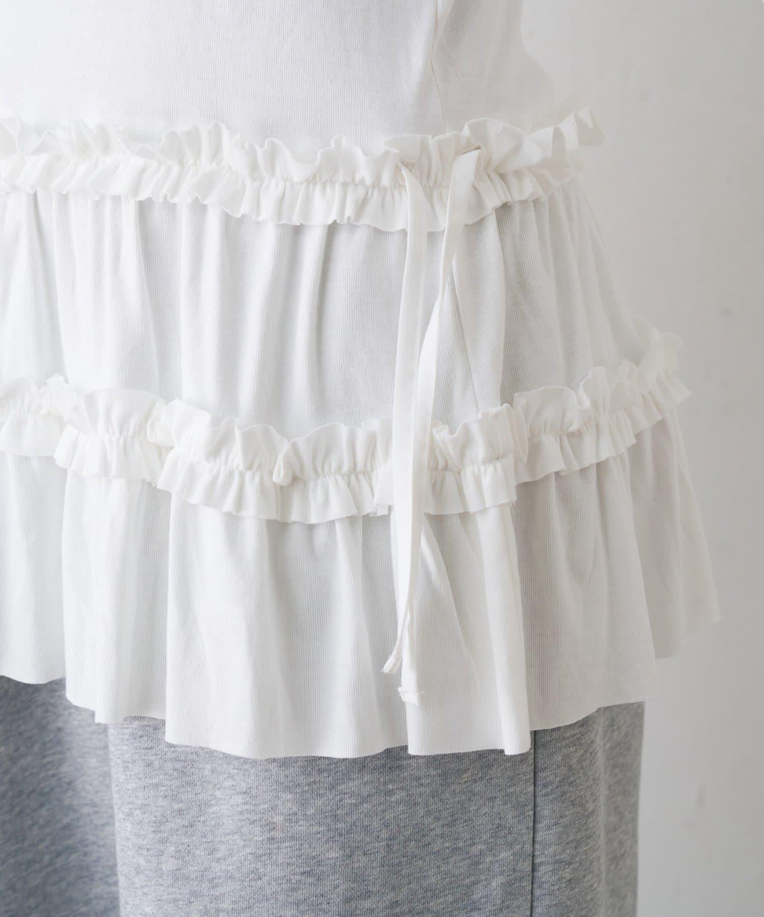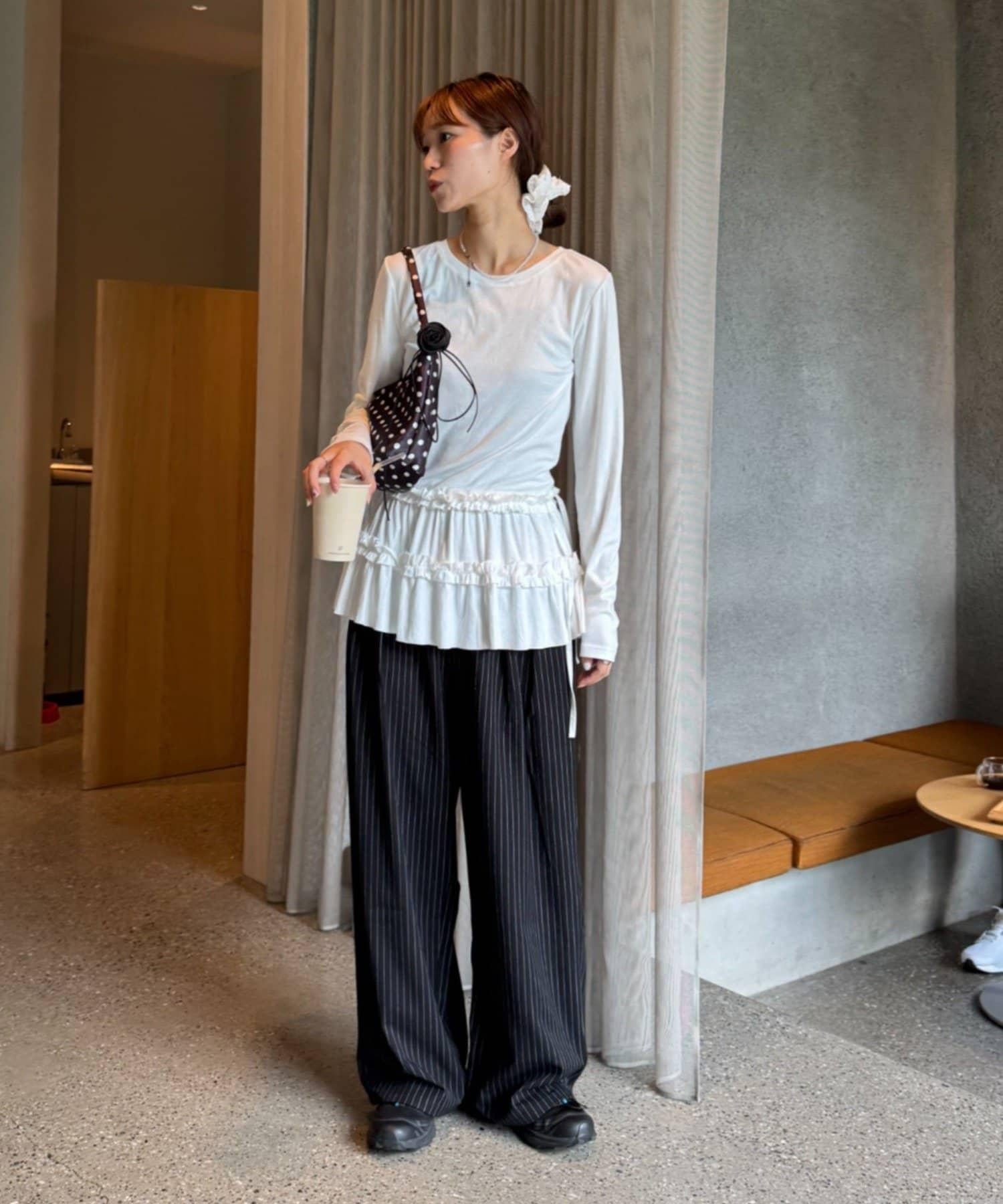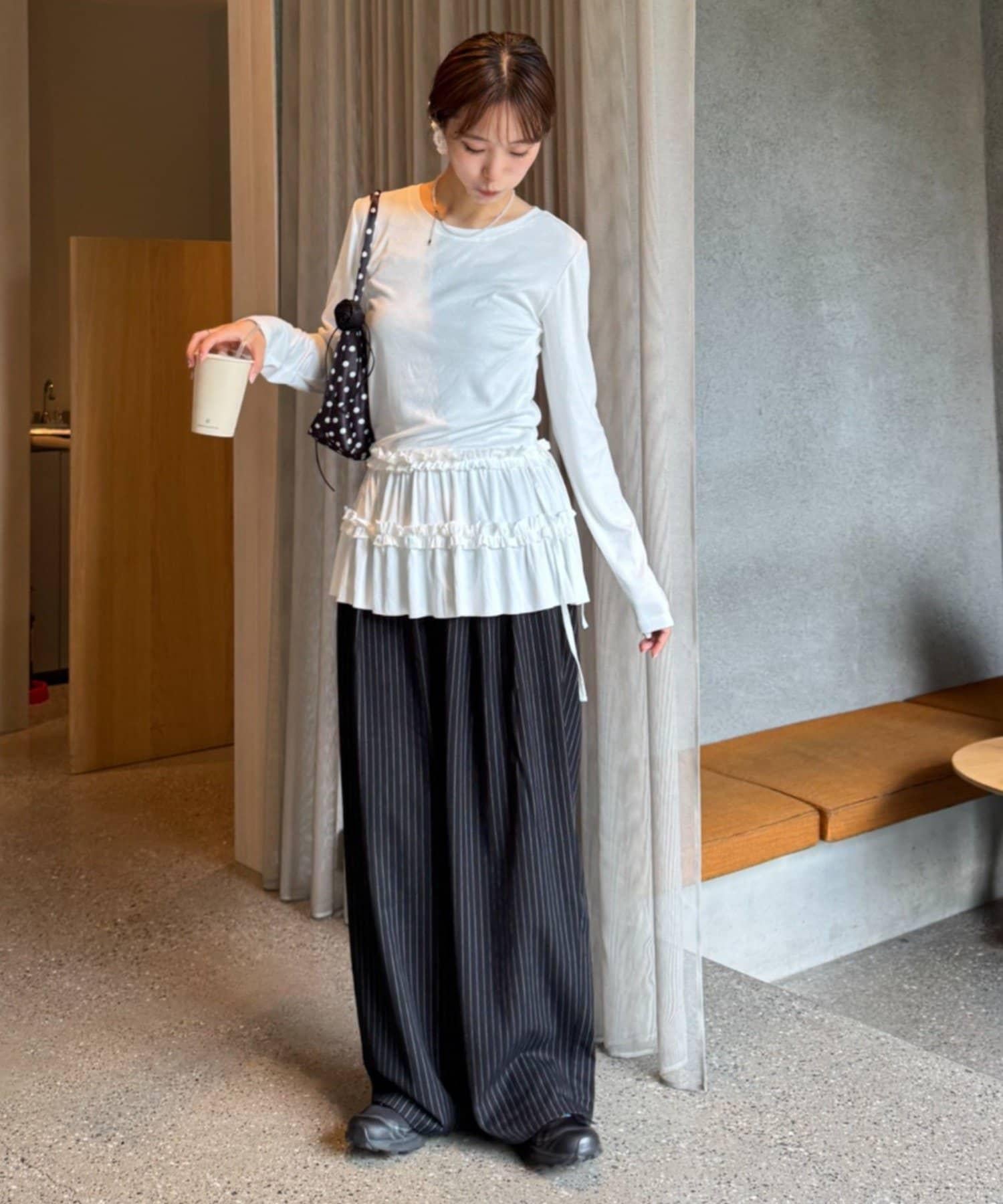 荷葉邊下襬上衣(白色)可在側面繫上絲帶,進一步修飾腰身,營造出提升氣質的效果。