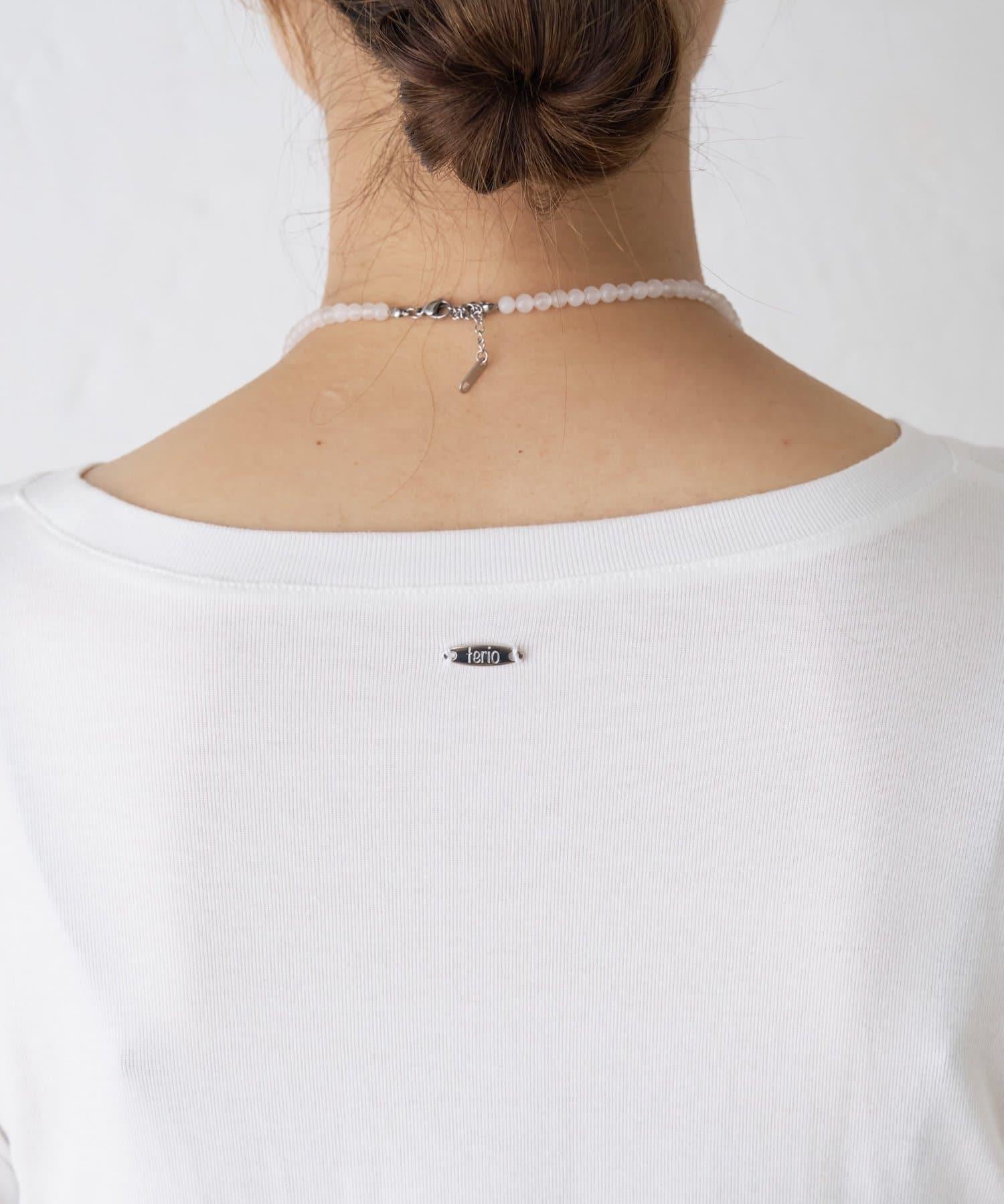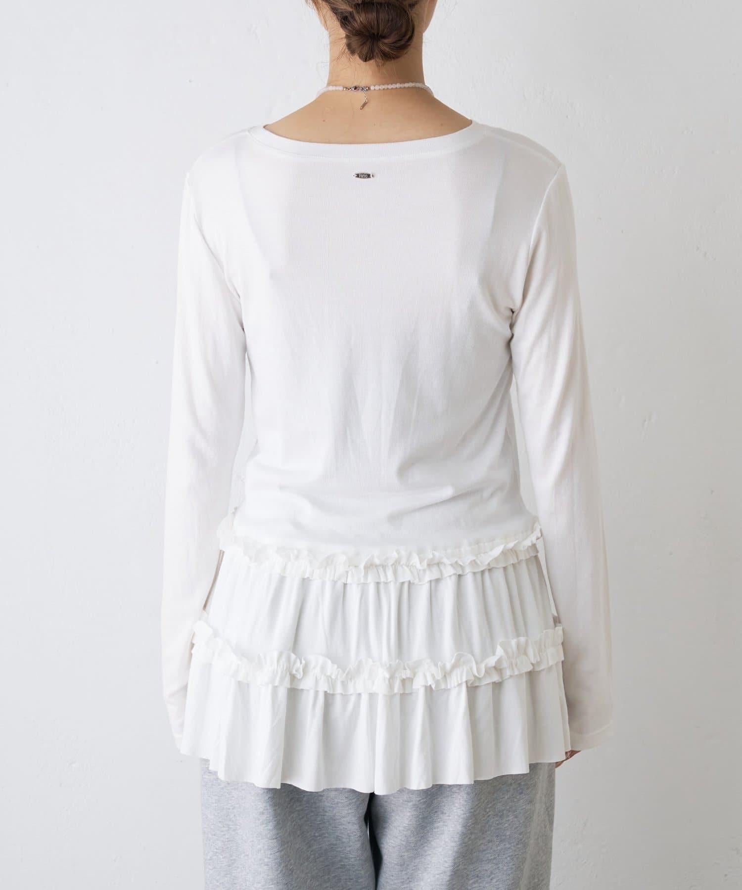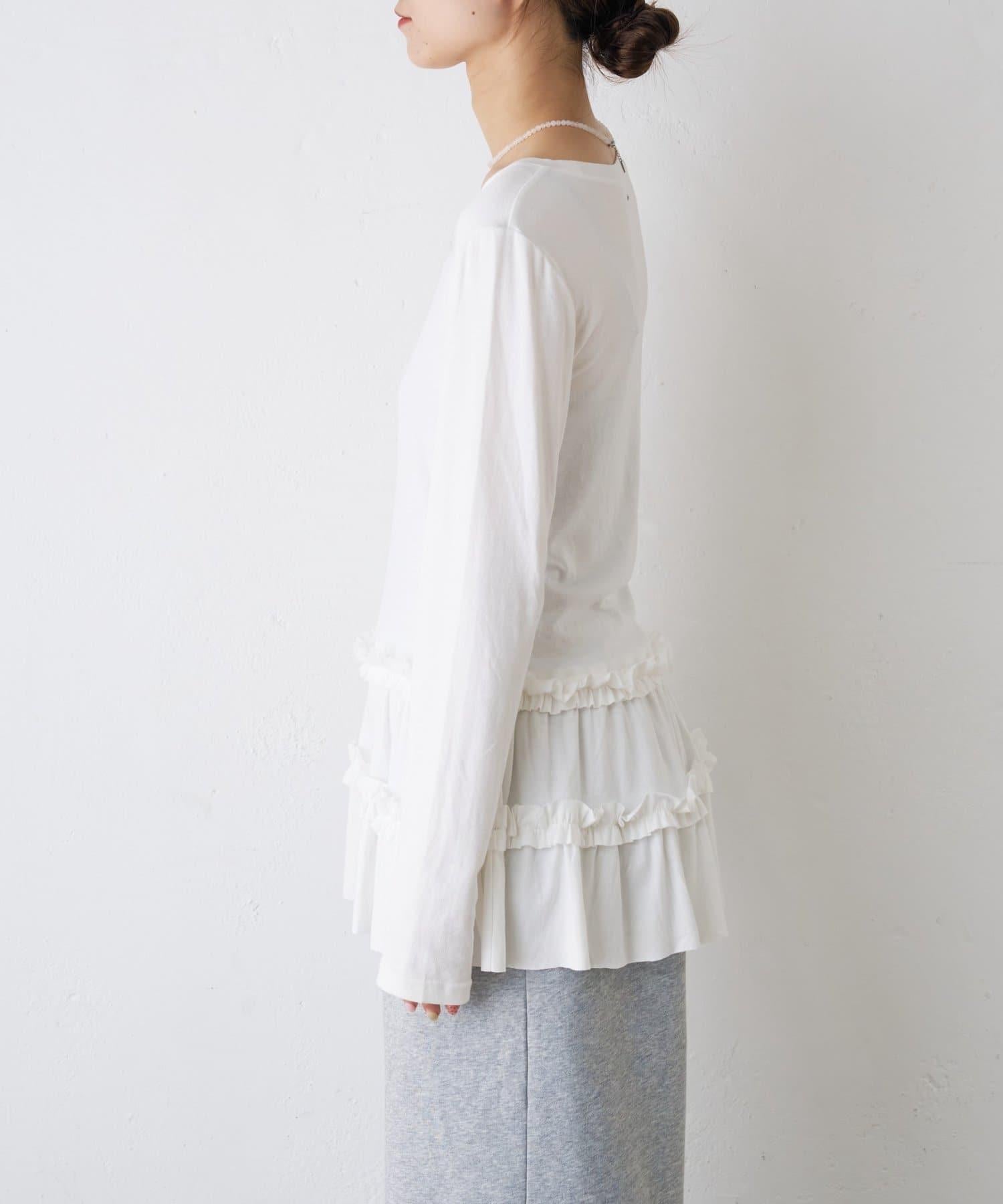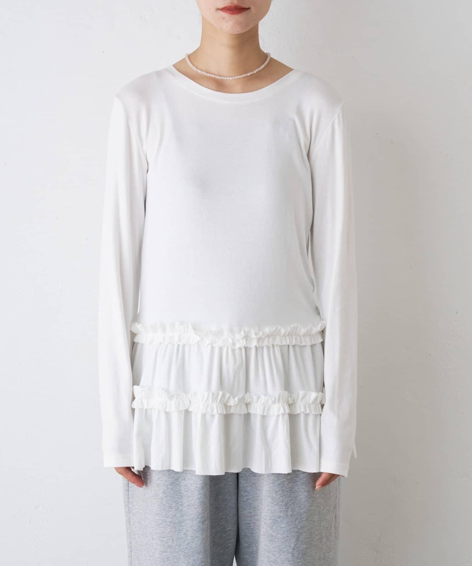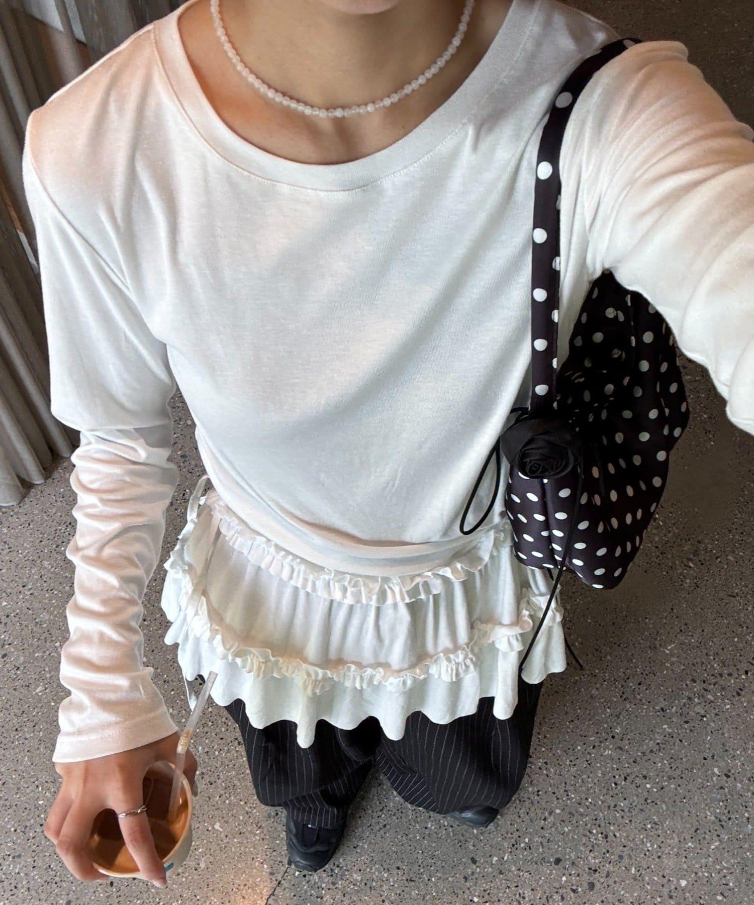 荷葉邊下襬上衣(白色)可在側面繫上絲帶,進一步修飾腰身,營造出提升氣質的效果。