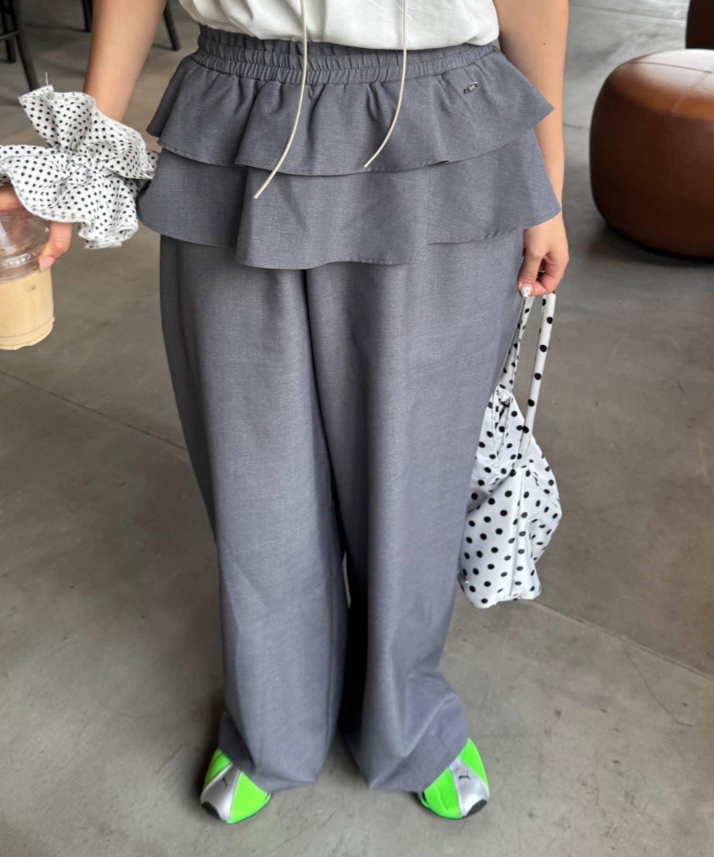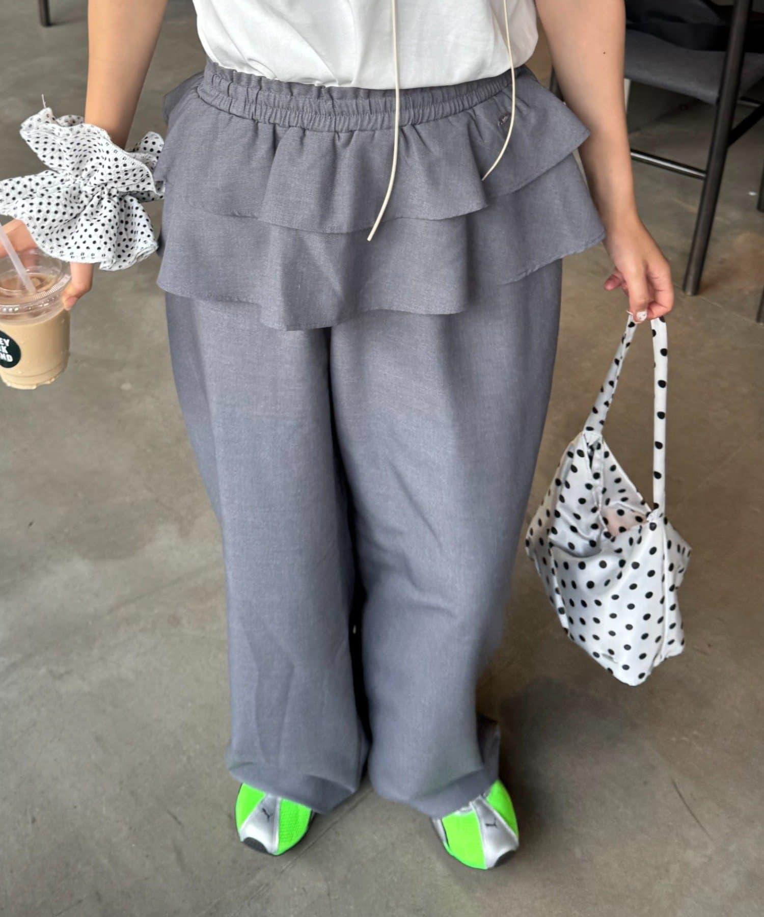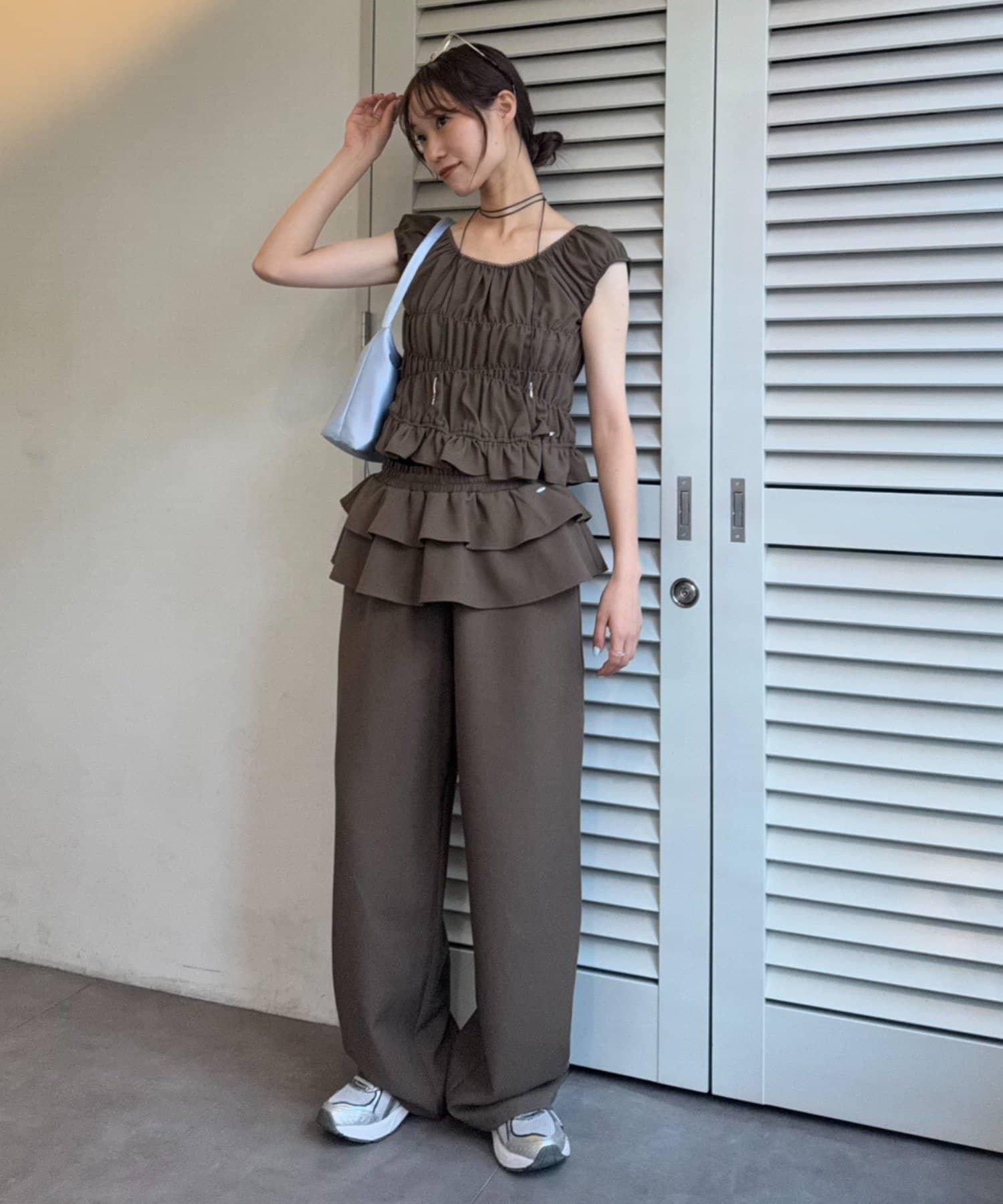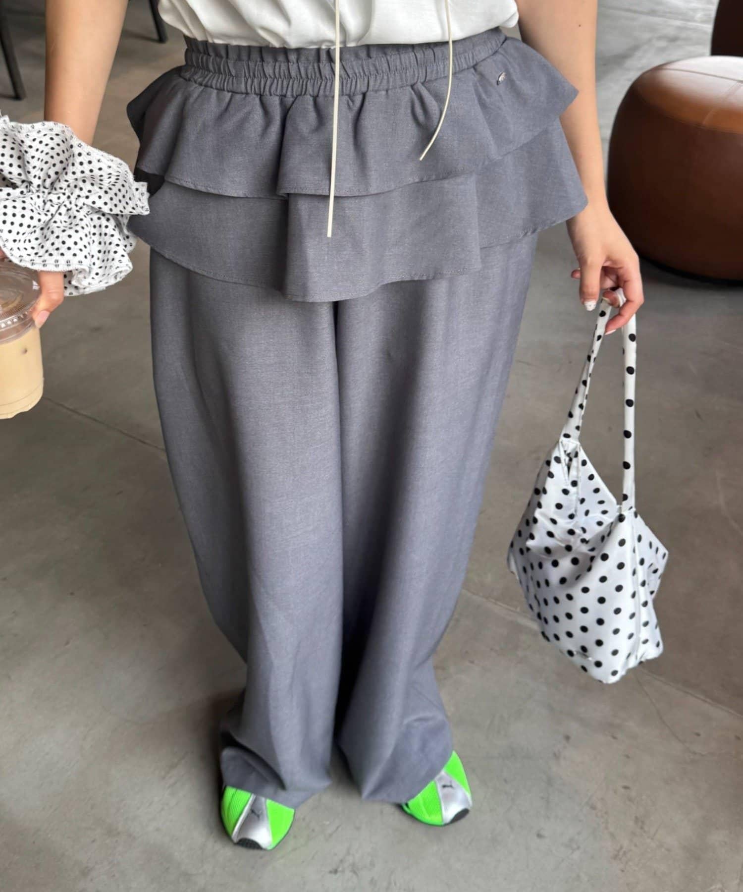 腰部的荷葉邊增加了帥氣的立體效果,成為搭配中的亮點。