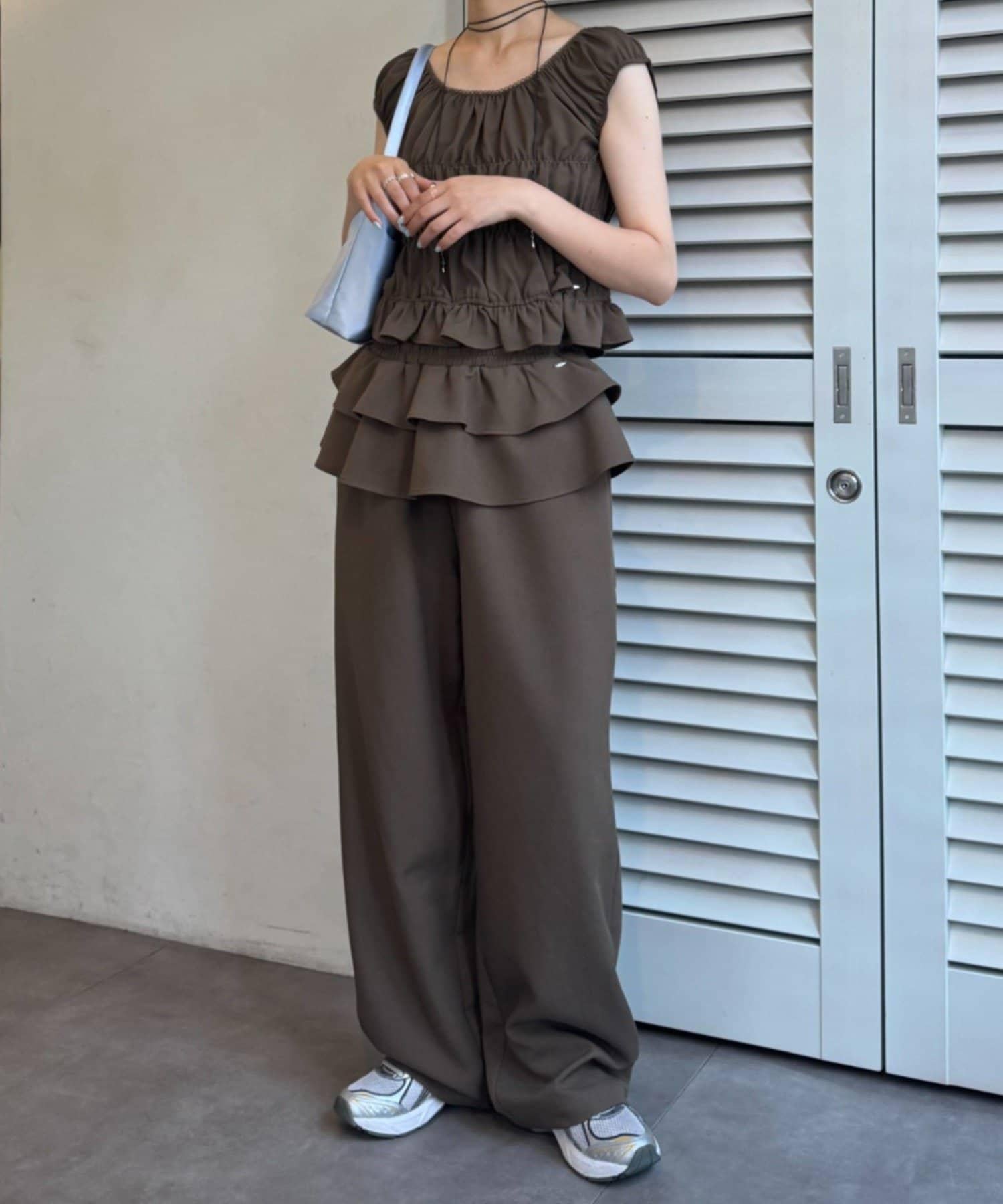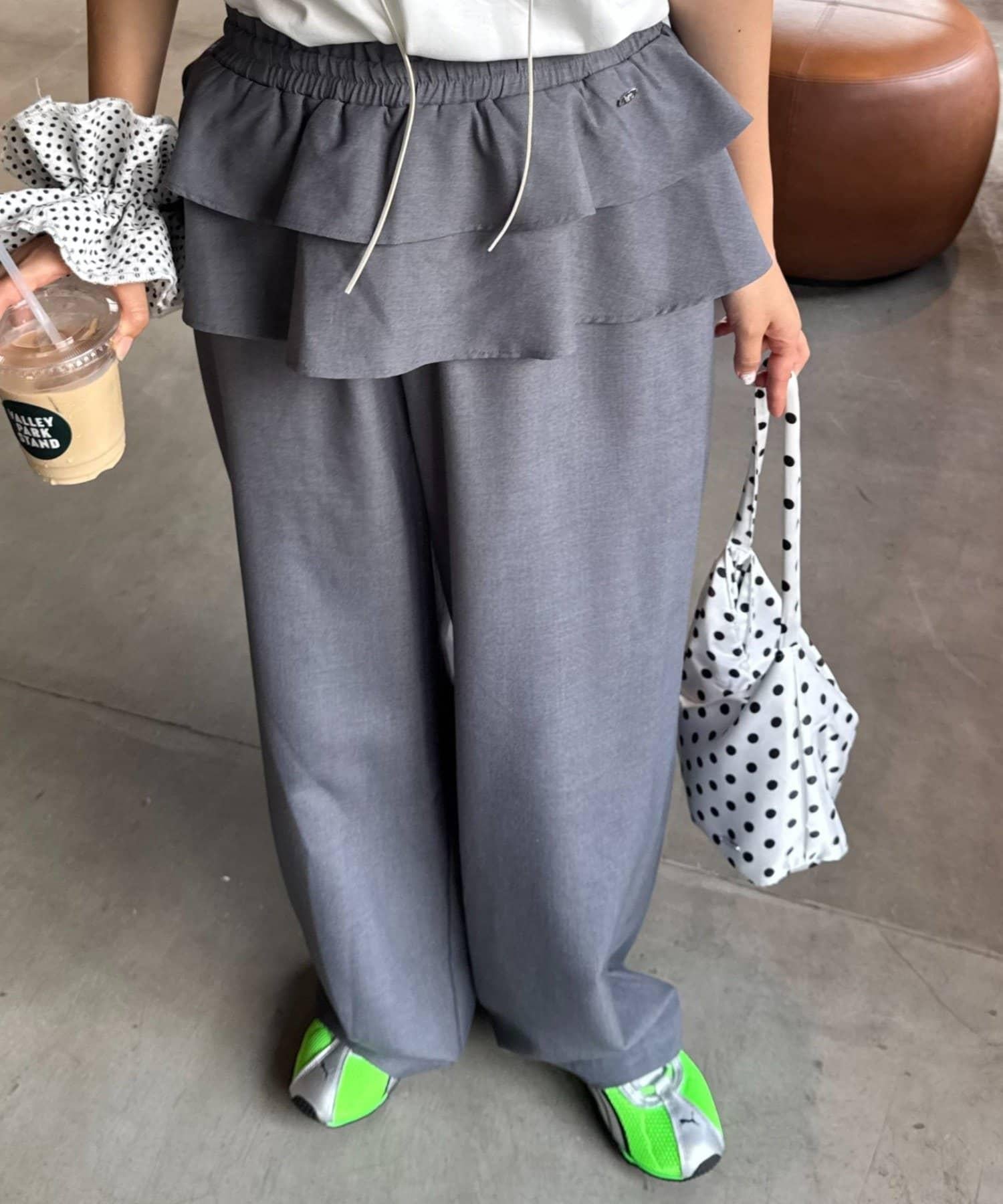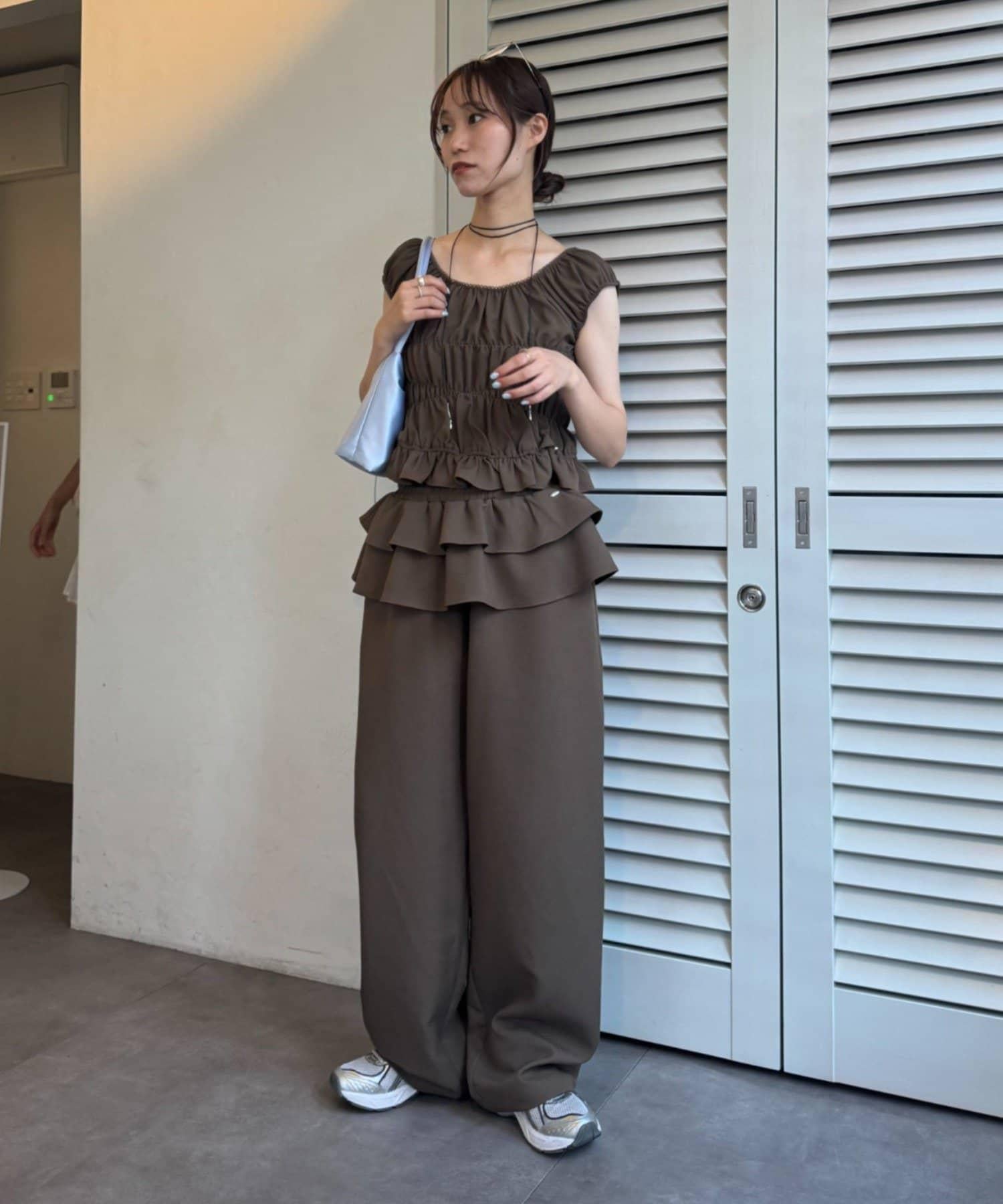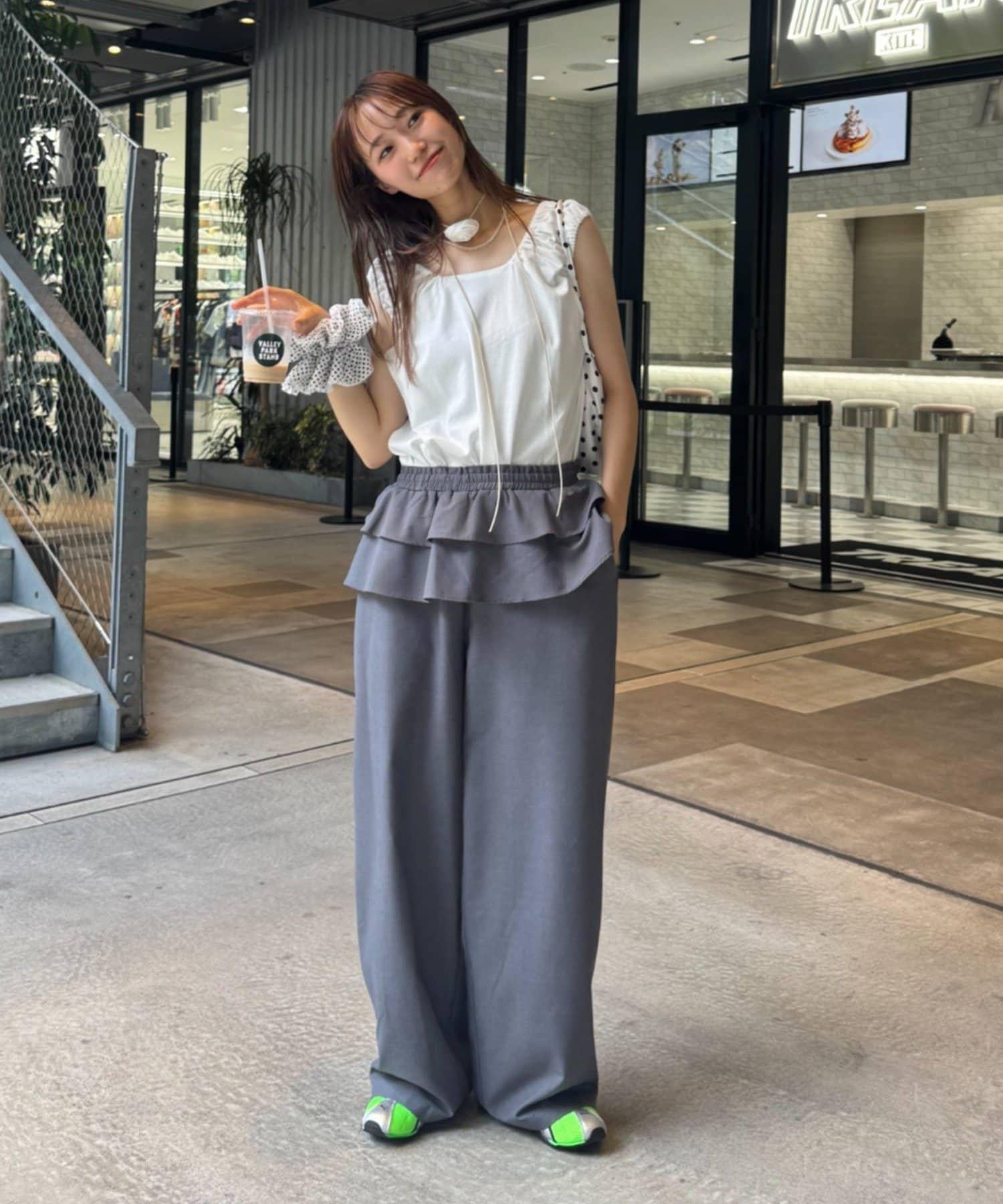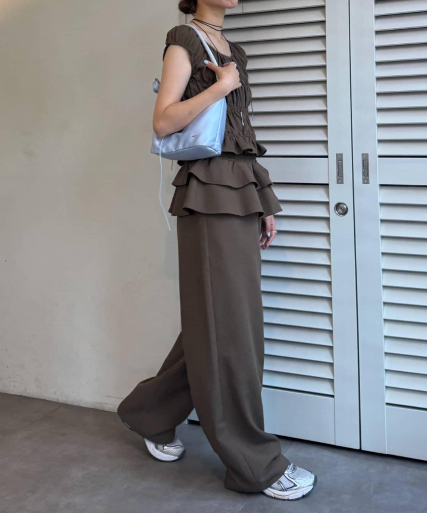 腰部的荷葉邊增加了帥氣的立體效果,成為搭配中的亮點。