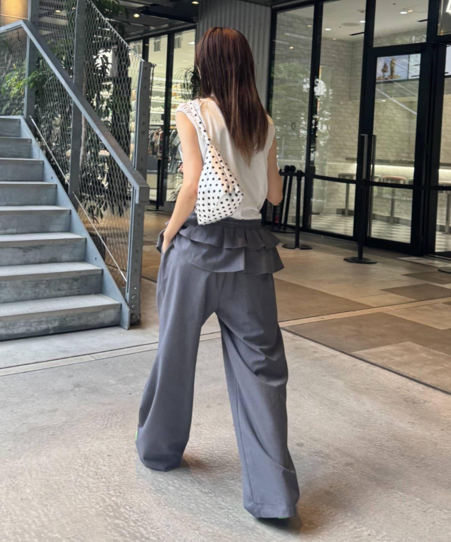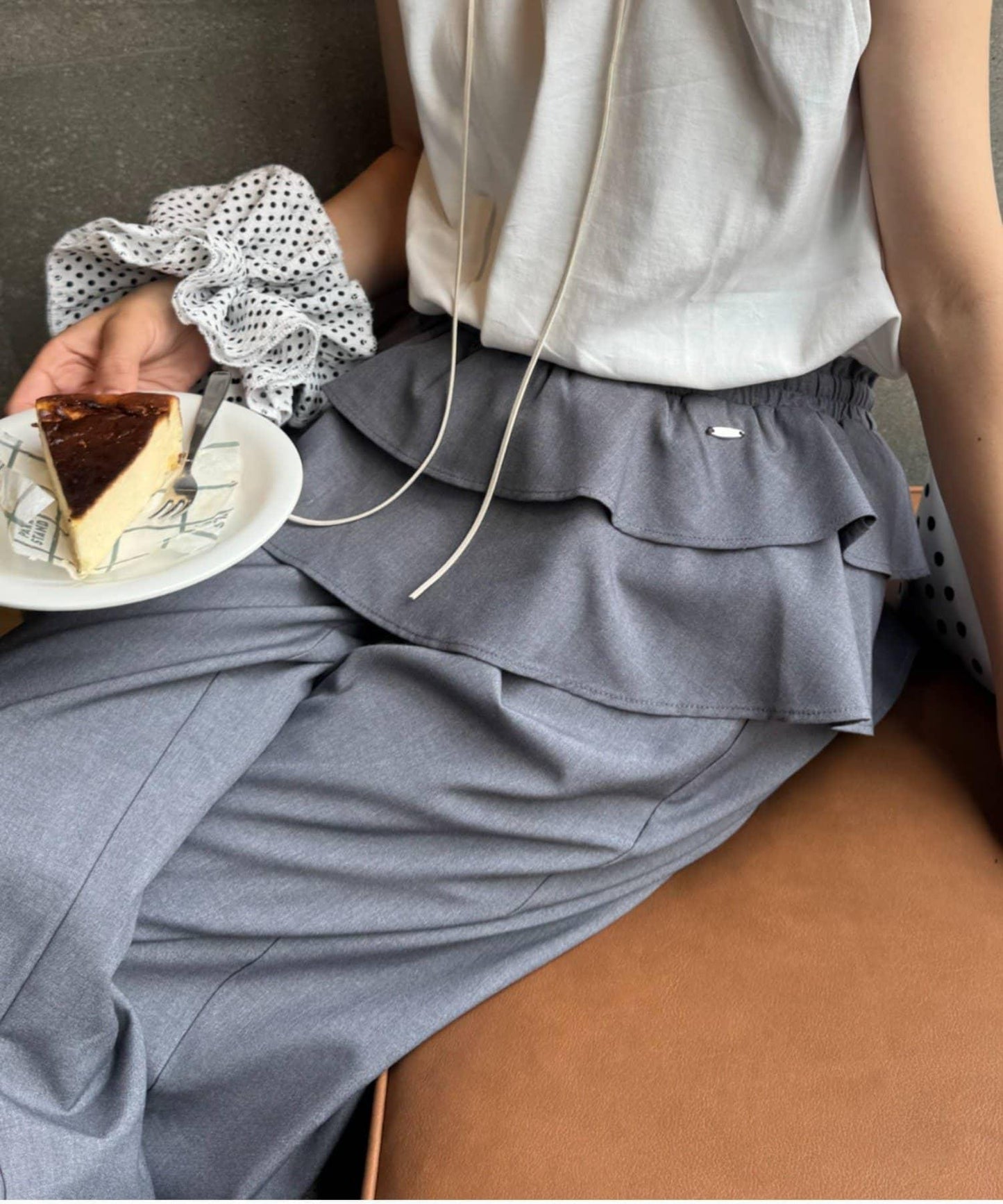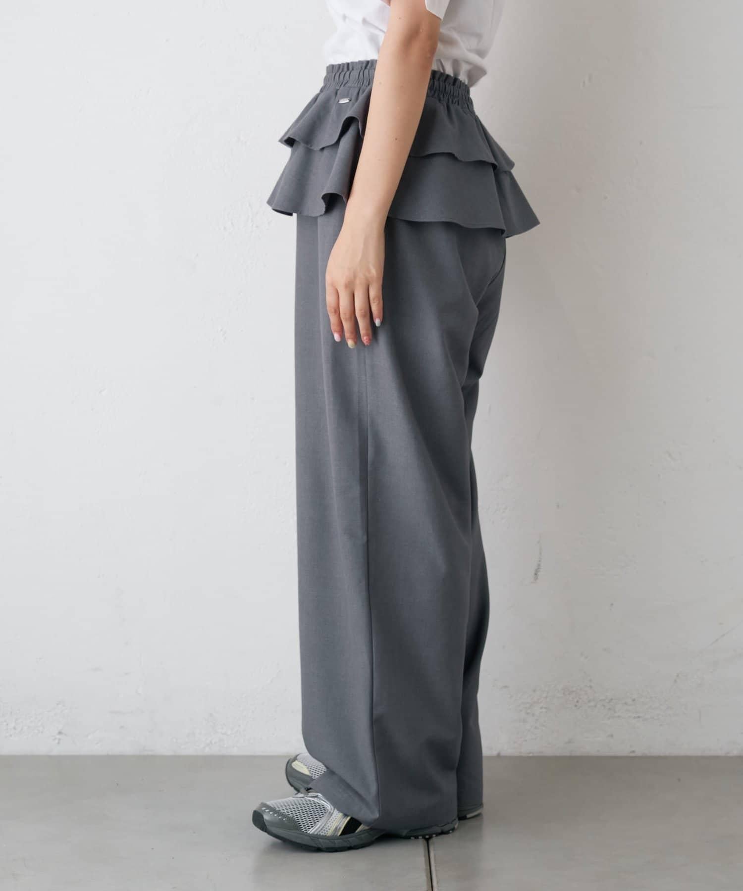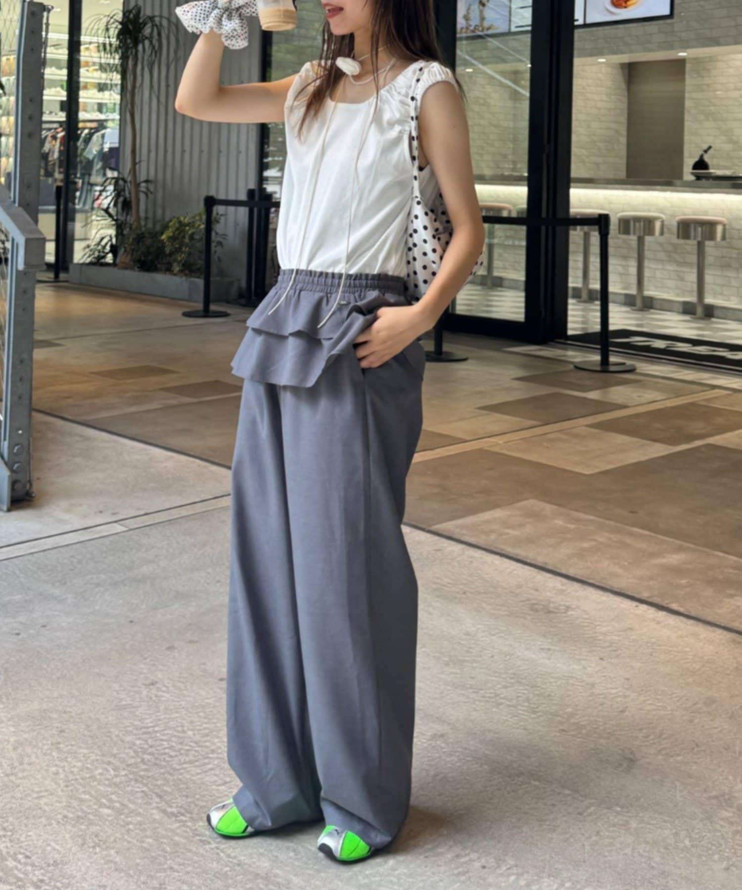 腰部的荷葉邊增加了帥氣的立體效果,成為搭配中的亮點。