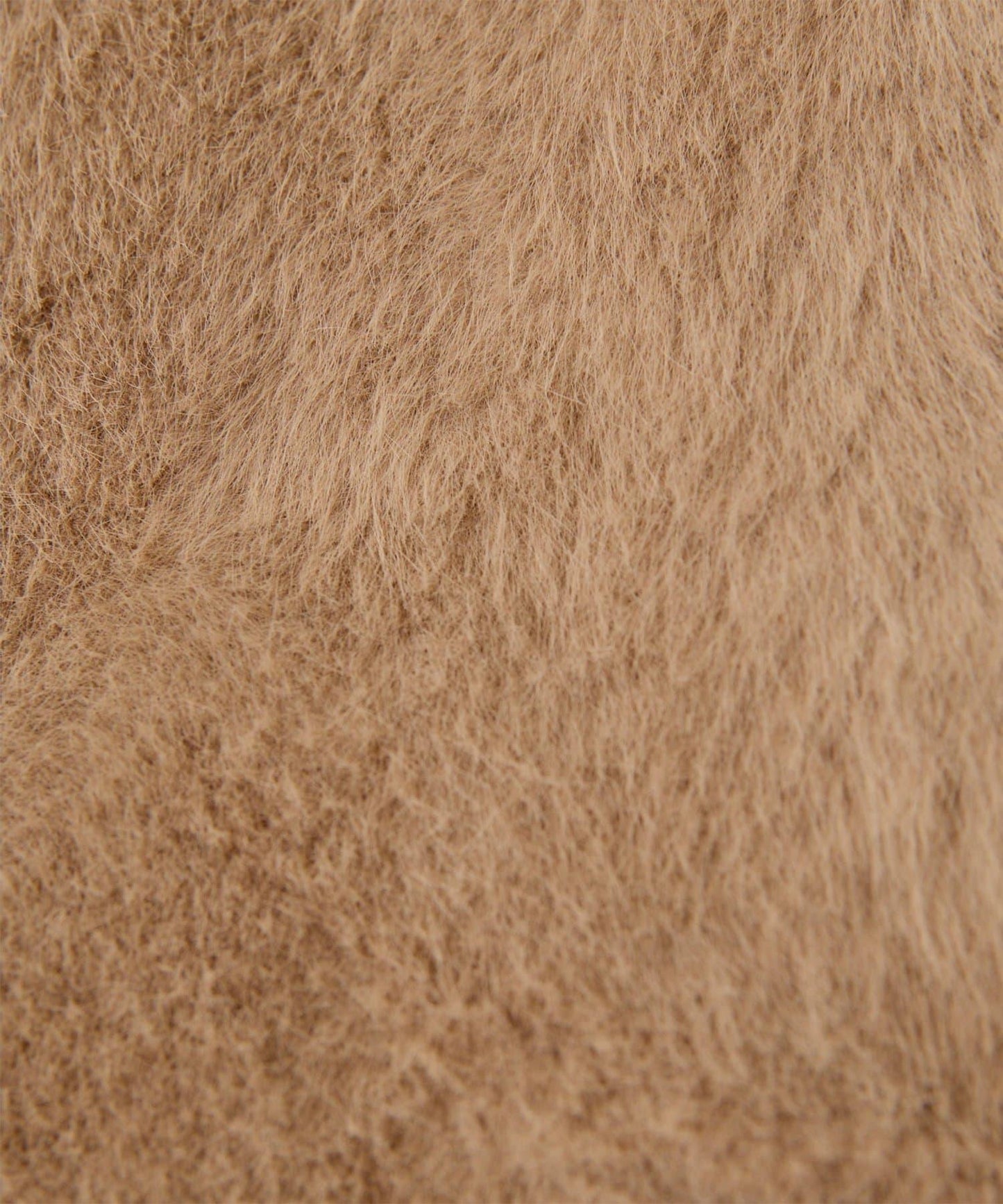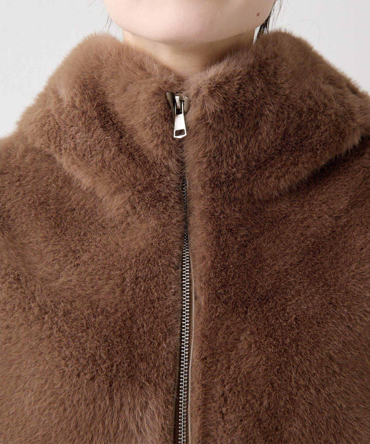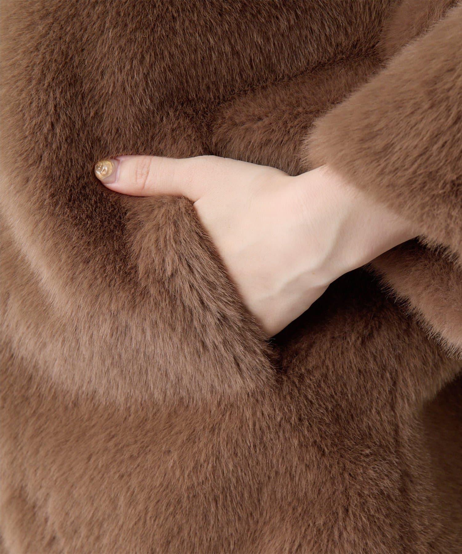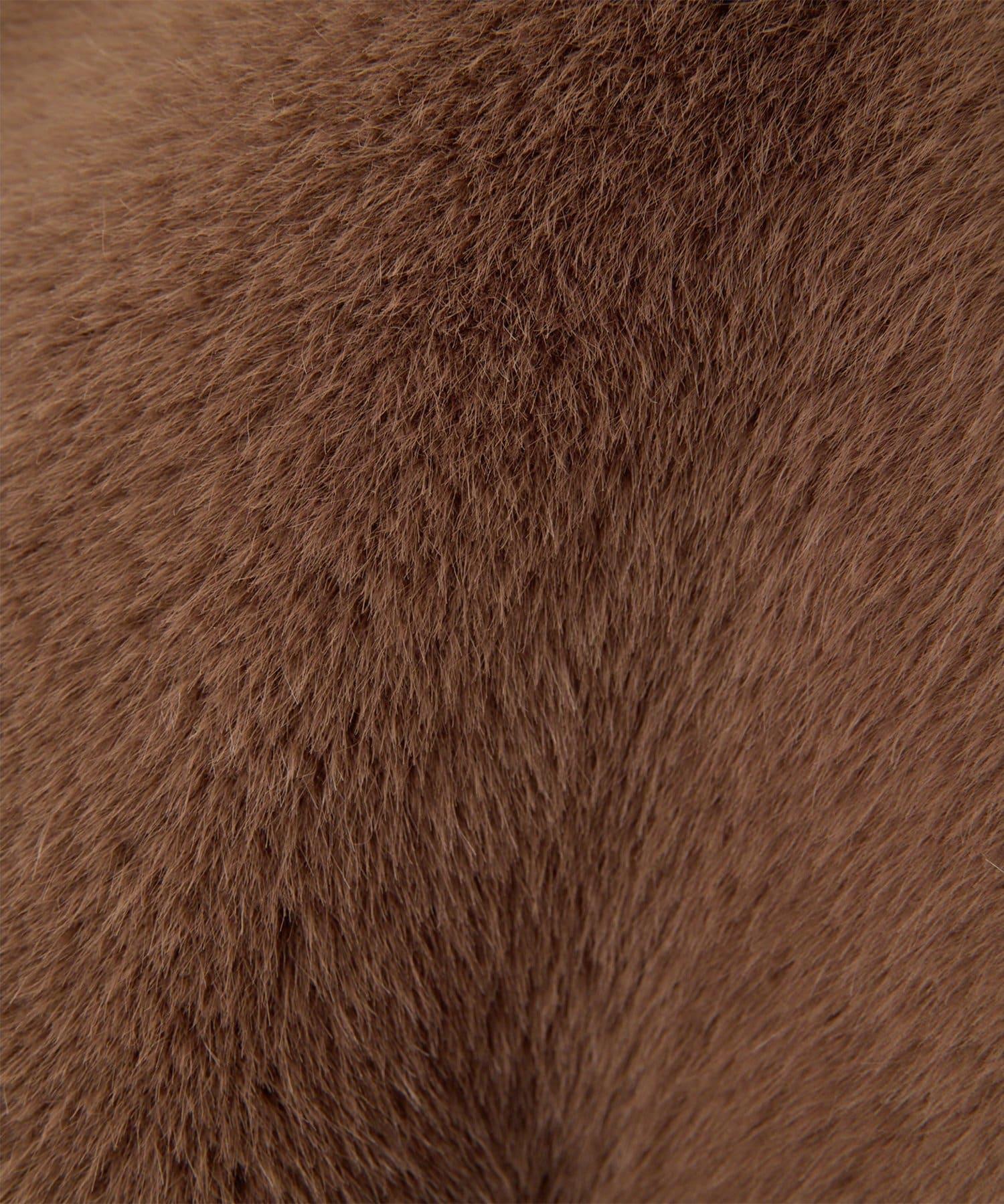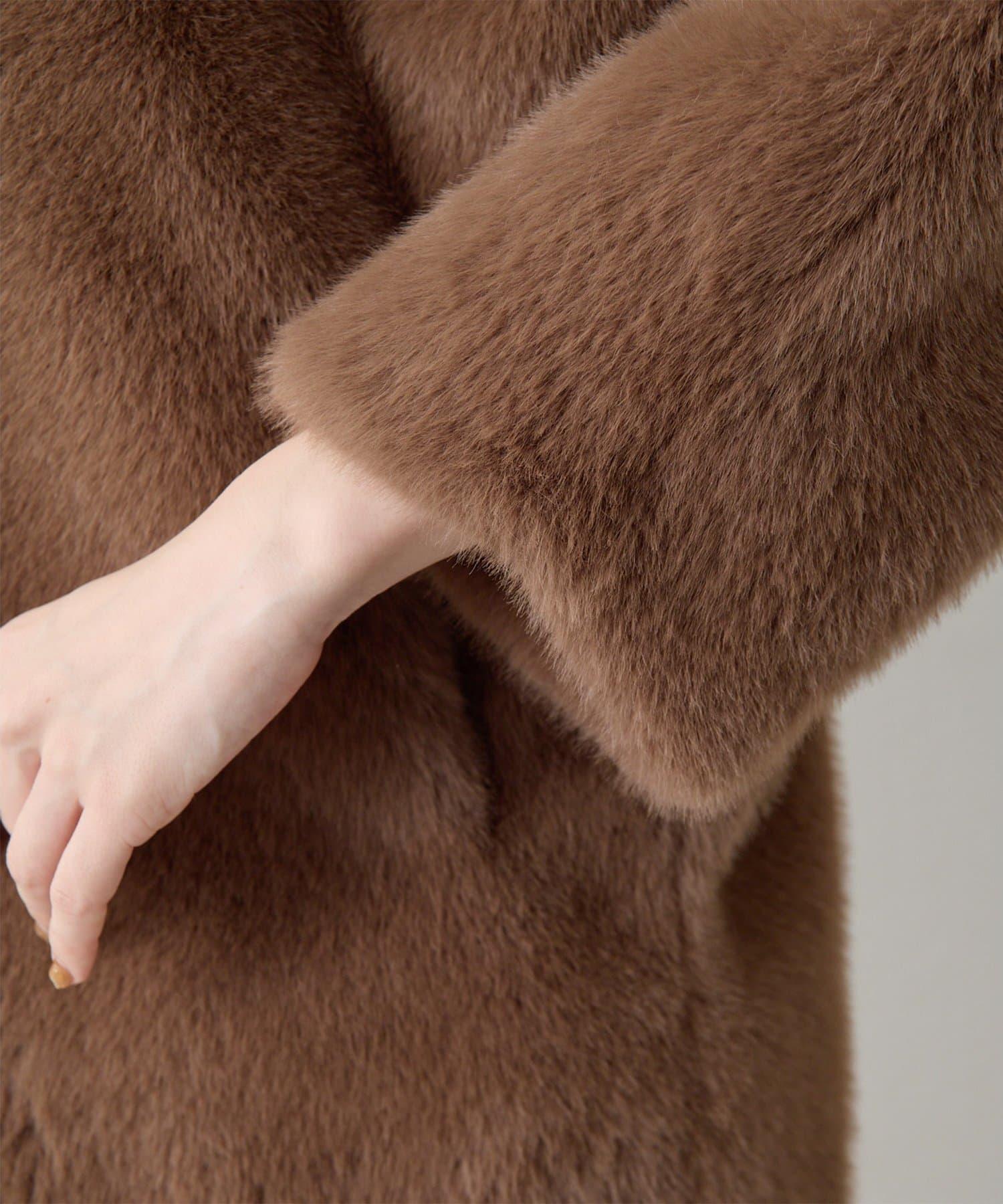 短款大衣由仿貂皮的人造皮草製成,皮草短小而濃密。