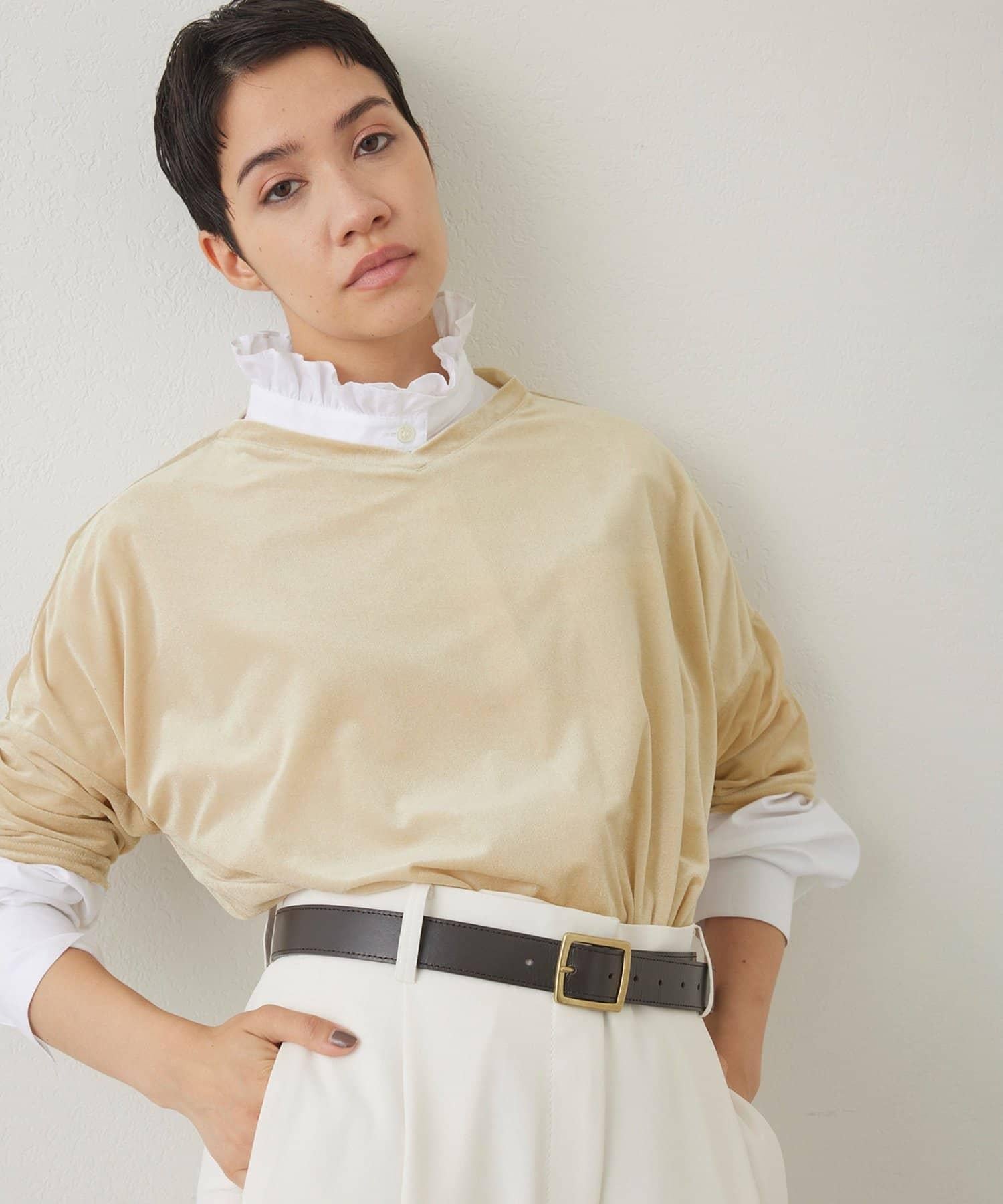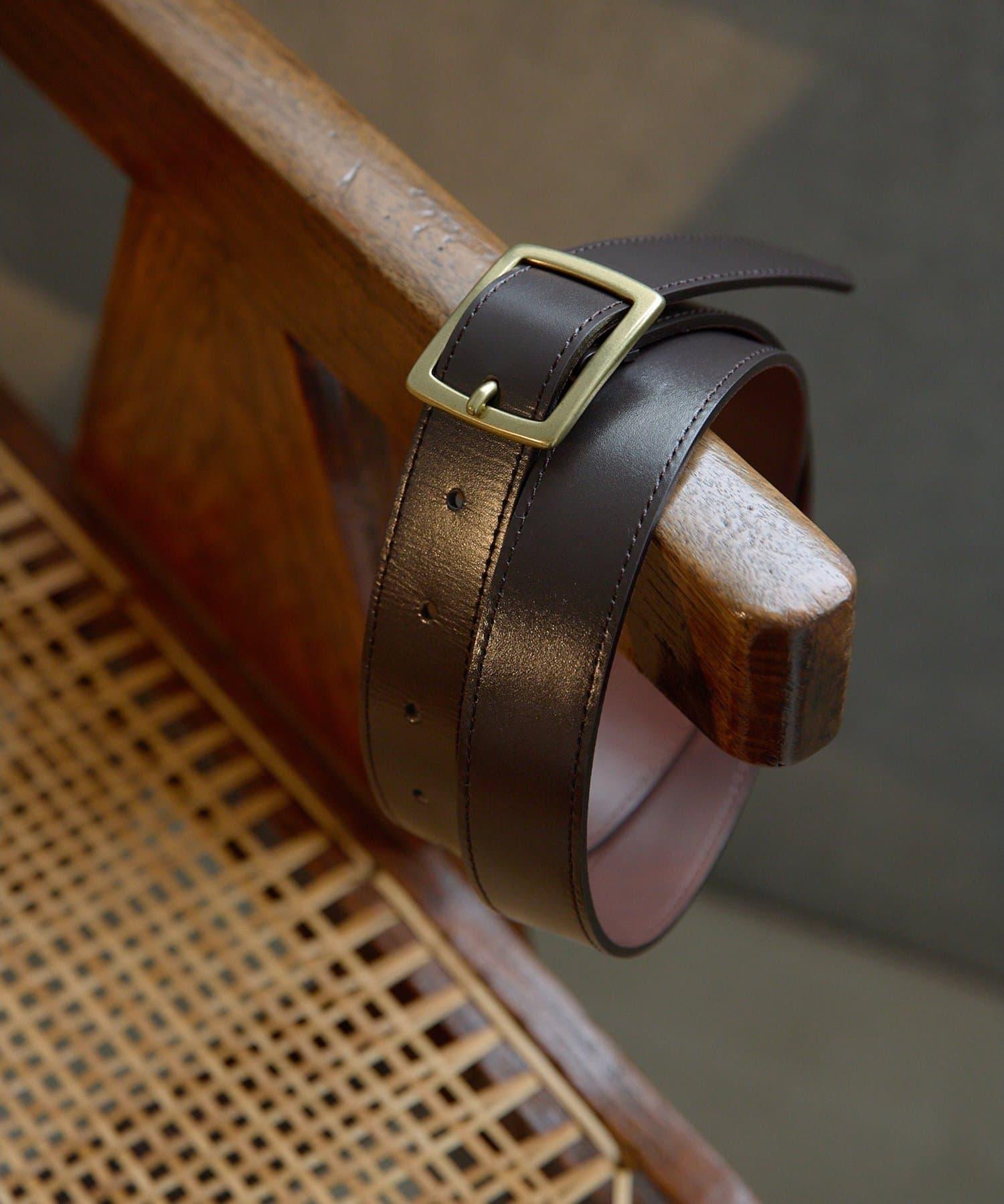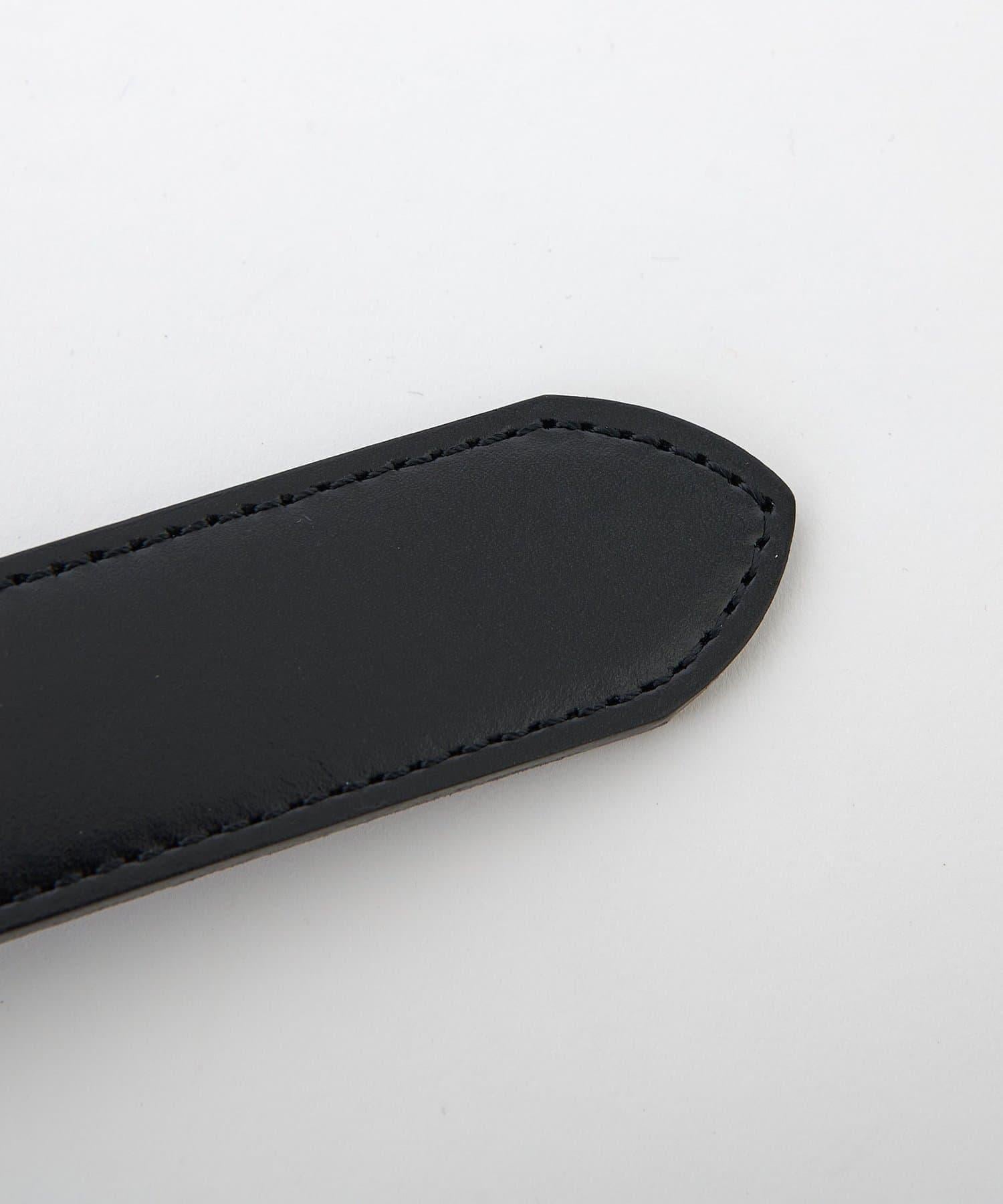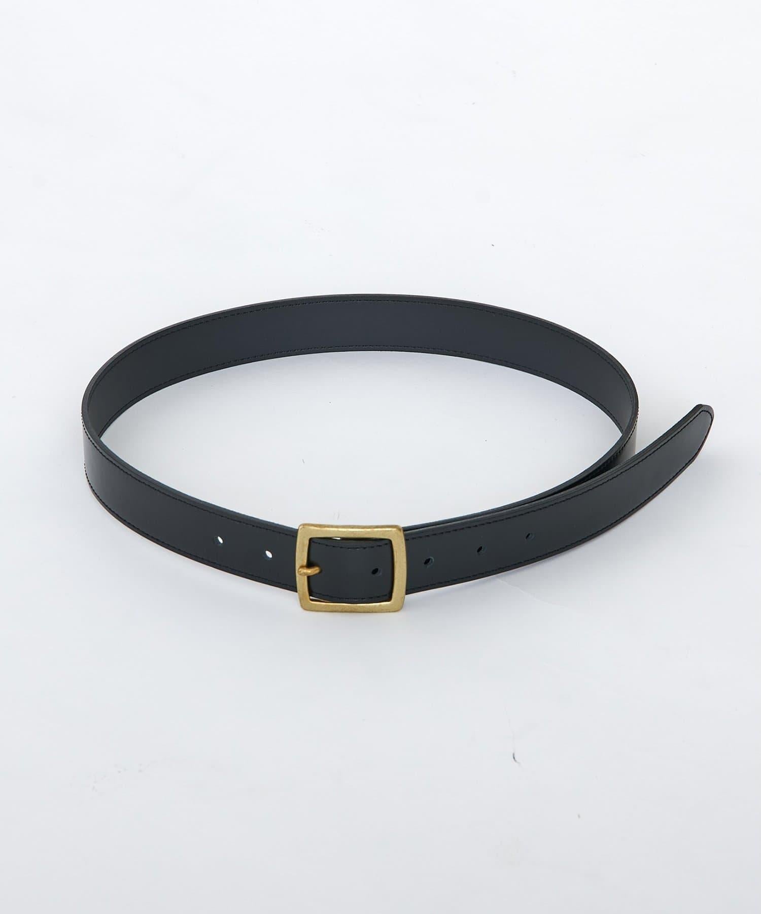 這款真皮腰帶配有方形帶扣,看起來十分利落。