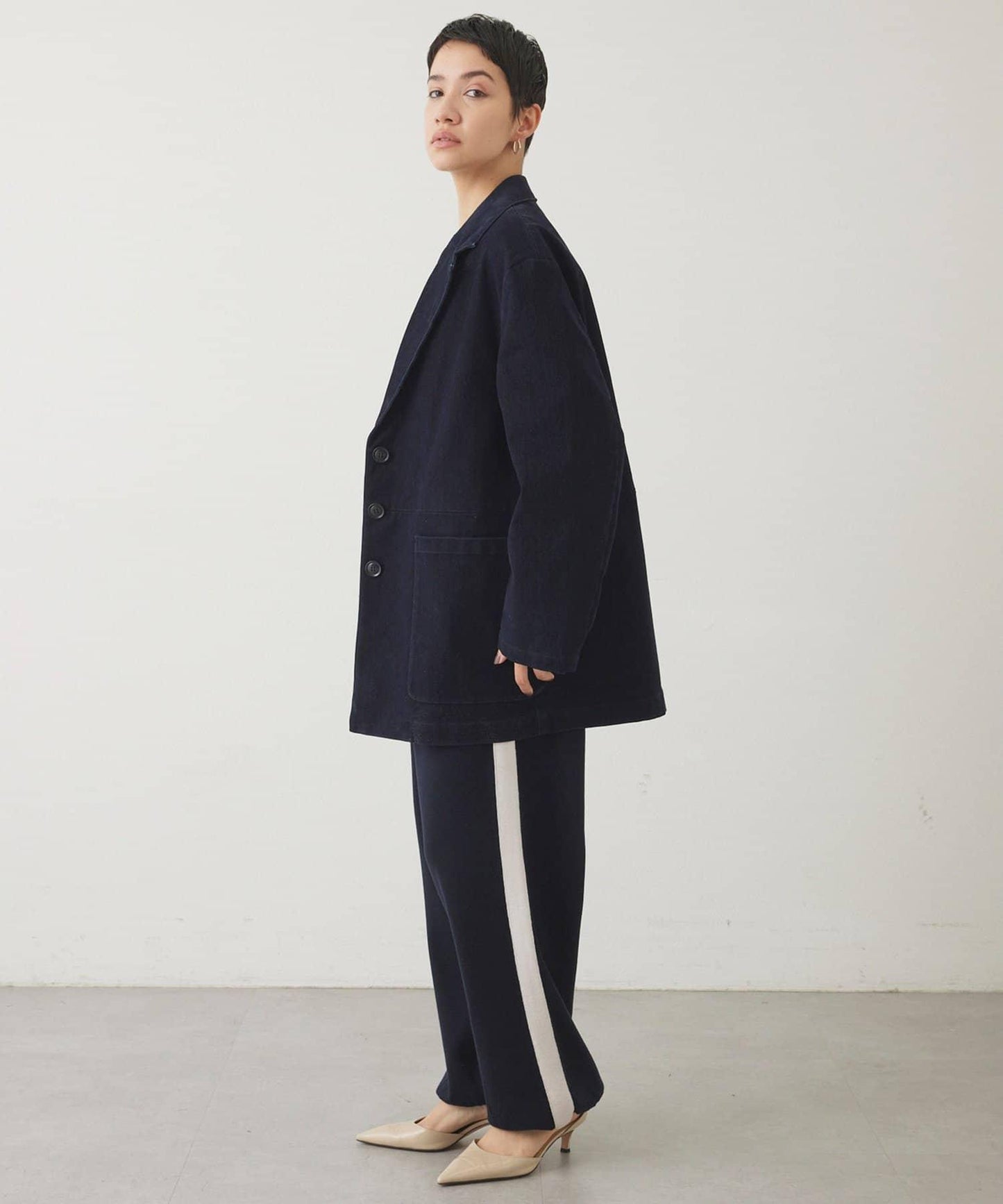 採用方形廓形設計,寬肩設計,盡顯男裝風範。
