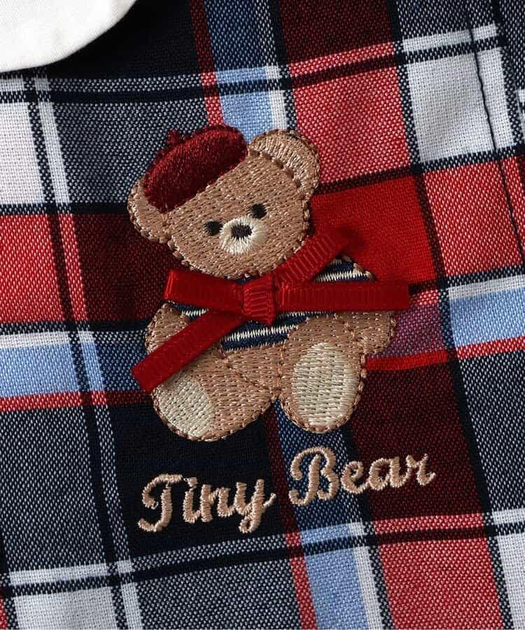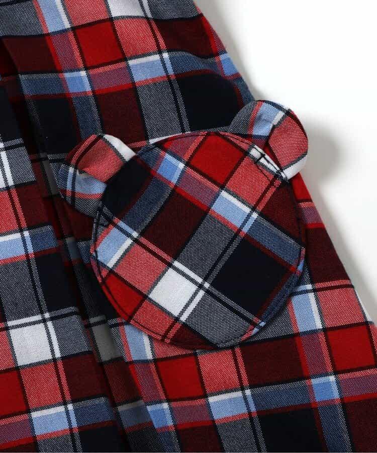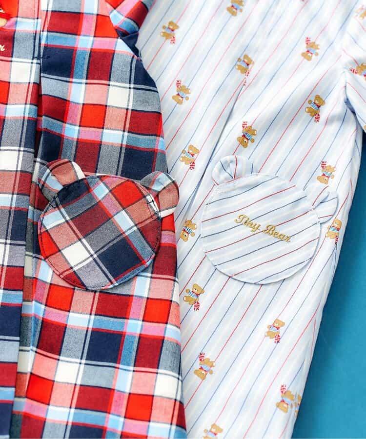 條紋圖案上印有小熊提著箱子出門的圖案,格紋圖案上繡有小熊圖案。