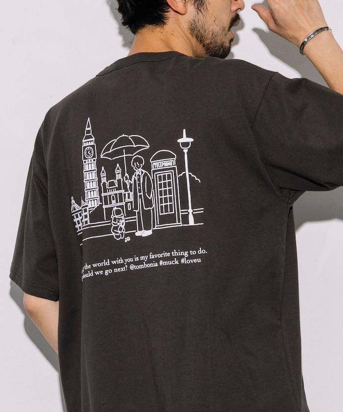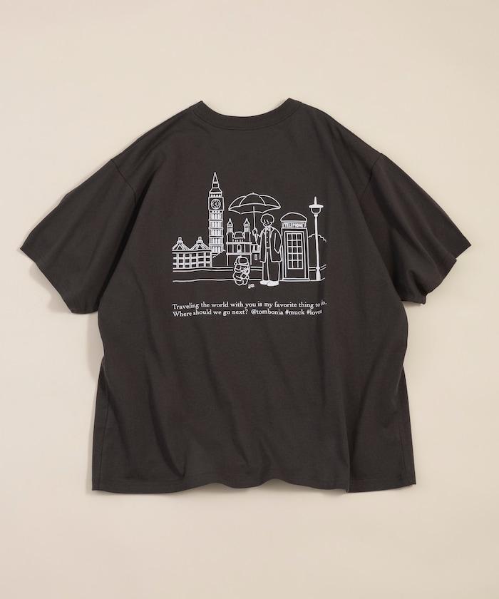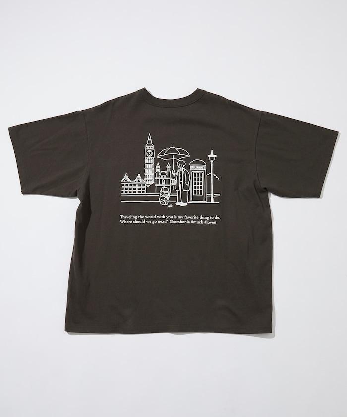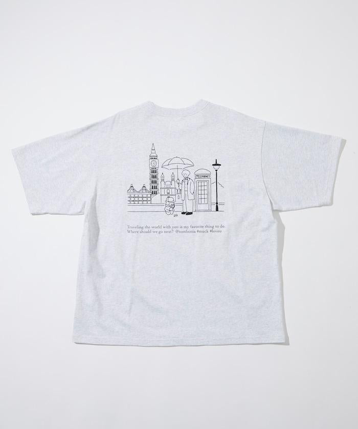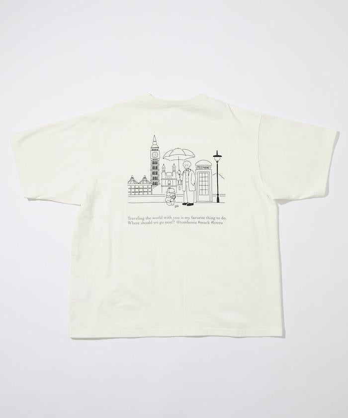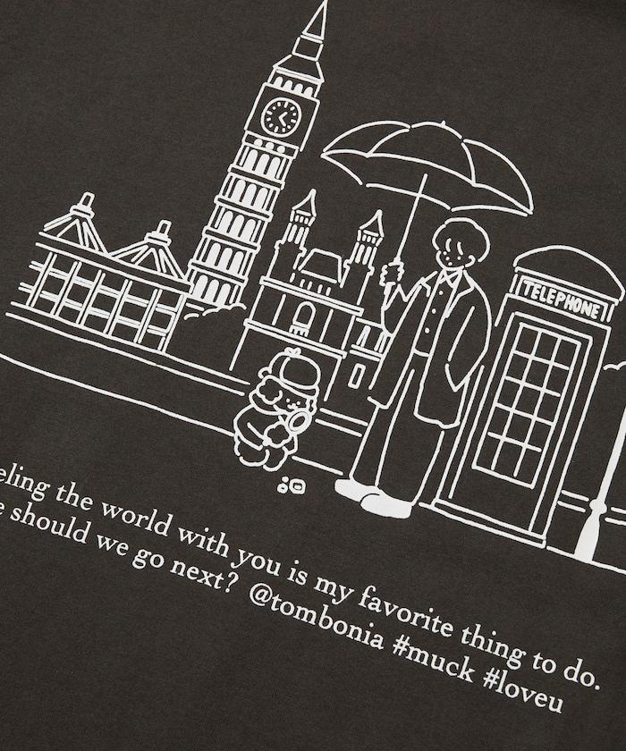 背面印有口袋的 T 恤,描繪了與 tombonia 的標誌性玩具貴賓犬 MUCK 一起去倫敦旅行的情景。