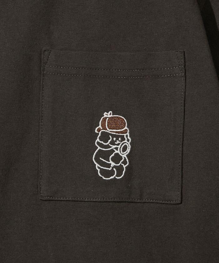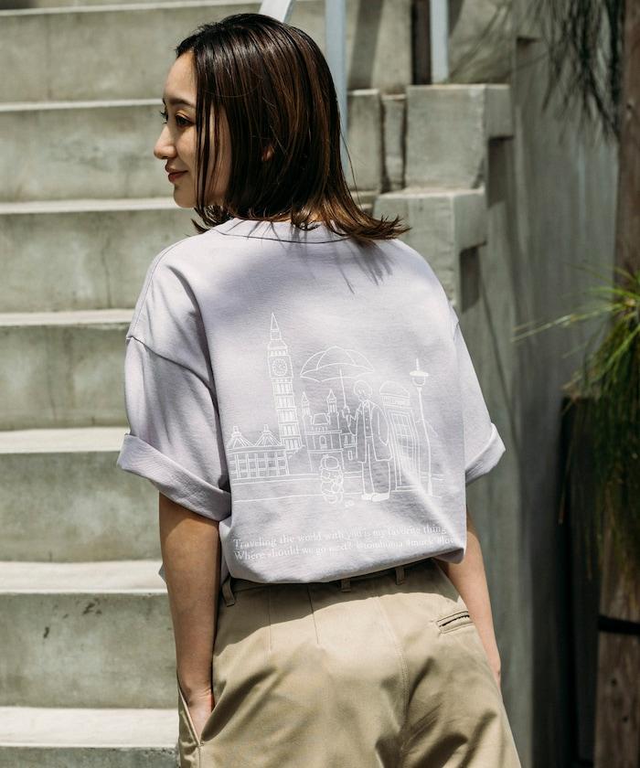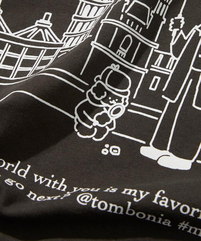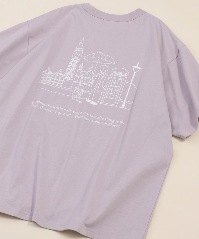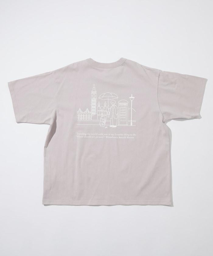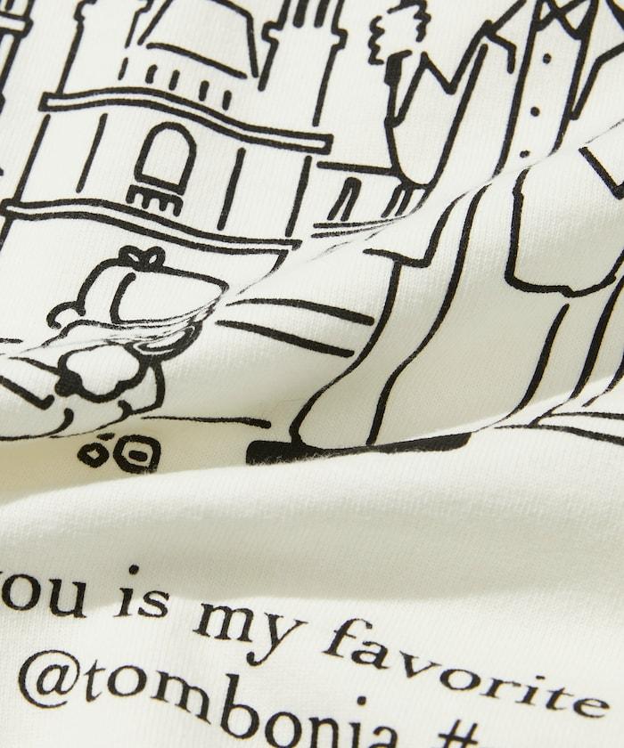 背面印有口袋的 T 恤,描繪了與 tombonia 的標誌性玩具貴賓犬 MUCK 一起去倫敦旅行的情景。