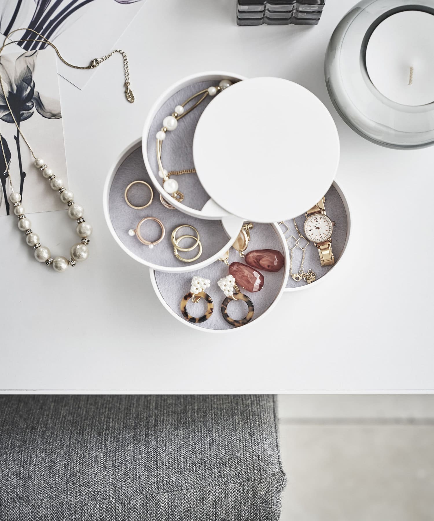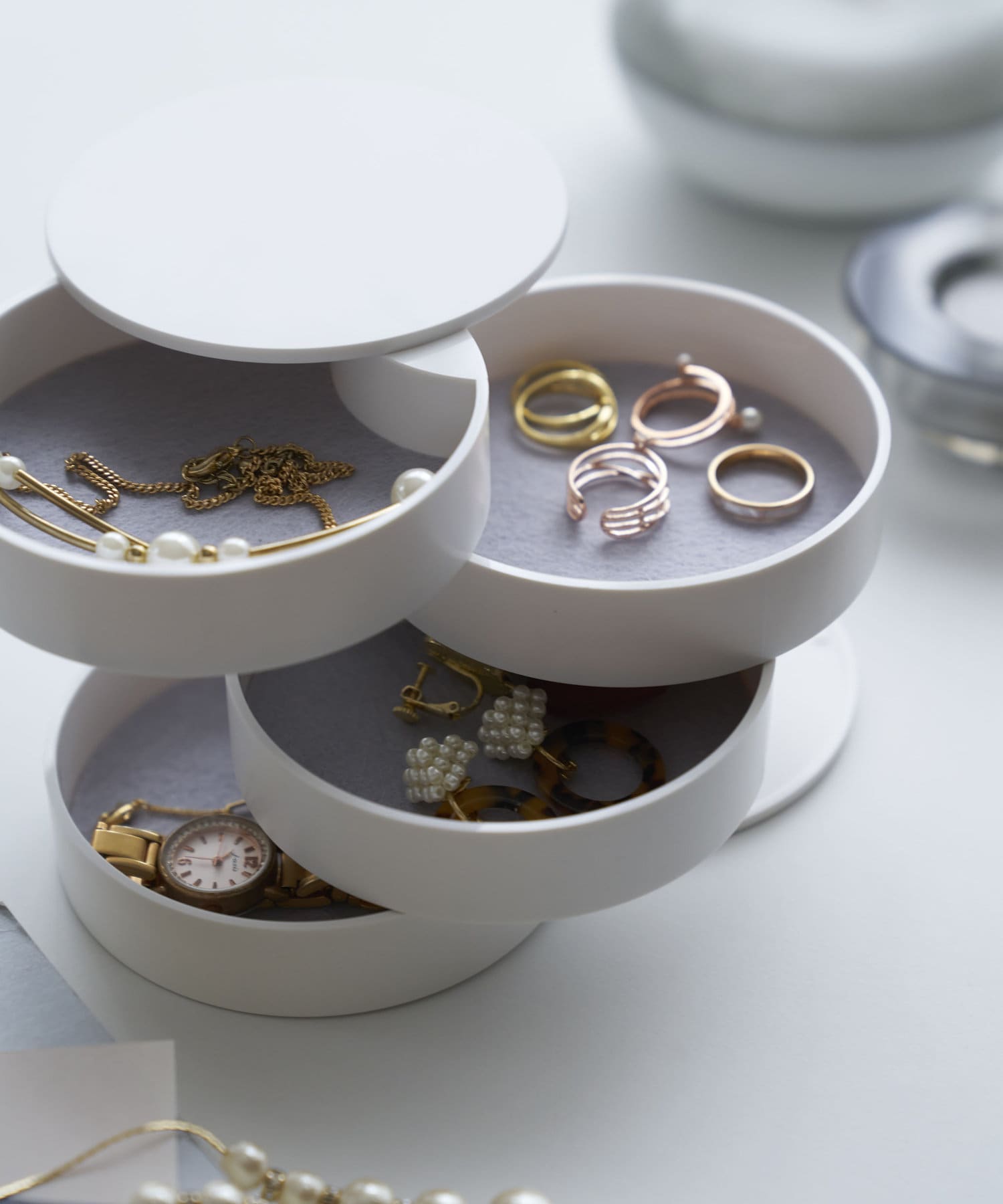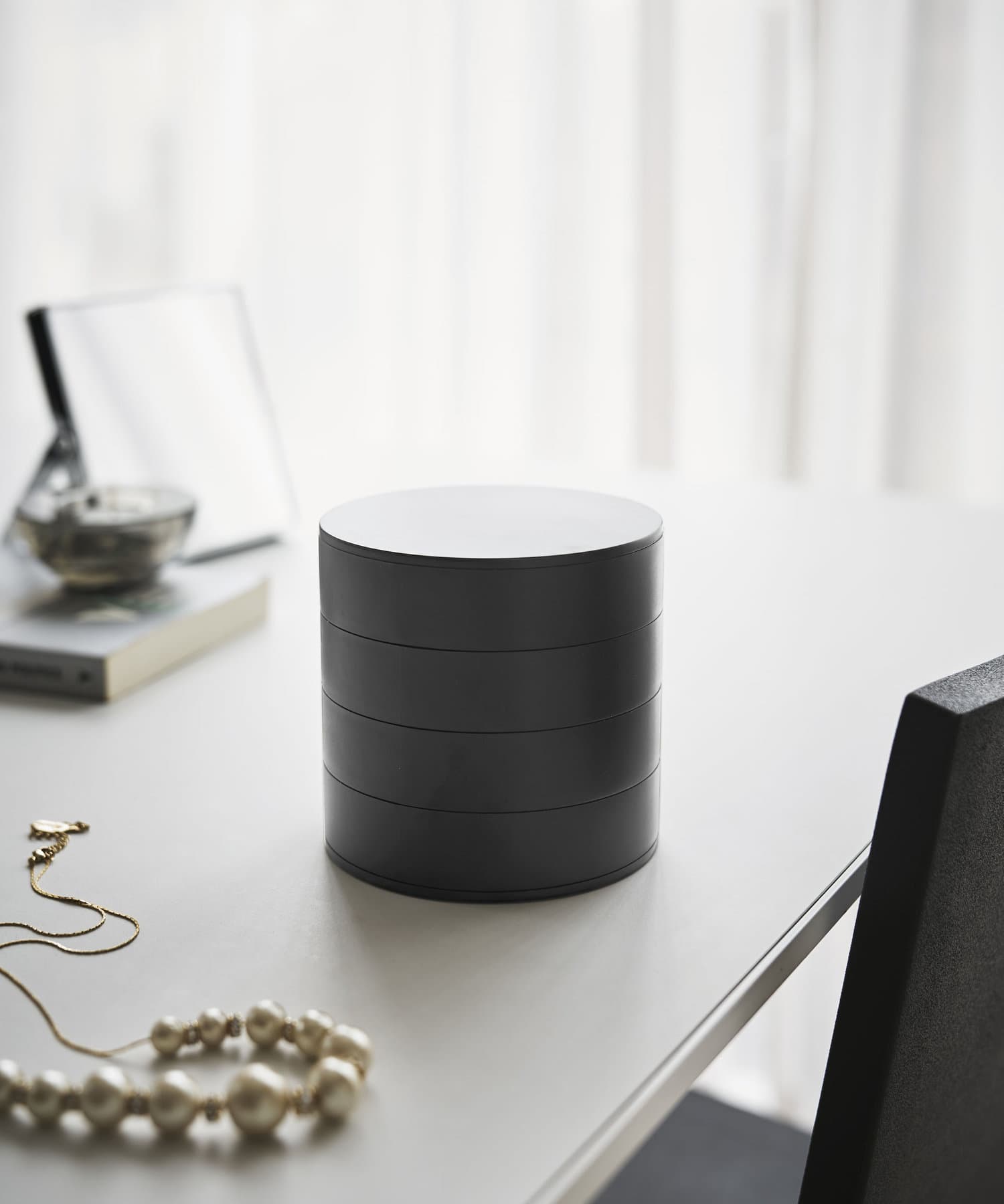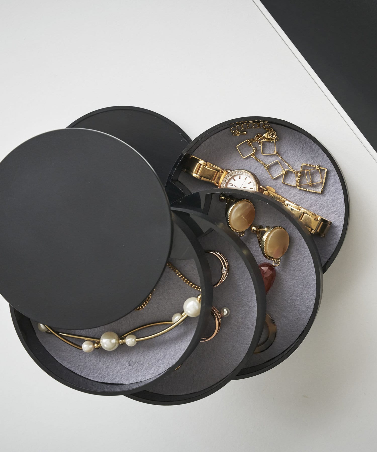 不使用時,托盤可以堆疊起來,使之緊湊。它有一個氈墊,可以防止損壞珠寶,是存放珠寶、化妝品、手錶和其他你每天佩戴的小物品的理想選擇。