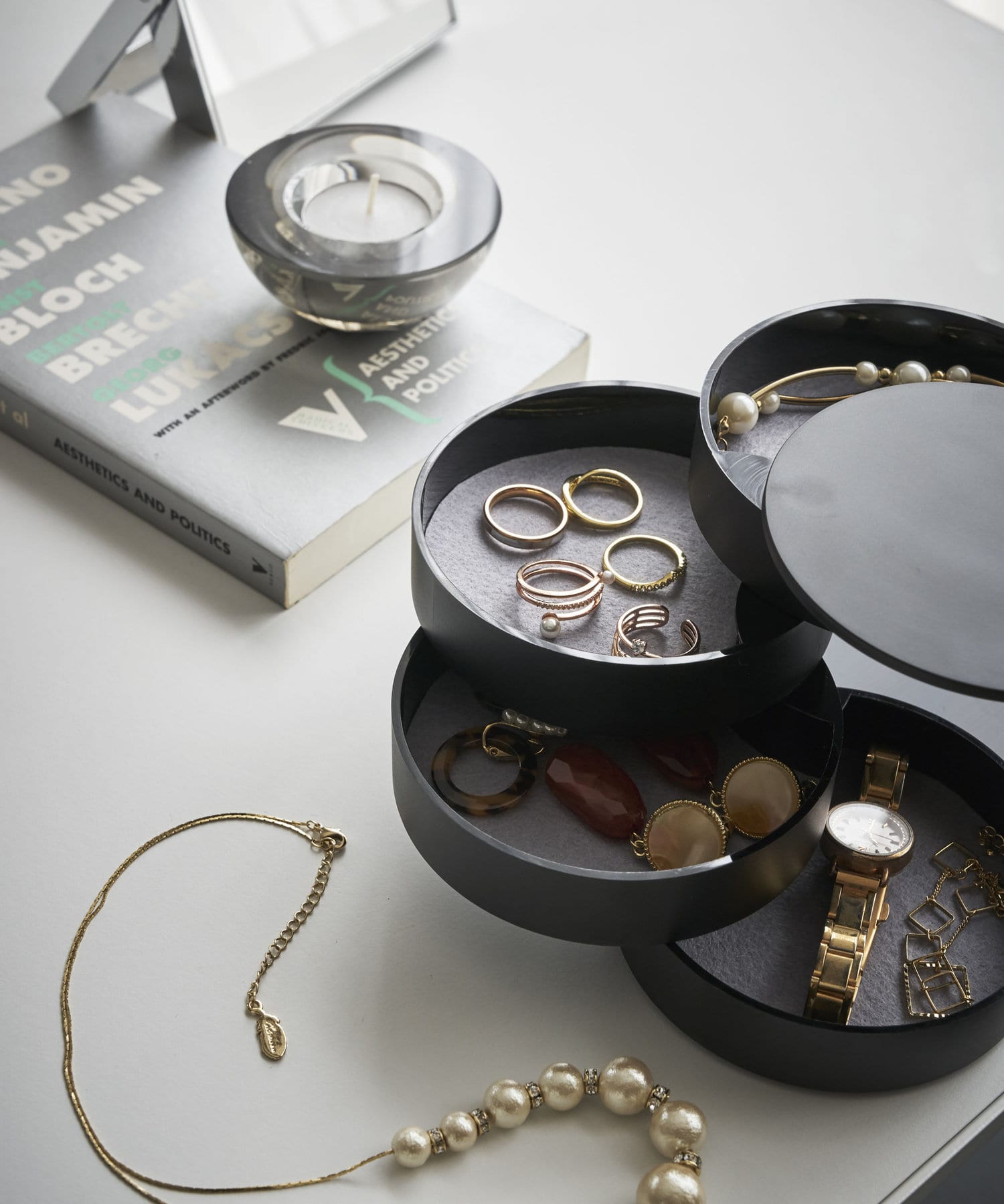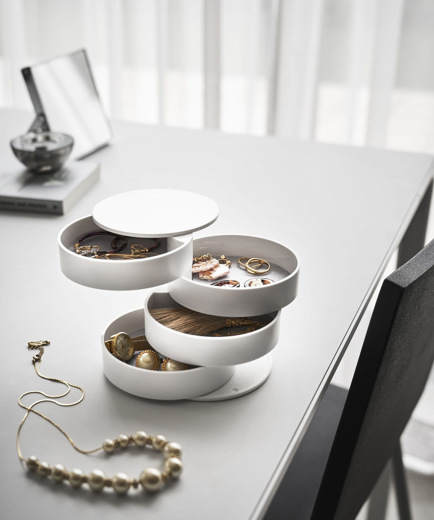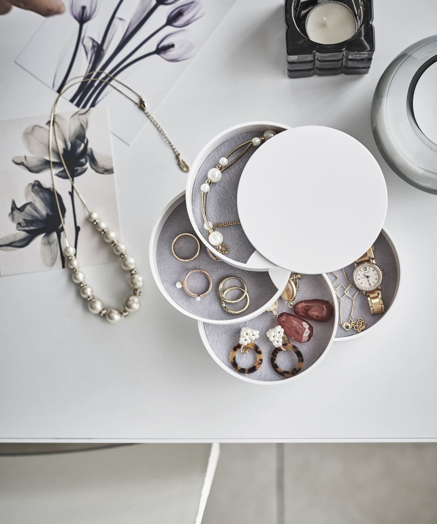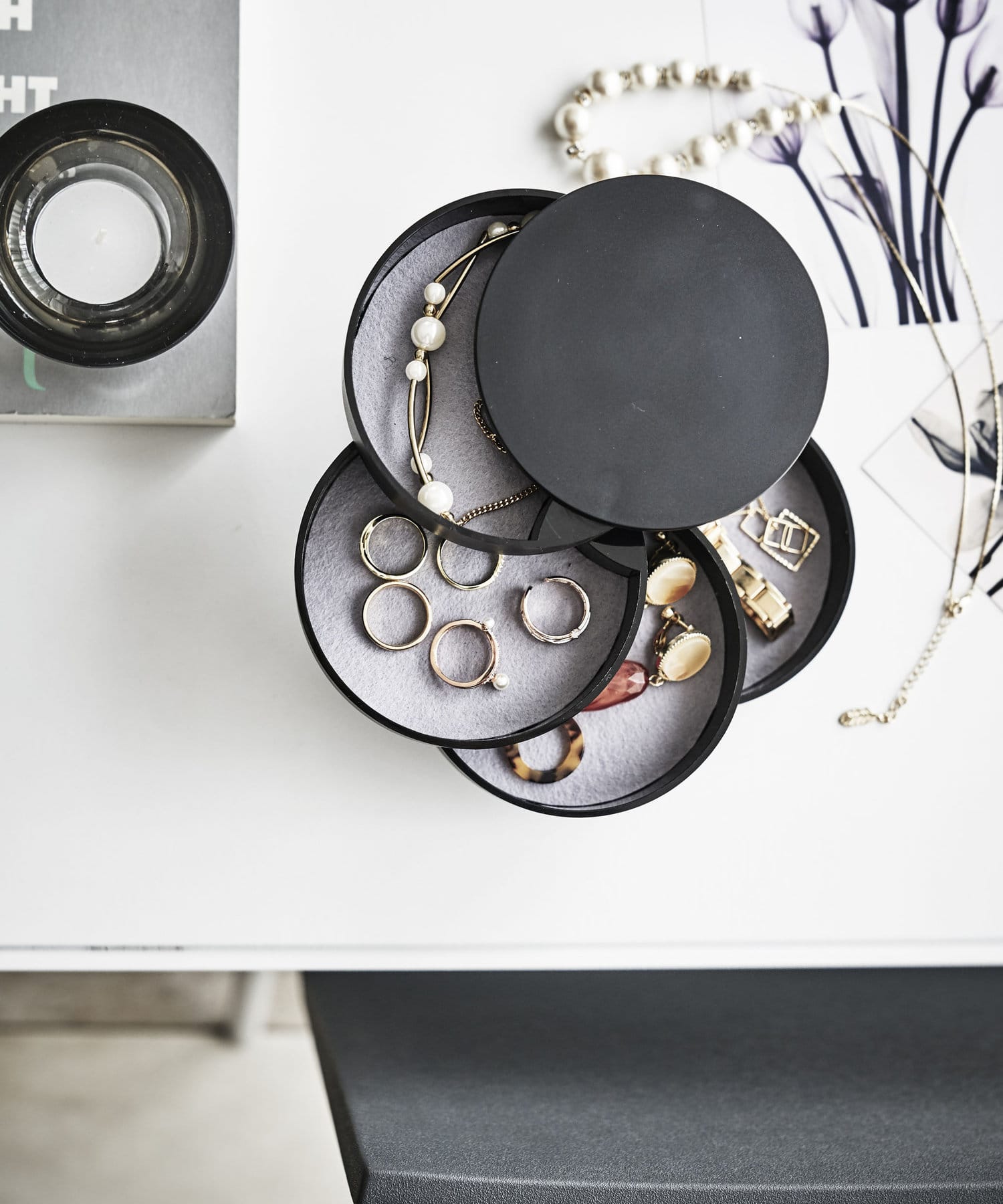 不使用時,托盤可以堆疊起來,使之緊湊。它有一個氈墊,可以防止損壞珠寶,是存放珠寶、化妝品、手錶和其他你每天佩戴的小物品的理想選擇。