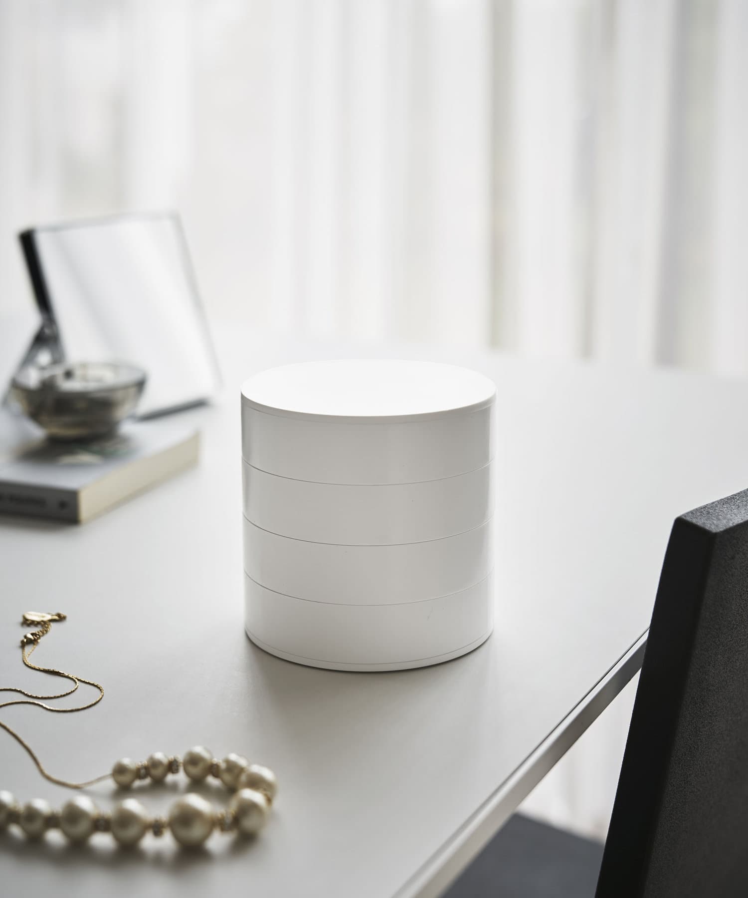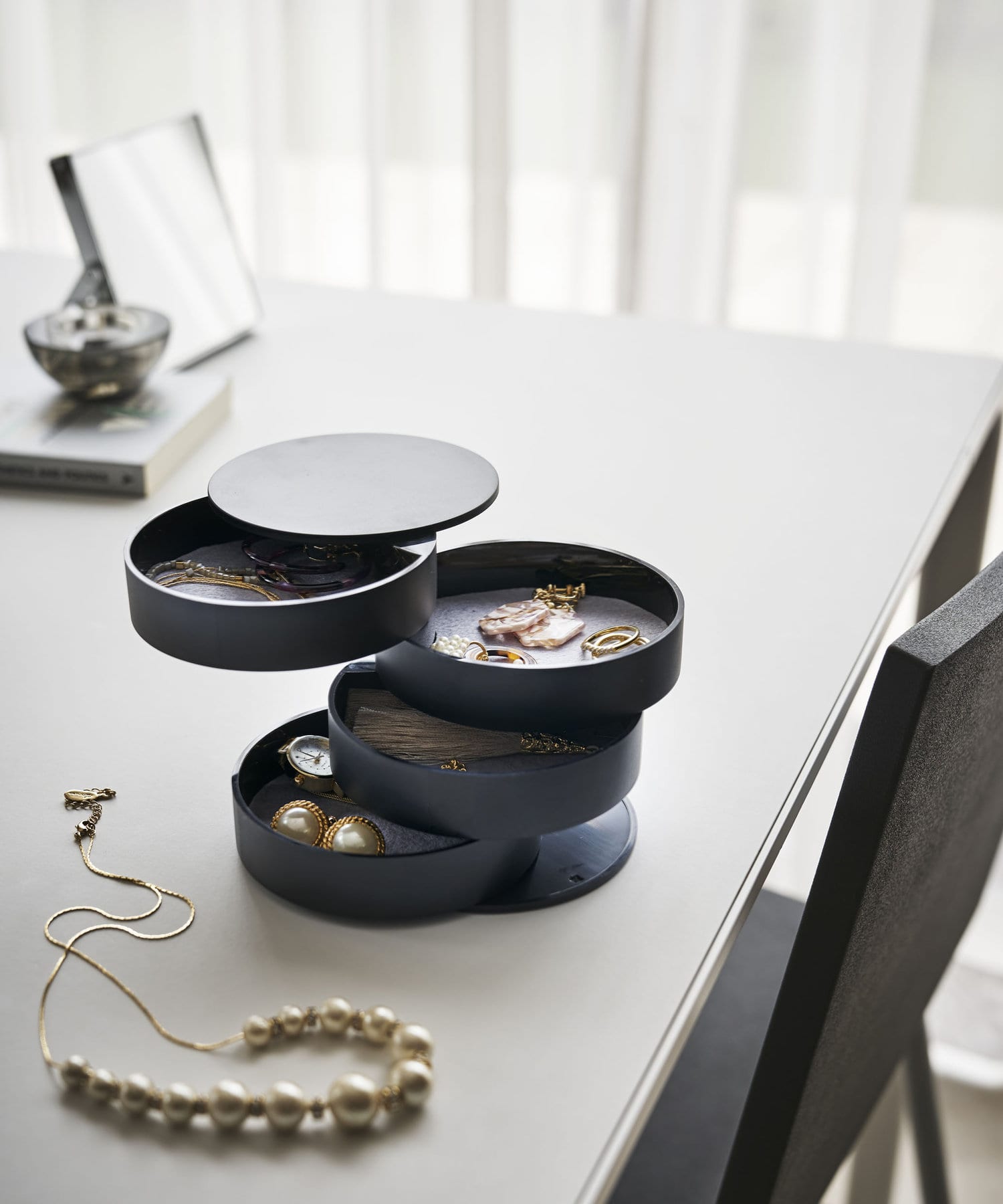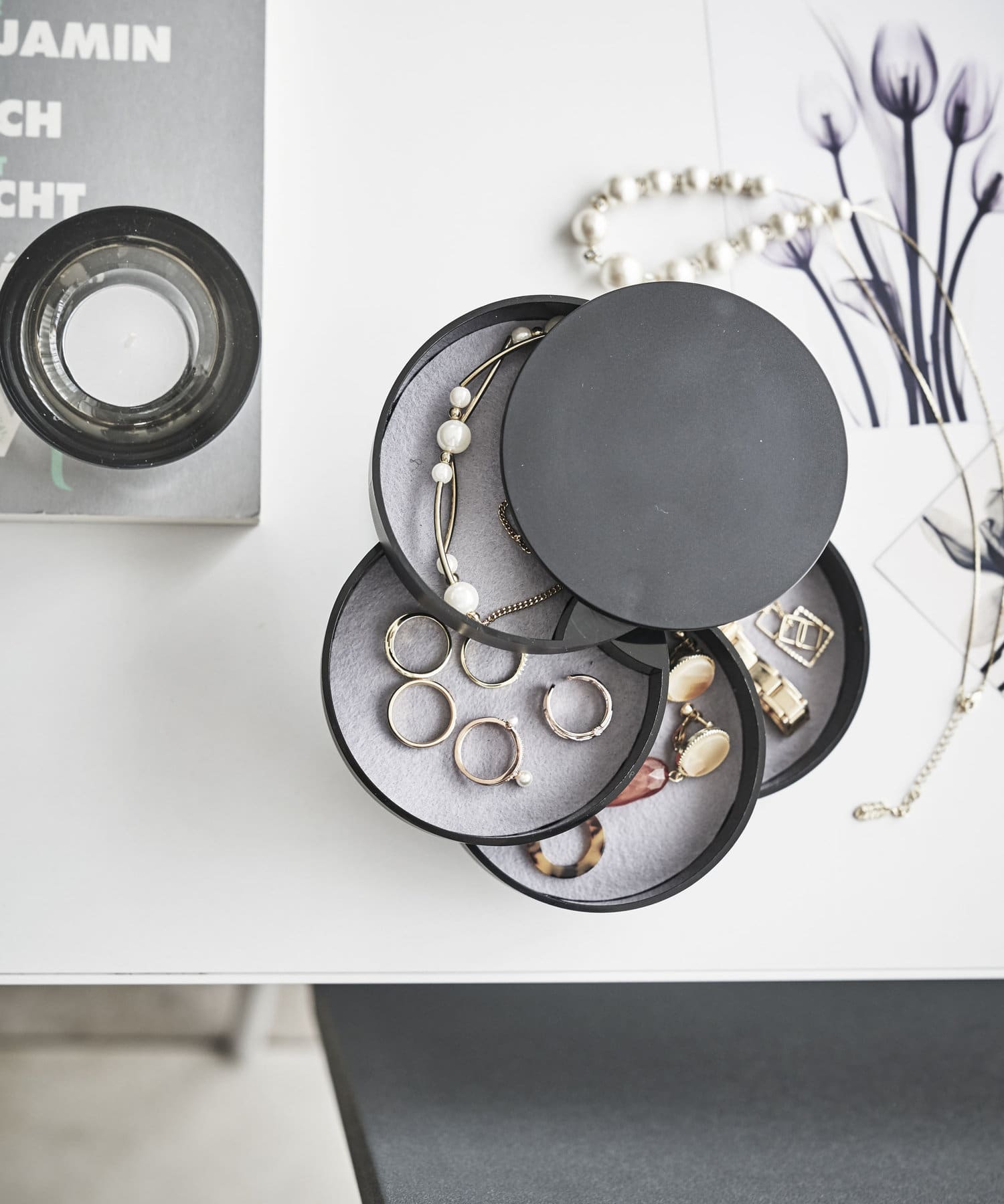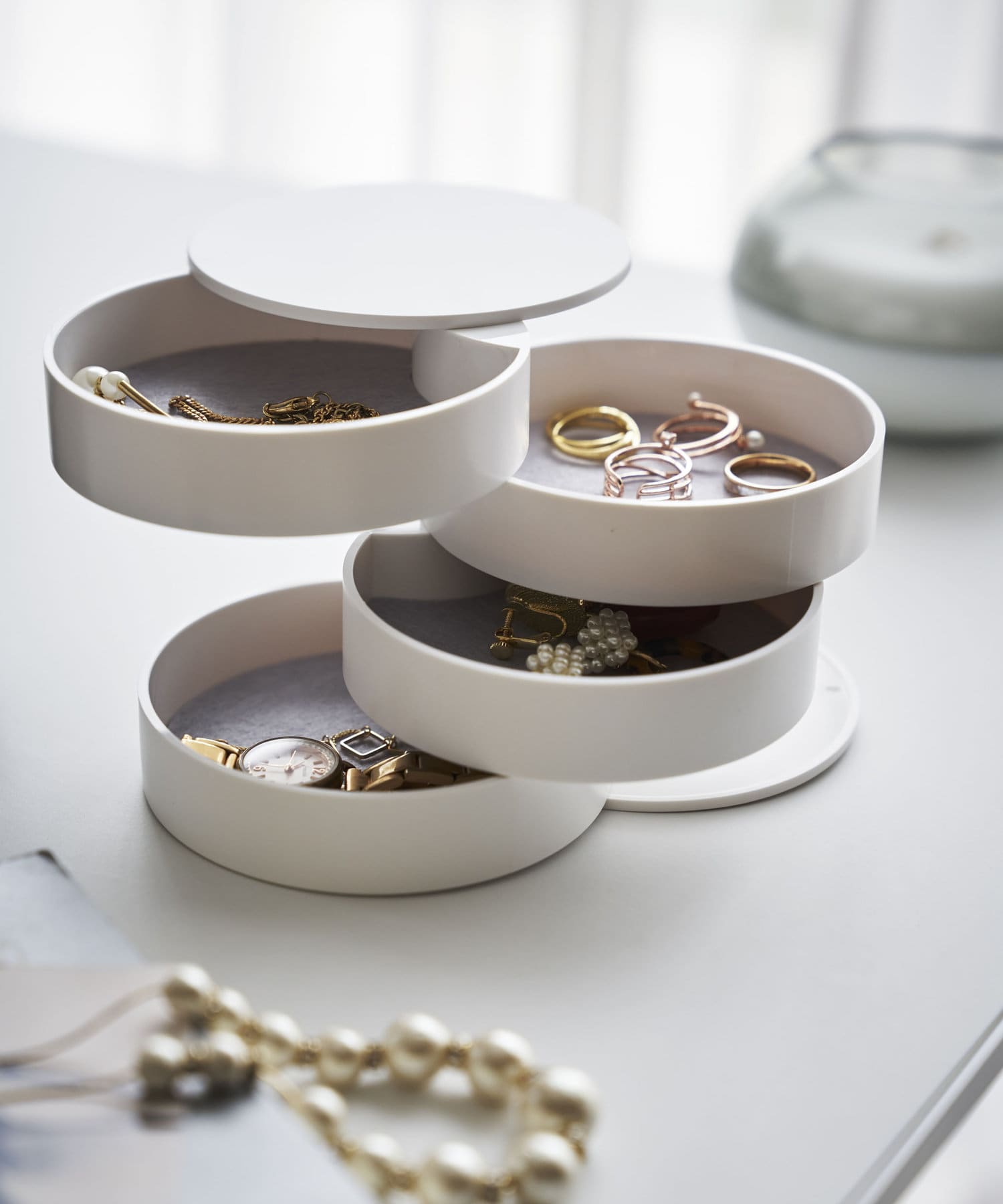 不使用時,托盤可以堆疊起來,使之緊湊。它有一個氈墊,可以防止損壞珠寶,是存放珠寶、化妝品、手錶和其他你每天佩戴的小物品的理想選擇。