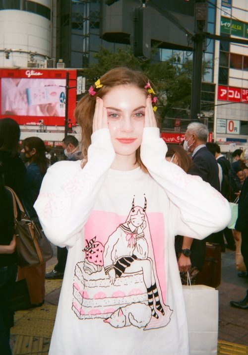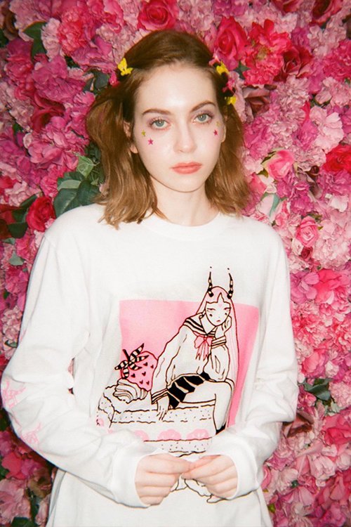 正面的主要圖案是一個酥餅、一個女孩和一隻熟睡的貓。兩隻袖子上印有配套的草莓圖案。