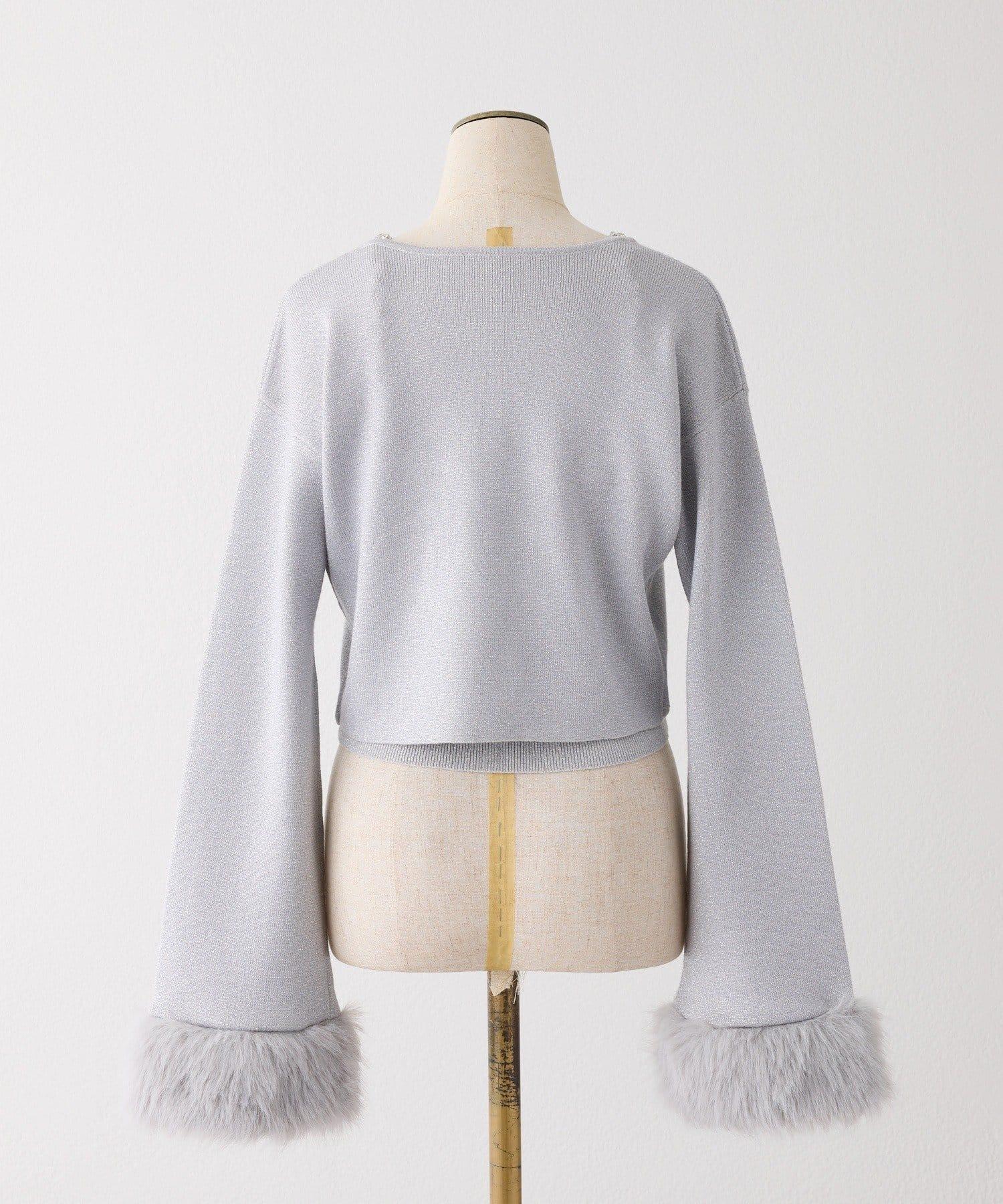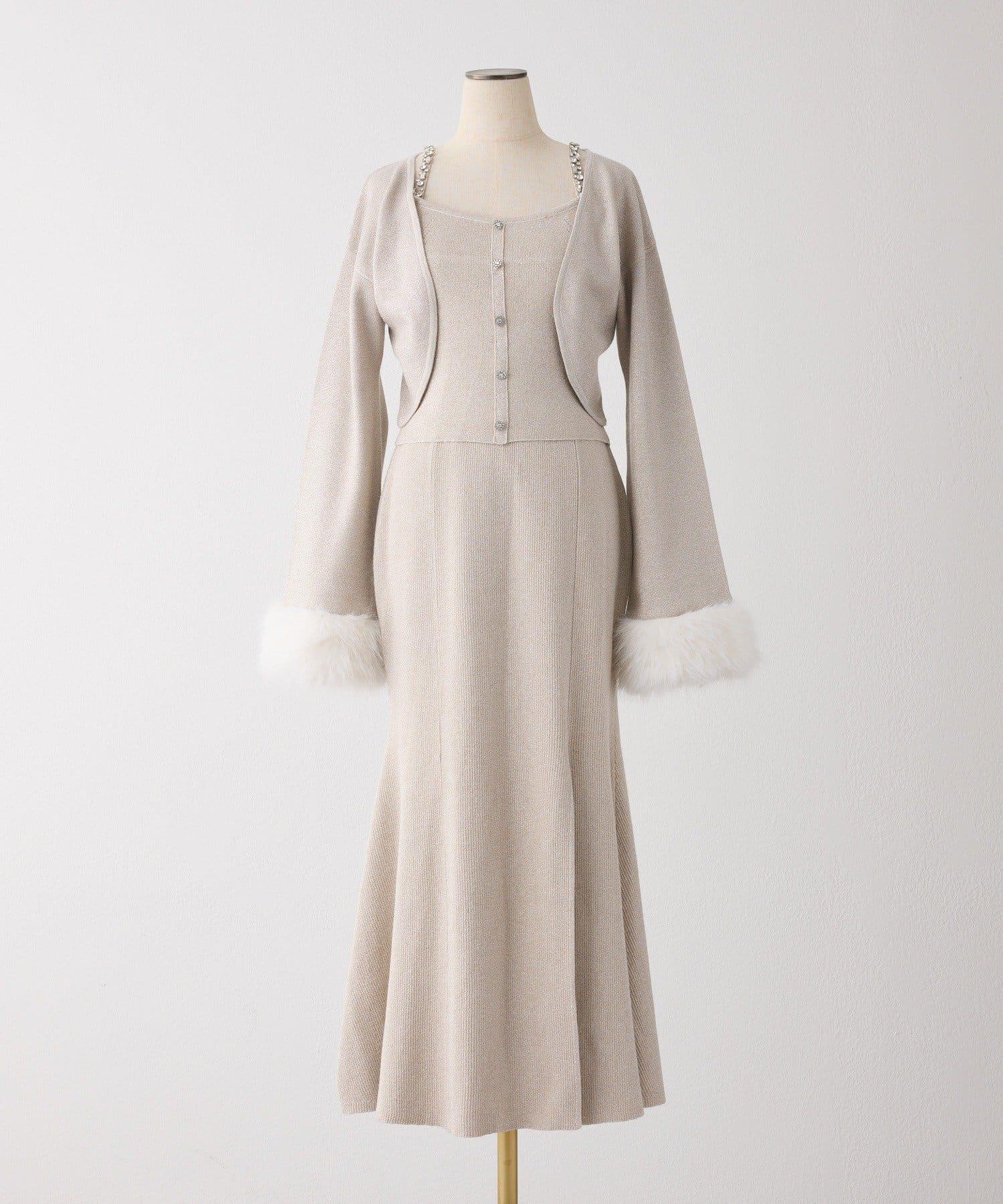 這款華麗的單品包括一件肩部飾有閃亮珠寶的針織吊帶衫和一件袖口飾有蓬鬆皮草的長筒連衣裙。