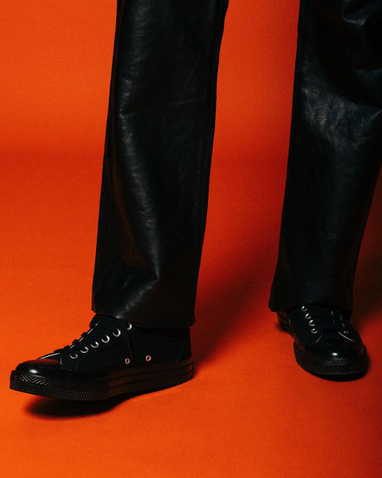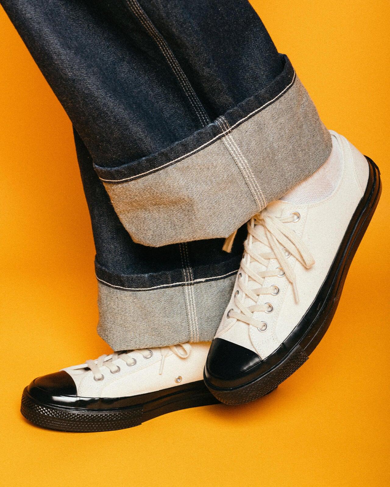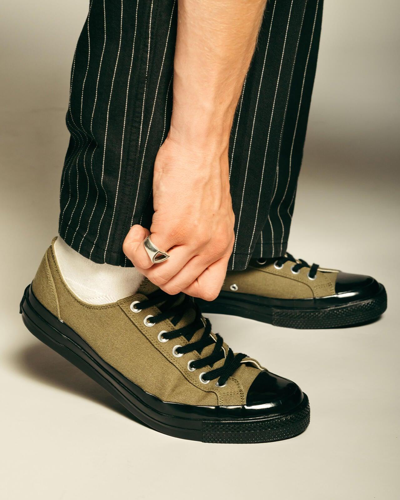 這是一雙全新的標準帆布鞋,由標準棉帆布製成,並配有外置毽子。它既有粗獷的氣息,又有輕鬆的感覺,還有經典的服飾元素。耗時長久的硫化工藝確保了出色的耐用性和柔軟度。這是一種罕見的製造方法,至今仍保留著能工巧匠的手工技藝。鞋底前部裝飾有獨創的花紋設計,既能提供抓地力,又能彰顯個性。