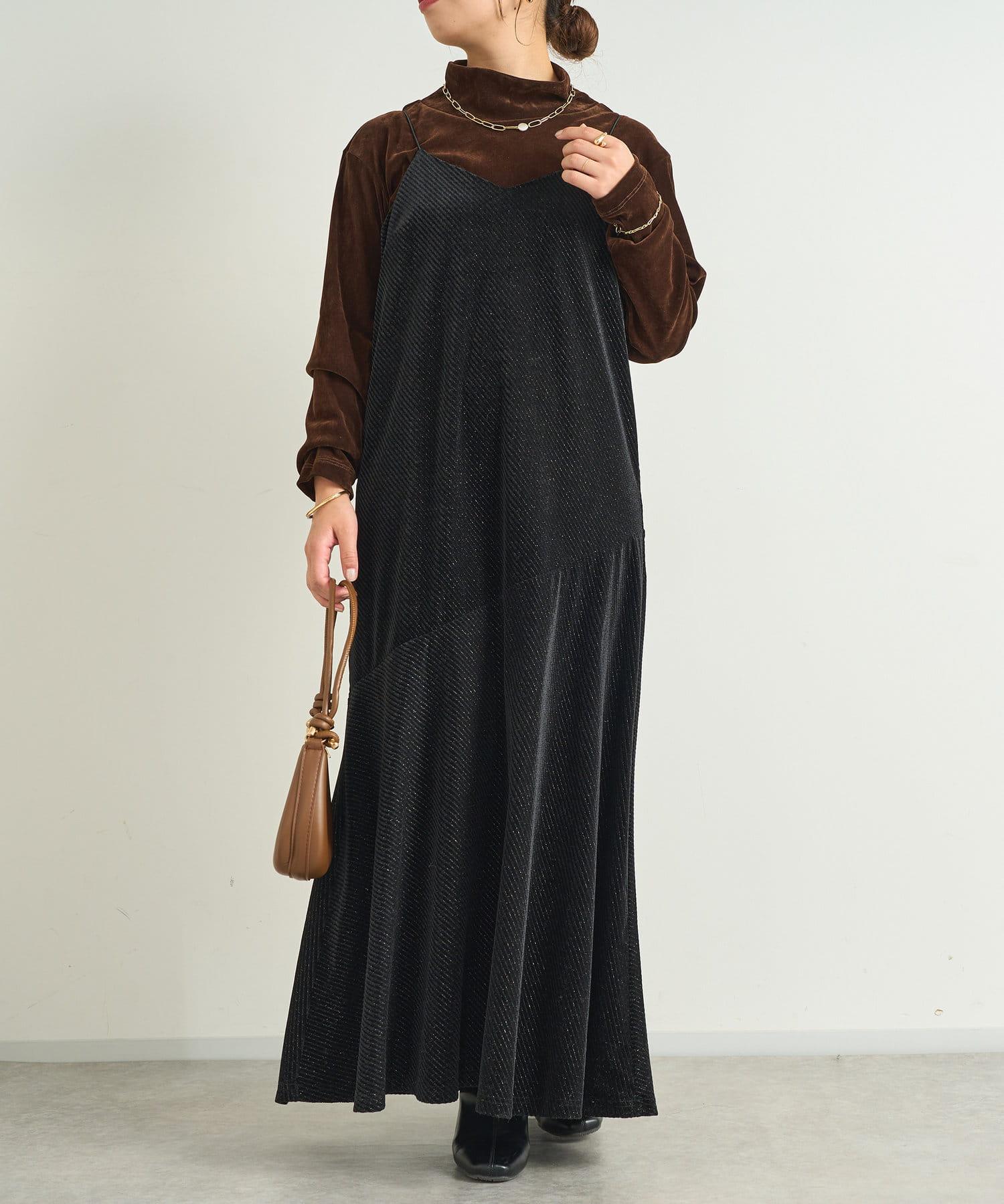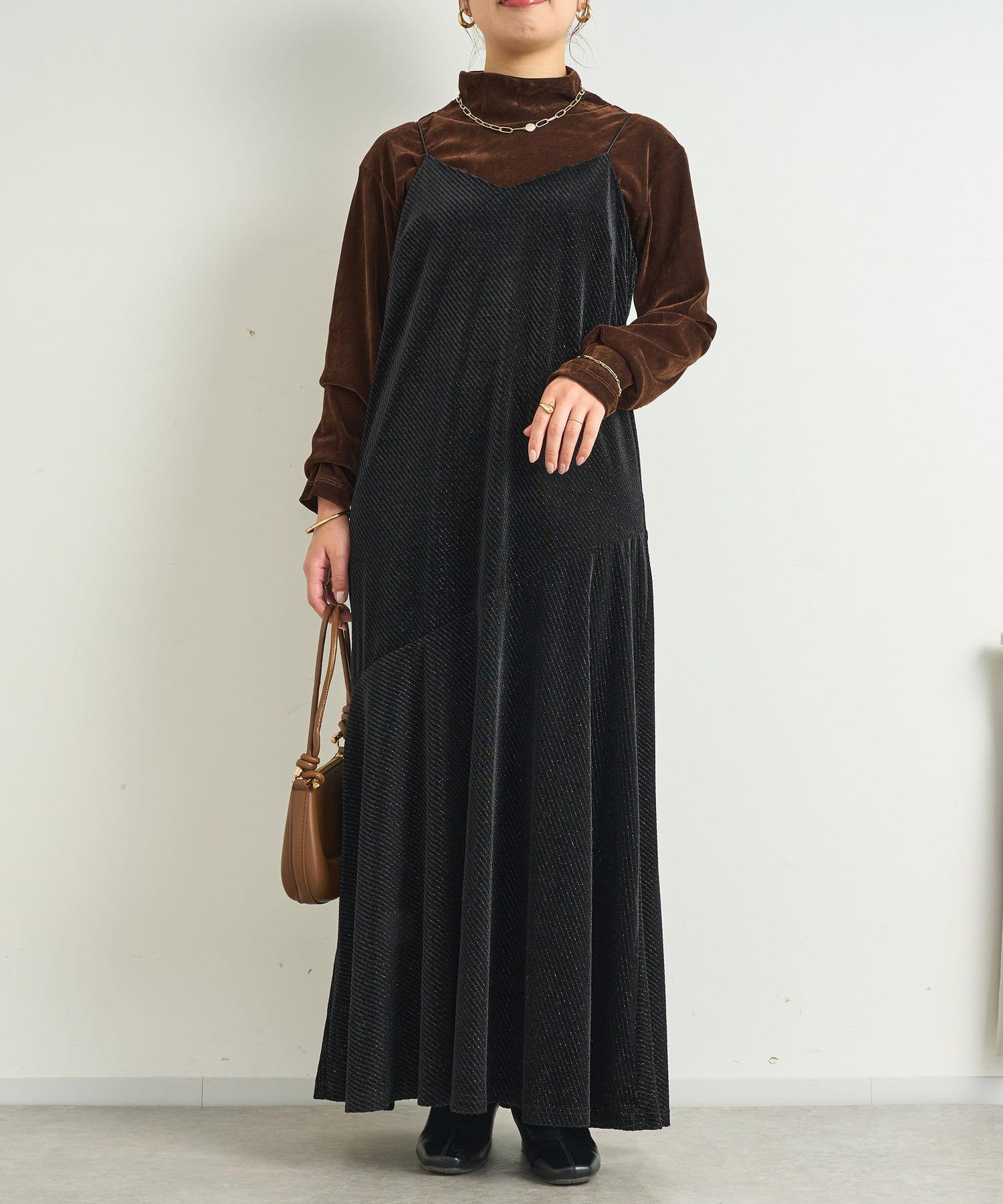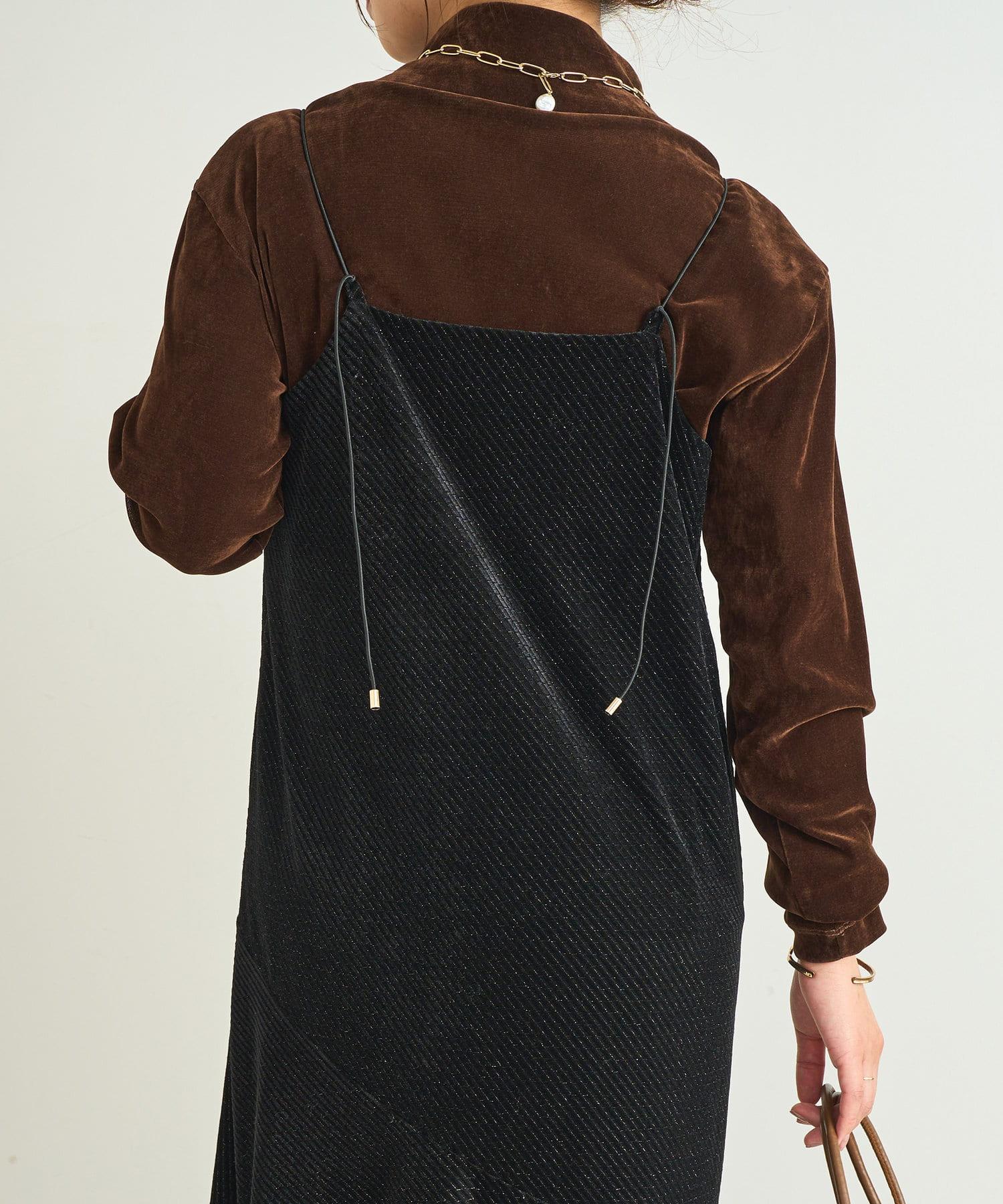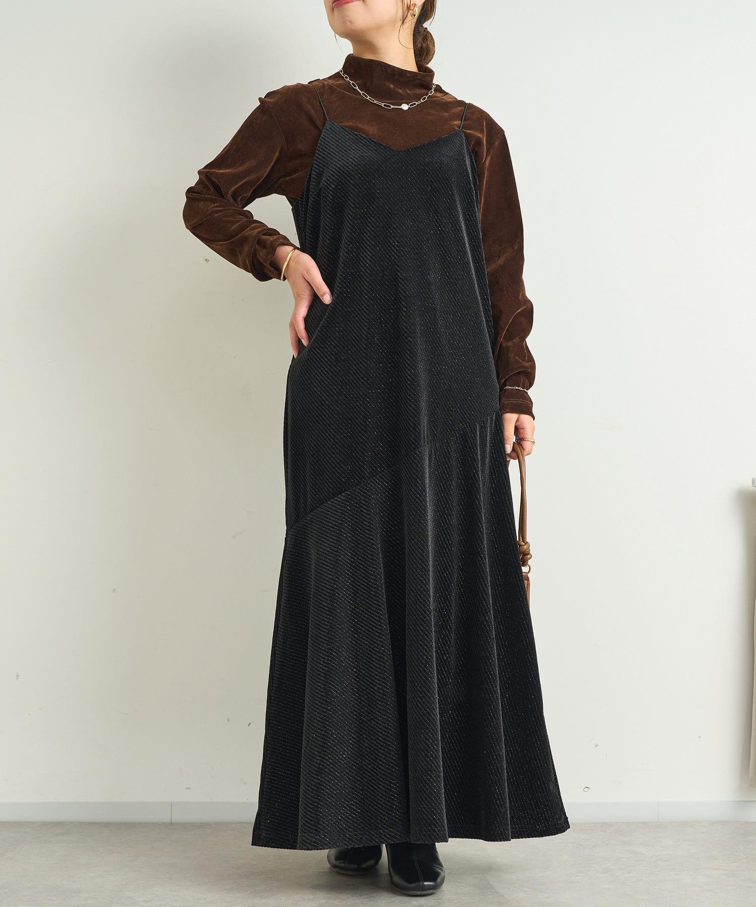 【un dix cors】帶亮絲天鵝絨拼接吊帶連衣裙